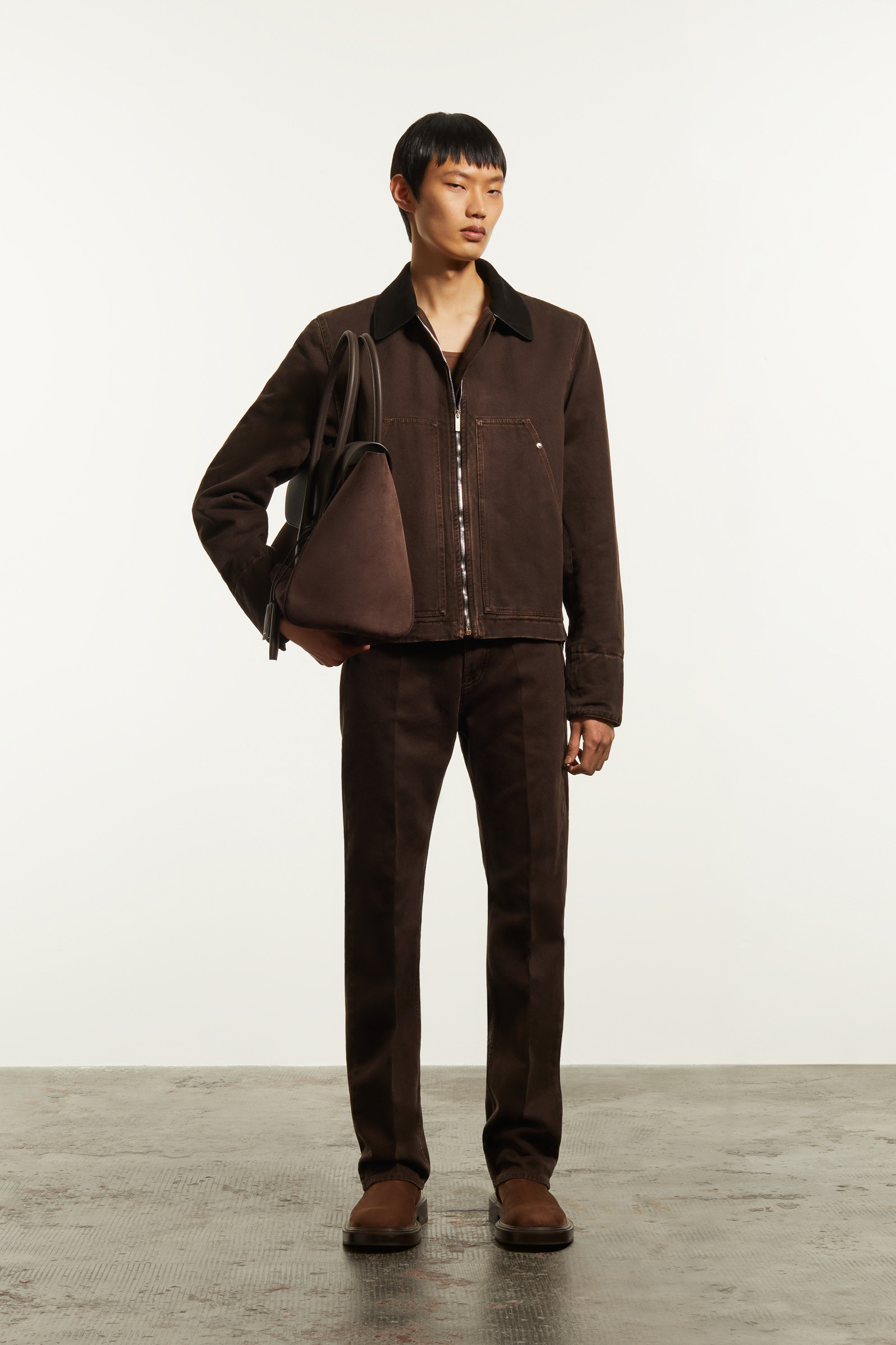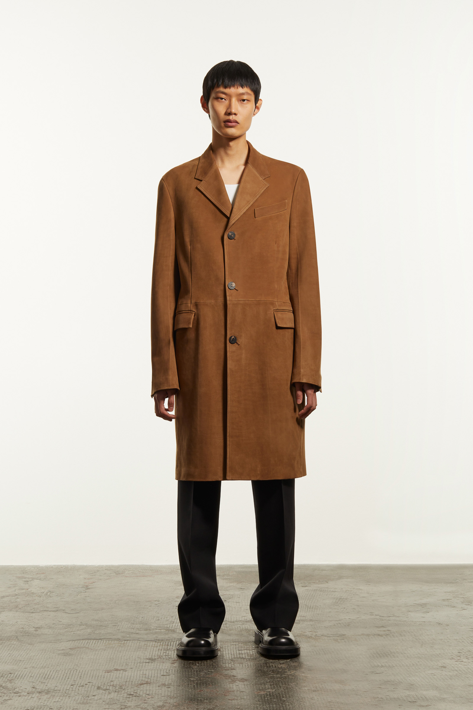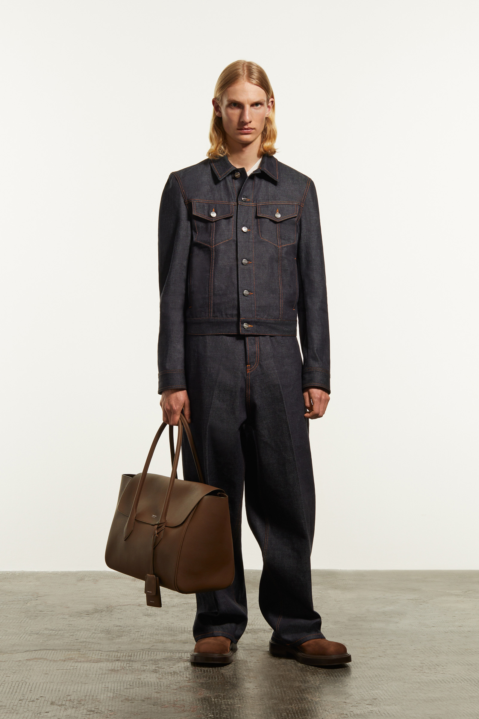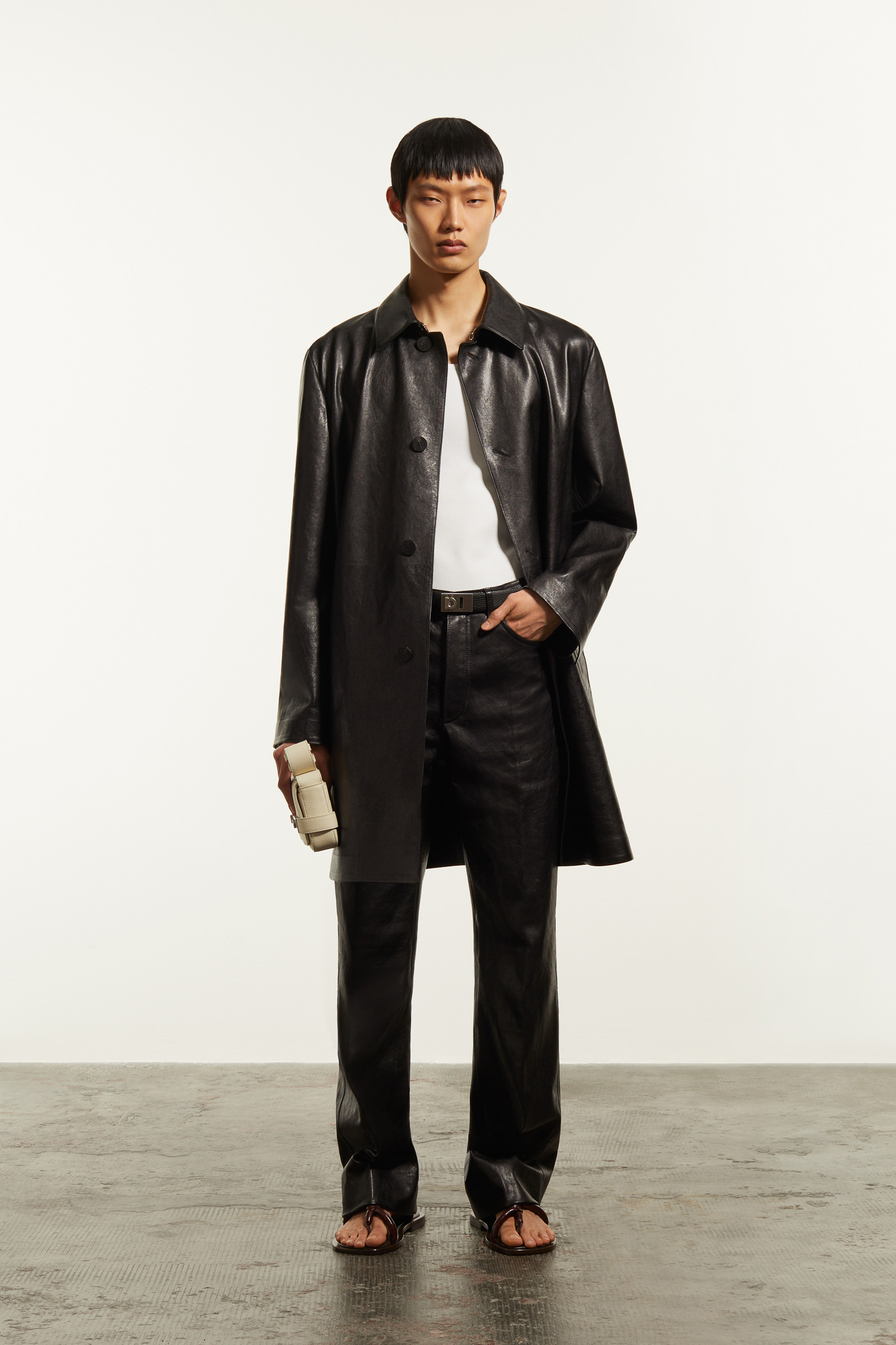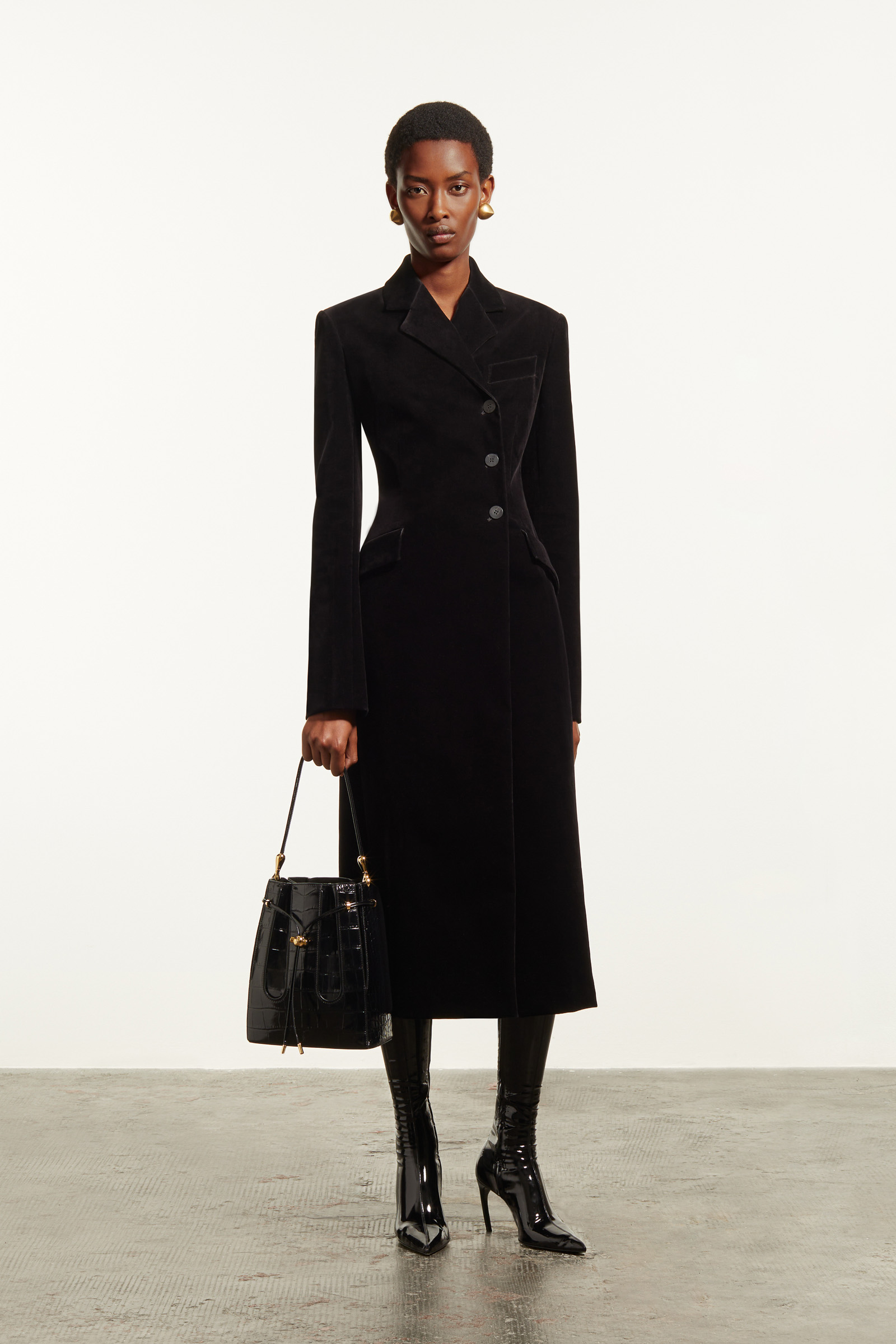 For resort, his tailoring was slim and straight-cut or nip-waisted and sculpted, sustained by compact fabrications. A standout in the outerwear offer was a strong-shouldered yet hourglass-y black city coat with Davis’s signature askew buttoning; smooth and velvety to the touch, it was actually made in flocked denim. Like other staple pieces in the collection, it was offered for both genders.