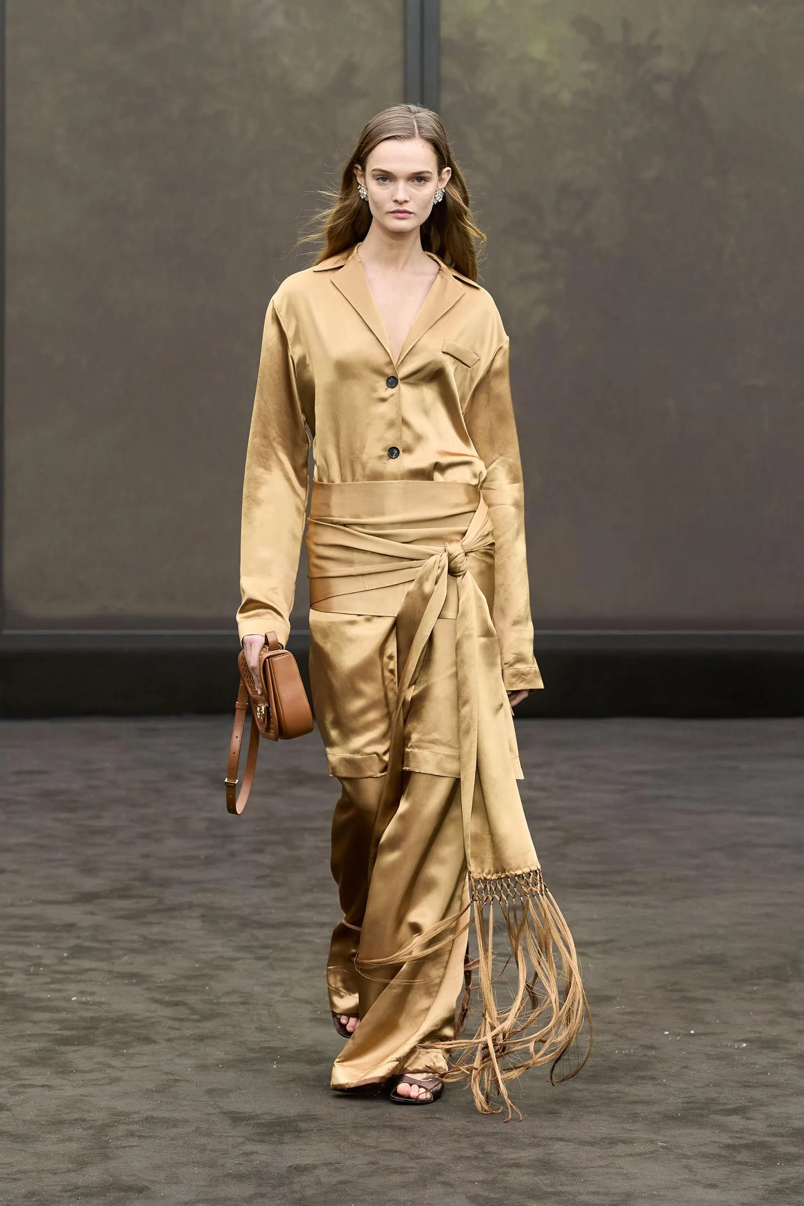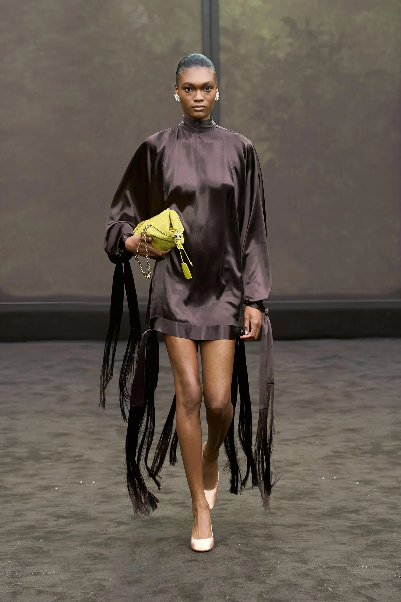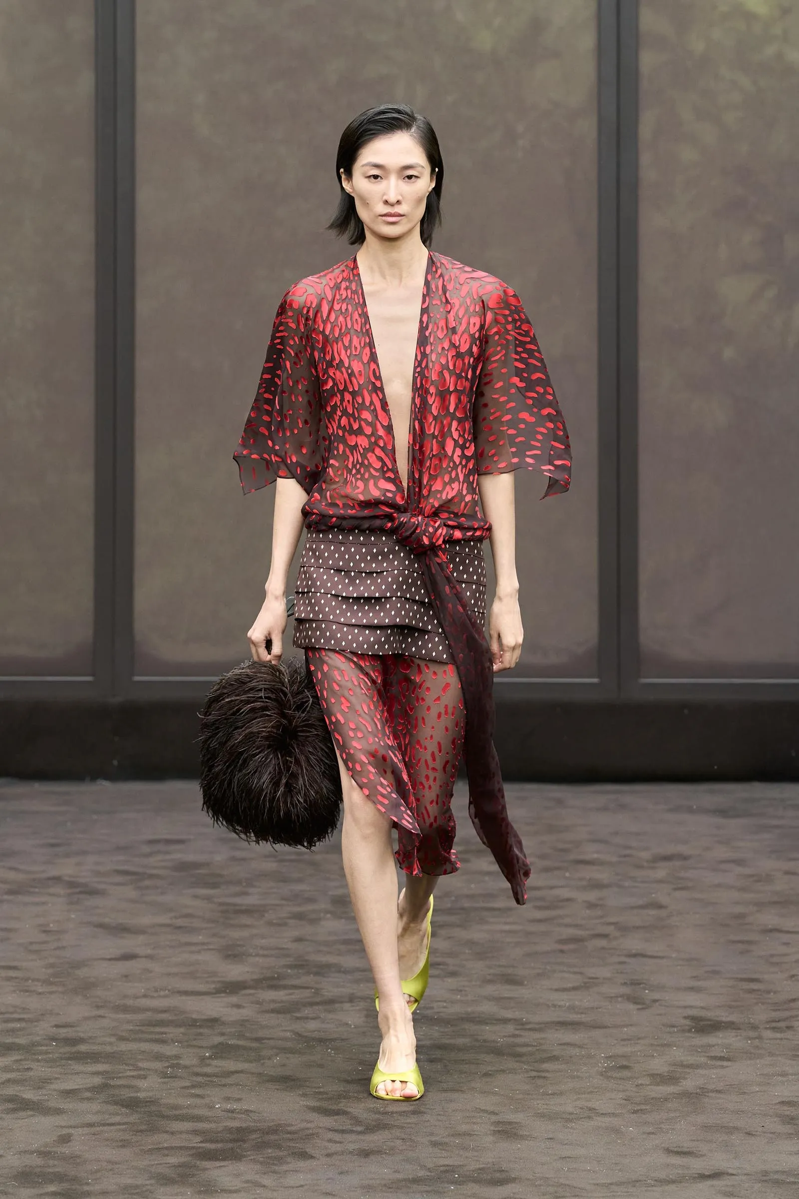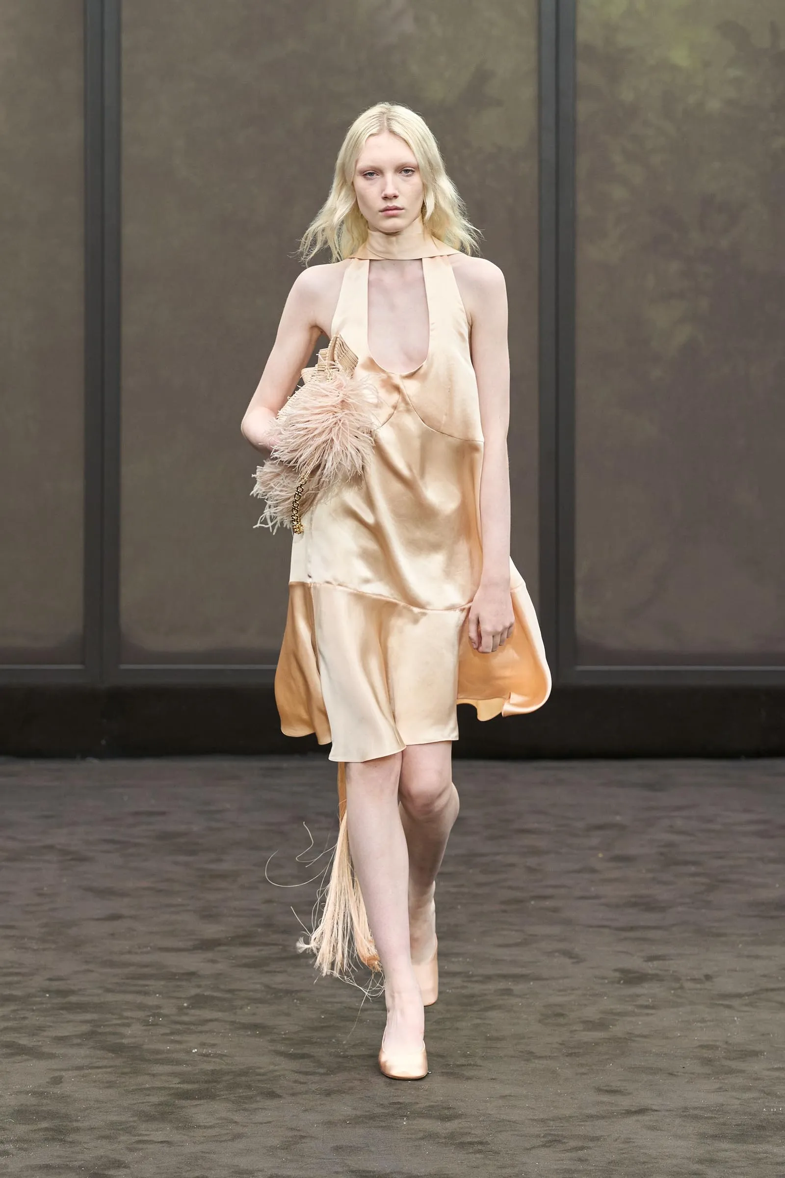 Modernized flapper dresses plus skirts and slit blouses in silk georgette blended leopard and cuttlefish prints in lush color combinations. Slip dresses came in scalloped silk panels that framed sections of lace. Strapped mules knotted with satin bows delivered further boudoir touches reimagined for evening.