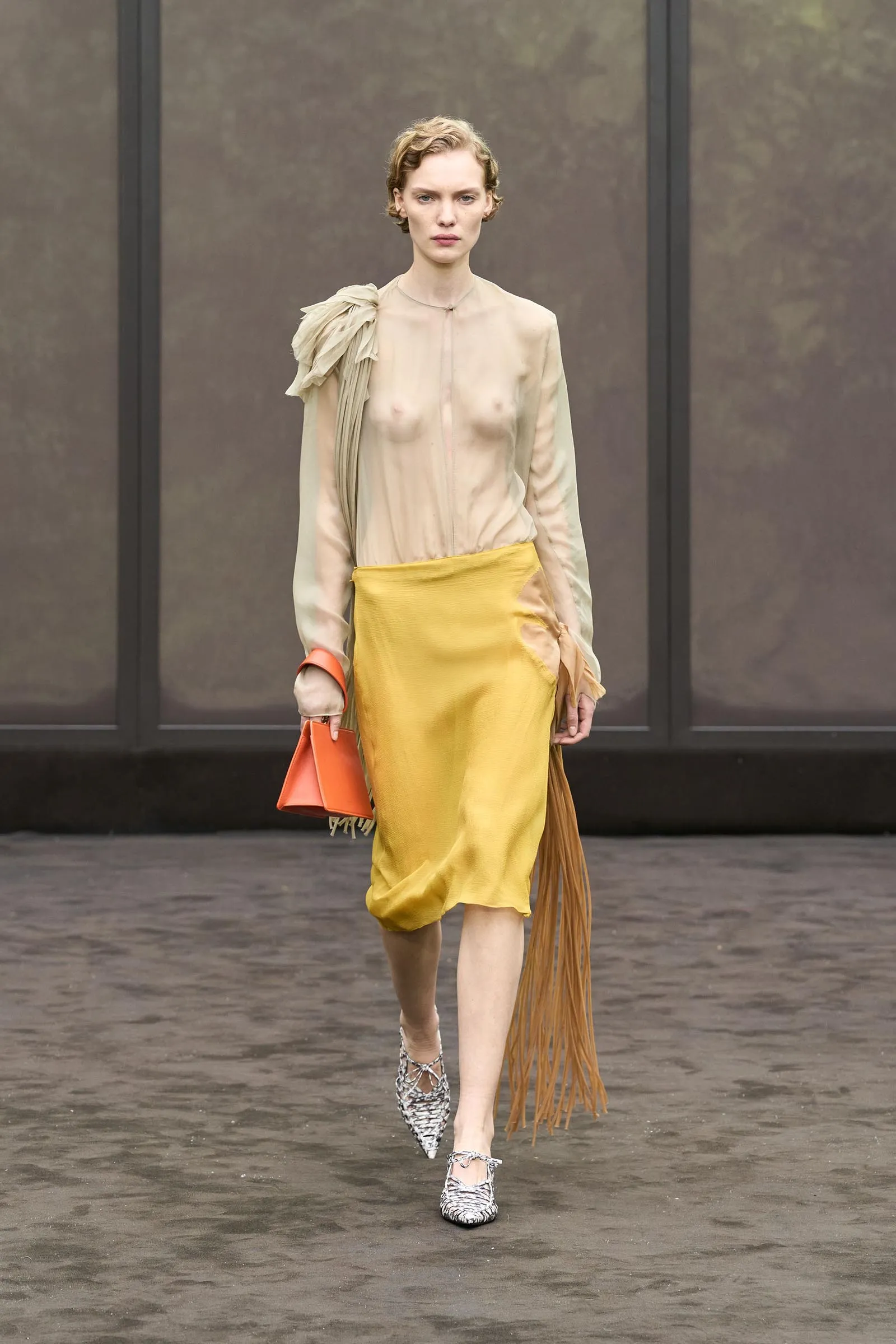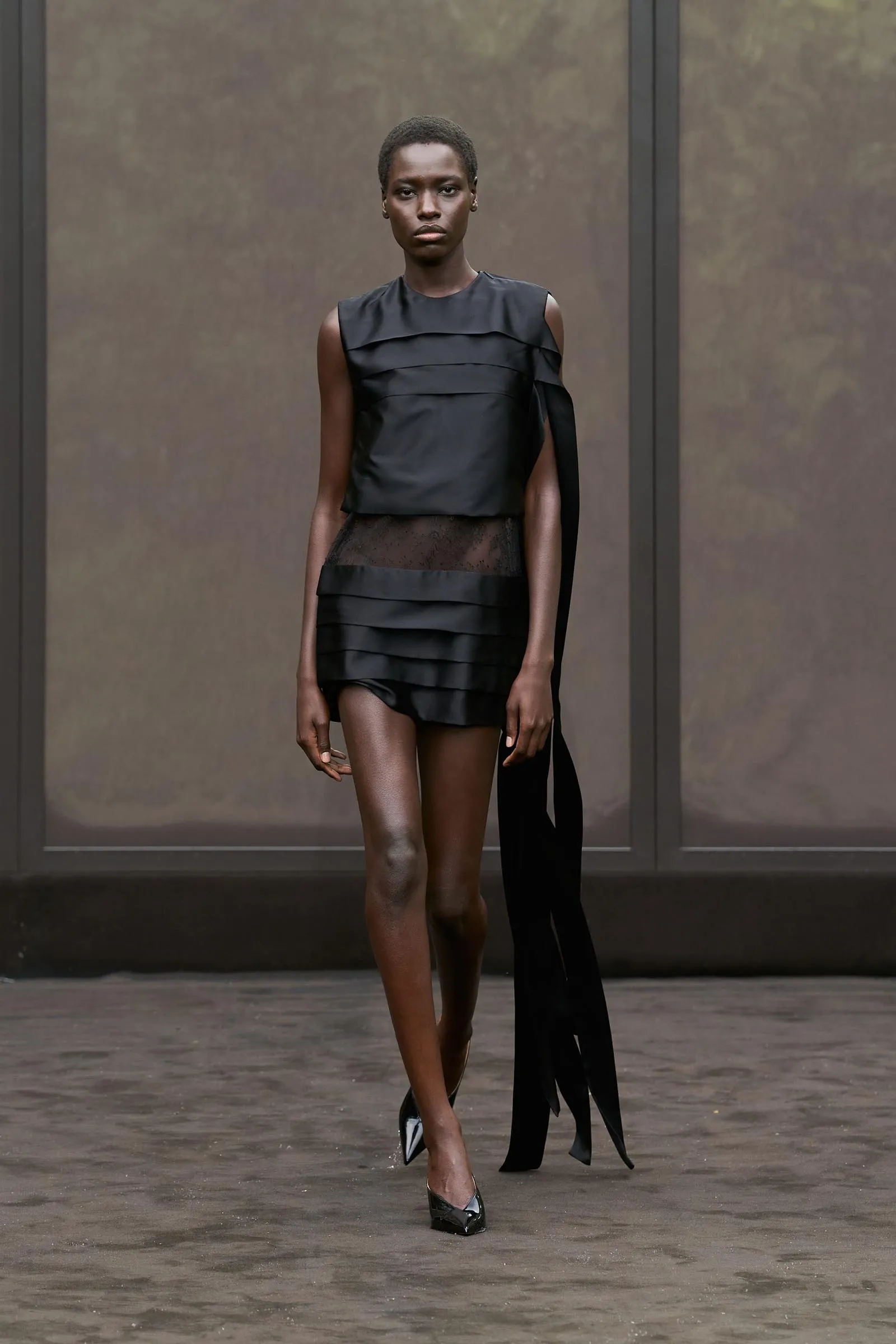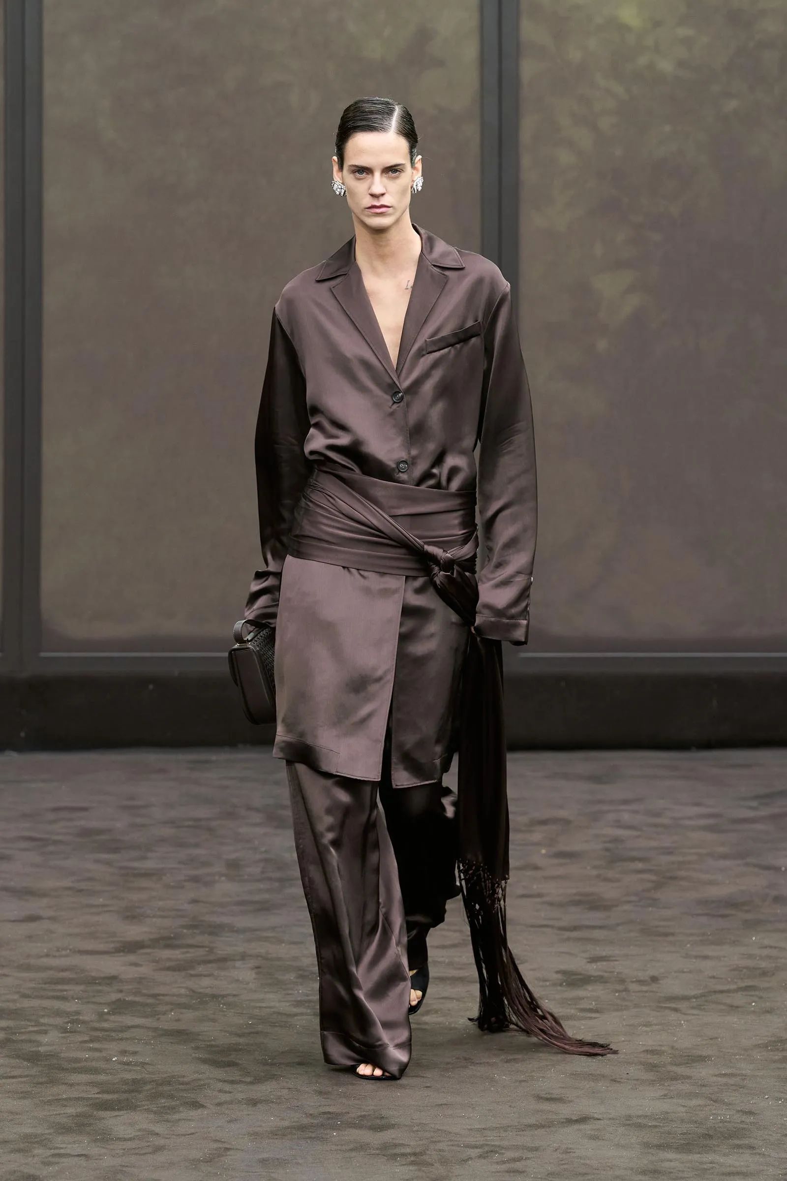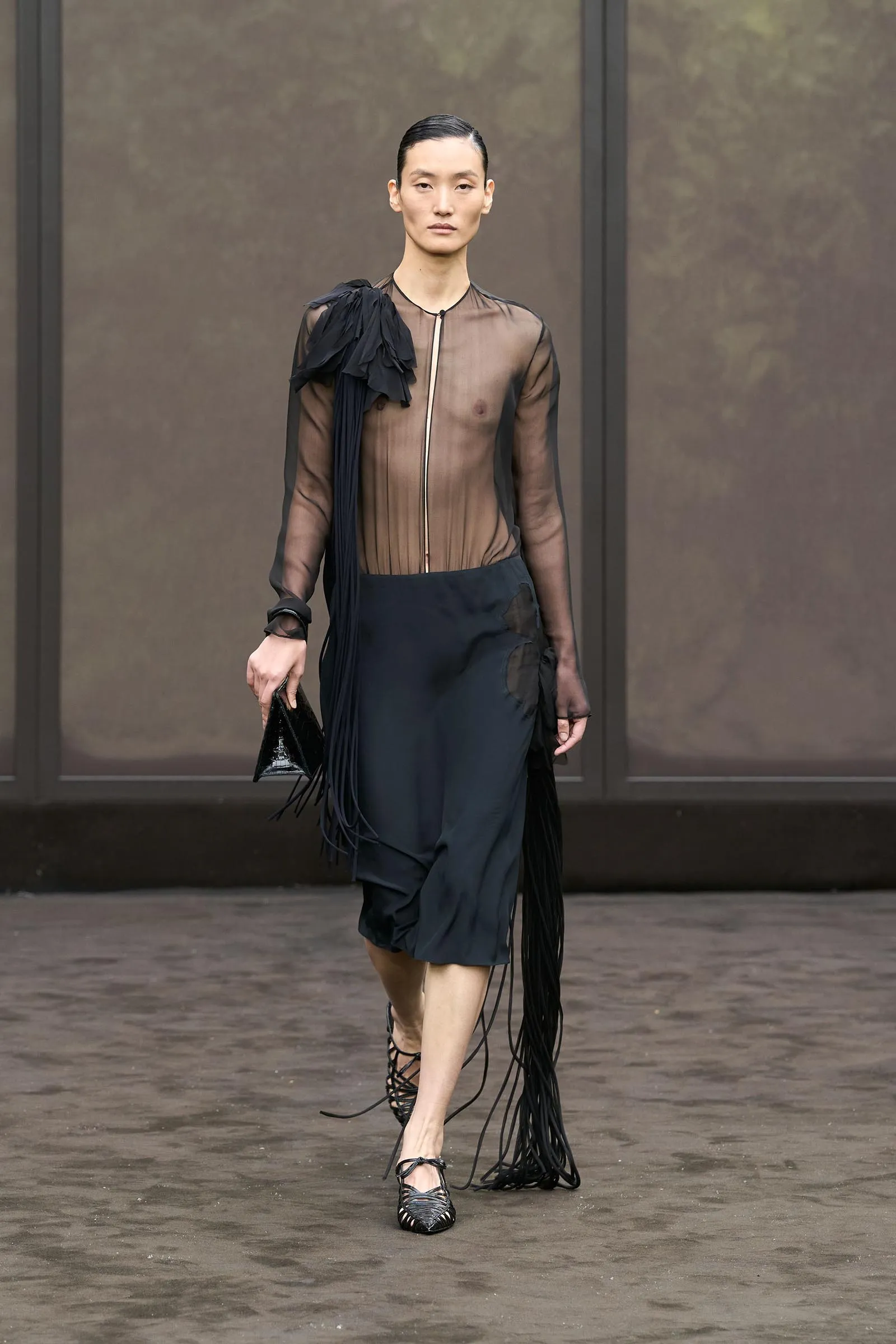 Modernized flapper dresses plus skirts and slit blouses in silk georgette blended leopard and cuttlefish prints in lush color combinations. Slip dresses came in scalloped silk panels that framed sections of lace. Strapped mules knotted with satin bows delivered further boudoir touches reimagined for evening.