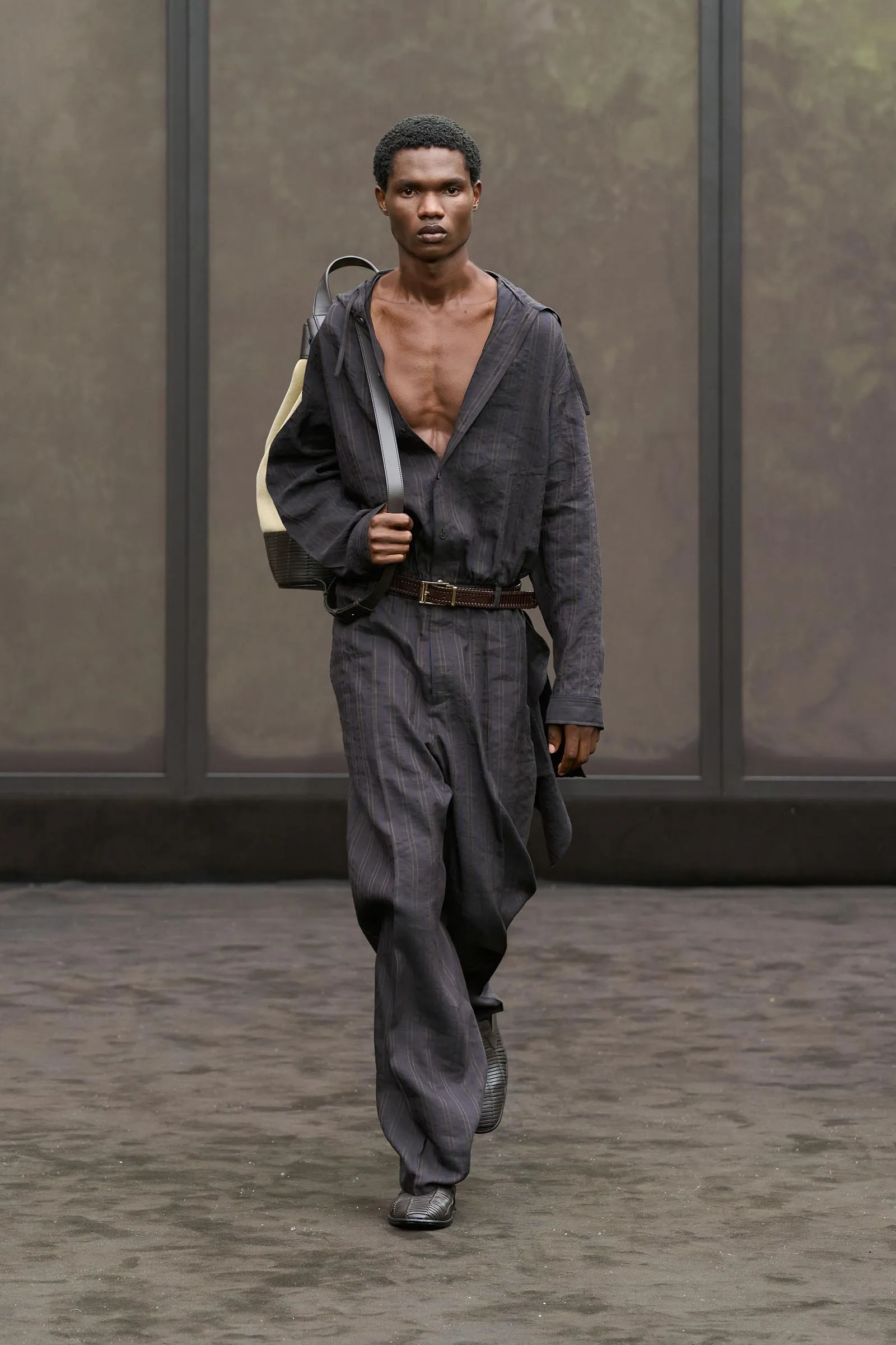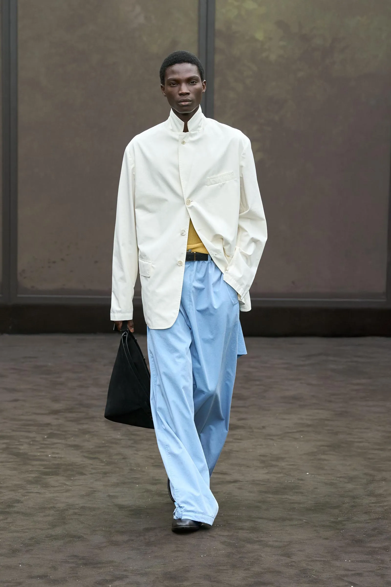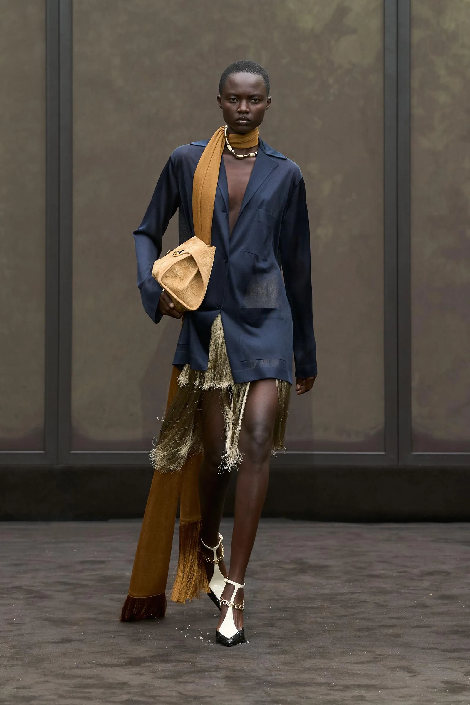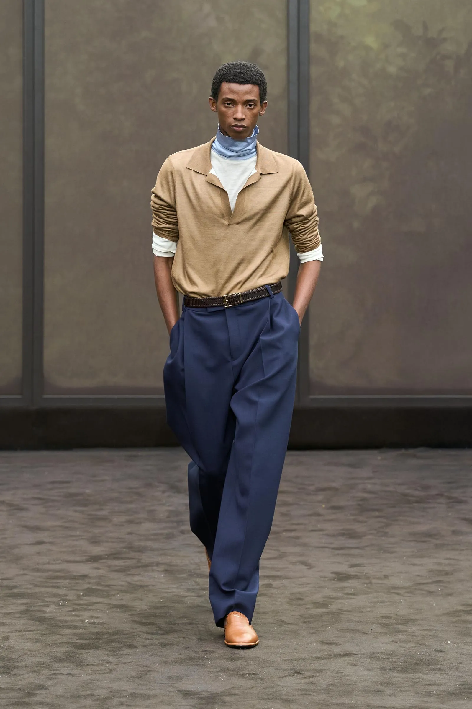 Davis’s return to his starting point this morning saw his original damp red-sand runway replaced with a waterlogged black carpet: Both shows just missed the rain. His elevator pitch for the collection was “exploring Ferragamo’s connection to Africana in the 1920s.” That decade was when the company’s founder, an immigrant from Campania named Salvatore Ferragamo, built a thriving shoe shop in Los Angeles, making shoes for movie stars and movie productions. After a car accident, however, Salvatore returned to his homeland in 1927 in order to try to build a business that could produce handmade shoes at scale.