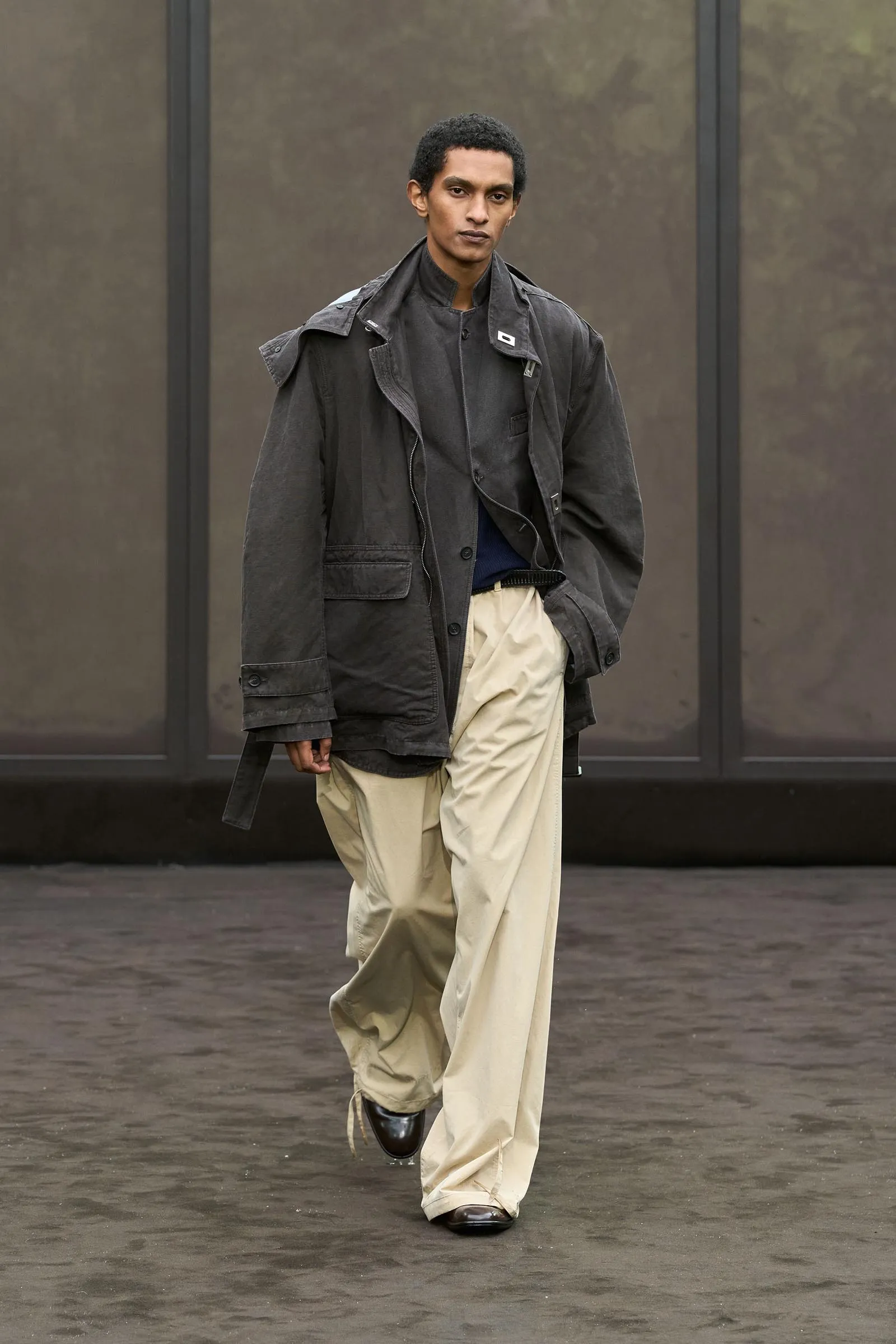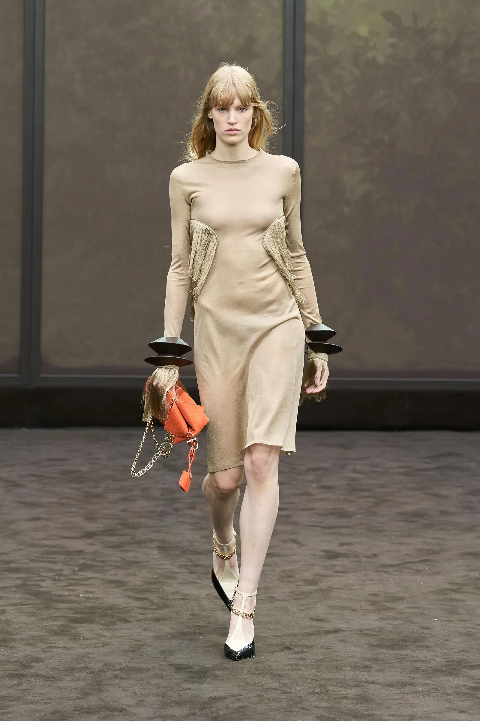 Not all menswear was framed as a foil to womenswear. Davis’s exploration and modernization of zoot suit proportions was particularly successful in his deconstructed, soft-shouldered, long-skirted blazer-chore hybrids: In a brown striped herringbone or coral-touched red, these were easy to watch. Shoes, so foundationally significant here, included a “cage”-design leather pump that paid homage to a 1920s Ferragamo original first sold with three color combinations of inner sock-slippers. Satin mules with embroidered beadwork acted as beyond-the-boudoir flapper slippers to match with Davis’s lace slip dresses.