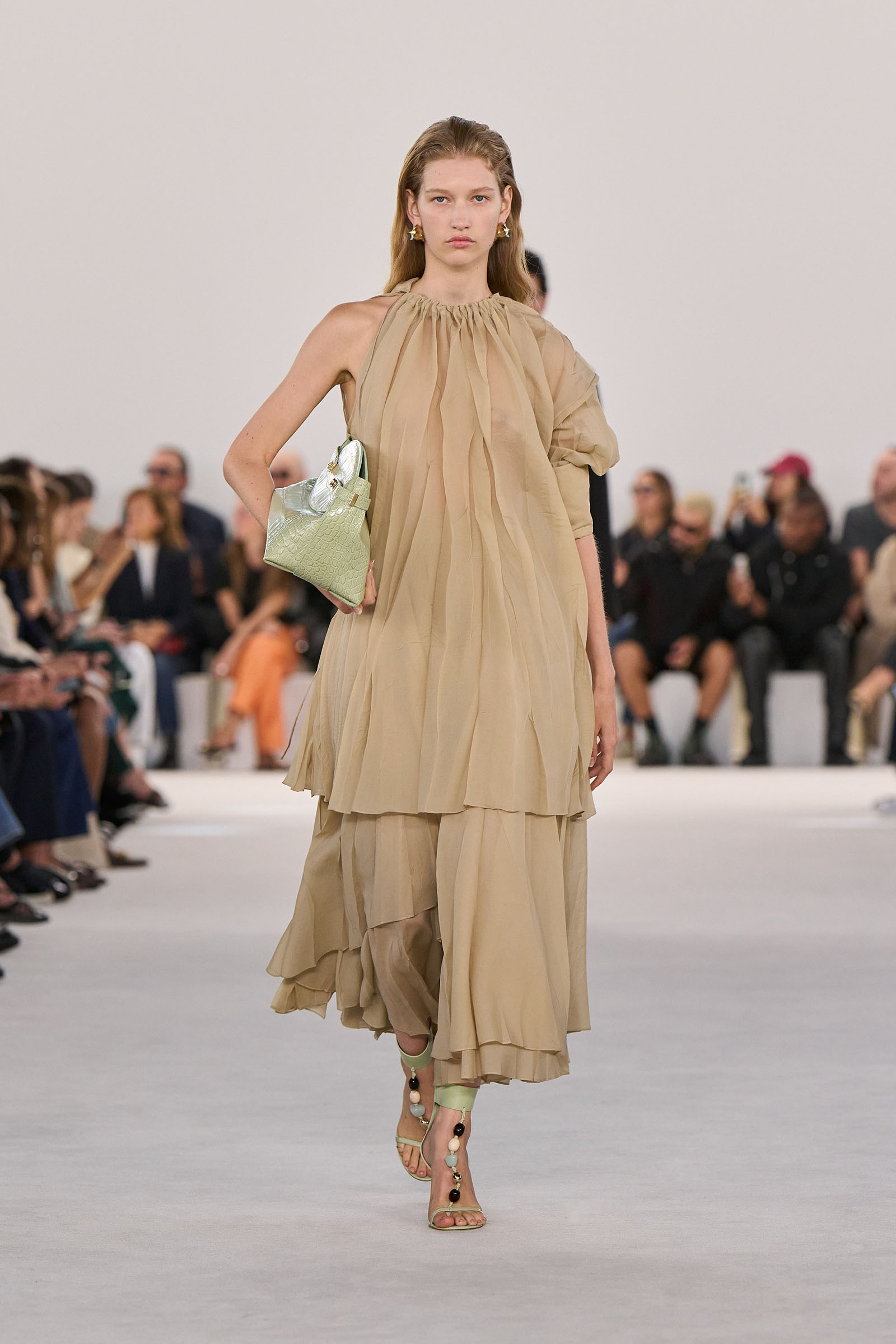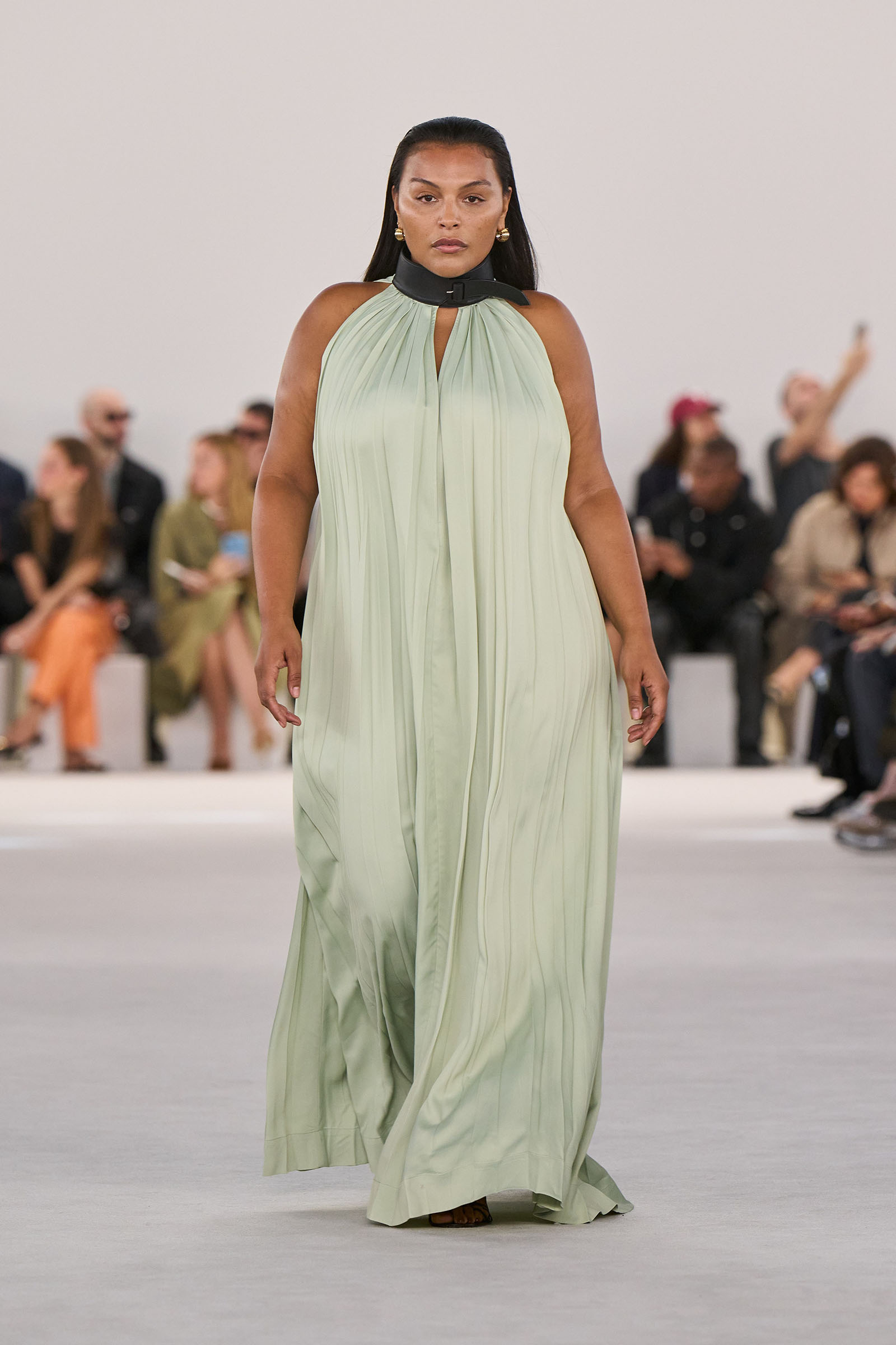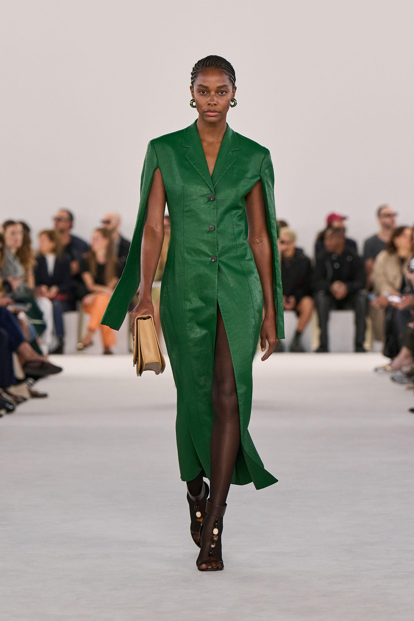 The marble reflected the beading on new banana-heel versions of Ferragamo’s 1956 Calipso sandal. The mixed materiality ran through the collection, with the insertion of metal hardware within necklines and panels of leather in a closing section that reflected Davis’s research into armor. The green (momentarily an unclaimed shade in fashion) was evident in a series of impactful leather pieces.