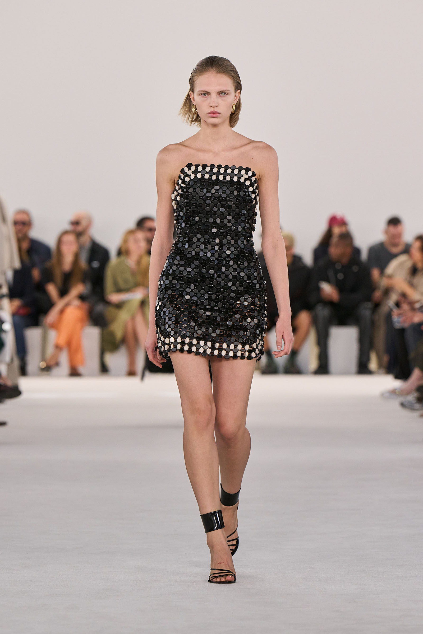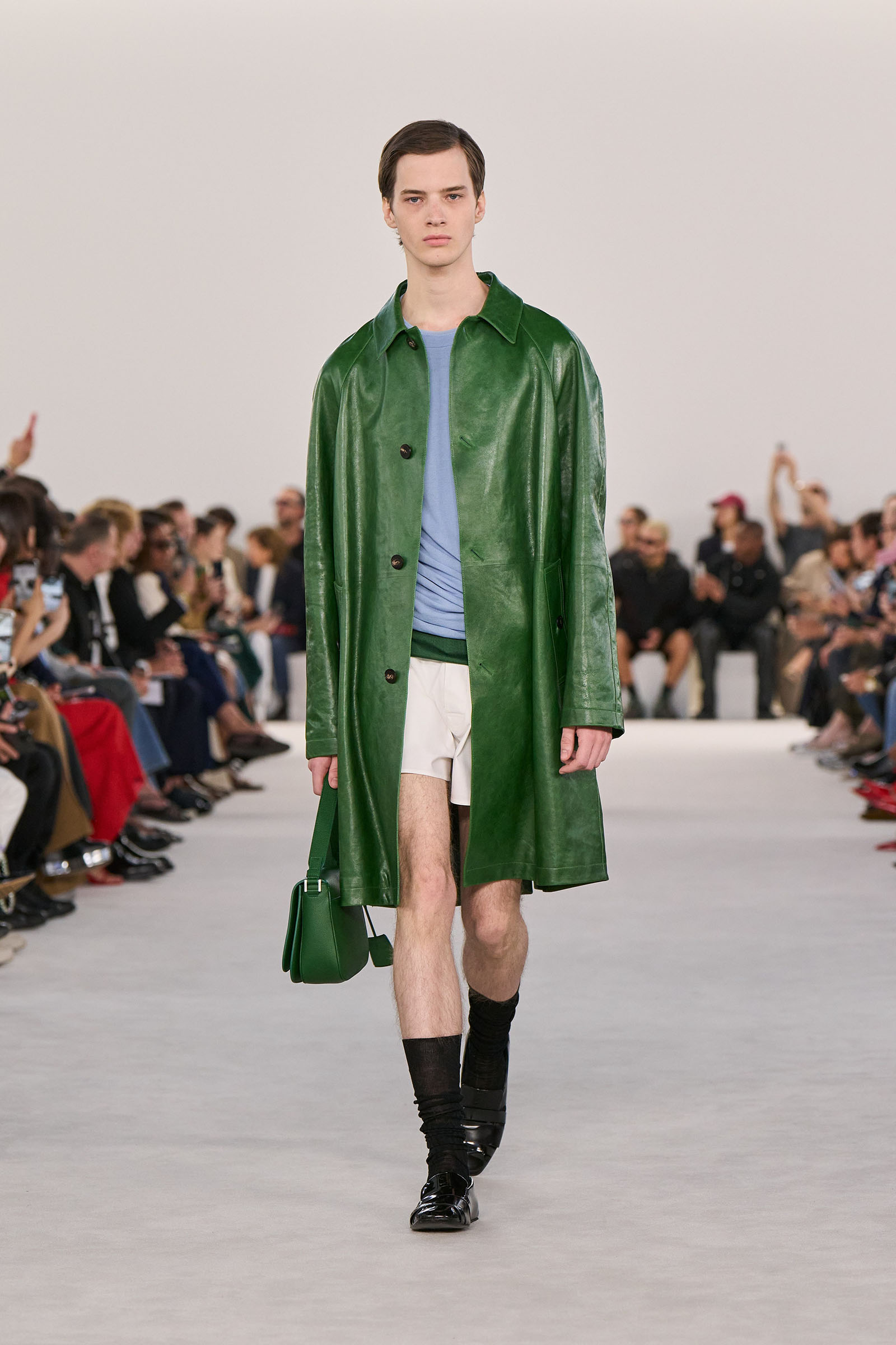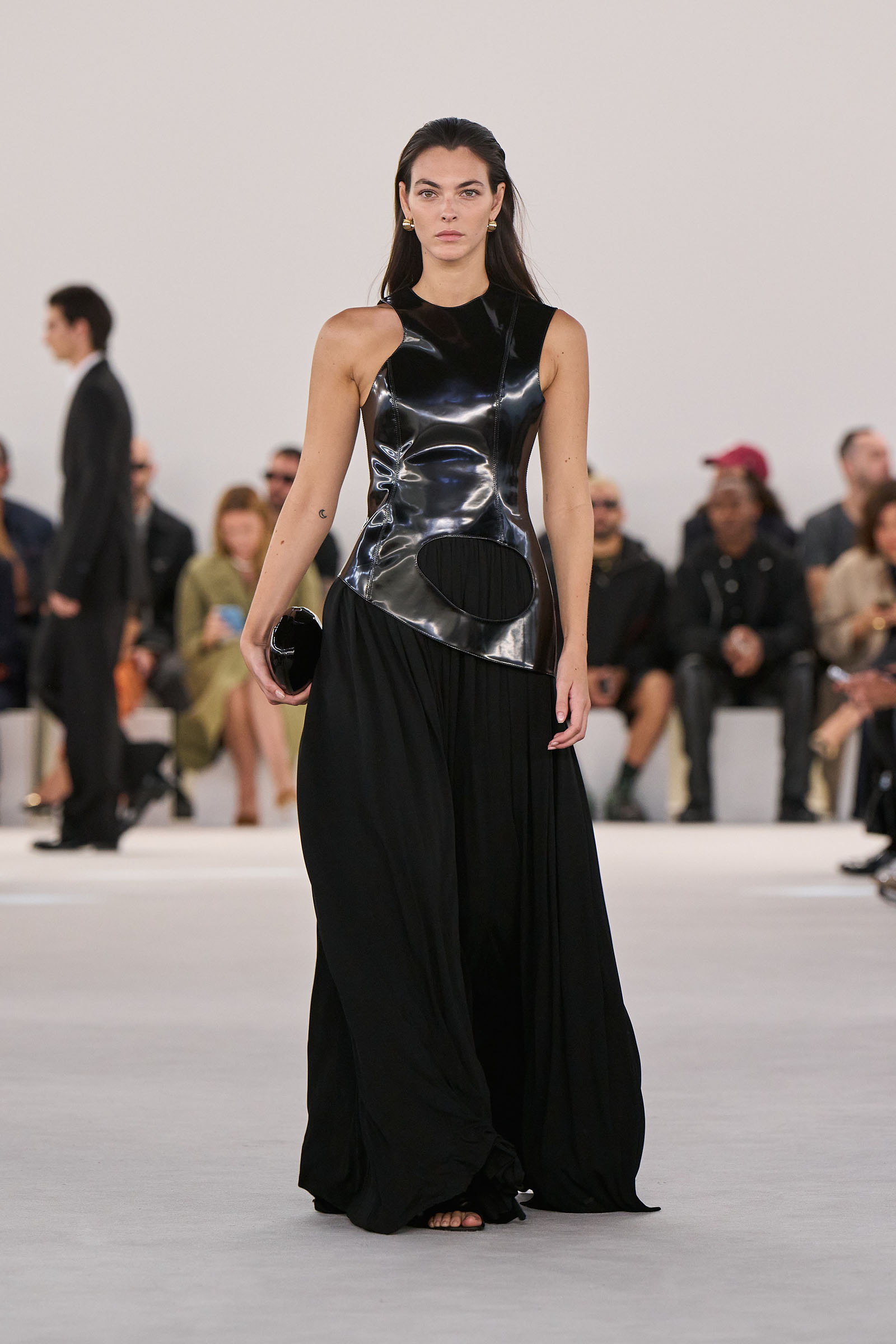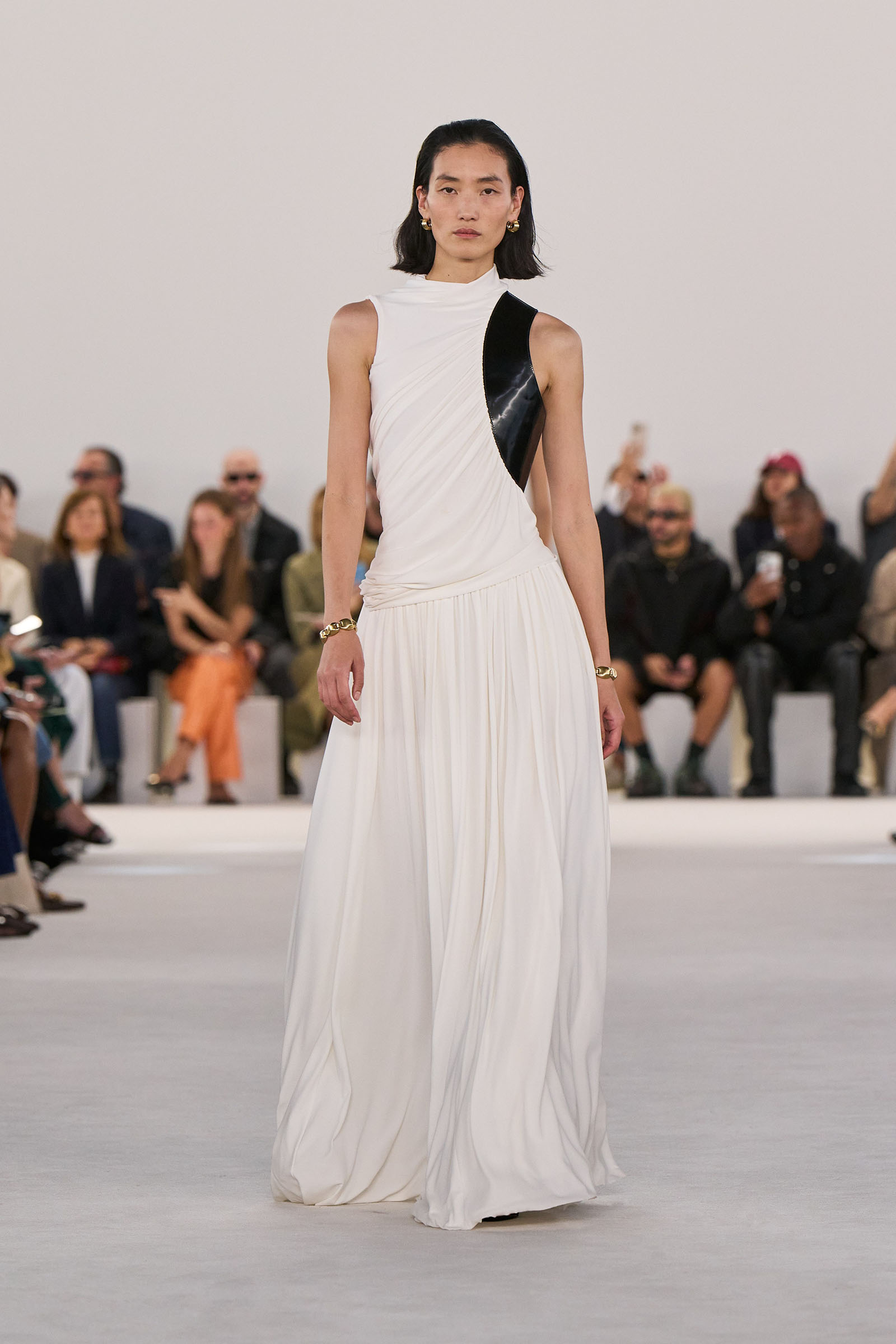 The marble reflected the beading on new banana-heel versions of Ferragamo’s 1956 Calipso sandal. The mixed materiality ran through the collection, with the insertion of metal hardware within necklines and panels of leather in a closing section that reflected Davis’s research into armor. The green (momentarily an unclaimed shade in fashion) was evident in a series of impactful leather pieces.