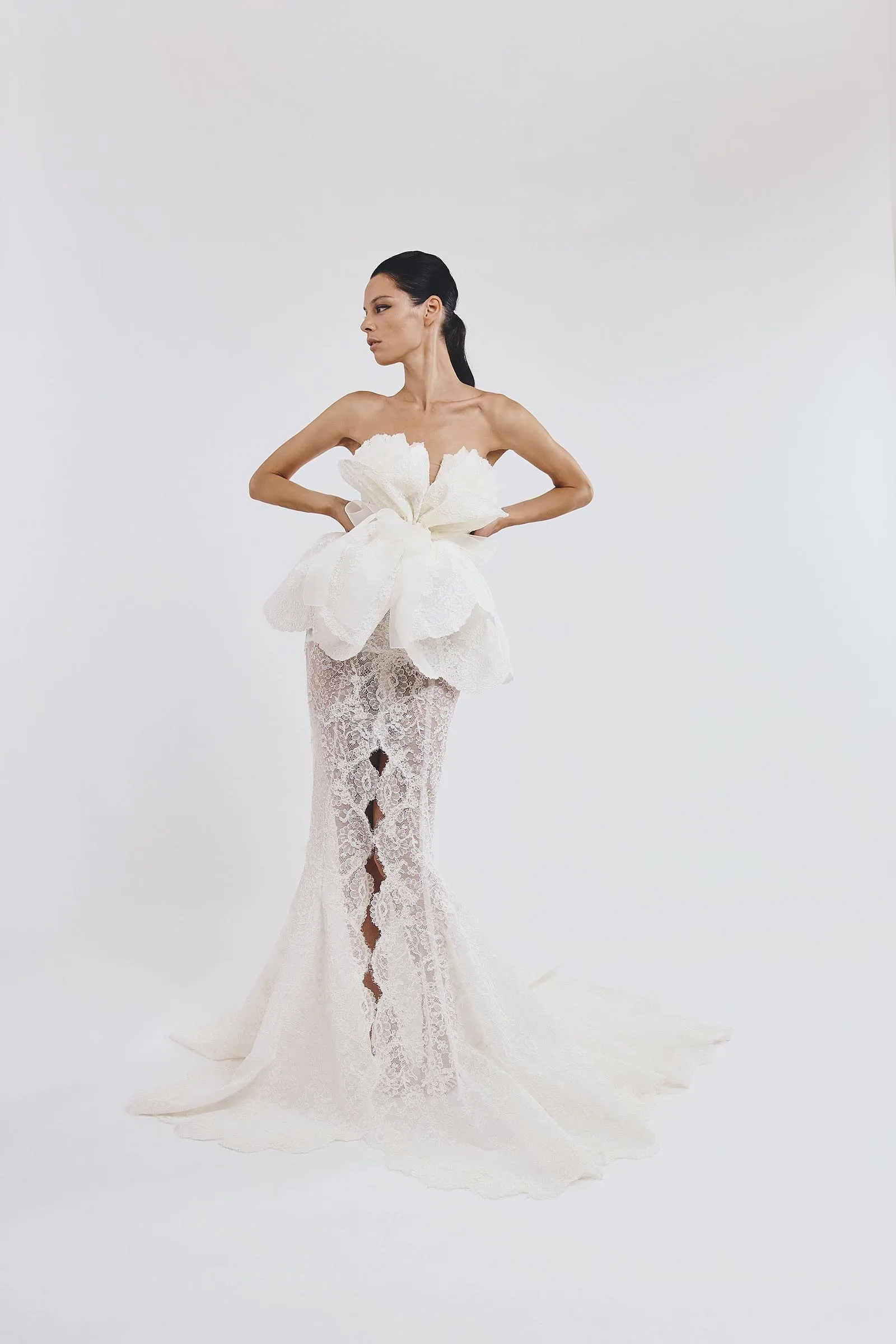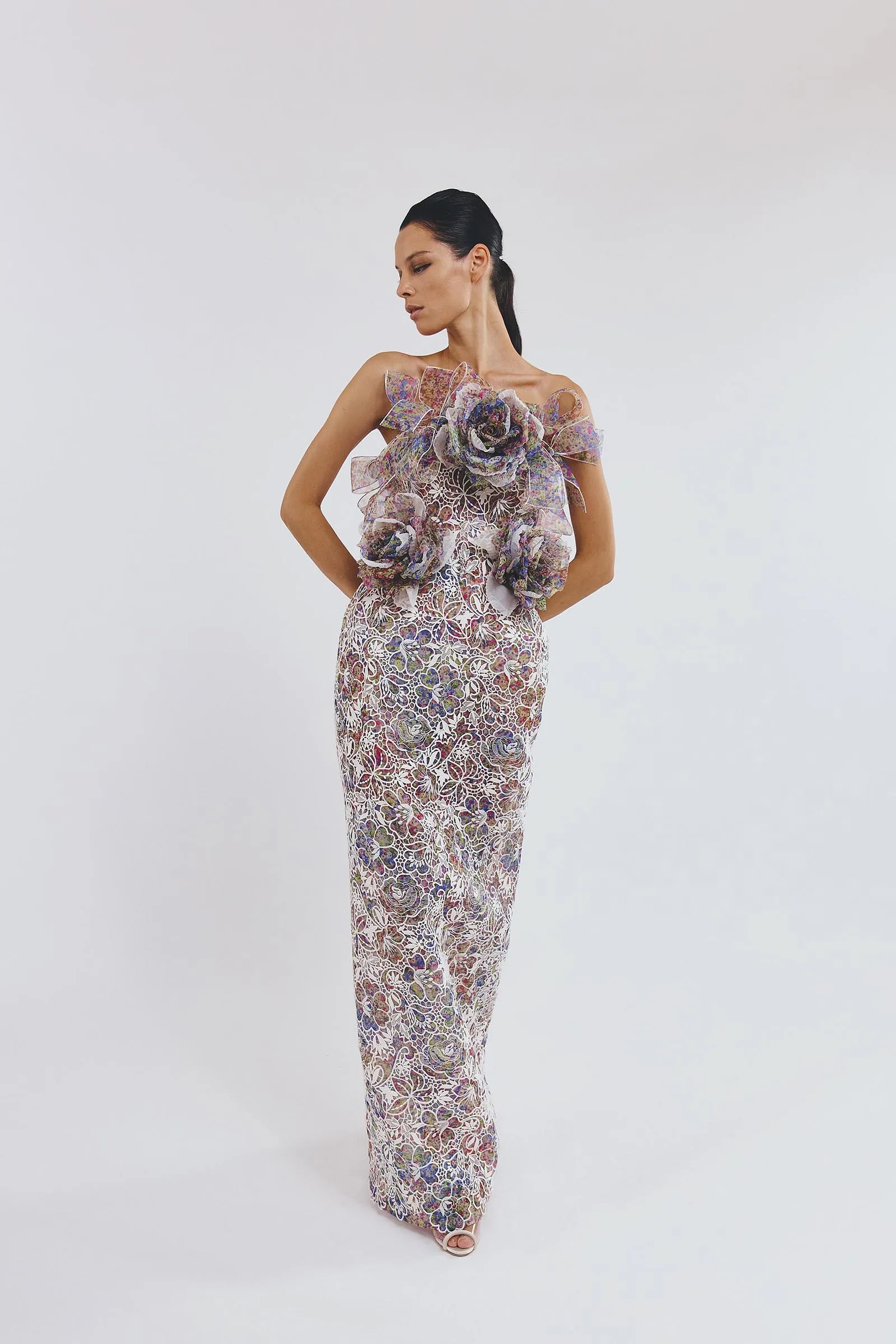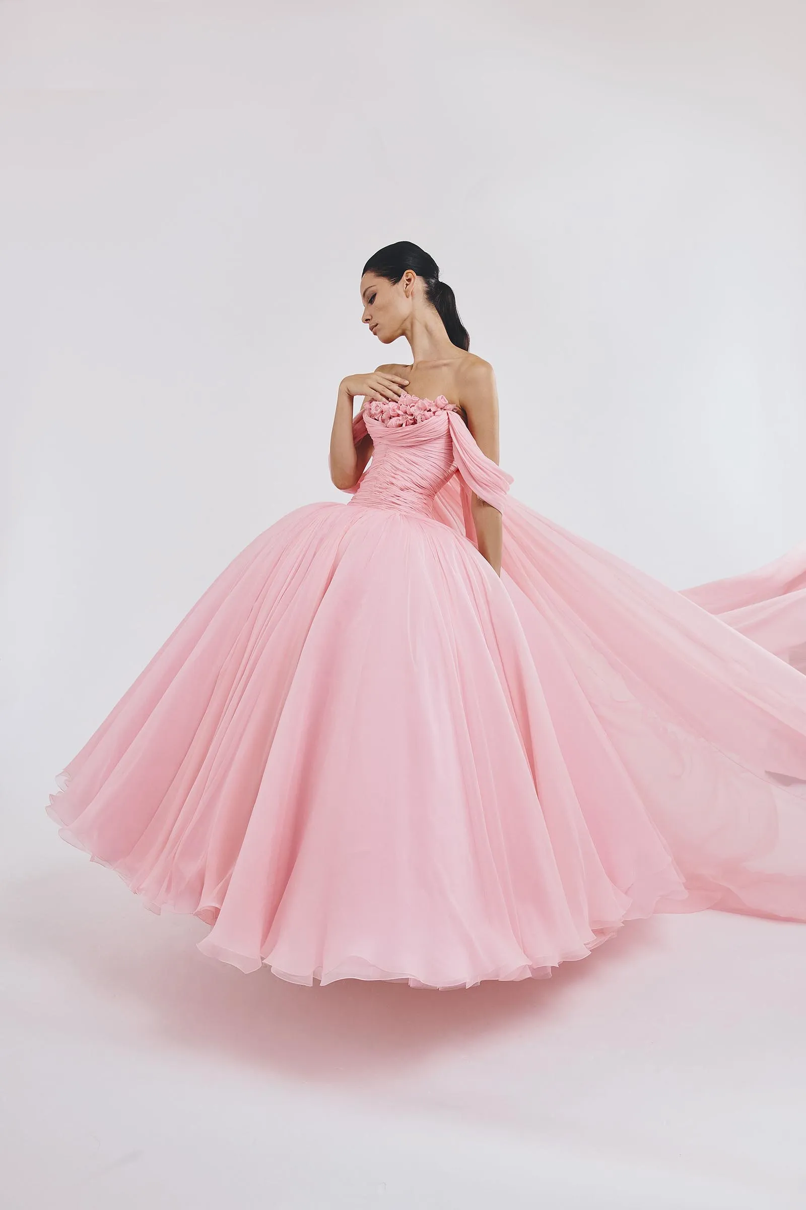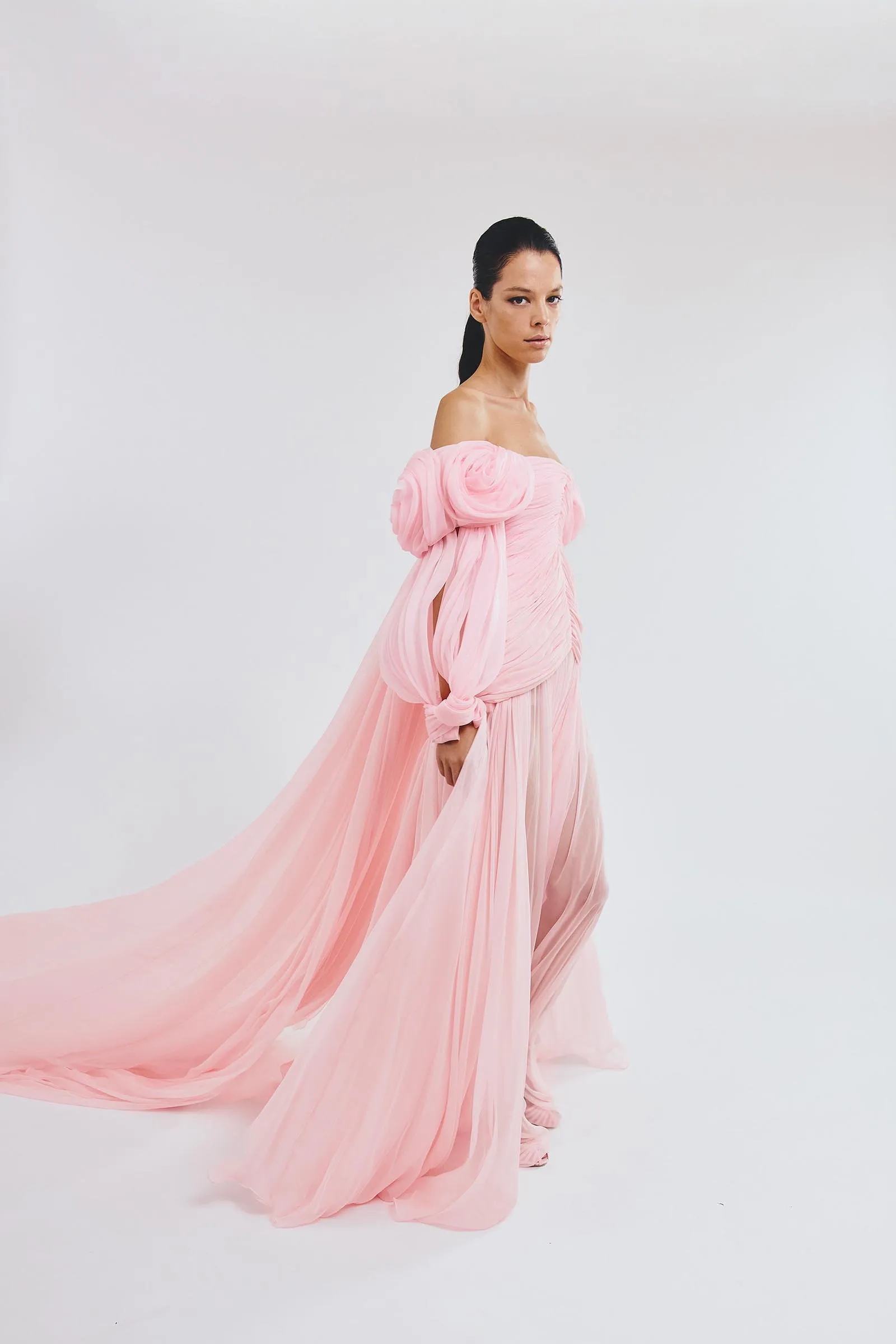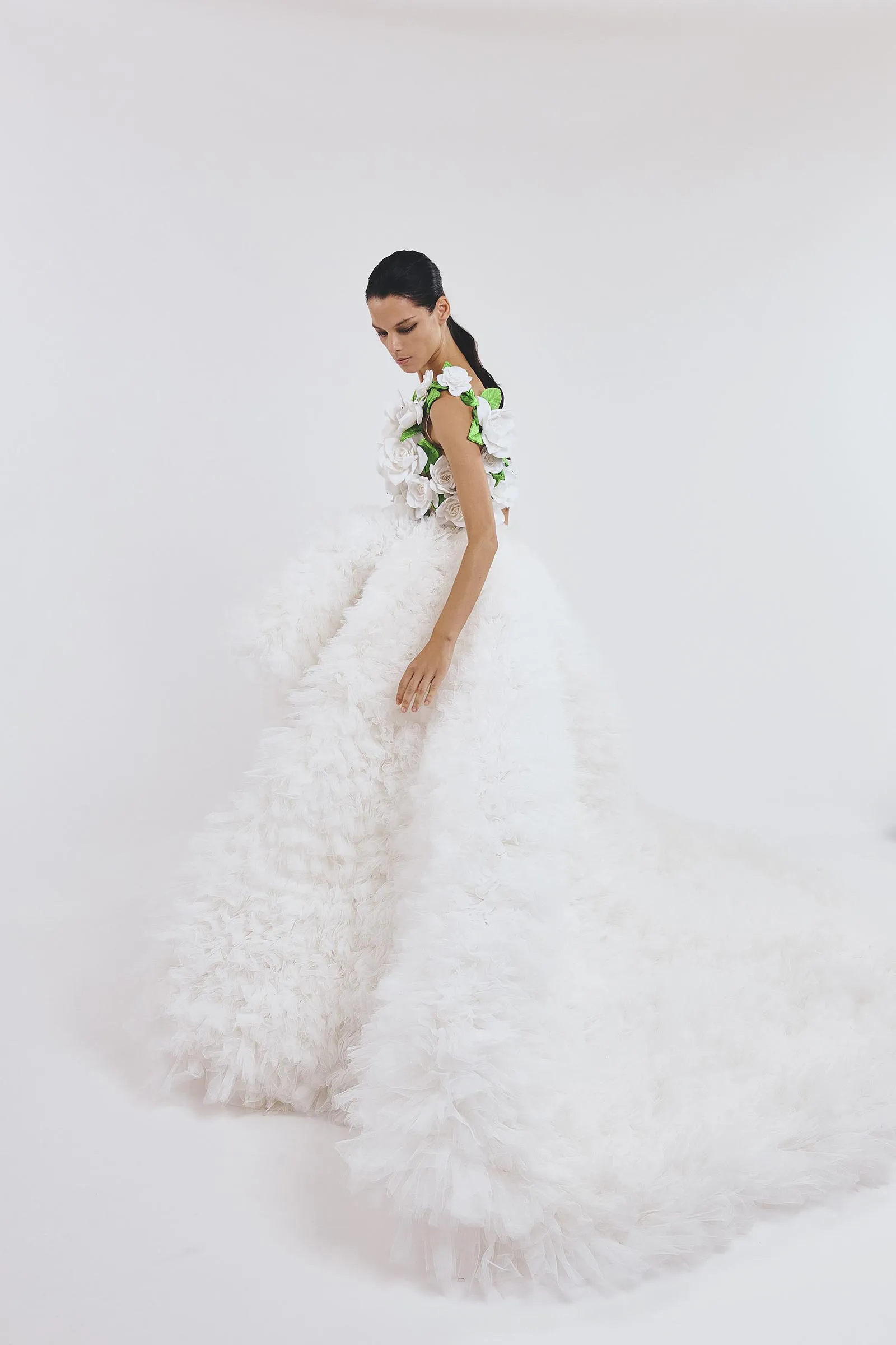 The newly minted Officier then ushered guests upstairs, where his latest creations stood poised on mannequins amidst Versailles-worthy bouquets. Valli never skimps on florals; the air was thick with the heady scent of rose and jasmine, which matched the dresses’ hues. The collection itself resembled a particularly fabulous botanical encyclopedia, or perhaps pages from an 18th-century herbarium. Delicate pastel tones and billowing volumes evoked the spirits of Watteau and Fragonard, masters of painting women all lightness, flirtation, and astute evanescent seduction.