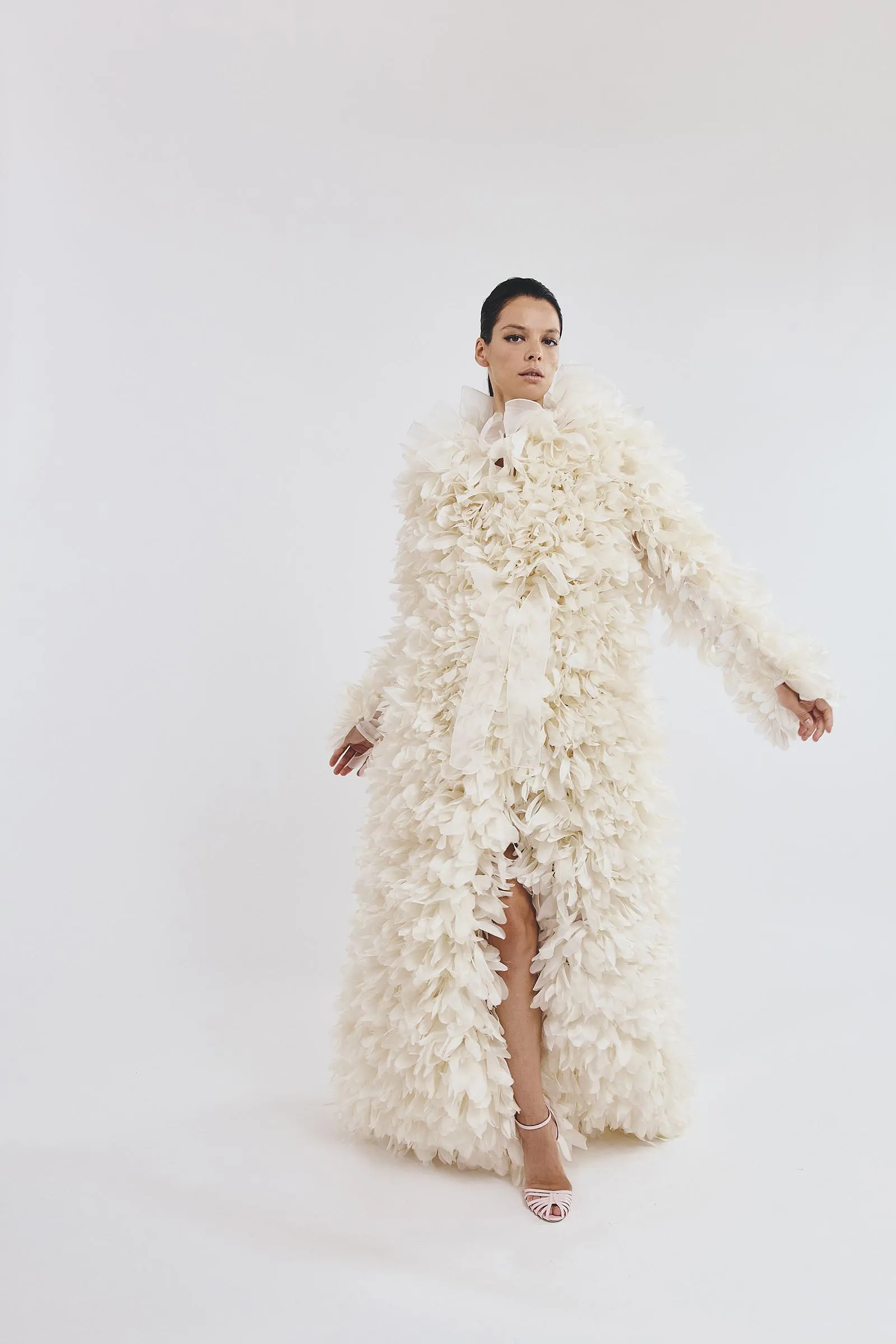 The rococo muse of Valli’s couture was reimagined swathed in layer upon layer of periwinkle or apricot tulle as if caught mid-dream, or in soft-sculpted bustier gowns so airy they seemed swept up by the same breeze that flutters through Fragonard’s The Swing. Silk mousseline, tinted the softest rose pâle and looking more aura-like than fabric, was draped into a finely pleated concoction, while another standout number echoed a pointillist painting brought to life, with a sheer silk gazar gown topped by a Provençale-style cape collar drifting above a voluminous millefeuille skirt. “It’s the weight of lightness,” mused the designer, perfectly summing up the paradox he’s mastered. It was Valli in peak form, offering a full-fantasy spectrum for his Valli Girls to glide between nymph, pastoral flirt, or idyllic muse. Liberated, of course.