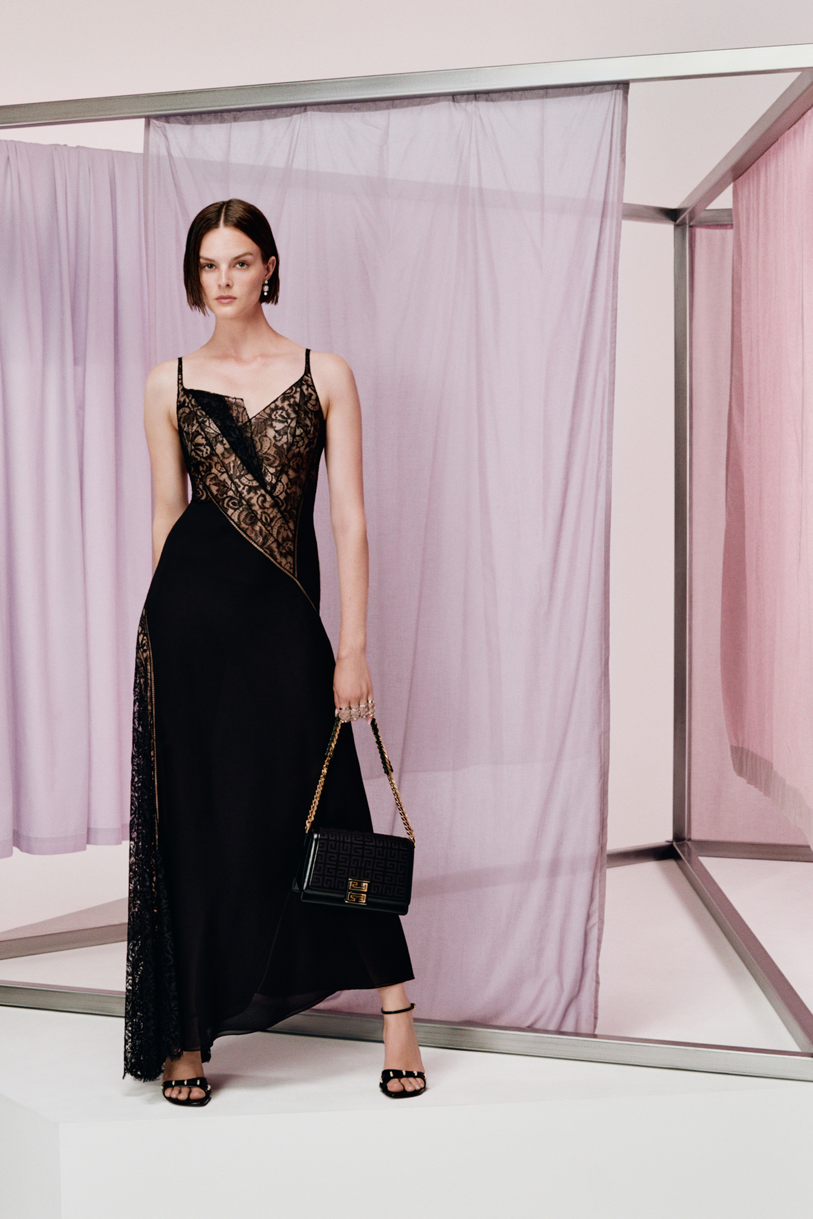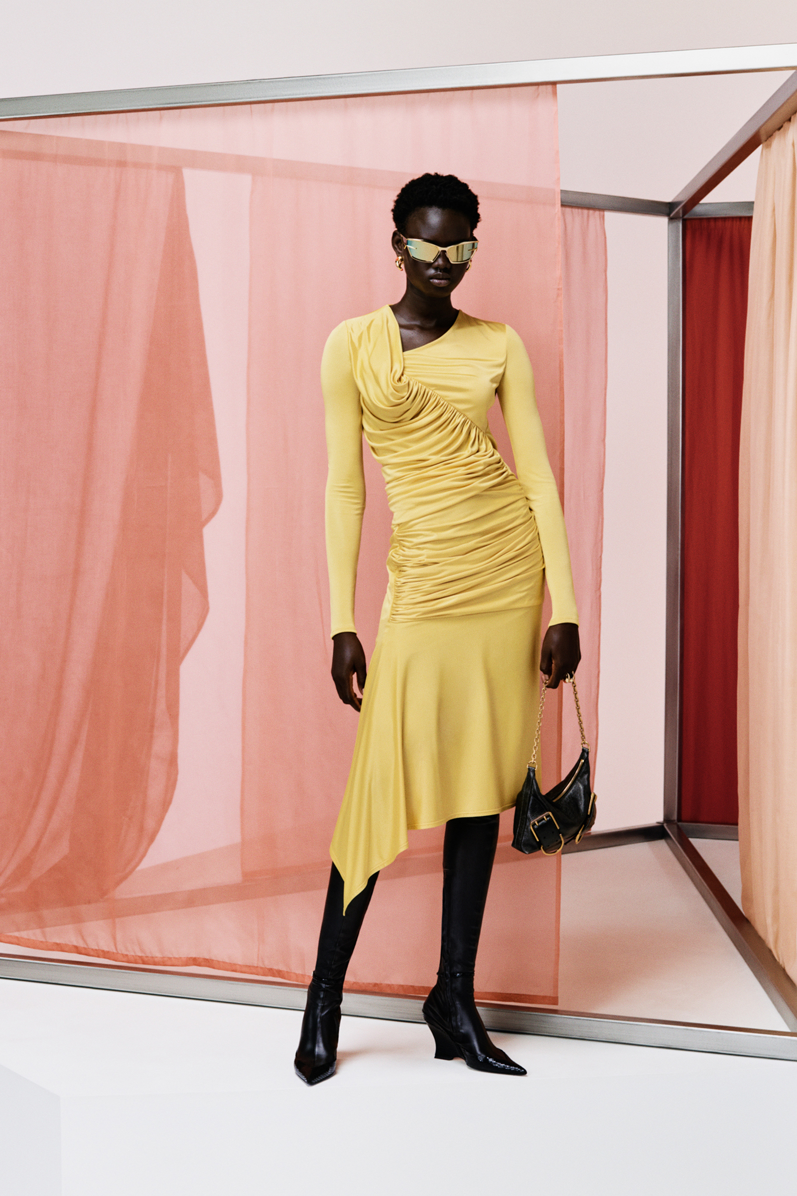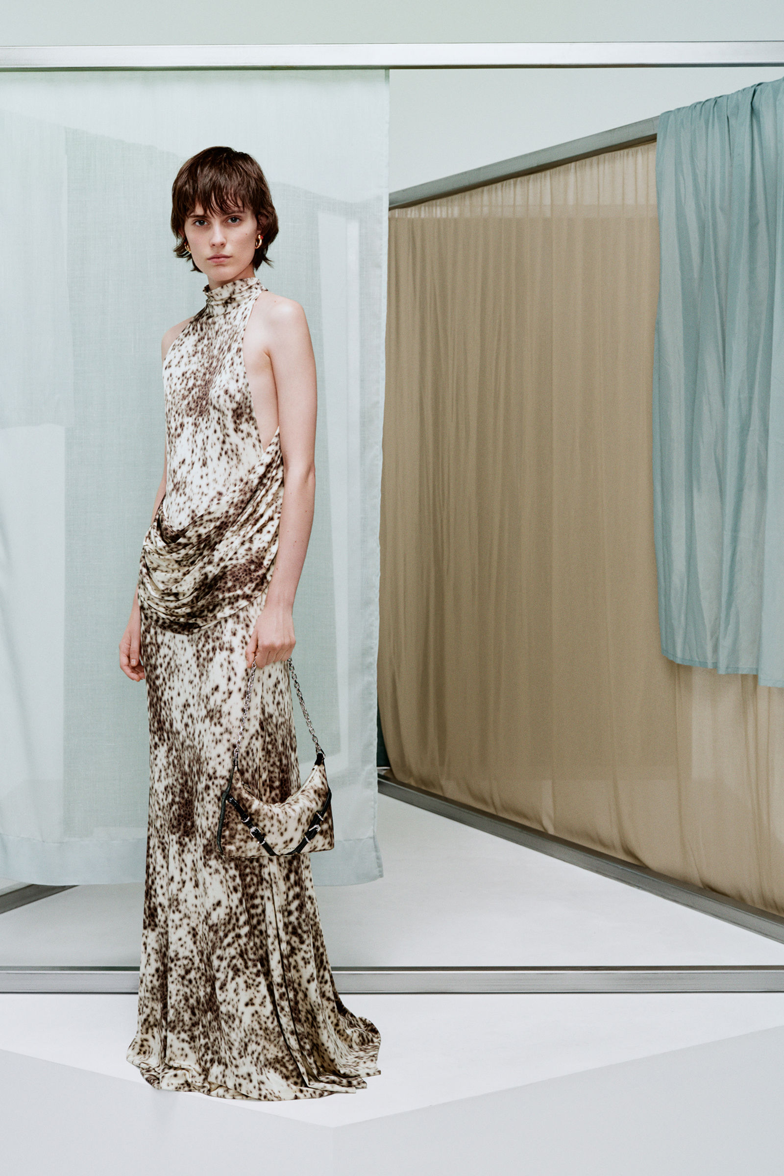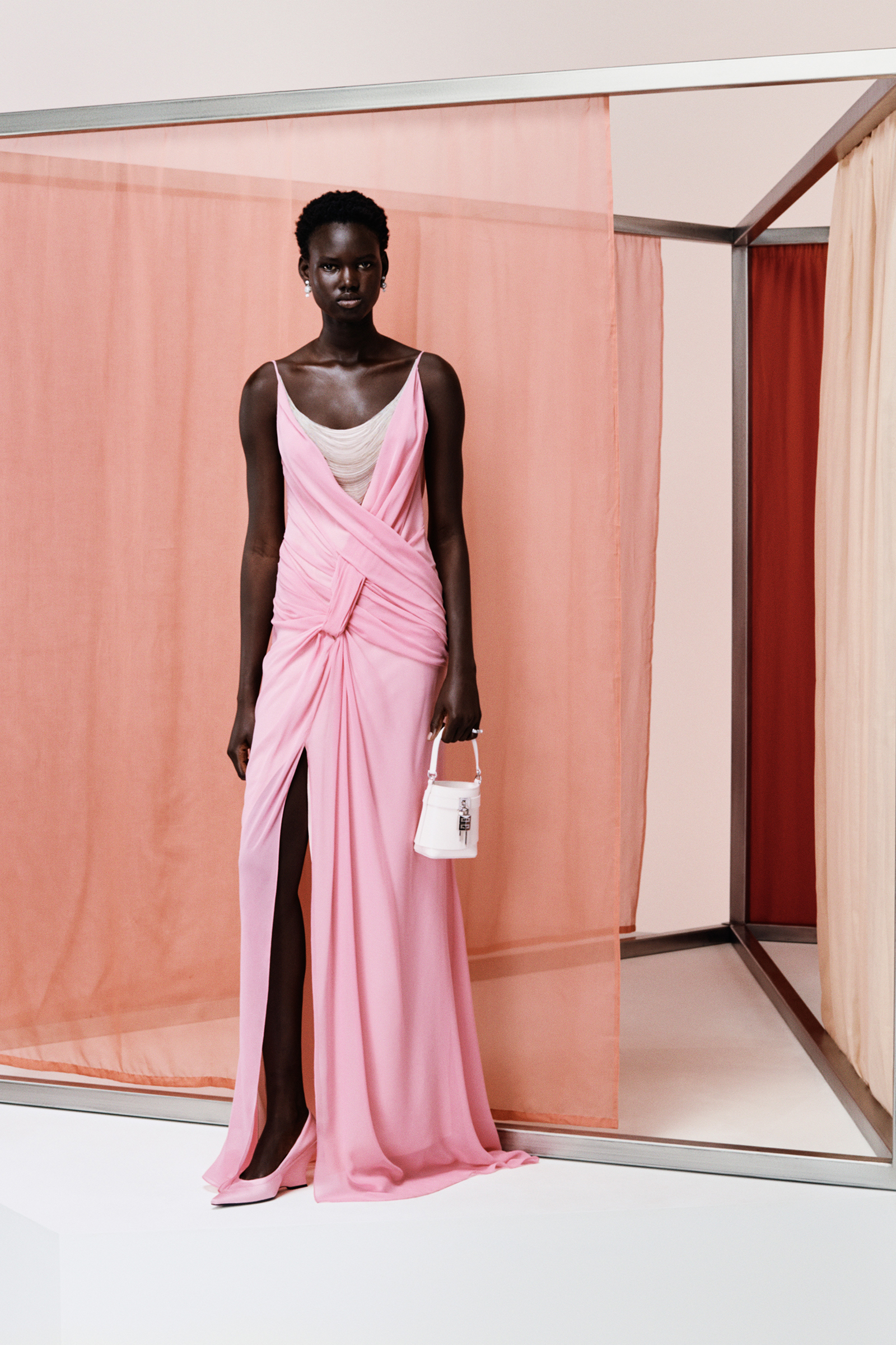 When it comes to womenswear, Givenchy’s heritage is up there in the pantheon. And wisely, Matthew M. Williams has of late become much more engaged with the specific archival codes of his original predecessor. This resort duly included a series of prettily and precisely draped evening dresses in confectionary colors. Added to these riffs on Hubert’s classical and sometimes almost minimal mid-20th century womenswear silhouettes, realized in new-century materials, were contemporary accessories including Voyou bags and footwear including Cowboy Shark boots. The combination created a sort of fashion time-travel impression: Audrey Hepburn in a Tik Tok by Hitchcock.