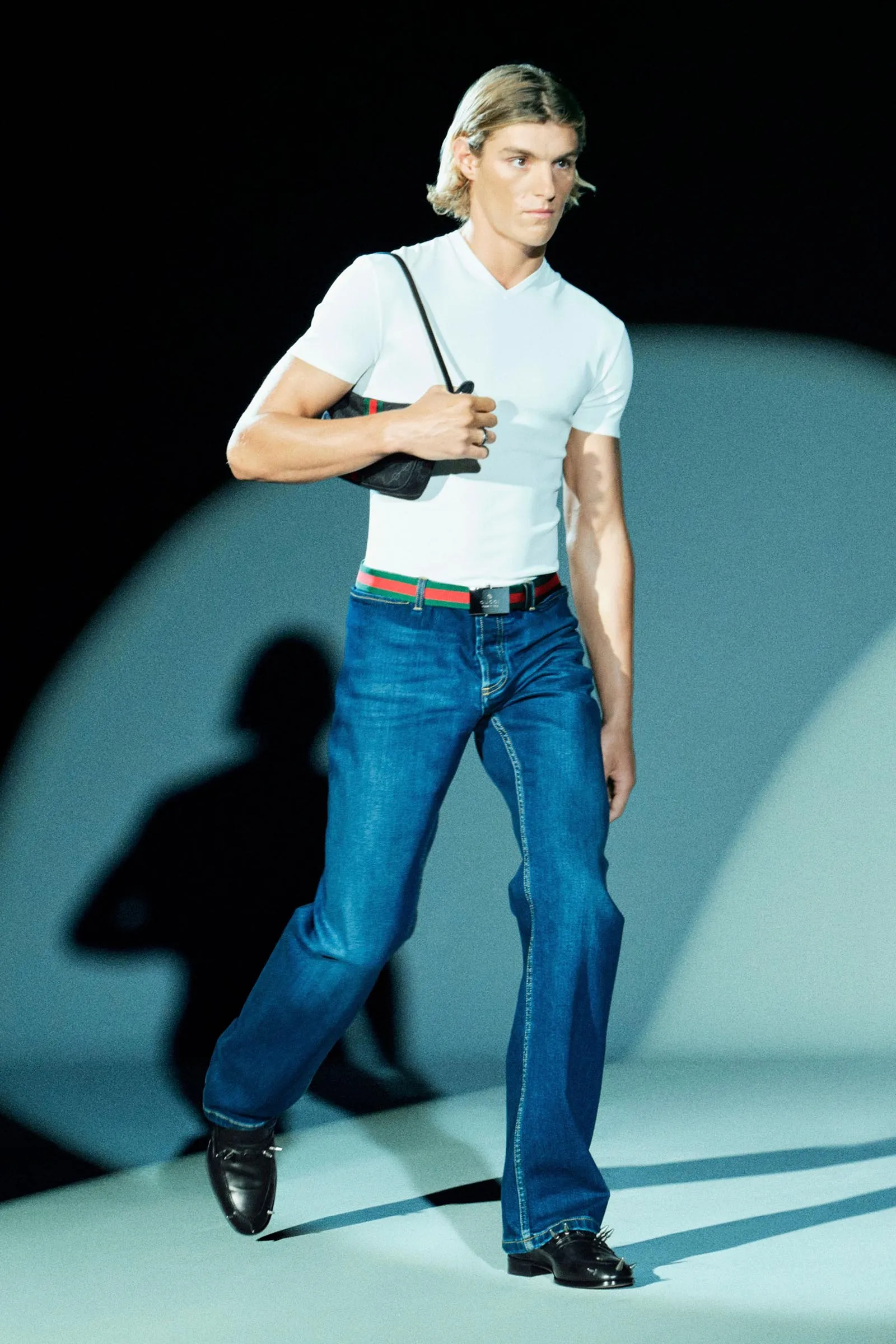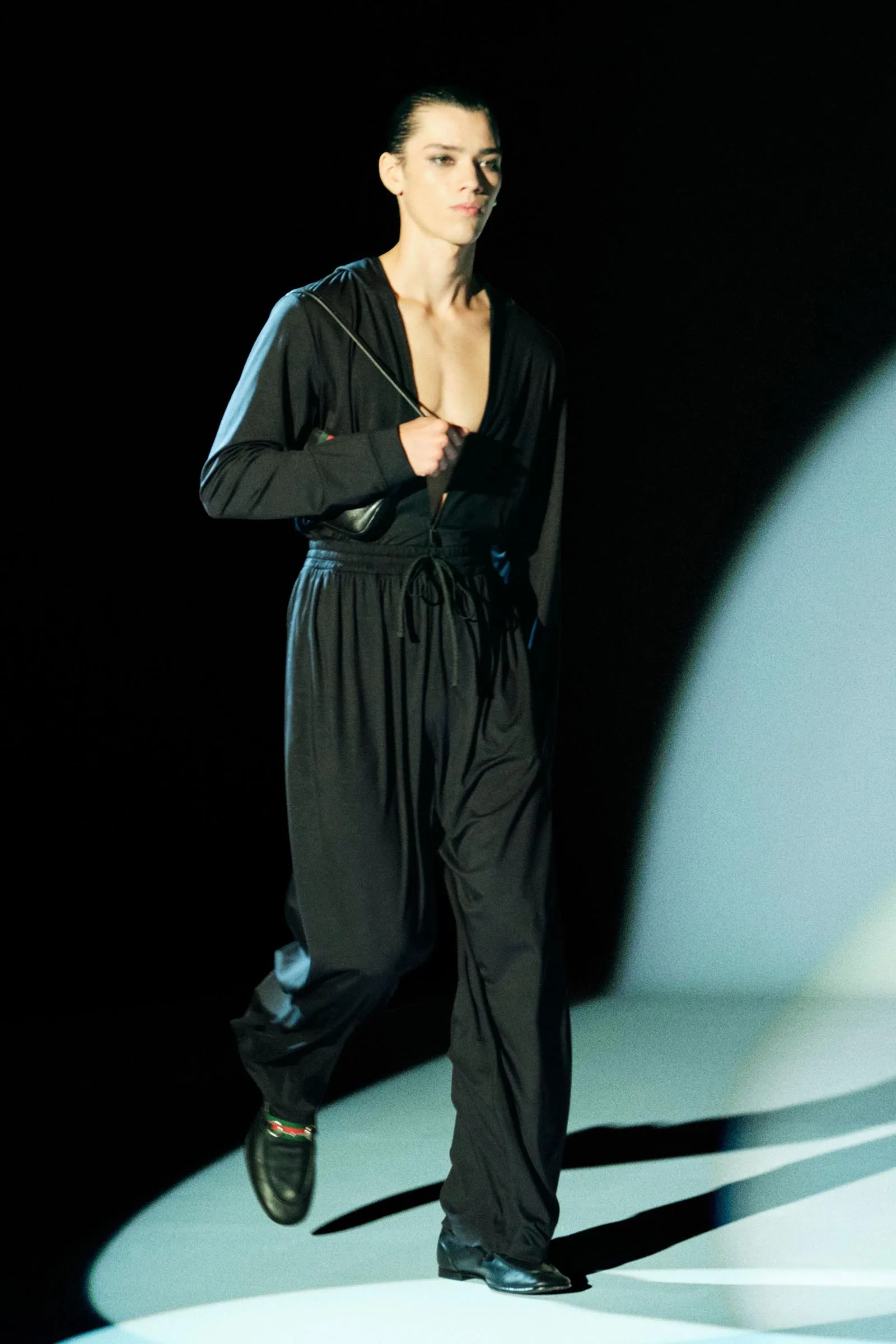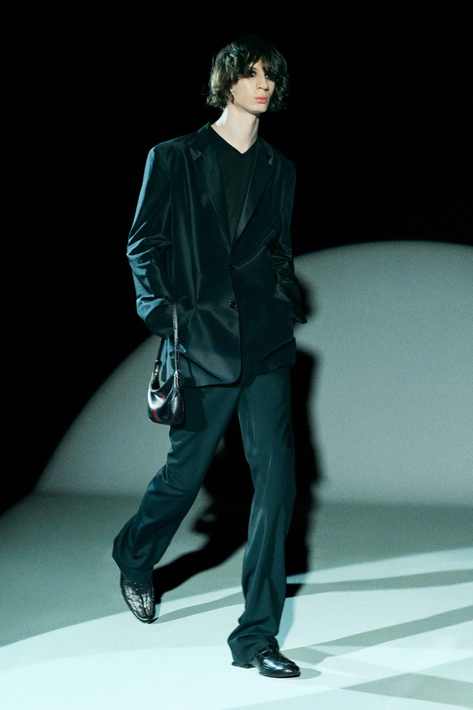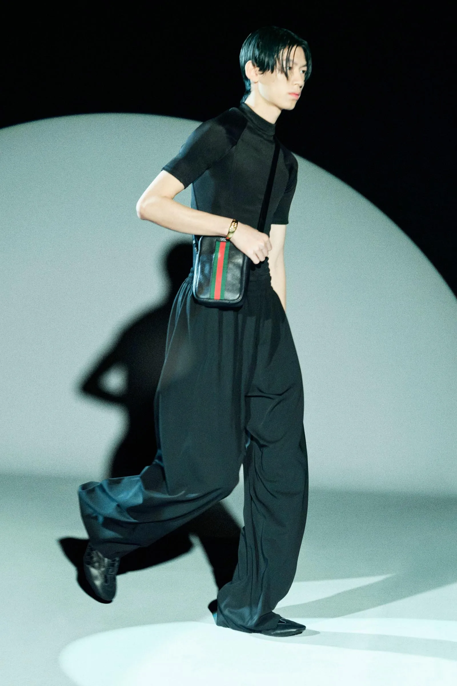 What crystallized this collage into coherence was the “emotional,” even sometimes self-centered, approach to Demna’s articulation of Gucci product. Of the Lunetta Phone+, his first-ever bag for the brand that’s a wrist-strapped wisp of a thing just big enough to stash a wallet and a digital device in, he said: “Actually it’s a little bit of a selfish bag, because I made it for myself.” Of the leather racer jacket with Gucci-color Web stripes down each sleeve, he noted: “This is a jacket I made for myself because there were a lot of racing jackets in the archive, but the fits were a bit too ’90s. I wanted to do a fit that is more now, using Web as a branding.” There was a black, point-toed Valigeria ballerina drawn from the archive and rebooted in his size. His ballsy V-neck t-shirts—a heavy flirt with the boundaries of current conventional menswear taste—were generated by a deep-rooted memory of his own teenage FOMO. He said: “I’m going there! I realized the V-neck is such a Gucci item.”