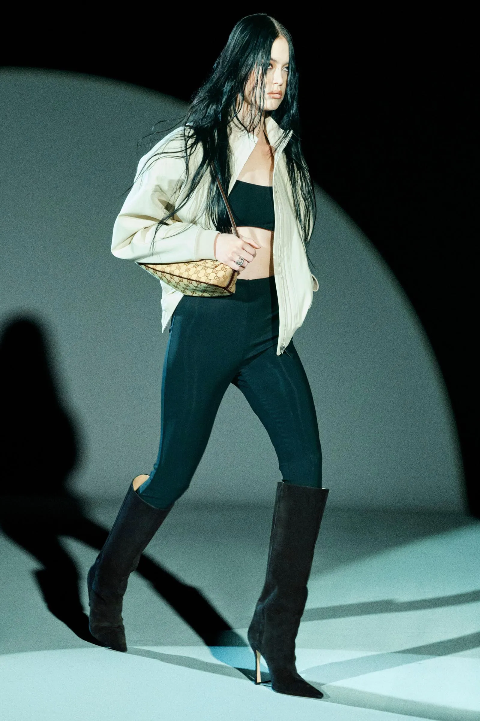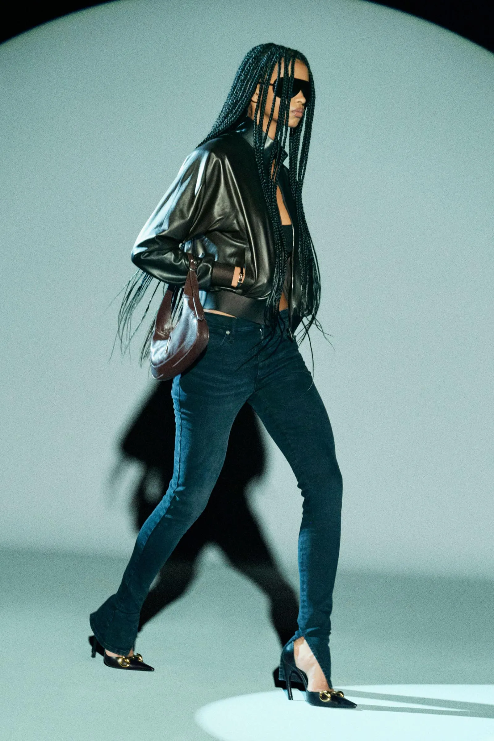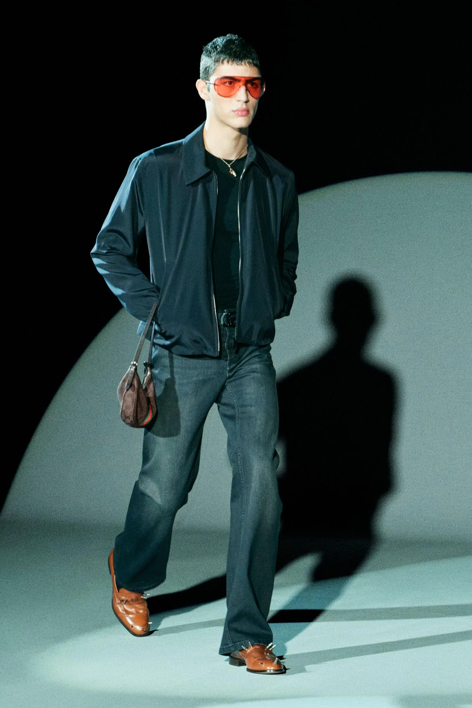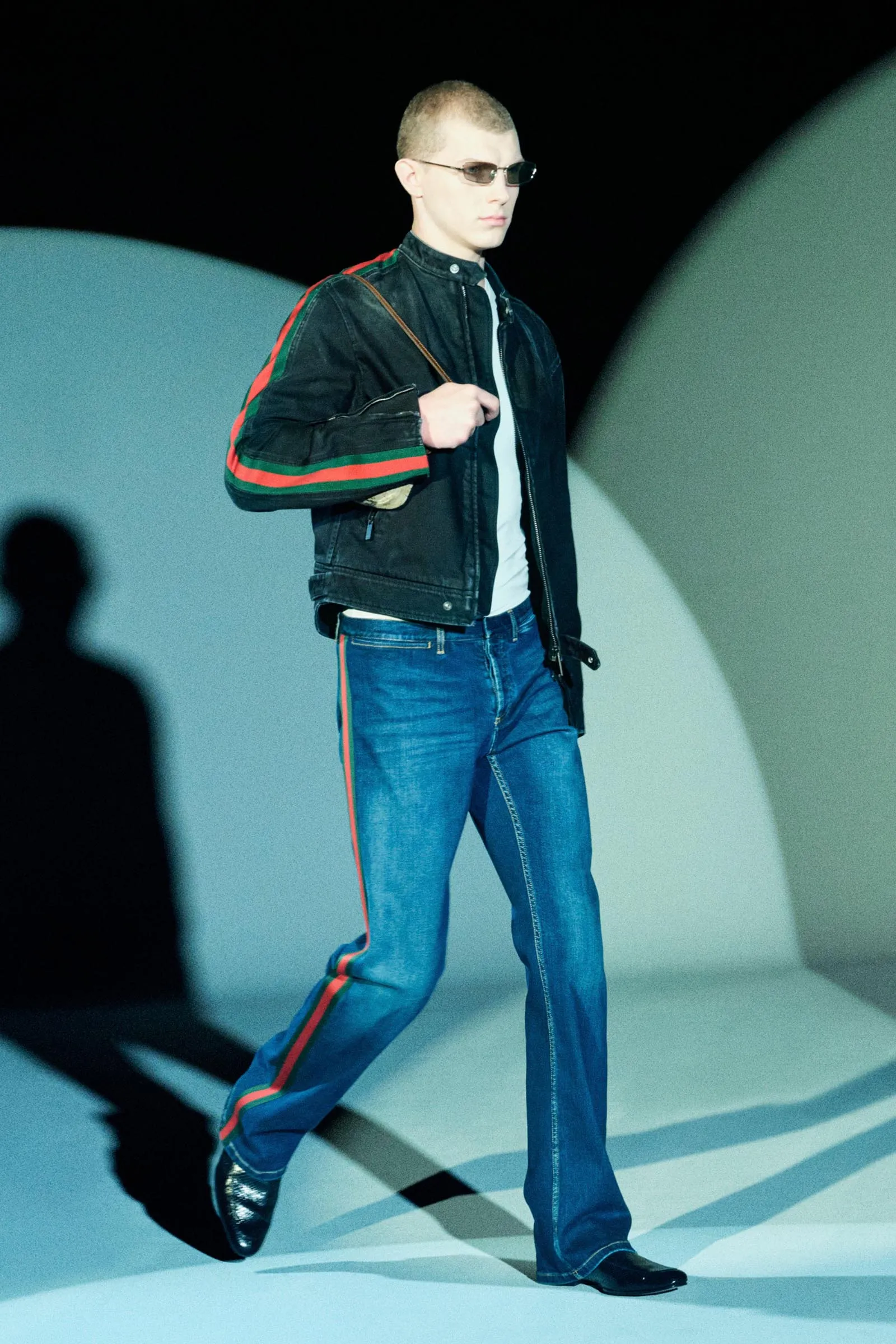 What crystallized this collage into coherence was the “emotional,” even sometimes self-centered, approach to Demna’s articulation of Gucci product. Of the Lunetta Phone+, his first-ever bag for the brand that’s a wrist-strapped wisp of a thing just big enough to stash a wallet and a digital device in, he said: “Actually it’s a little bit of a selfish bag, because I made it for myself.” Of the leather racer jacket with Gucci-color Web stripes down each sleeve, he noted: “This is a jacket I made for myself because there were a lot of racing jackets in the archive, but the fits were a bit too ’90s. I wanted to do a fit that is more now, using Web as a branding.” There was a black, point-toed Valigeria ballerina drawn from the archive and rebooted in his size. His ballsy V-neck t-shirts—a heavy flirt with the boundaries of current conventional menswear taste—were generated by a deep-rooted memory of his own teenage FOMO. He said: “I’m going there! I realized the V-neck is such a Gucci item.”