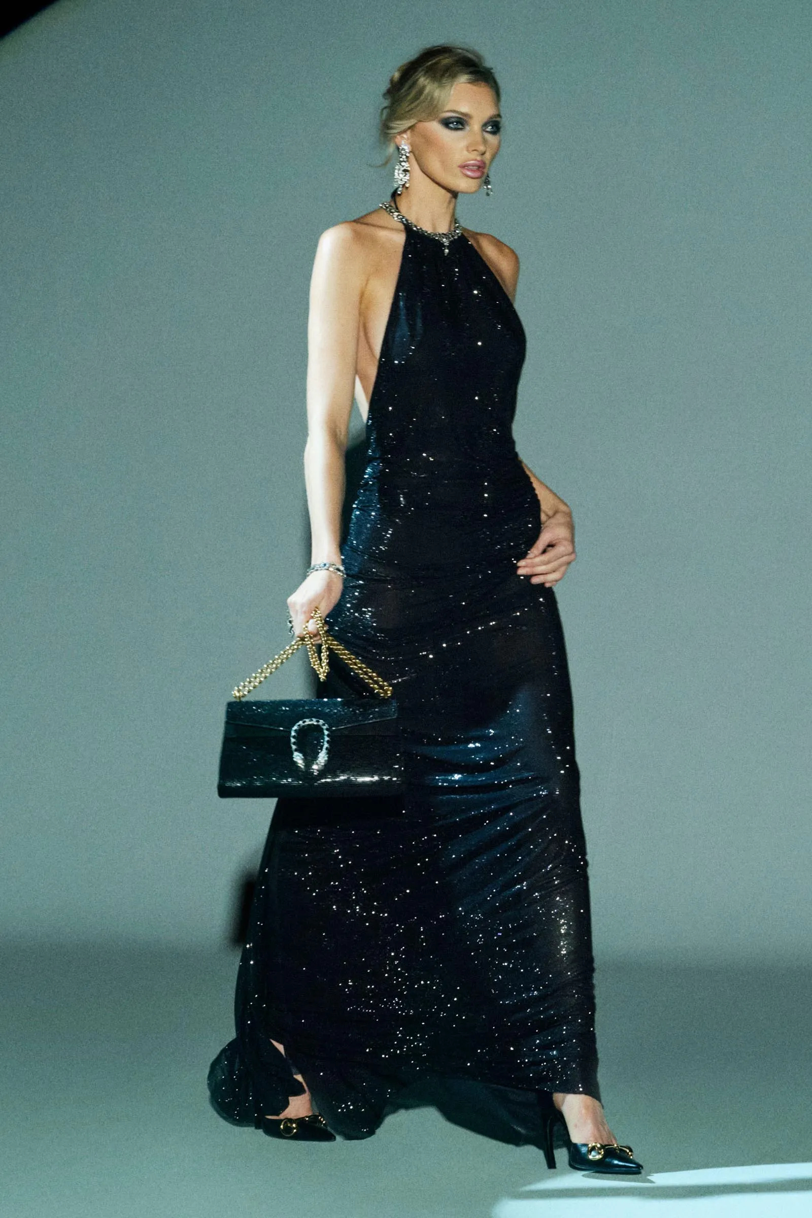 The collection was doubly subject to Demna’s lens. He shot the lookbook himself as an on-purpose echo of that big bang moment when Gucci first fired fashion FOMO. He said: “These images were very much in my Gucci memory. I wanted to recreate that as if it was a Gucci show that is not on Vogue Runway for some reason.” Along with plentiful references to Ford-era cutting-edge Gucci the collection was a wide-ranging fusion that encompassed classic ’70s pre-fashion Gucci and also touched upon later, 21st century phases. Of Frida Giannini’s time at the brand, for instance, he observed: “There is a certain Italian feminine glamour to what she did that I find very rare to see.”