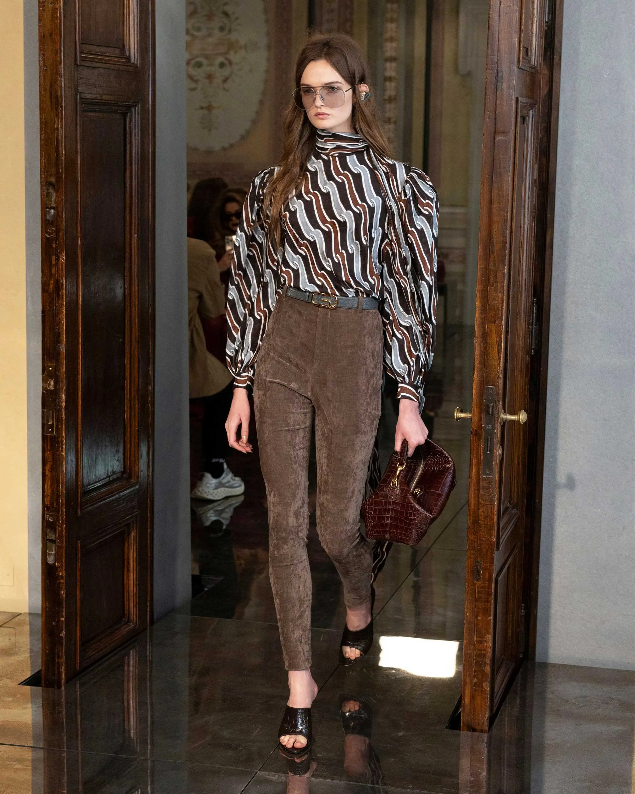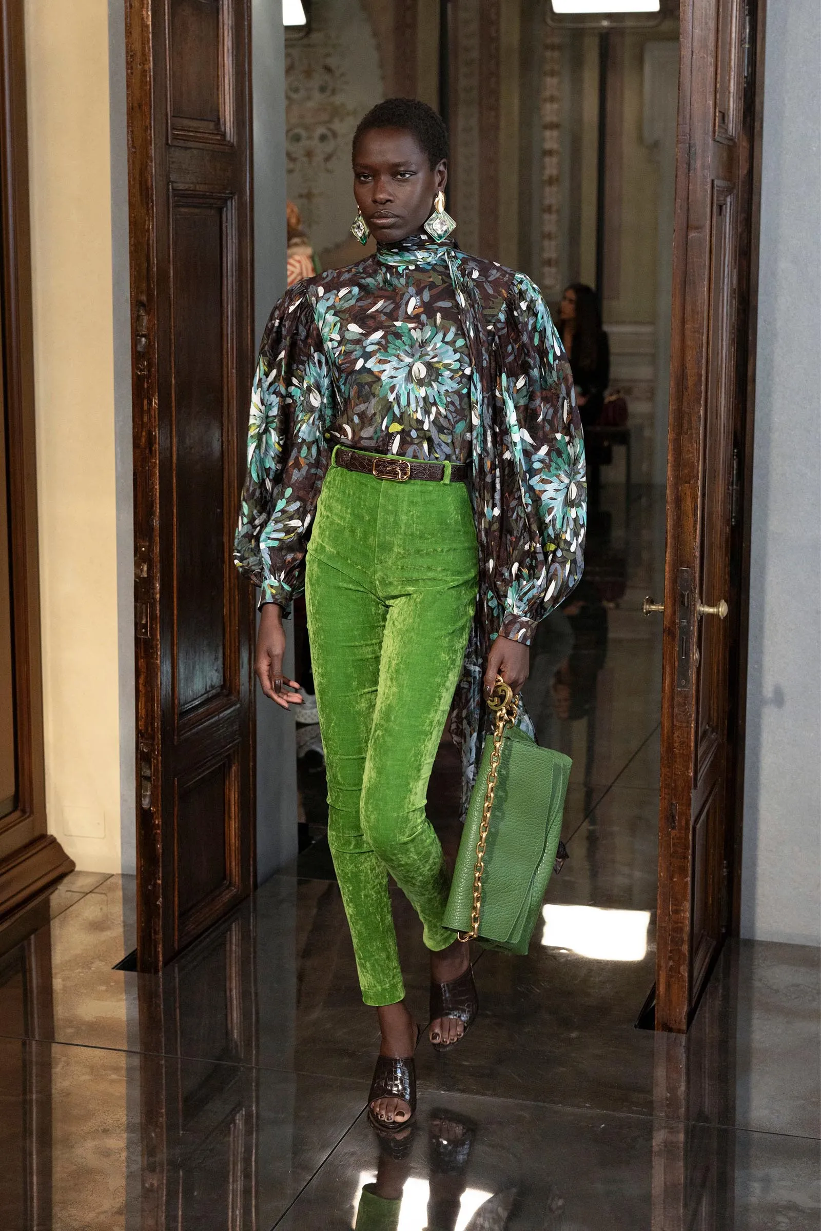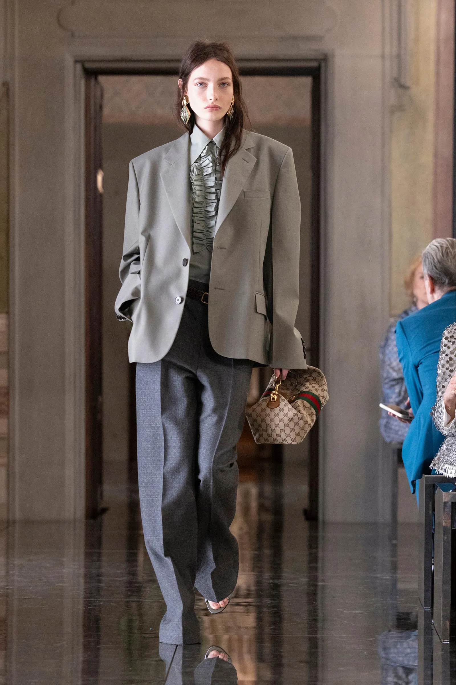 A few hours later, after a brief spatter of rain that gave Gucci staffers the jitters, we returned for the second show. This one was much more public-facing: an audience that included Paul Mescal, Viola Davis, Julia Garner, and Jeff Goldblum trooped into the archive. Instead of joining them, however, we second-time around reviewers were shown to spots in Piazza Santo Spirito, a public square just around the corner. This is why that passing rain had been so worrisome: there were also scores of Gucci staffers seated in the bars and cafes adjoining the square, and a healthy crowd of Florentine fashion fans watching from under the basilica. First we heard the Ennio Morricone soundtrack from inside the archive, before the models appeared around the corner of via delle Caldaie, striding across the pitted flagstones and around the burbling fountain.
