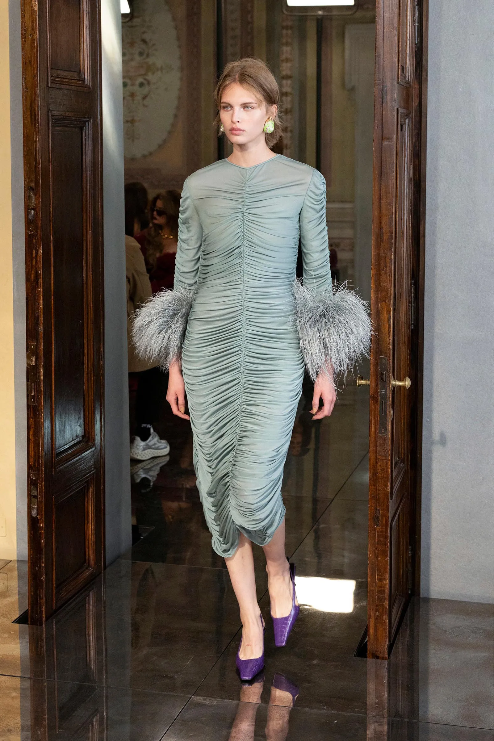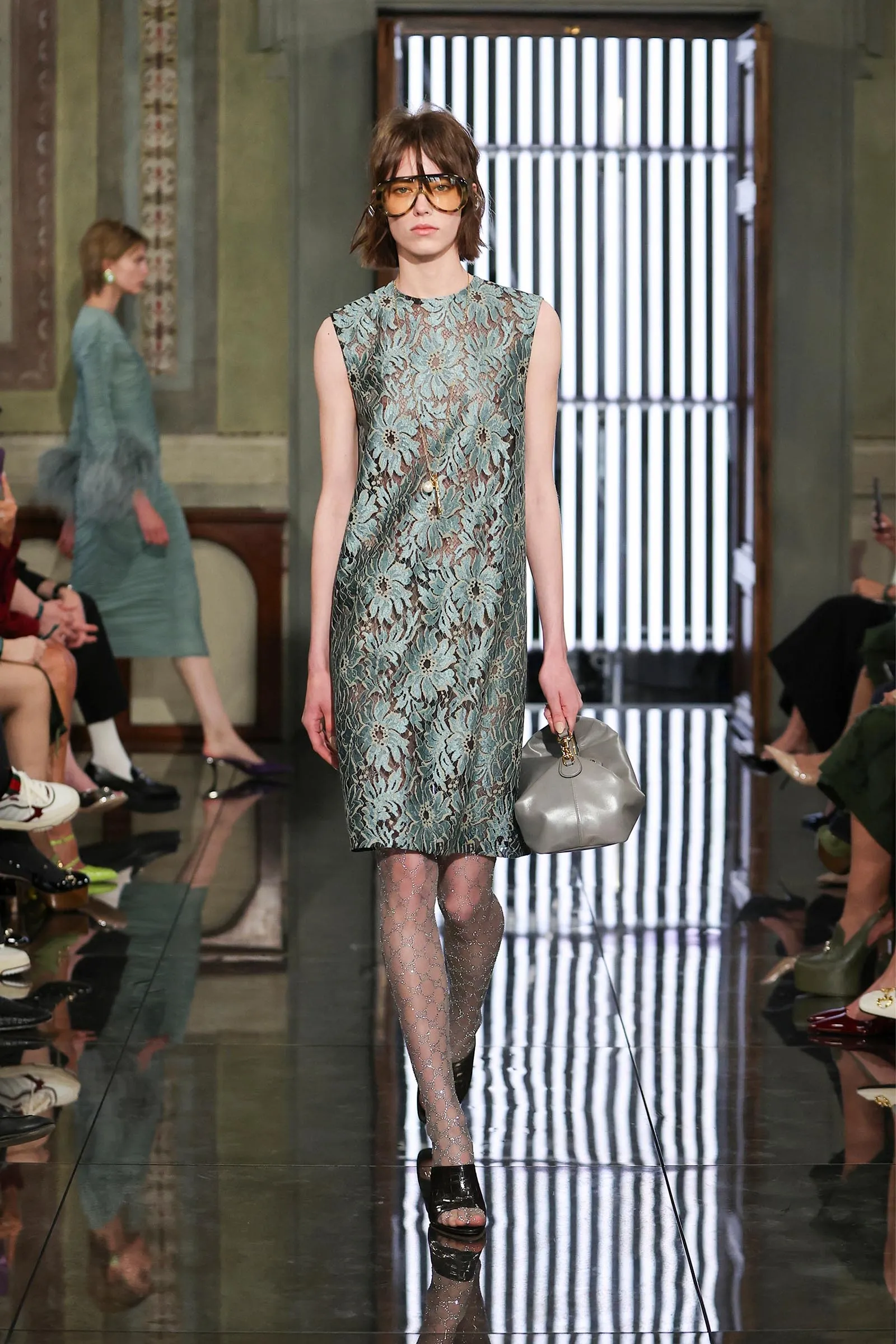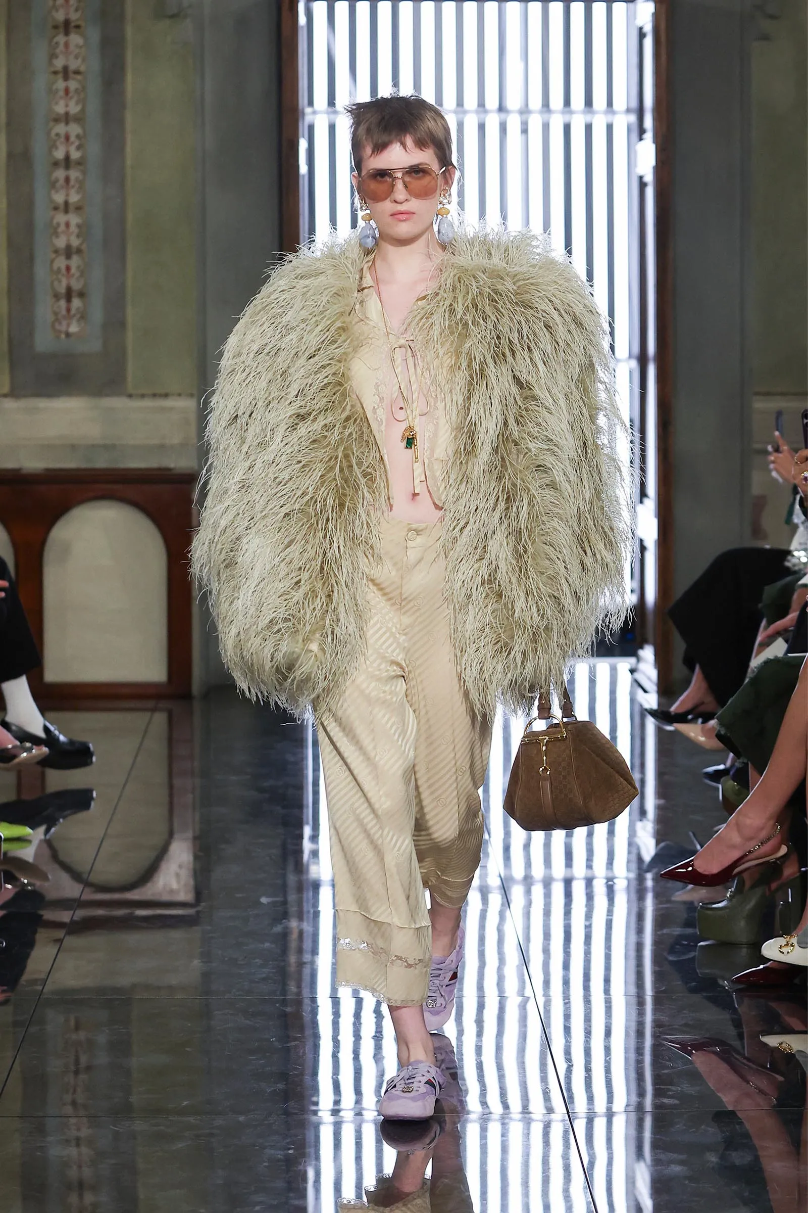 The collection we saw reflected above it seemed to some extent an amalgam of multiple phases of Gucci’s ready-to-wear past. Its guiding spirit was the late mid-century jet-set glamour that Ford identified in the DNA of the house, then transformed from dusty to must-have during his time here. Around these foundational feathered chubbies and deep-neckline sequin gowns were further layered allusive brushstrokes to his successor’s motifs; the bows and maximalist lushness of Michele, the fitted sleekness of Giannini, the net pattern and masculine leather outerwear of De Sarno. More broadly there was a hyper-stylized, almost cinematically expansive articulation of feminine bourgeois decadence at play that sometimes landed as close to the Seine as it did to the Arno.