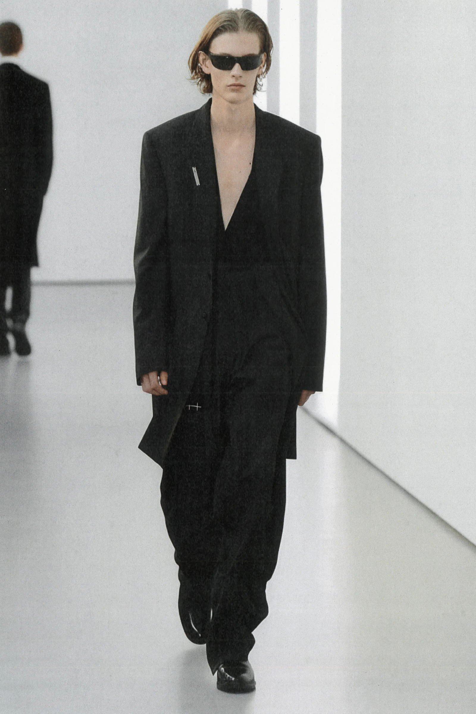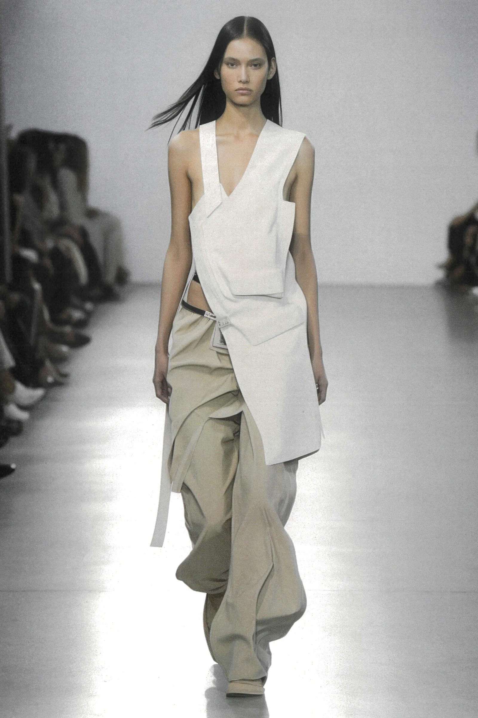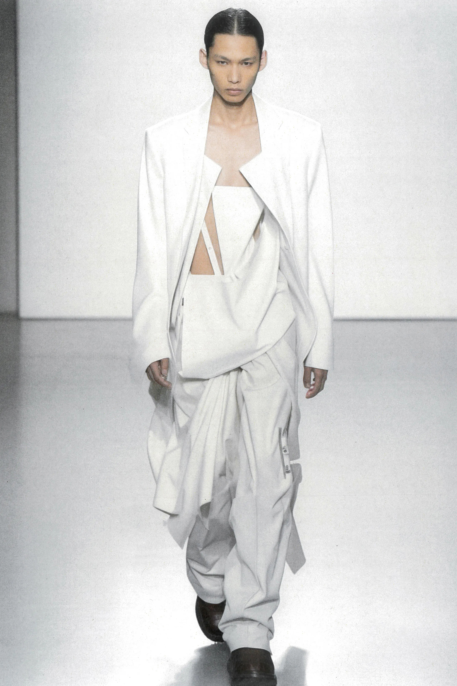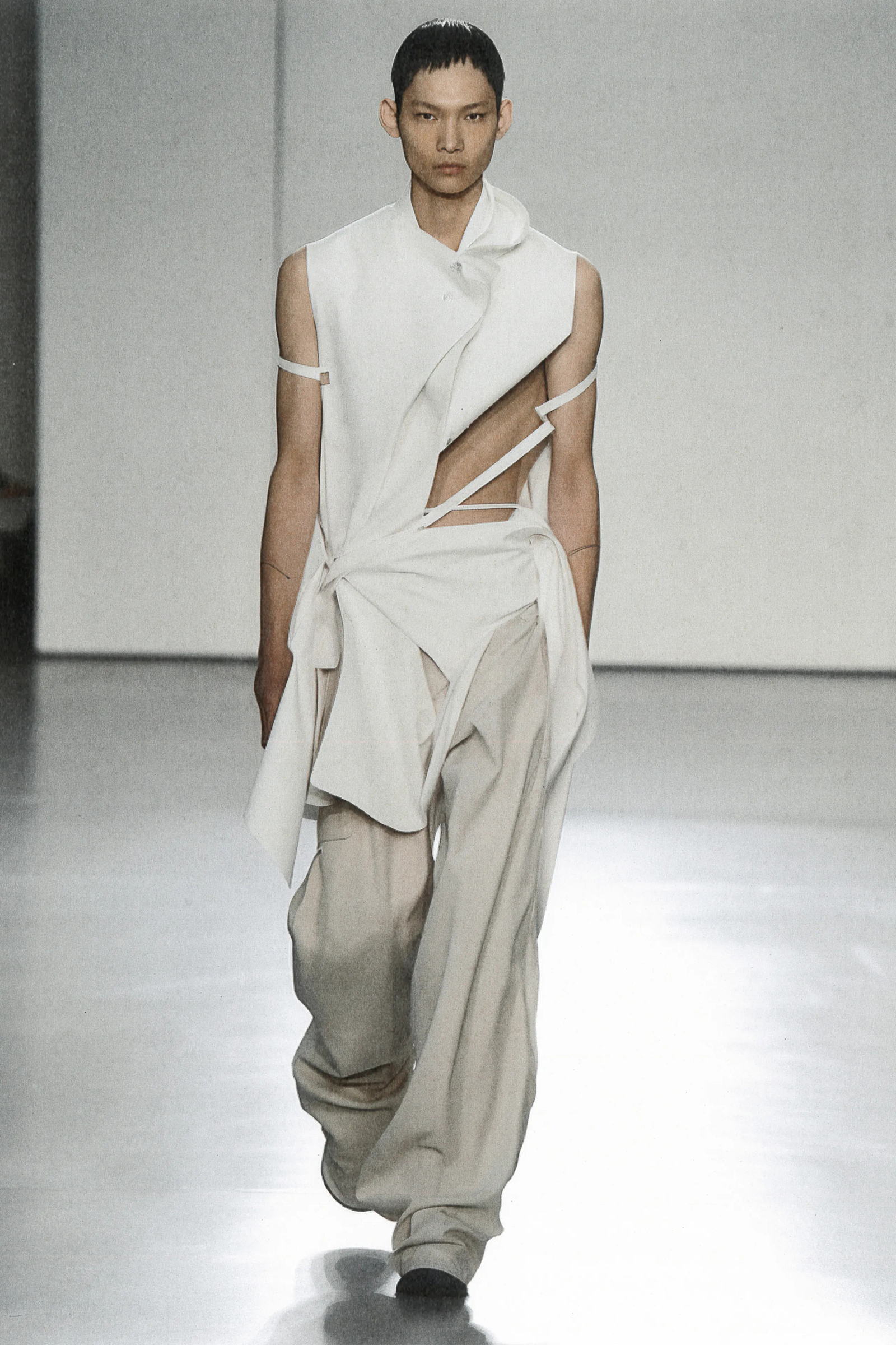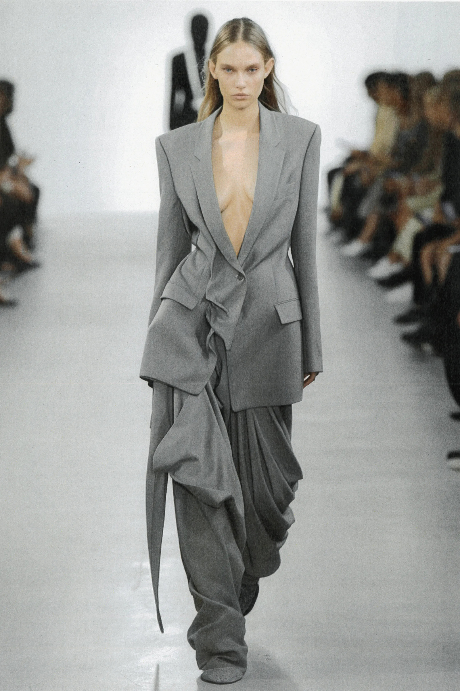 The brand’s aesthetic is hard, sleek, streamlined, features a lot of hardware, and is not especially emotional. Funnily enough spring’s man-meets-machine lineup had unexpected poetry that was linked to the increase of draping, which took both classical and deconstructed forms. “I think [this AI experiment] has taught me quite a lot about looking inwards,” noted Juul. It also stretched the team creatively on a material level. “It was so interesting to see all of the signatures that the algorithm spits back at you, like the metal details, the trims, those kind of things, but given that it has less boundaries than what we have in reality, it also came back with some very interesting things that if you looked into closely, can’t be created in reality: seams that there’d be no way to finish, or a part coming out of nowhere. That was a very interesting complexity to grasp; the machine doesn’t understand physics in the real world.”