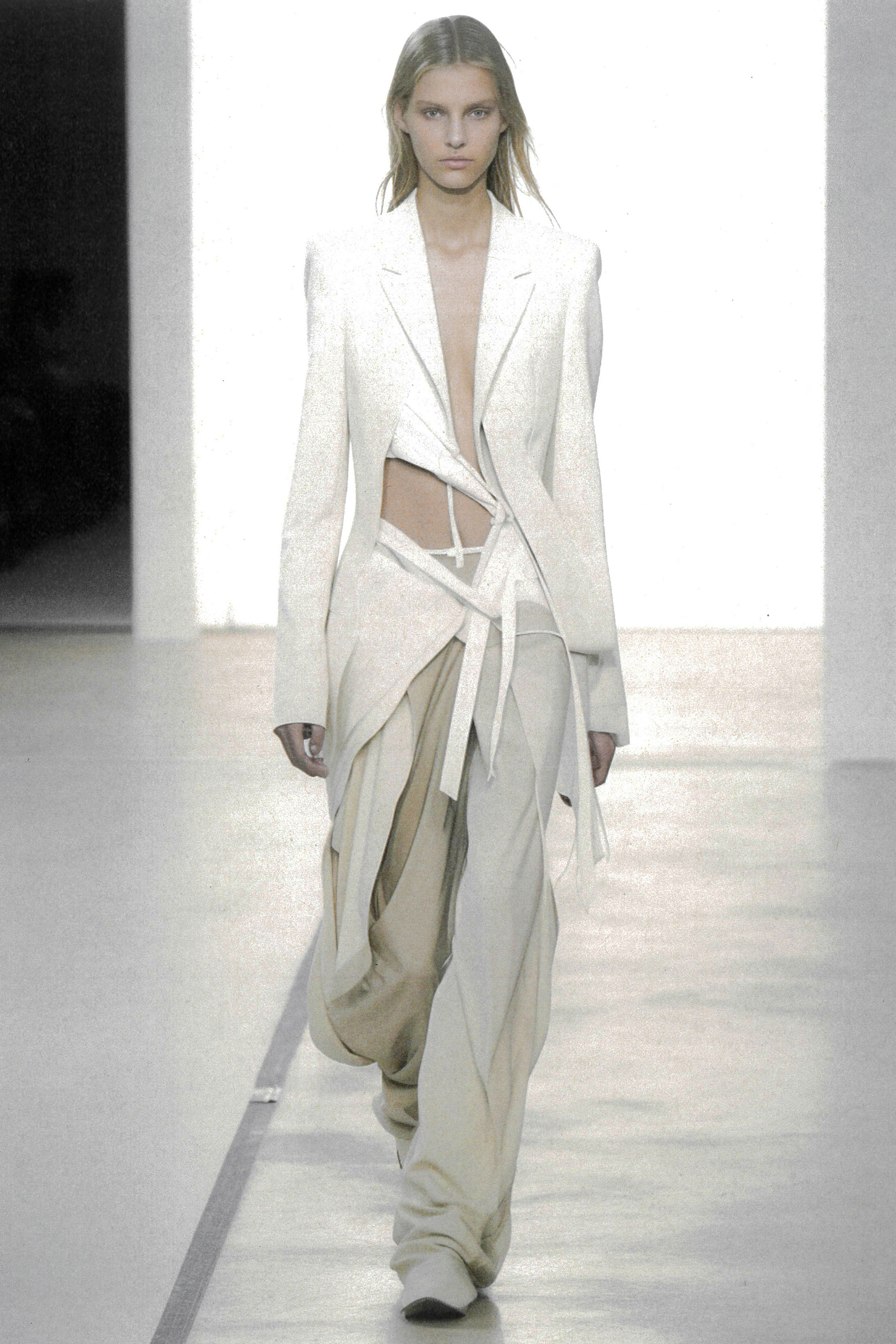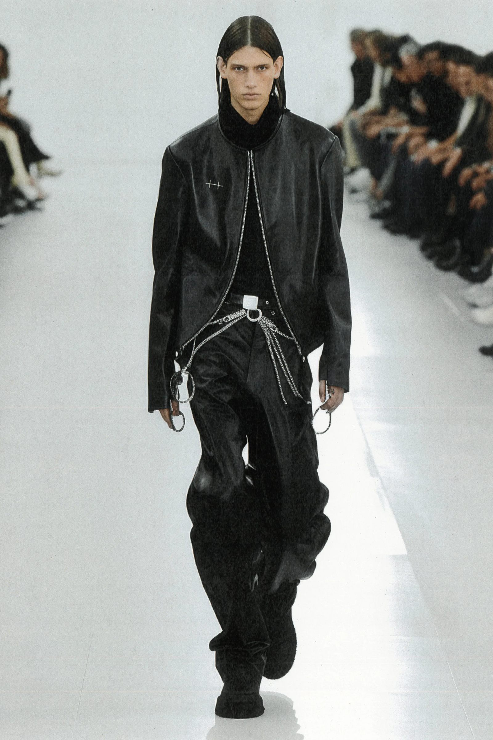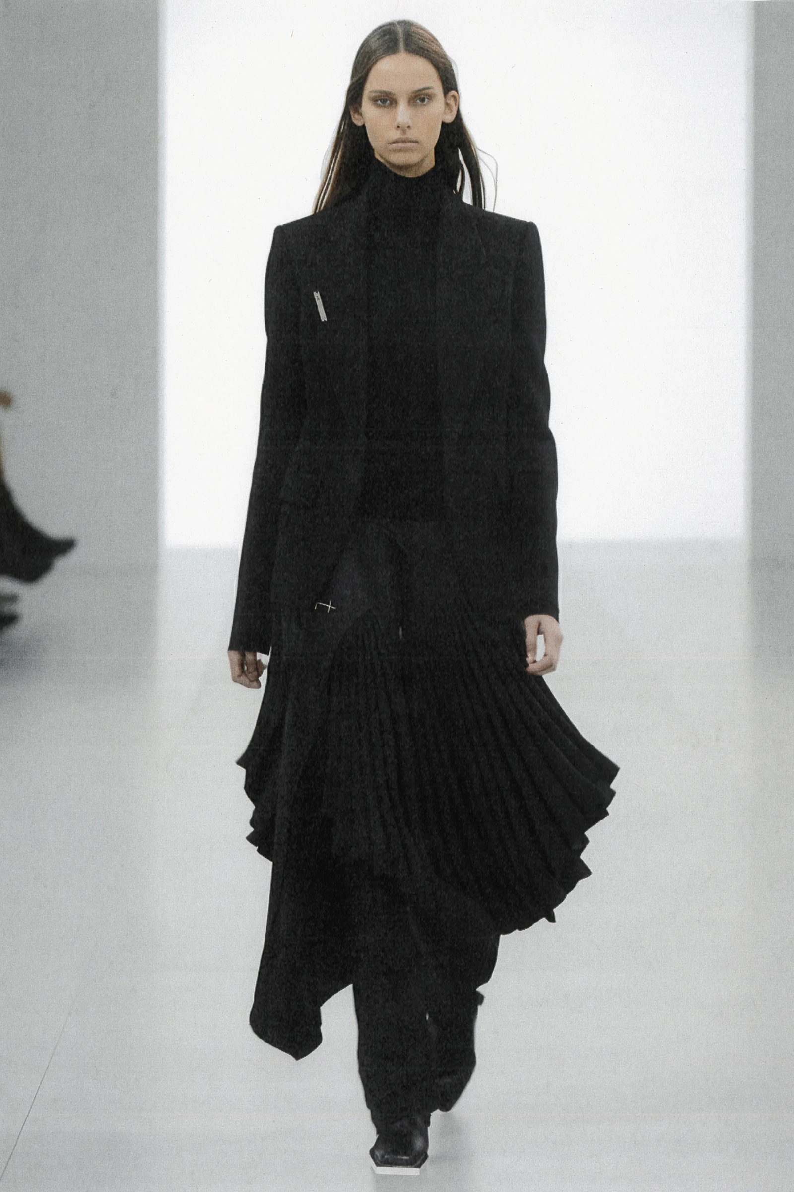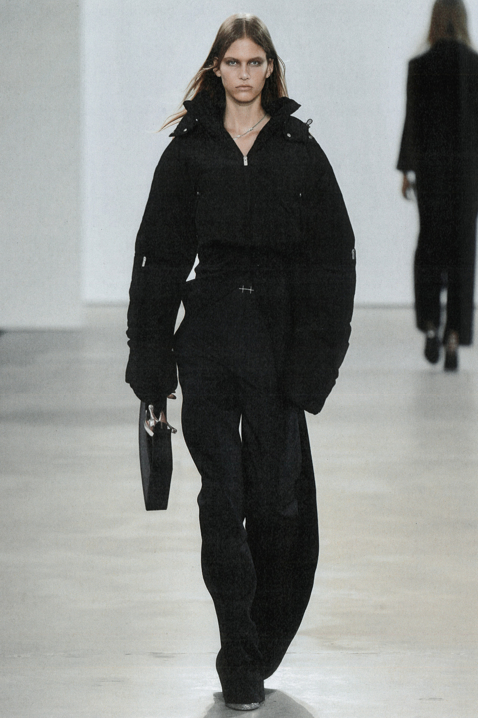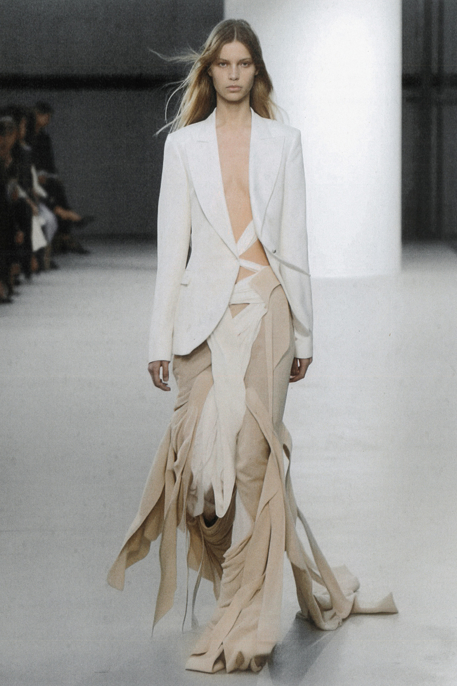 The brand’s aesthetic is hard, sleek, streamlined, features a lot of hardware, and is not especially emotional. Funnily enough spring’s man-meets-machine lineup had unexpected poetry that was linked to the increase of draping, which took both classical and deconstructed forms. “I think [this AI experiment] has taught me quite a lot about looking inwards,” noted Juul. It also stretched the team creatively on a material level. “It was so interesting to see all of the signatures that the algorithm spits back at you, like the metal details, the trims, those kind of things, but given that it has less boundaries than what we have in reality, it also came back with some very interesting things that if you looked into closely, can’t be created in reality: seams that there’d be no way to finish, or a part coming out of nowhere. That was a very interesting complexity to grasp; the machine doesn’t understand physics in the real world.”