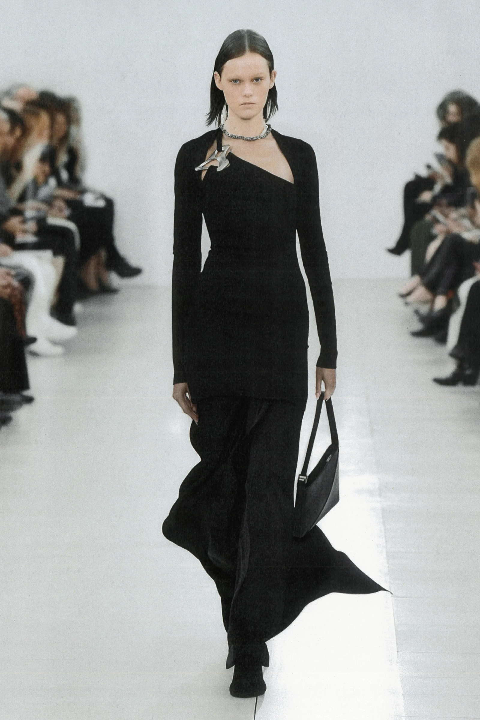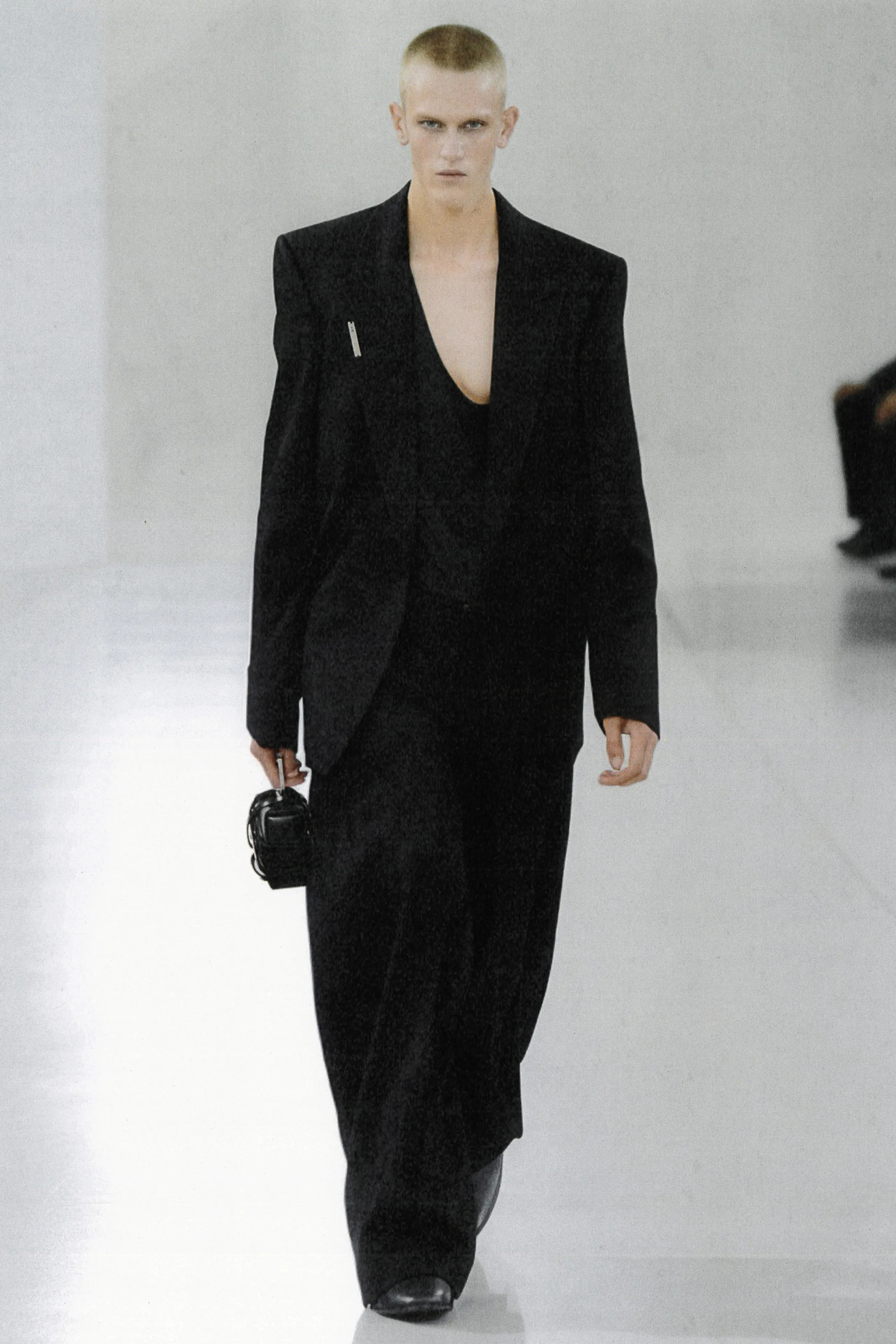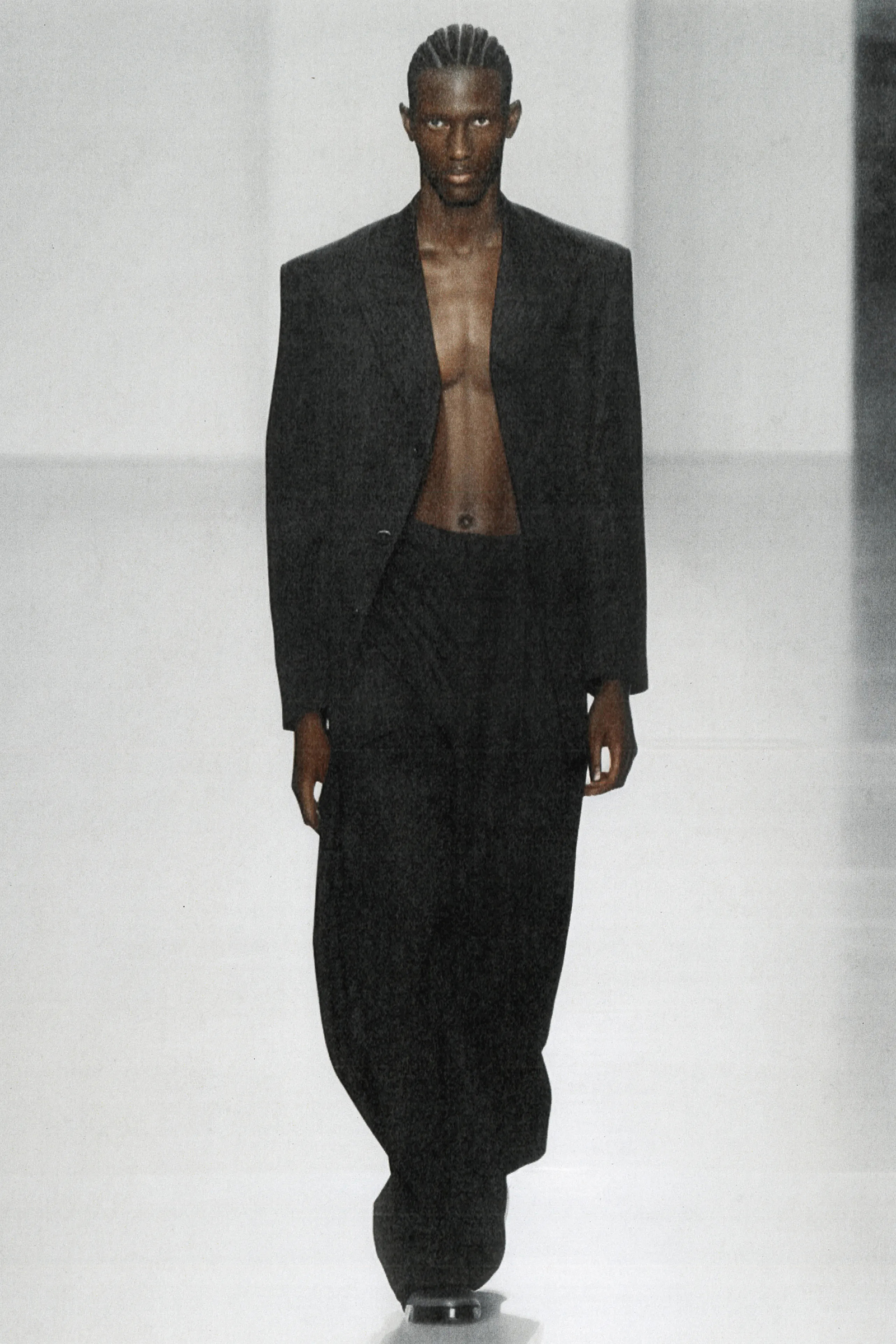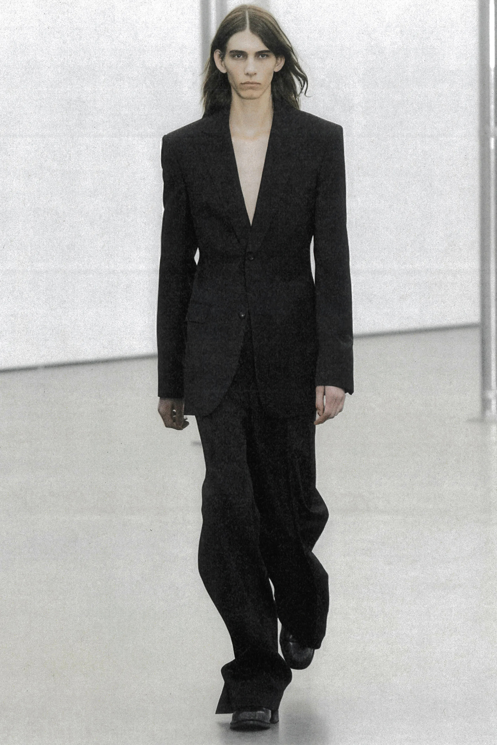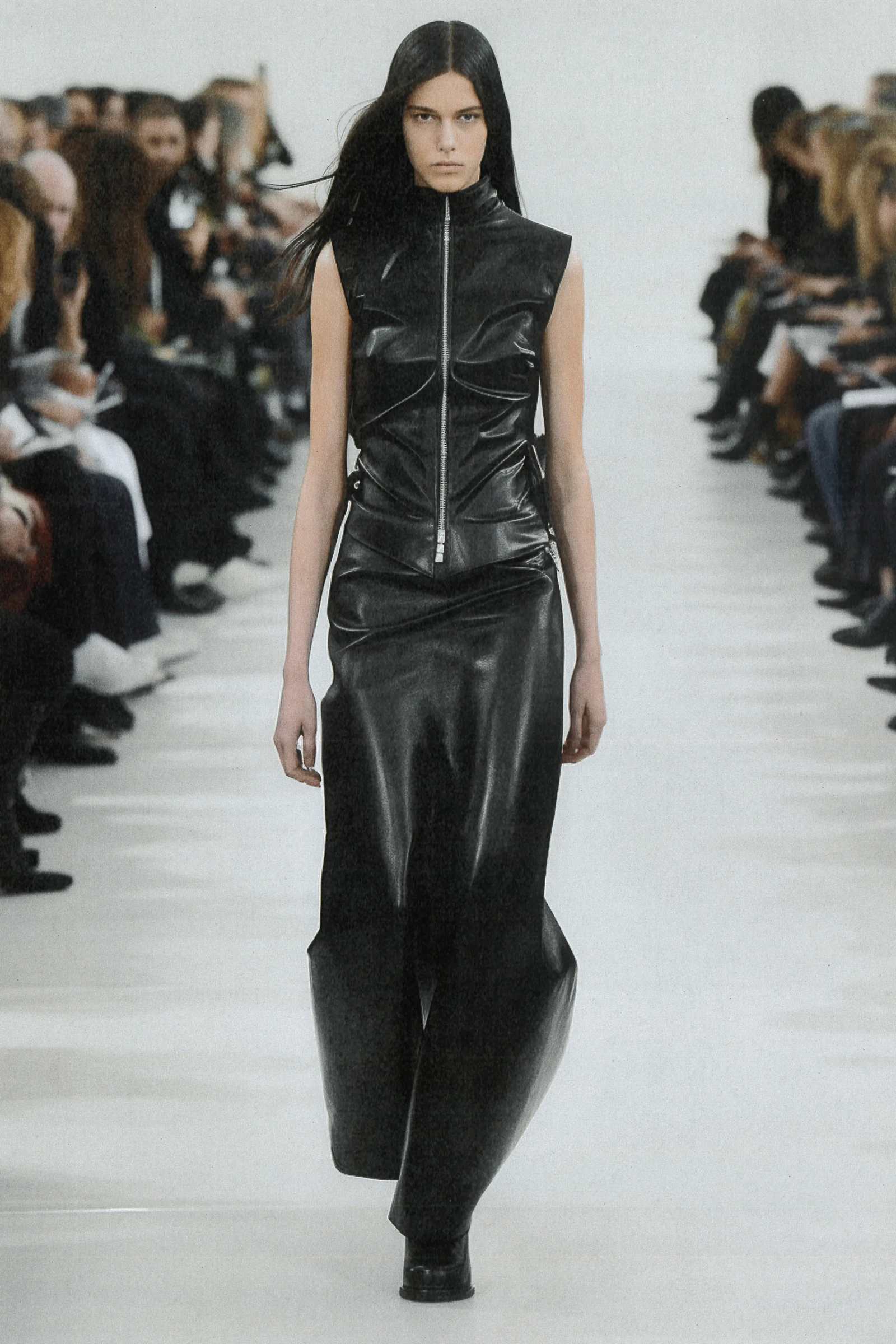 The brand’s aesthetic is hard, sleek, streamlined, features a lot of hardware, and is not especially emotional. Funnily enough spring’s man-meets-machine lineup had unexpected poetry that was linked to the increase of draping, which took both classical and deconstructed forms. “I think [this AI experiment] has taught me quite a lot about looking inwards,” noted Juul. It also stretched the team creatively on a material level. “It was so interesting to see all of the signatures that the algorithm spits back at you, like the metal details, the trims, those kind of things, but given that it has less boundaries than what we have in reality, it also came back with some very interesting things that if you looked into closely, can’t be created in reality: seams that there’d be no way to finish, or a part coming out of nowhere. That was a very interesting complexity to grasp; the machine doesn’t understand physics in the real world.”