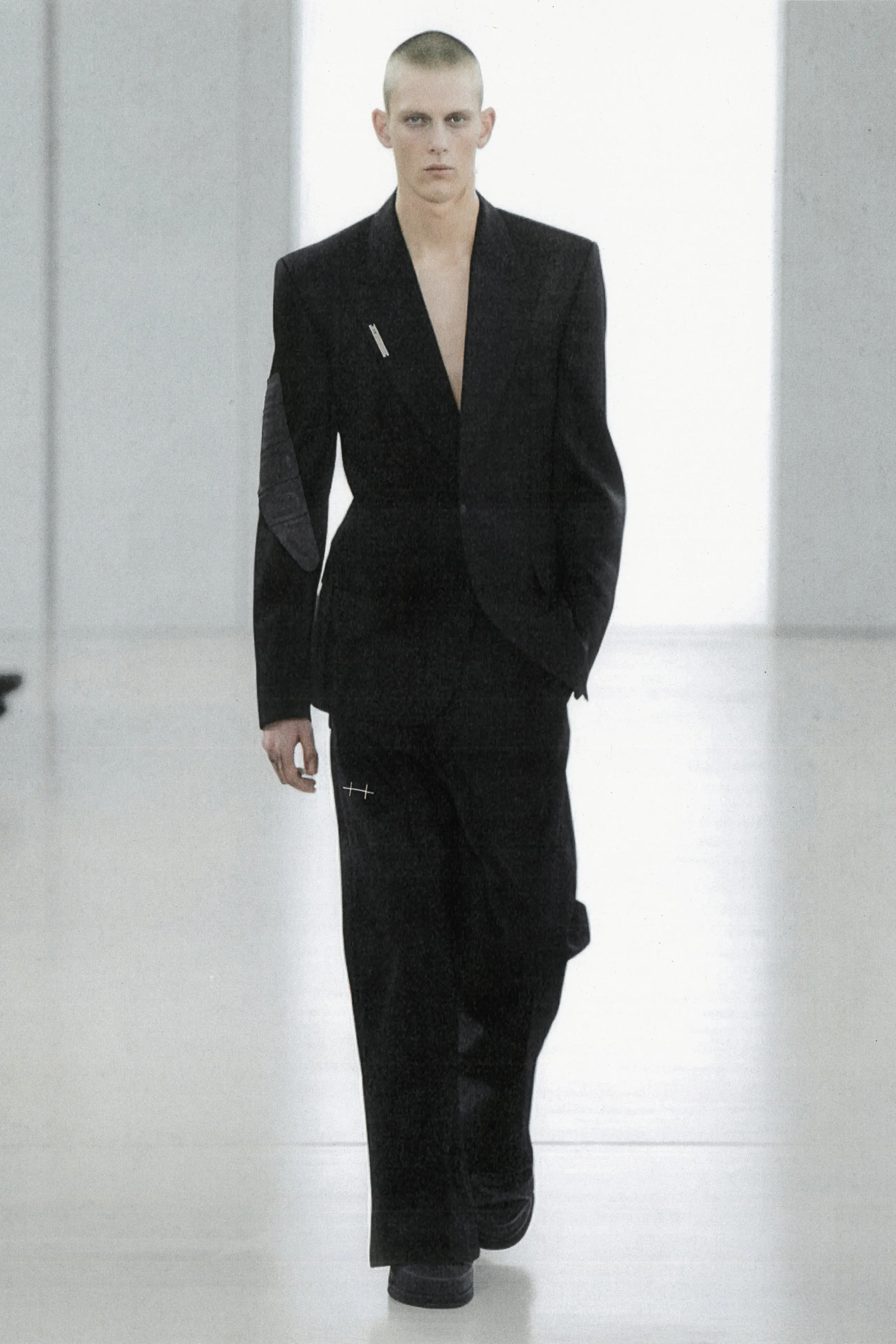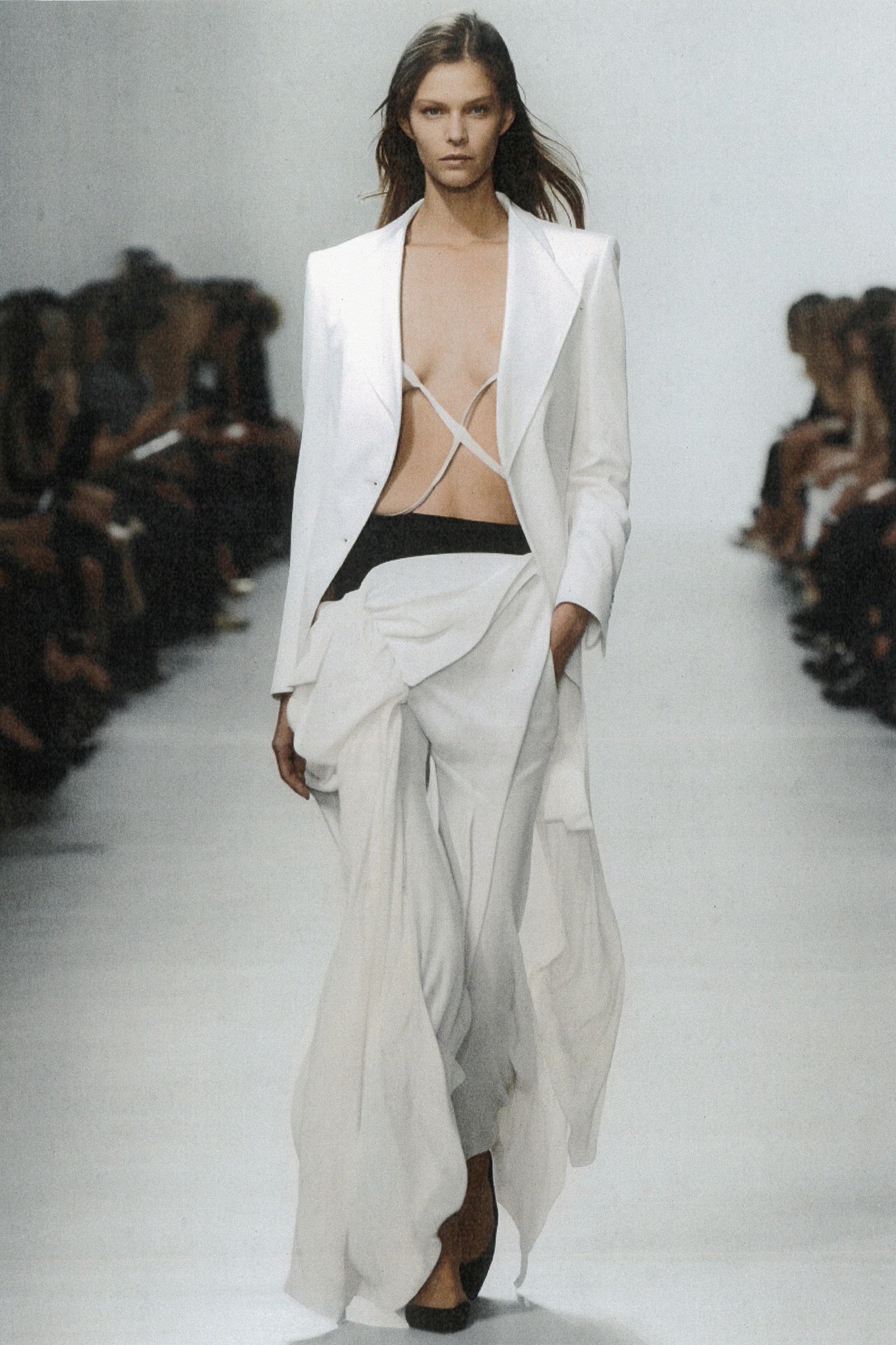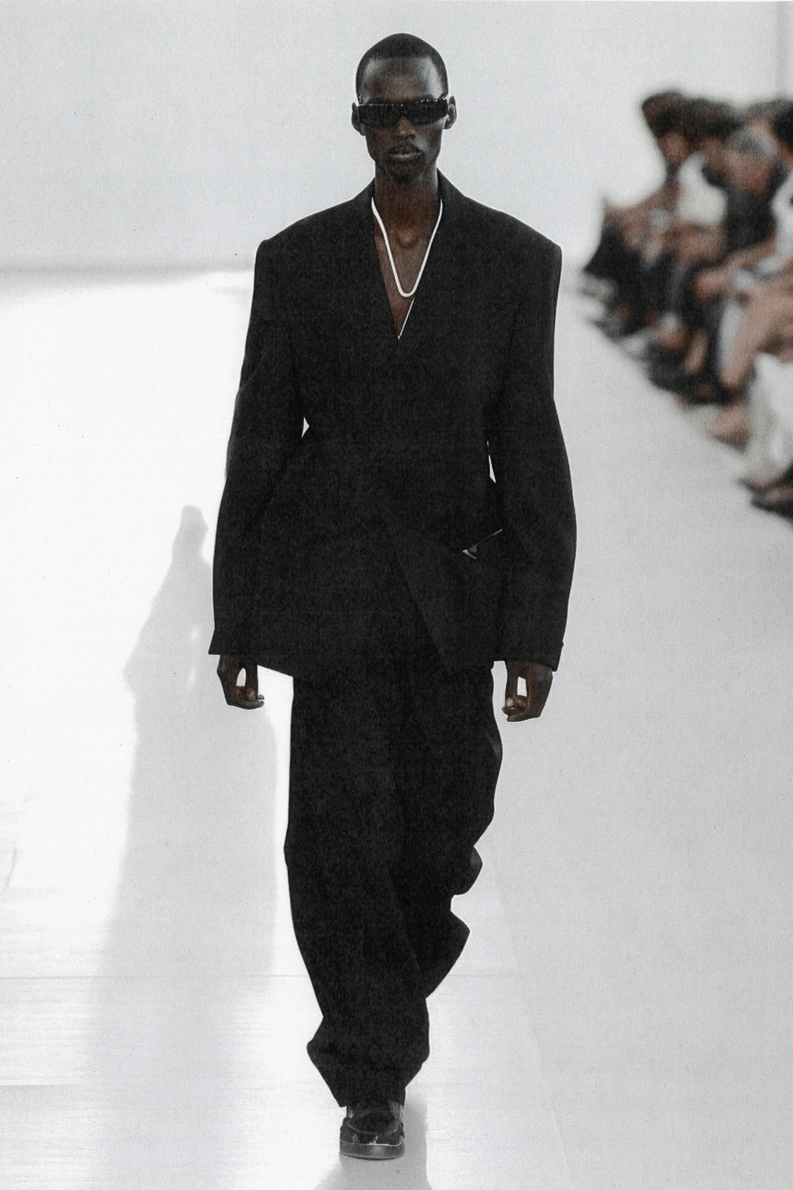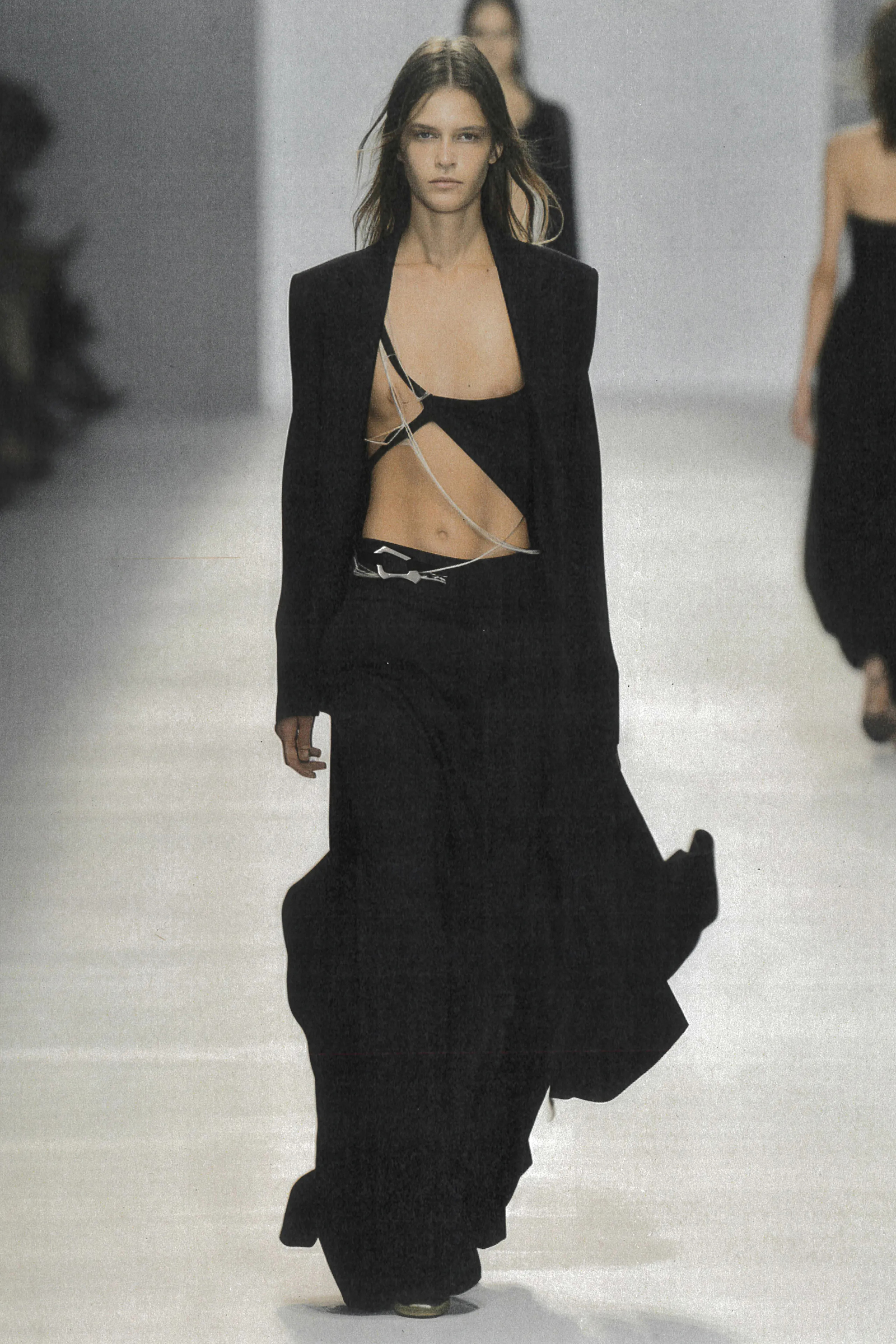 The brand’s aesthetic is hard, sleek, streamlined, features a lot of hardware, and is not especially emotional. Funnily enough spring’s man-meets-machine lineup had unexpected poetry that was linked to the increase of draping, which took both classical and deconstructed forms. “I think [this AI experiment] has taught me quite a lot about looking inwards,” noted Juul. It also stretched the team creatively on a material level. “It was so interesting to see all of the signatures that the algorithm spits back at you, like the metal details, the trims, those kind of things, but given that it has less boundaries than what we have in reality, it also came back with some very interesting things that if you looked into closely, can’t be created in reality: seams that there’d be no way to finish, or a part coming out of nowhere. That was a very interesting complexity to grasp; the machine doesn’t understand physics in the real world.”