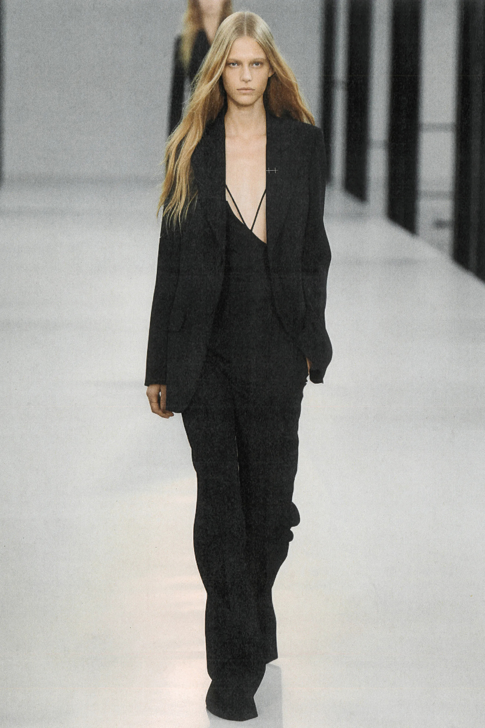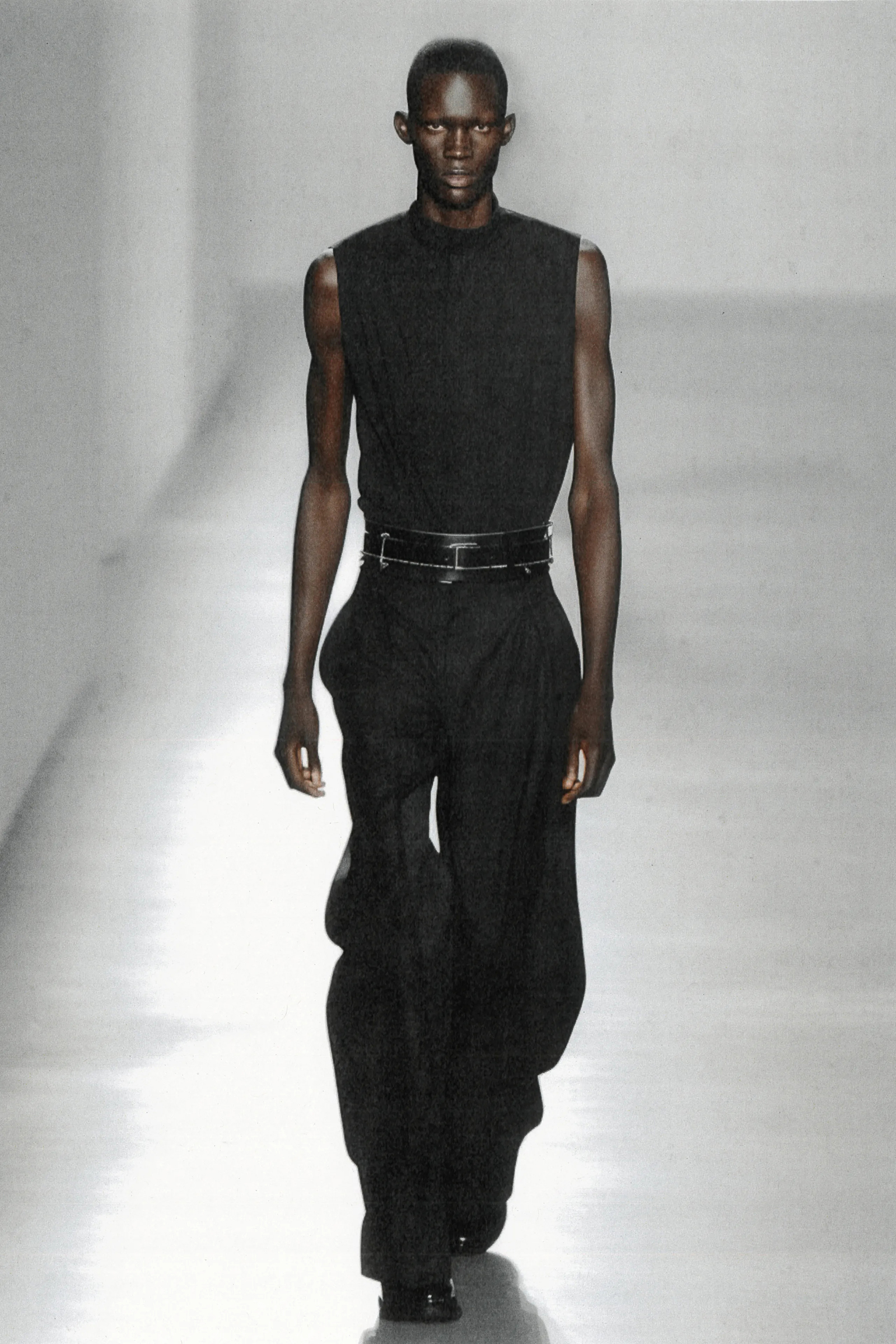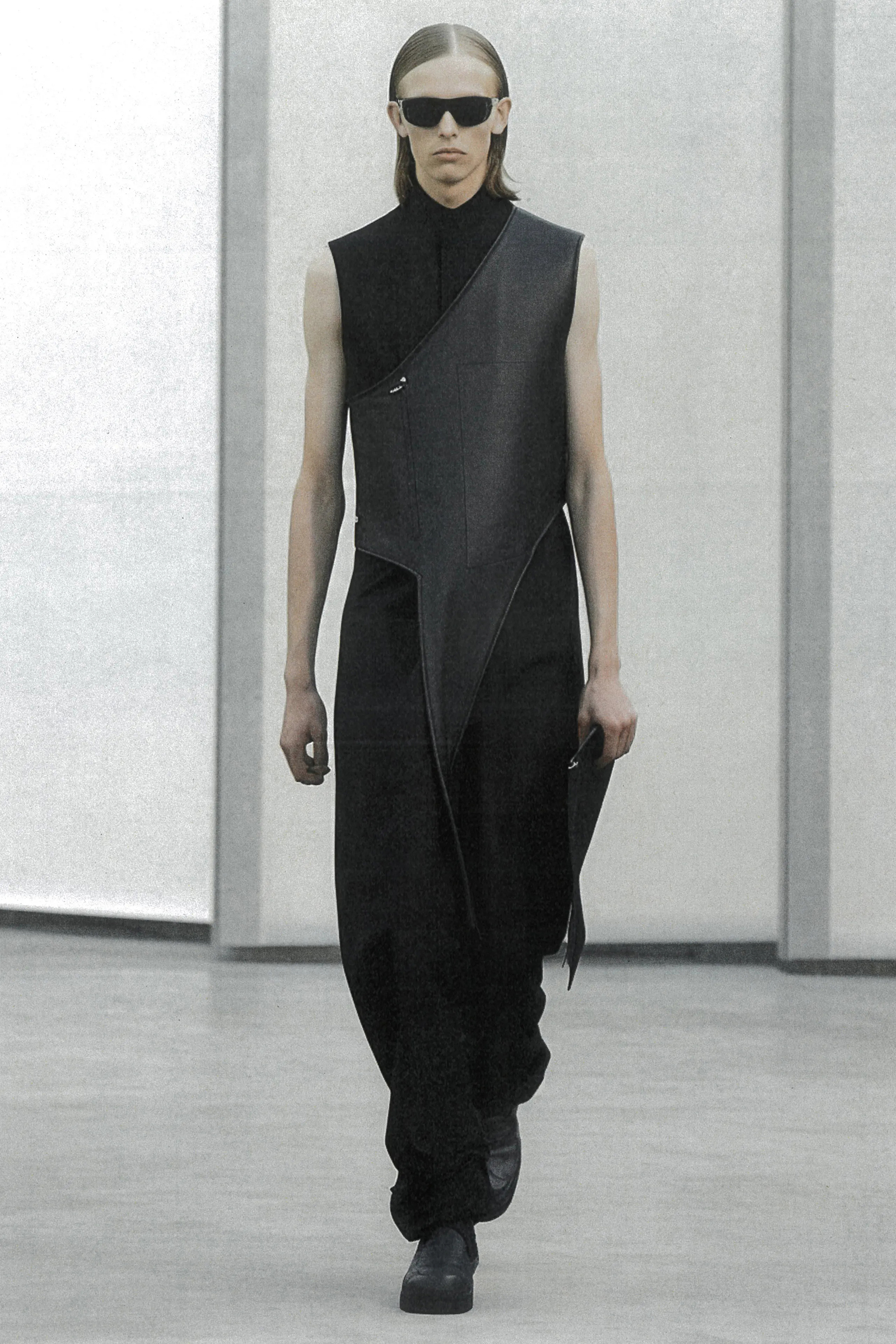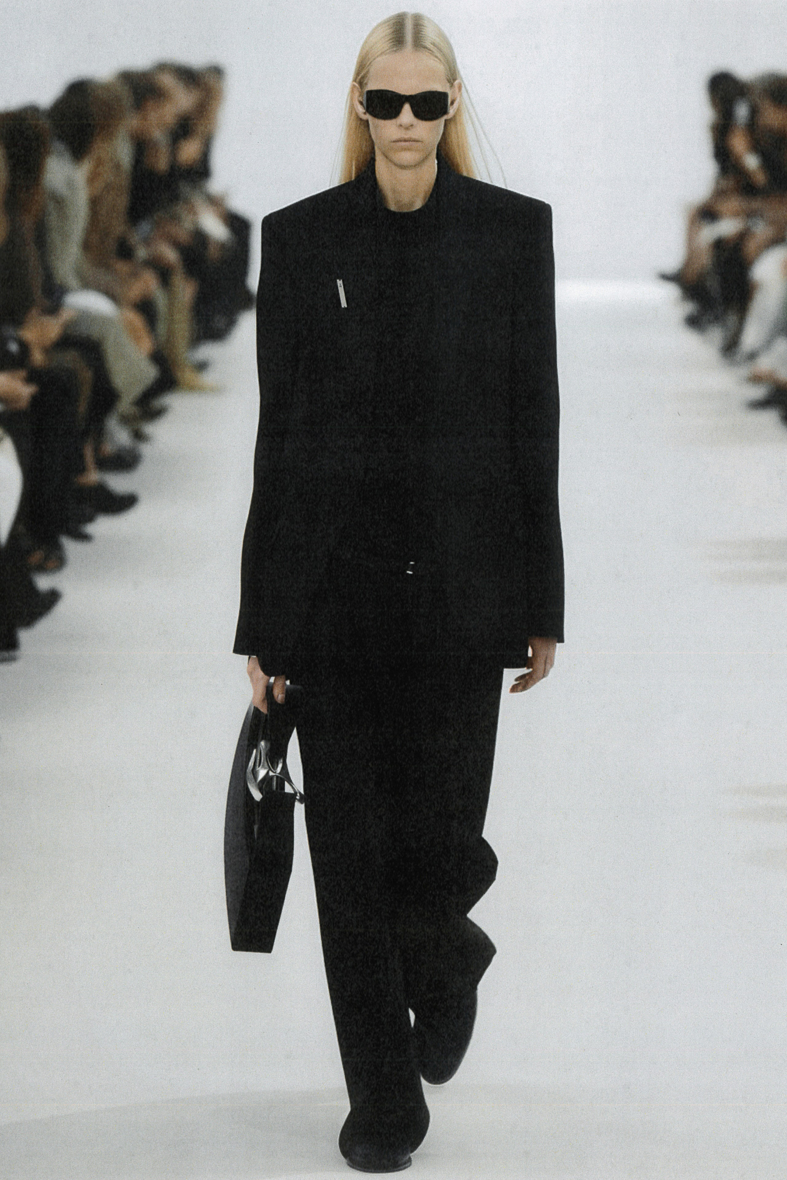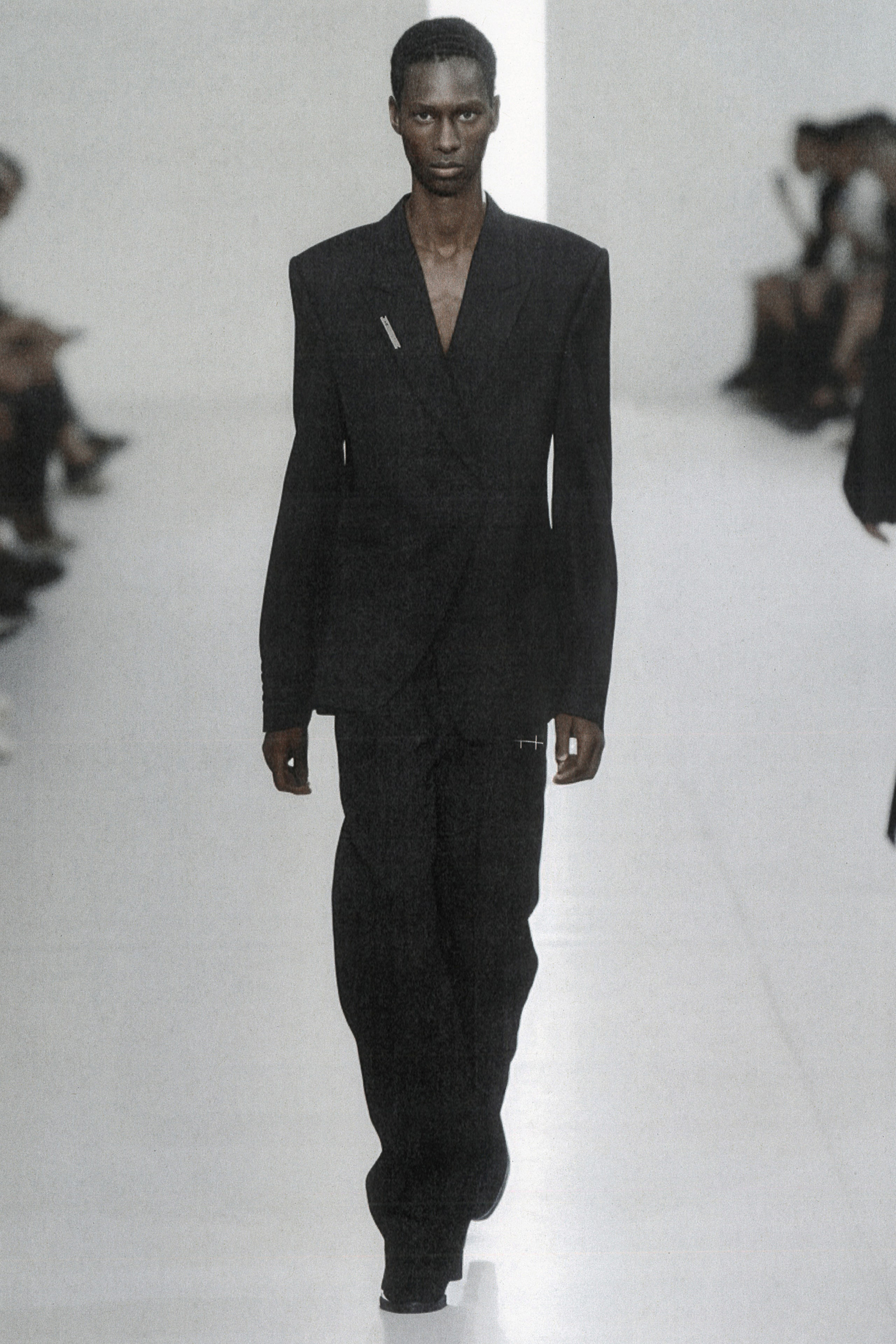 The brand’s aesthetic is hard, sleek, streamlined, features a lot of hardware, and is not especially emotional. Funnily enough spring’s man-meets-machine lineup had unexpected poetry that was linked to the increase of draping, which took both classical and deconstructed forms. “I think [this AI experiment] has taught me quite a lot about looking inwards,” noted Juul. It also stretched the team creatively on a material level. “It was so interesting to see all of the signatures that the algorithm spits back at you, like the metal details, the trims, those kind of things, but given that it has less boundaries than what we have in reality, it also came back with some very interesting things that if you looked into closely, can’t be created in reality: seams that there’d be no way to finish, or a part coming out of nowhere. That was a very interesting complexity to grasp; the machine doesn’t understand physics in the real world.”