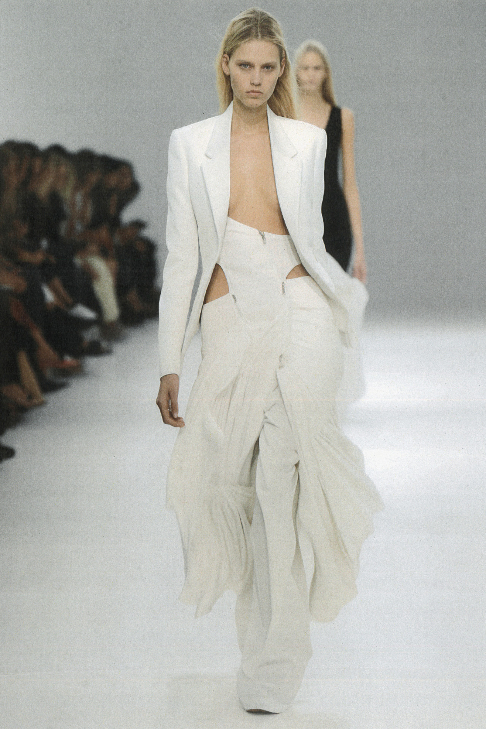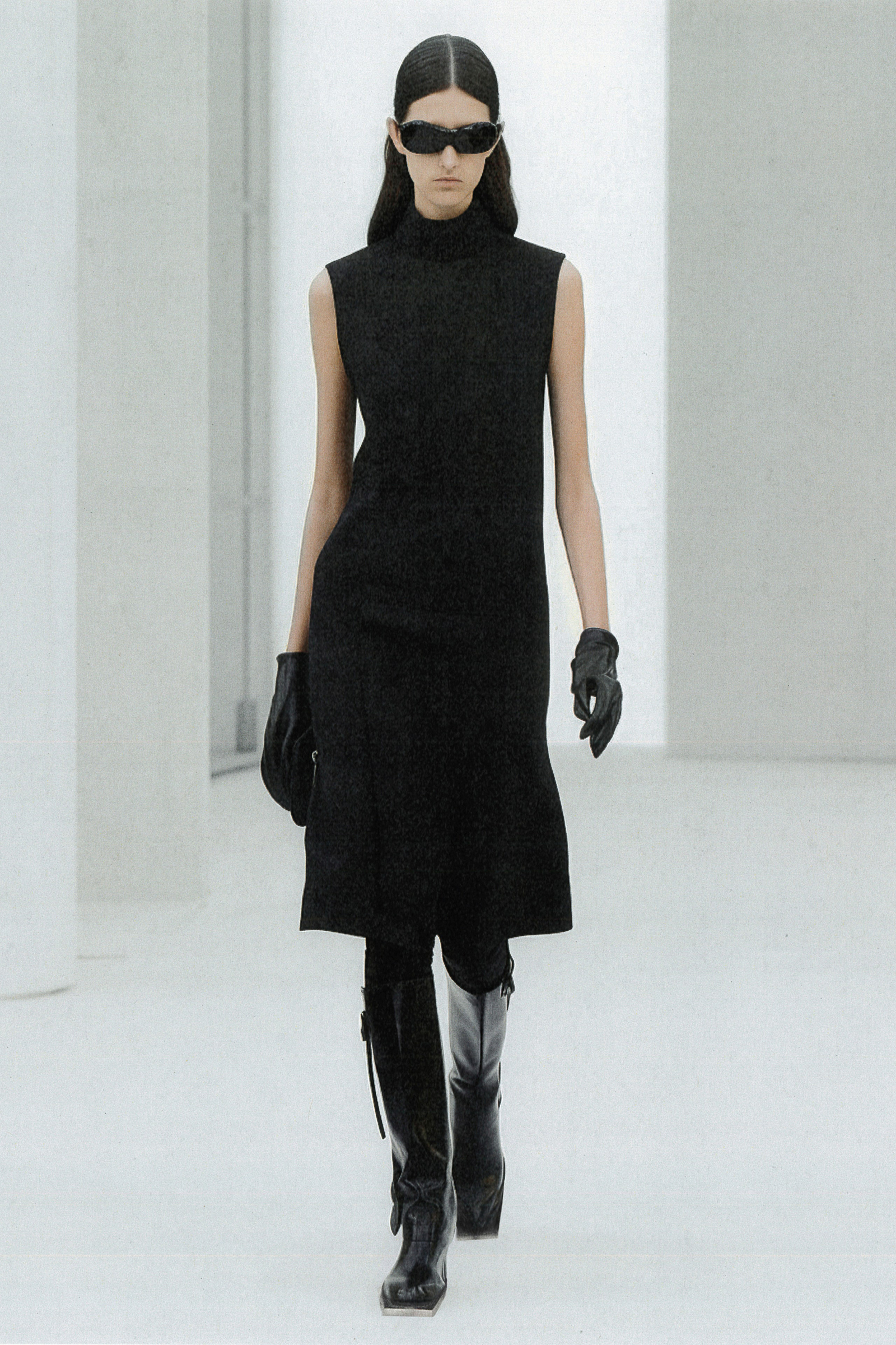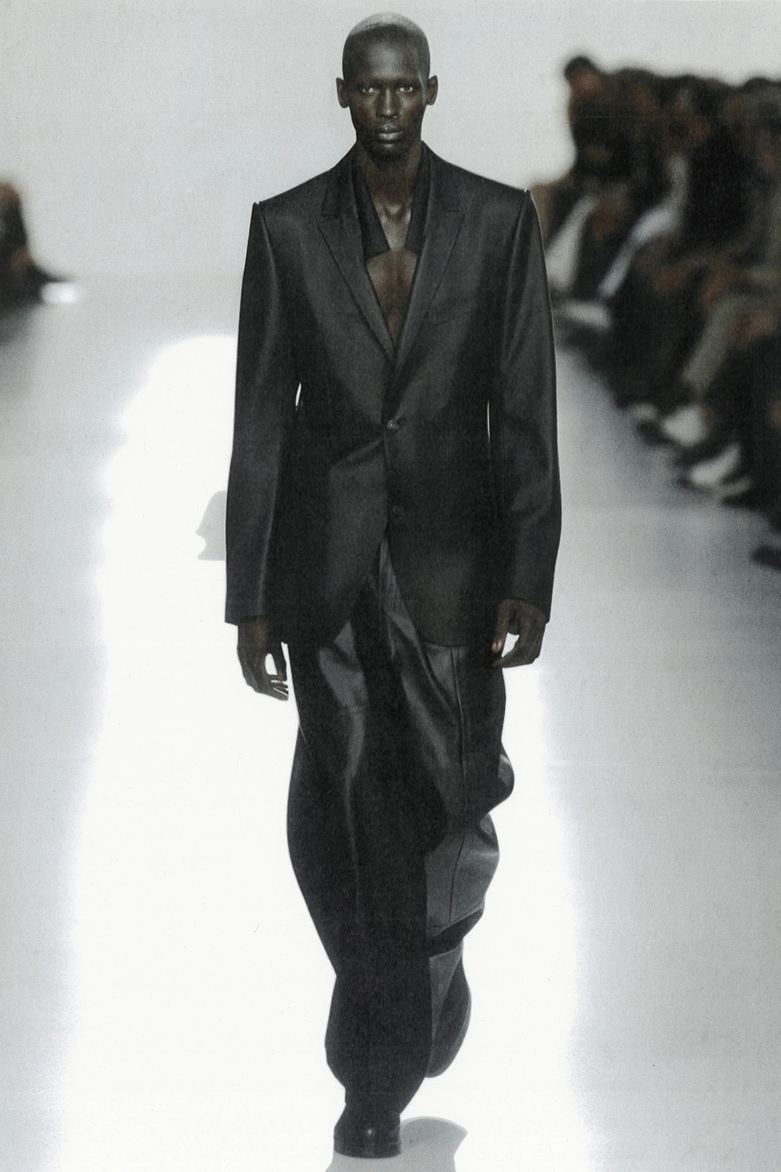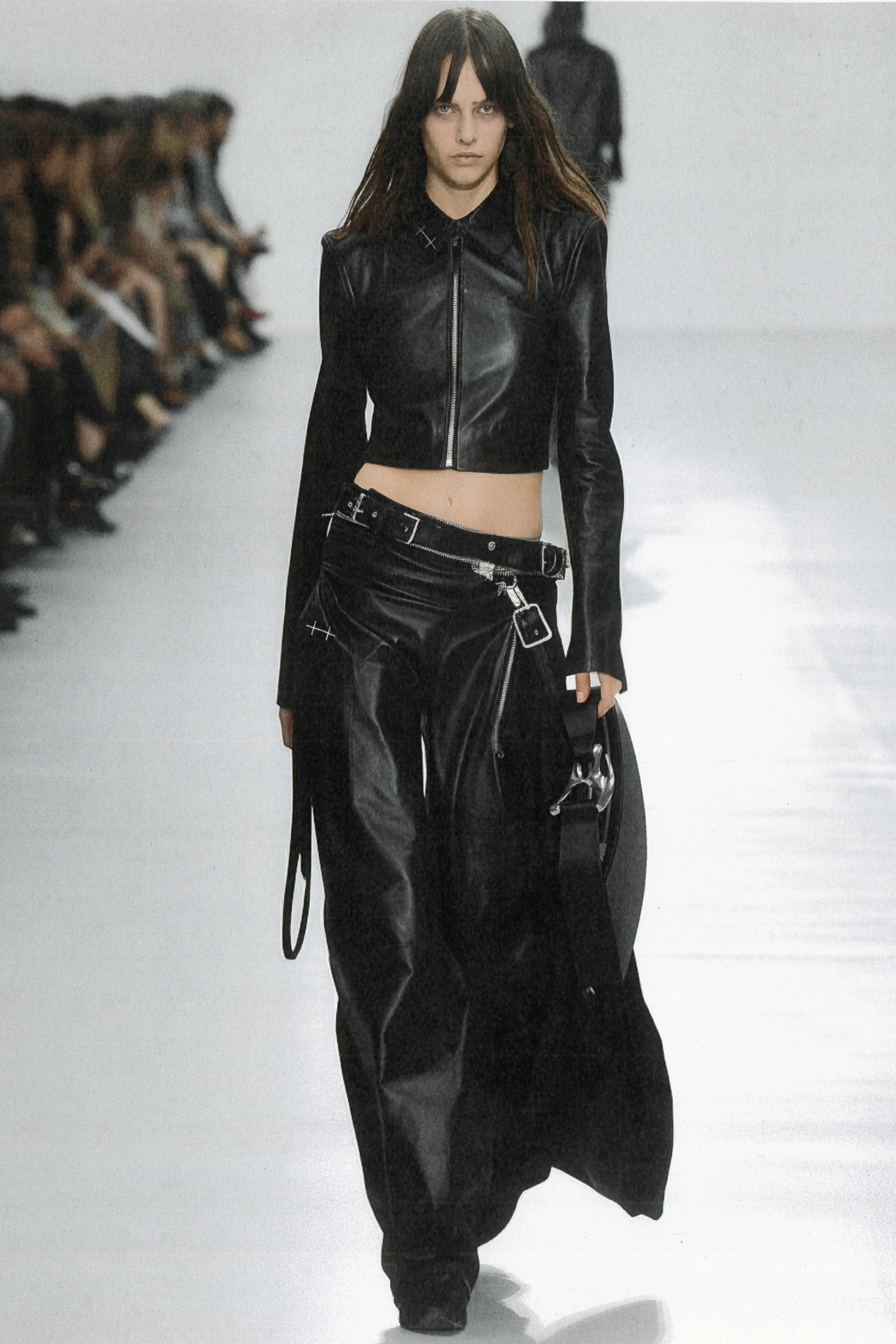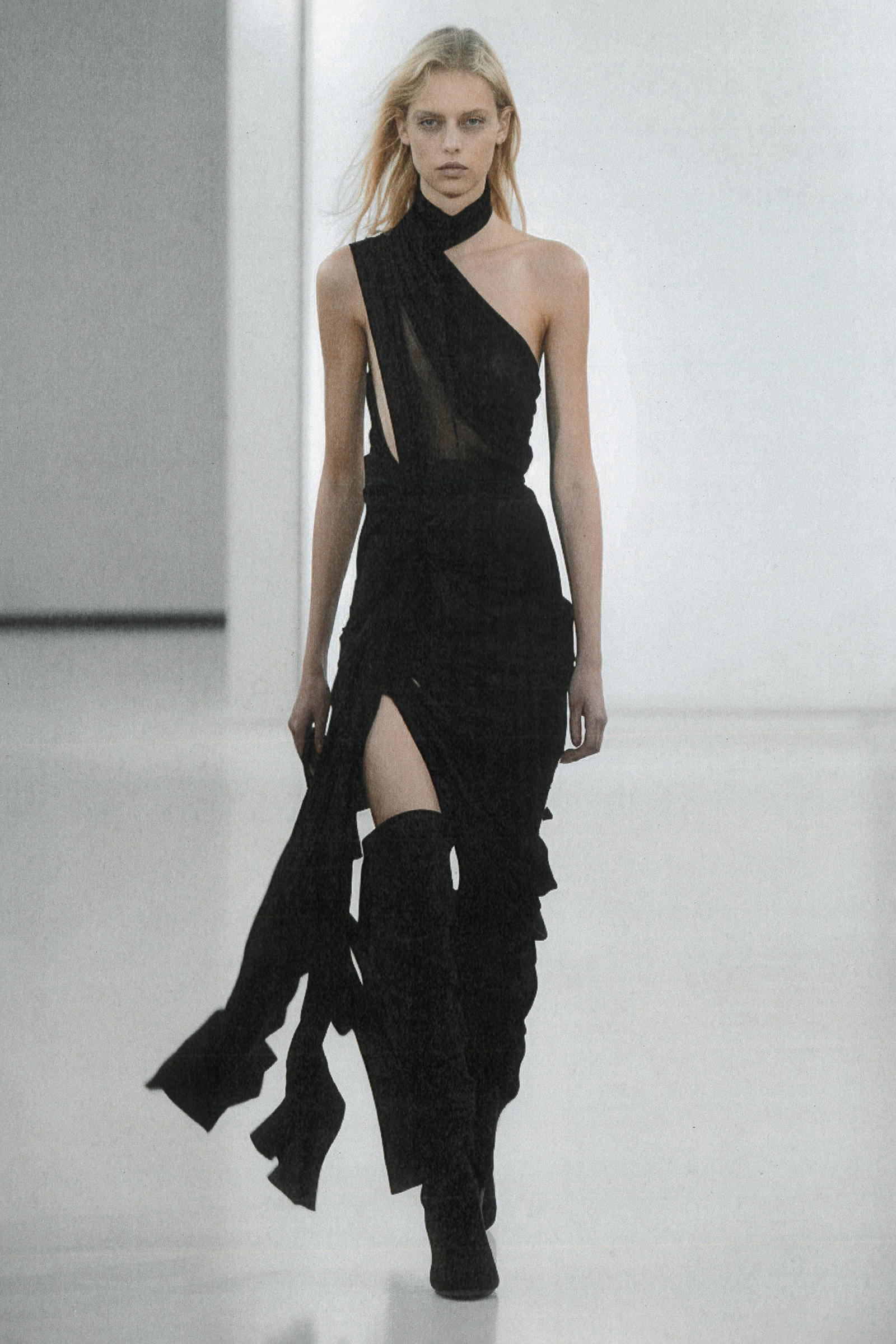 The brand’s aesthetic is hard, sleek, streamlined, features a lot of hardware, and is not especially emotional. Funnily enough spring’s man-meets-machine lineup had unexpected poetry that was linked to the increase of draping, which took both classical and deconstructed forms. “I think [this AI experiment] has taught me quite a lot about looking inwards,” noted Juul. It also stretched the team creatively on a material level. “It was so interesting to see all of the signatures that the algorithm spits back at you, like the metal details, the trims, those kind of things, but given that it has less boundaries than what we have in reality, it also came back with some very interesting things that if you looked into closely, can’t be created in reality: seams that there’d be no way to finish, or a part coming out of nowhere. That was a very interesting complexity to grasp; the machine doesn’t understand physics in the real world.”