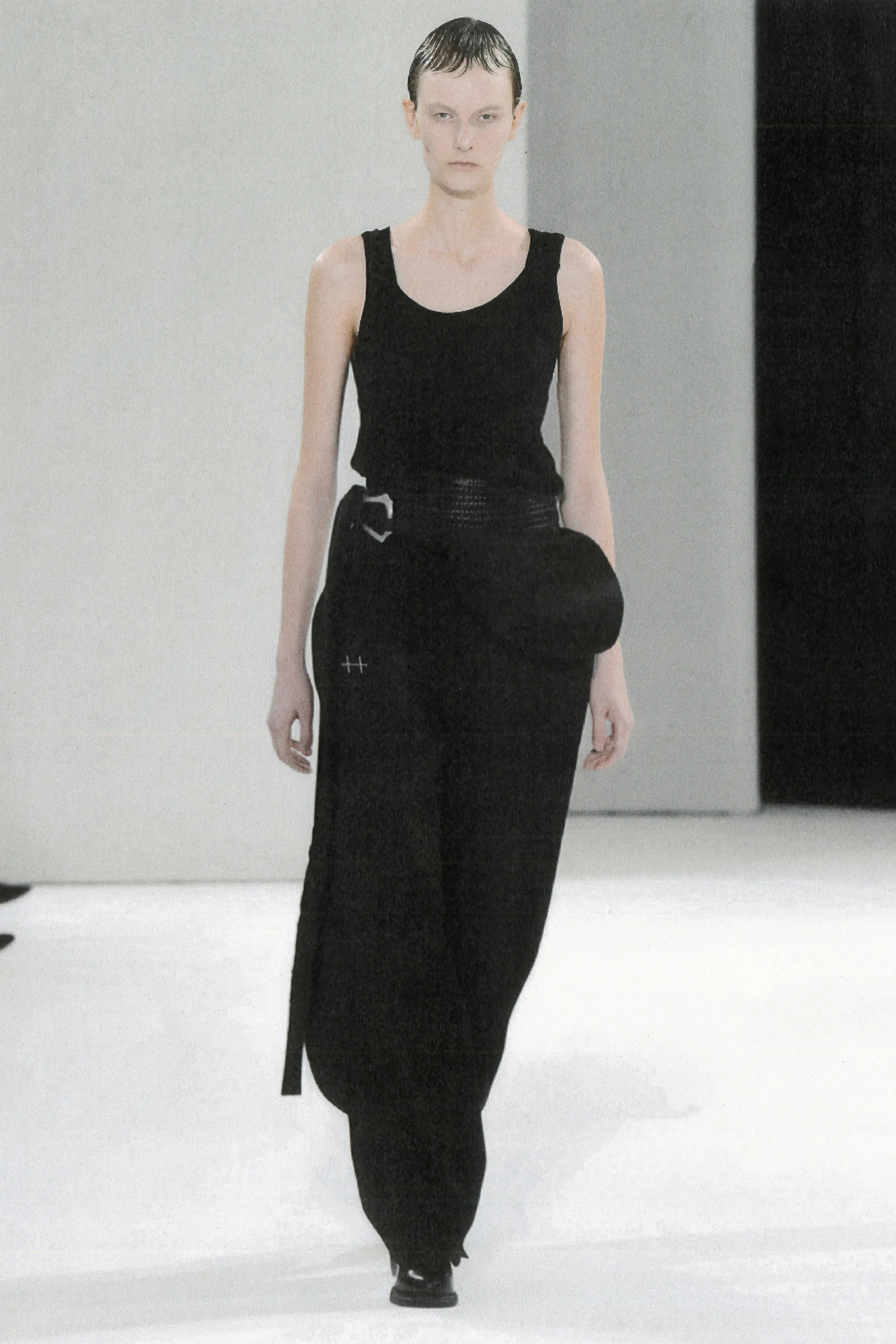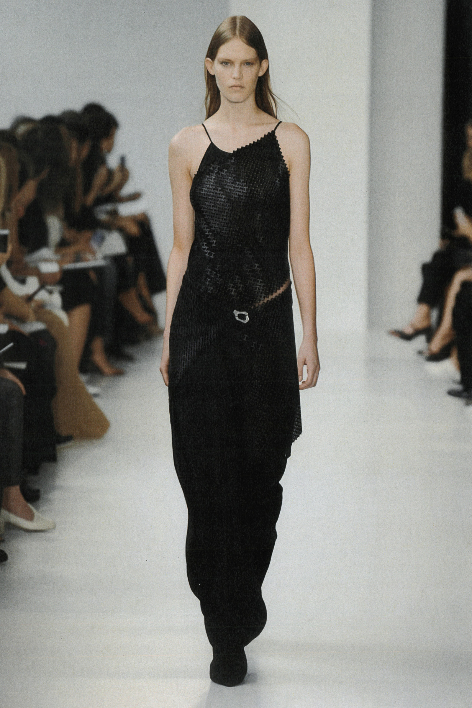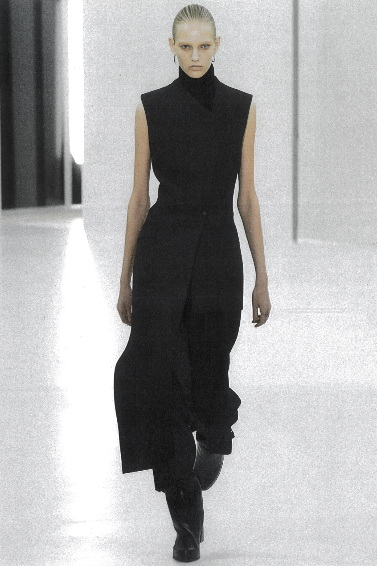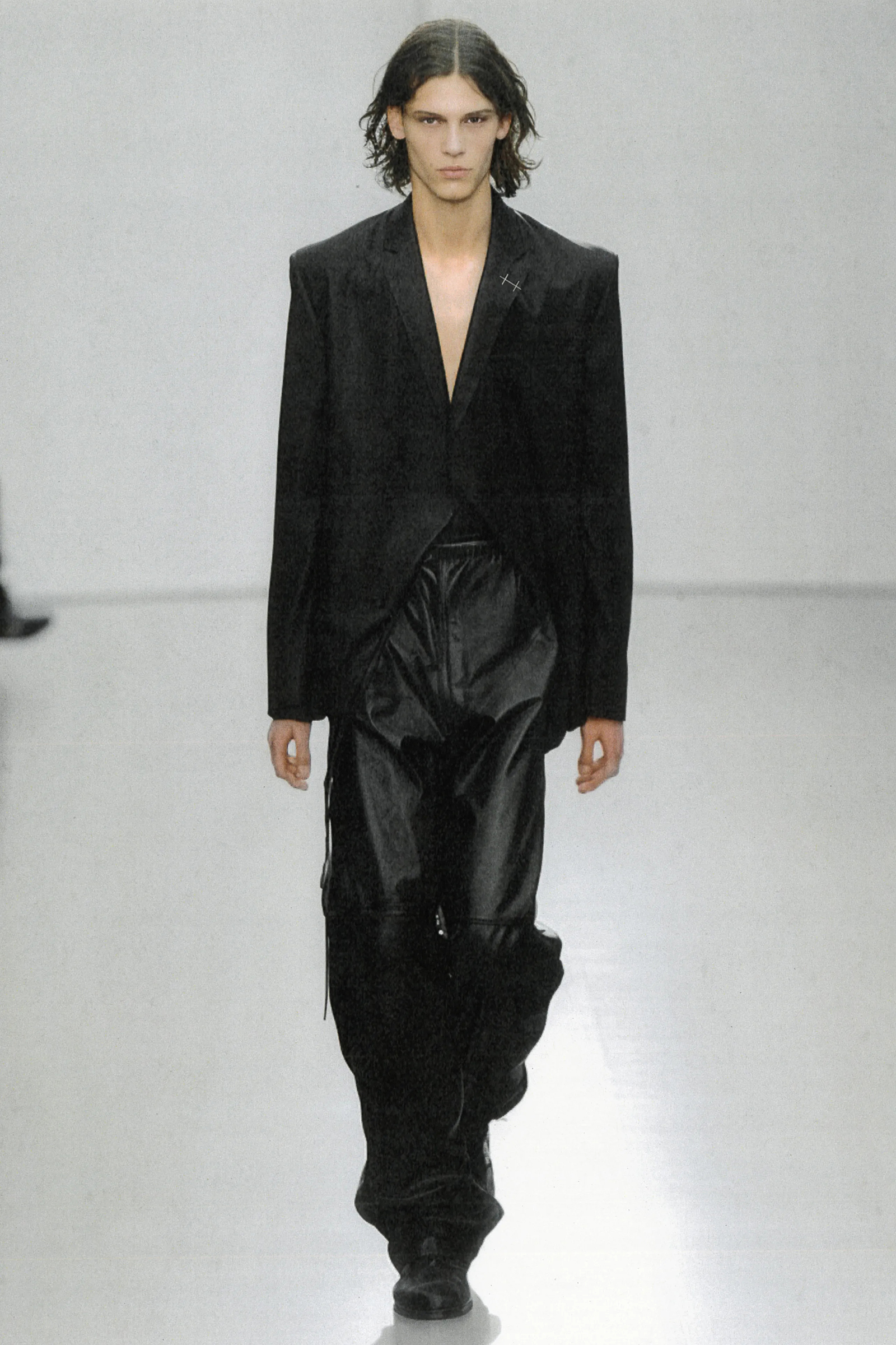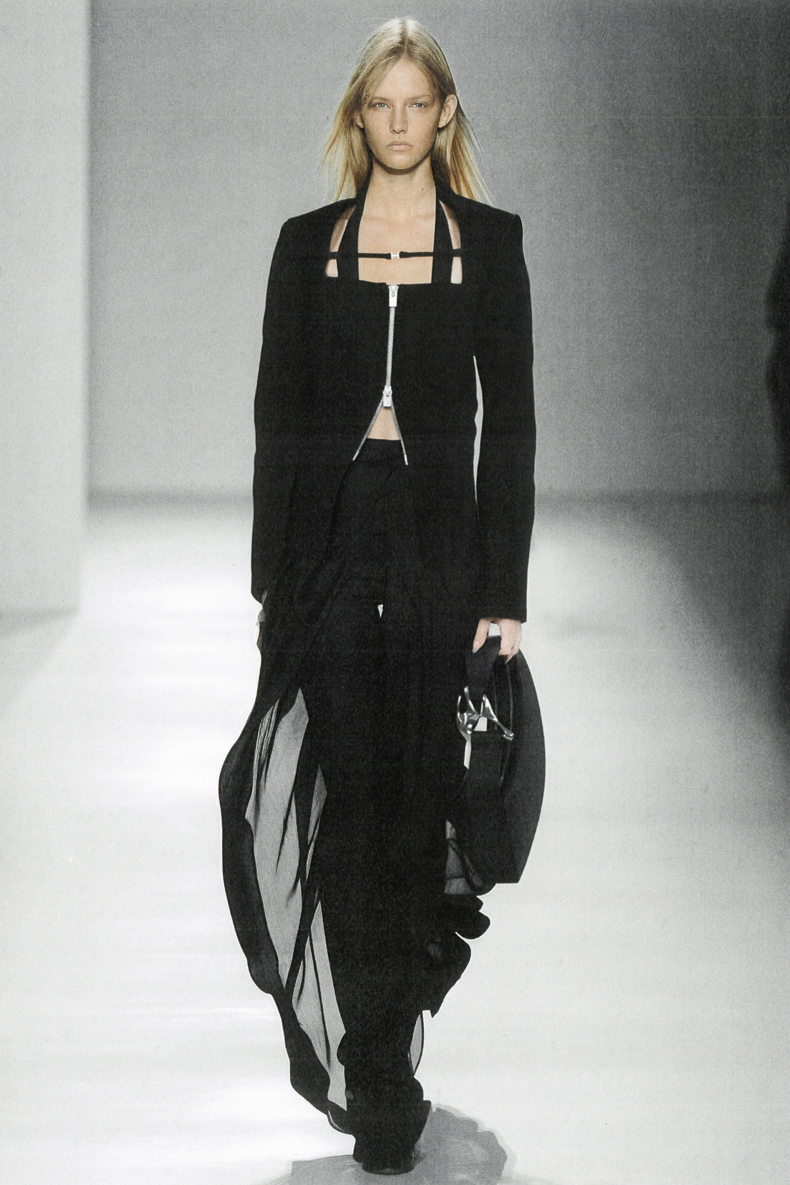 The brand’s aesthetic is hard, sleek, streamlined, features a lot of hardware, and is not especially emotional. Funnily enough spring’s man-meets-machine lineup had unexpected poetry that was linked to the increase of draping, which took both classical and deconstructed forms. “I think [this AI experiment] has taught me quite a lot about looking inwards,” noted Juul. It also stretched the team creatively on a material level. “It was so interesting to see all of the signatures that the algorithm spits back at you, like the metal details, the trims, those kind of things, but given that it has less boundaries than what we have in reality, it also came back with some very interesting things that if you looked into closely, can’t be created in reality: seams that there’d be no way to finish, or a part coming out of nowhere. That was a very interesting complexity to grasp; the machine doesn’t understand physics in the real world.”