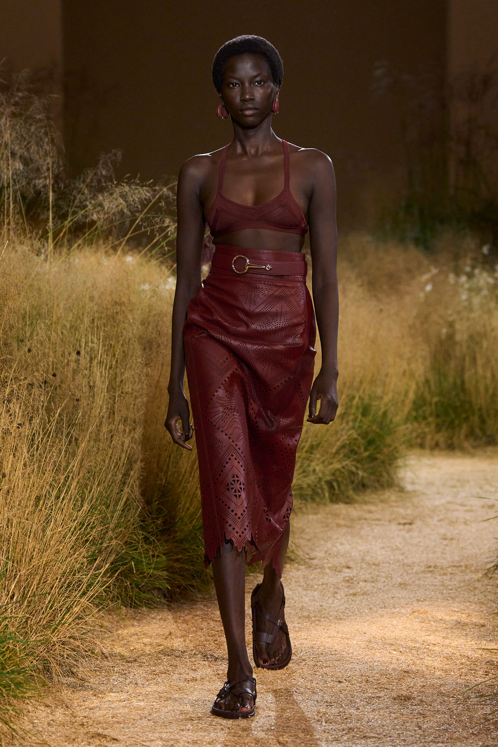 She called the knitwear “modular,” meaning sectioned-out asymmetric cropped tops, bras and pencil skirts. Even then, the leather was in play; some pieces were tooled from finest vertical strips of lambskin in an infinitesimally minute Hermès-specific technique.