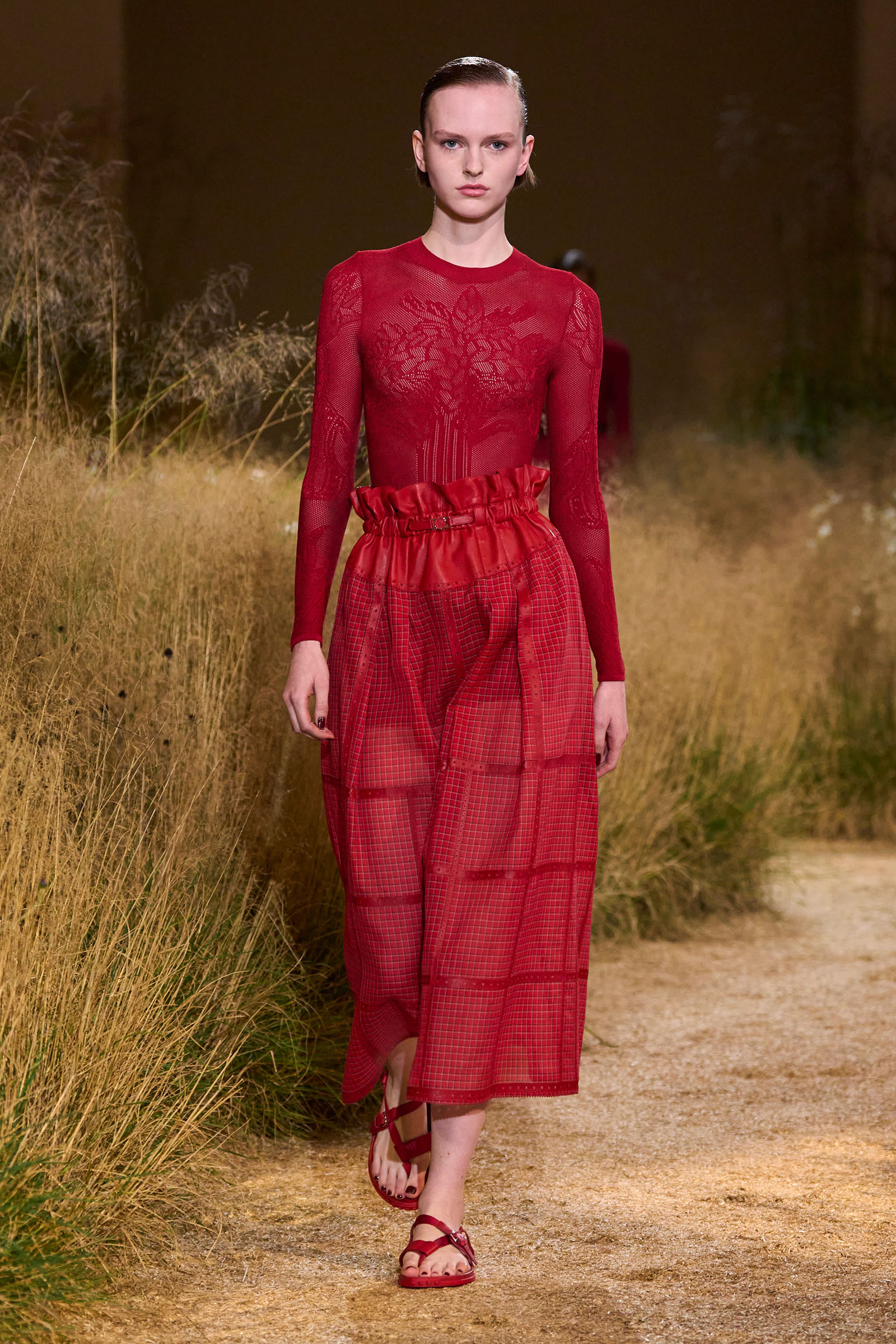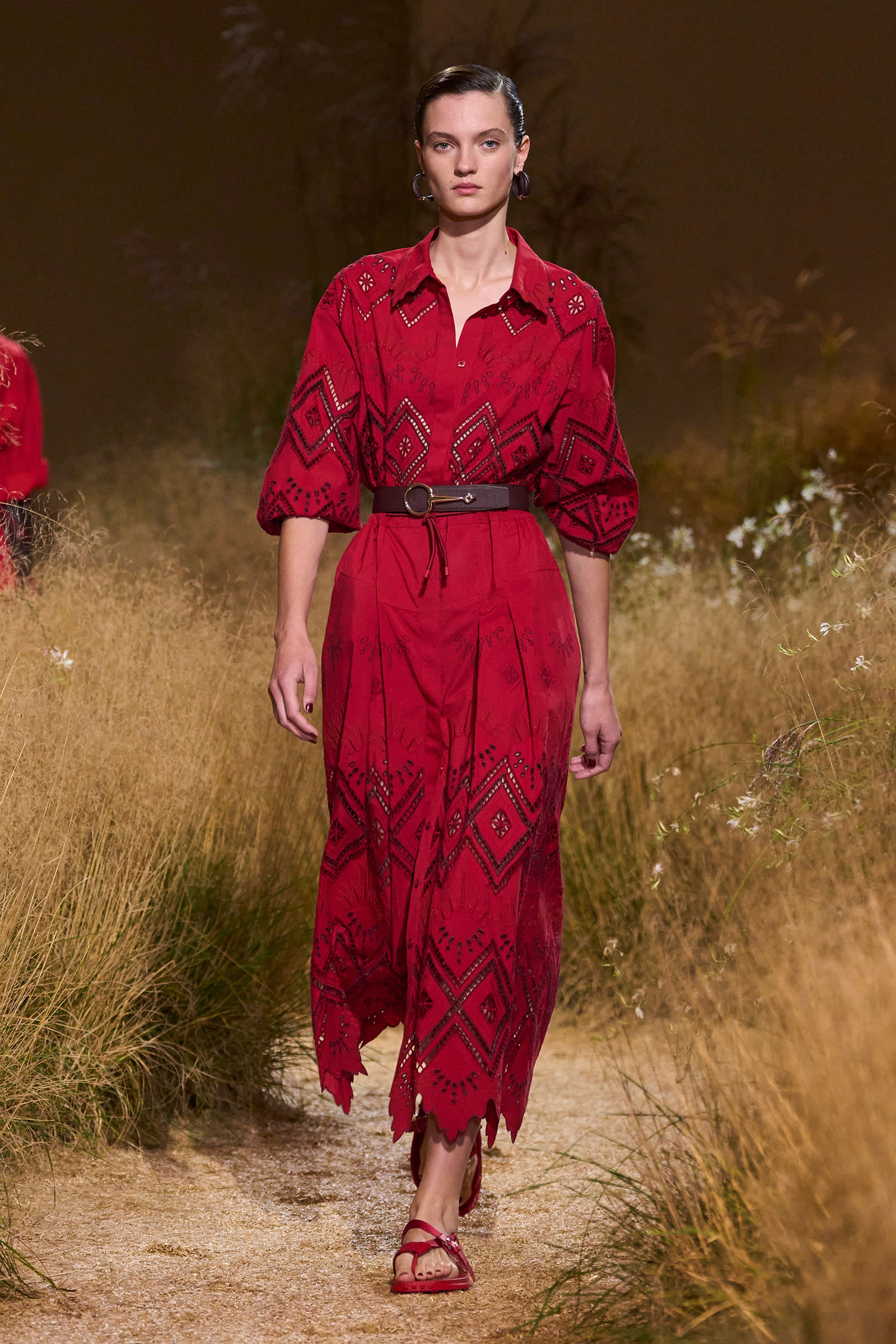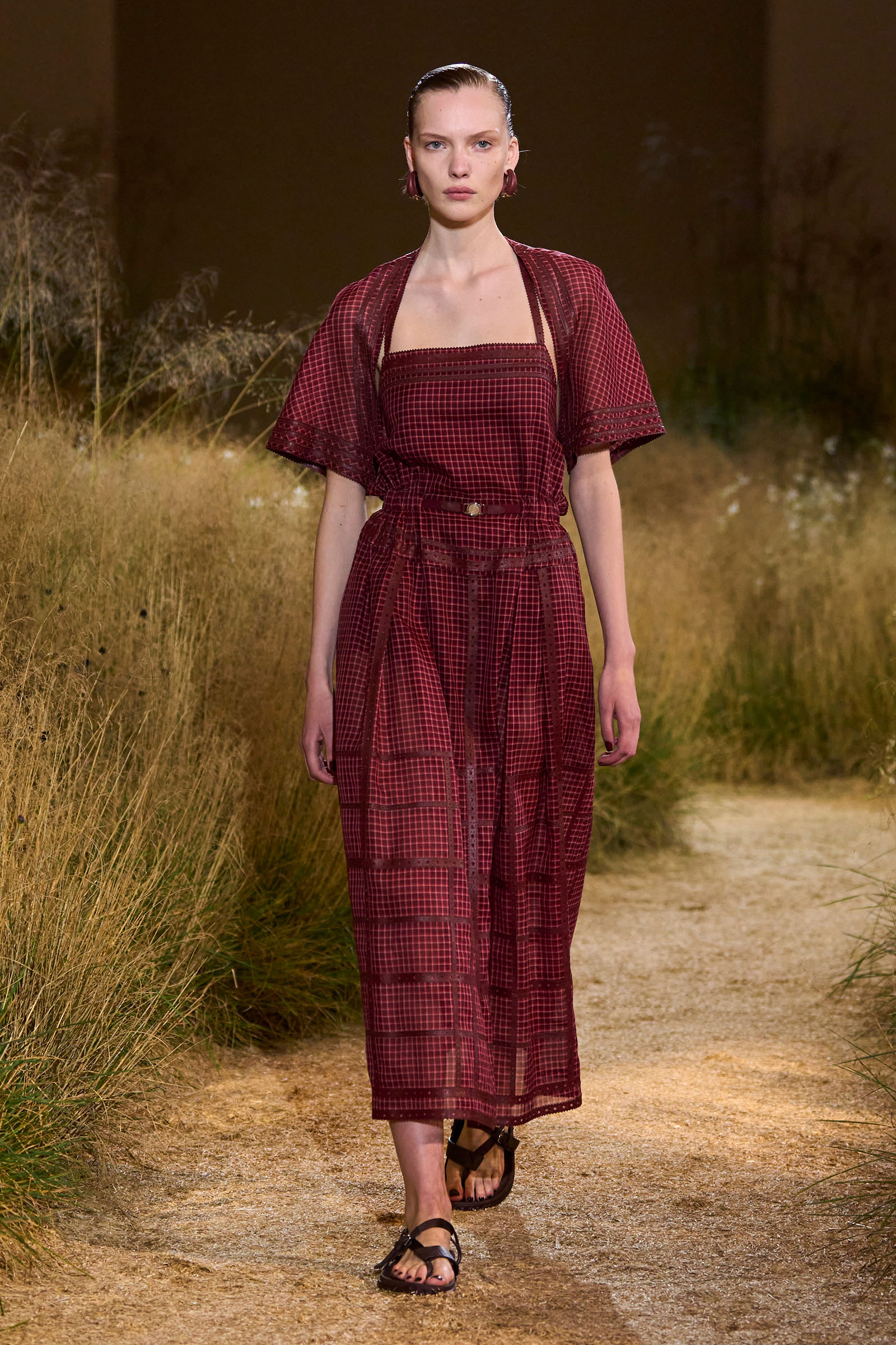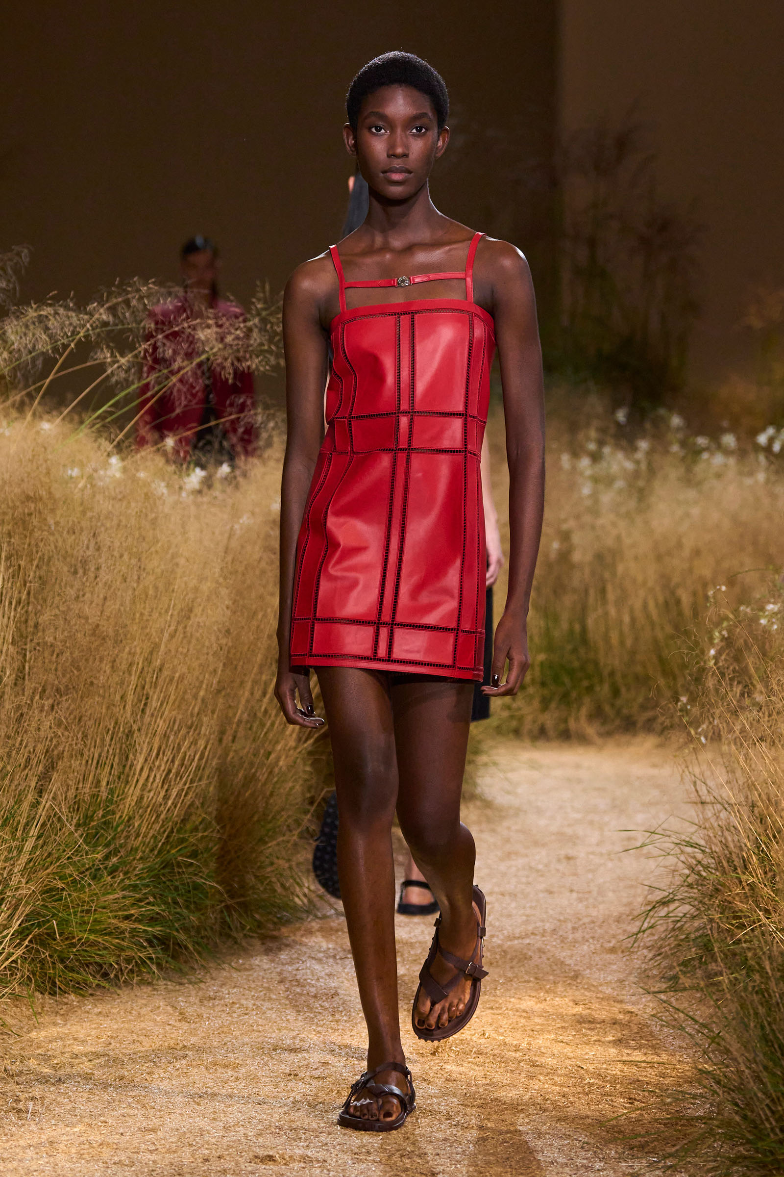 It was a summery scene, set with banks of reeds and flowers as among sand dunes. Vanhee said “I was talking about friendship between women and the friendship of clothes.” Relaxed but precise it was, and as always, subtly coded with Hermès references. The tailored coats had a soft mobility about them done, she pointed out,“with fluid, saddle-shaped pattern cutting.” Even the tiny zig-zag lace-like details on cotton summery dresses turned out to be leather, stamped out in the same pattern as Hermès brogues.