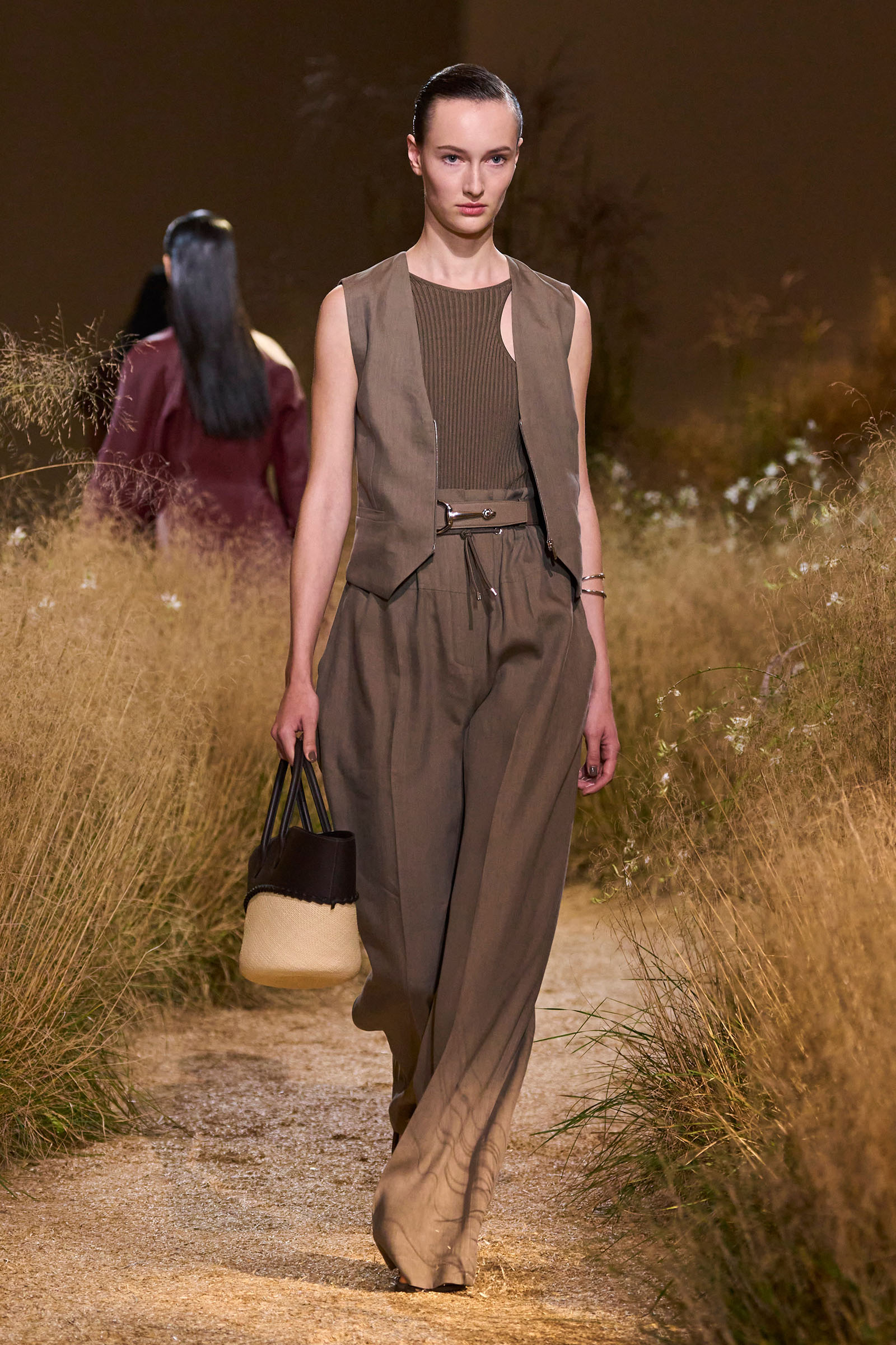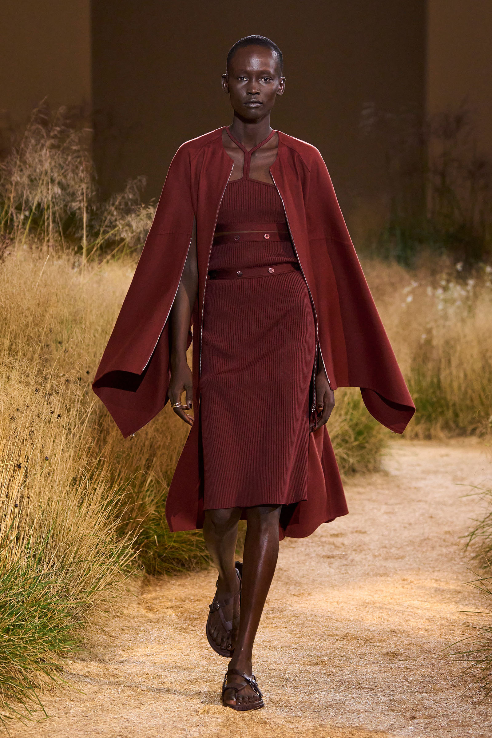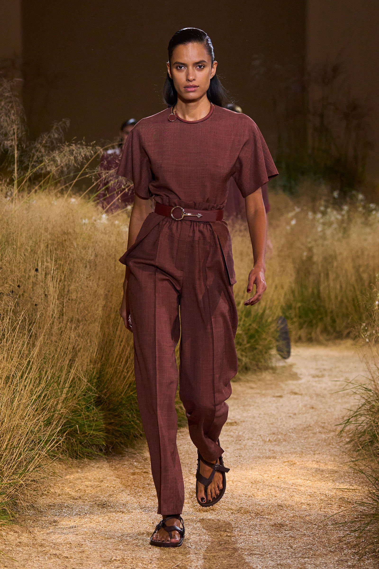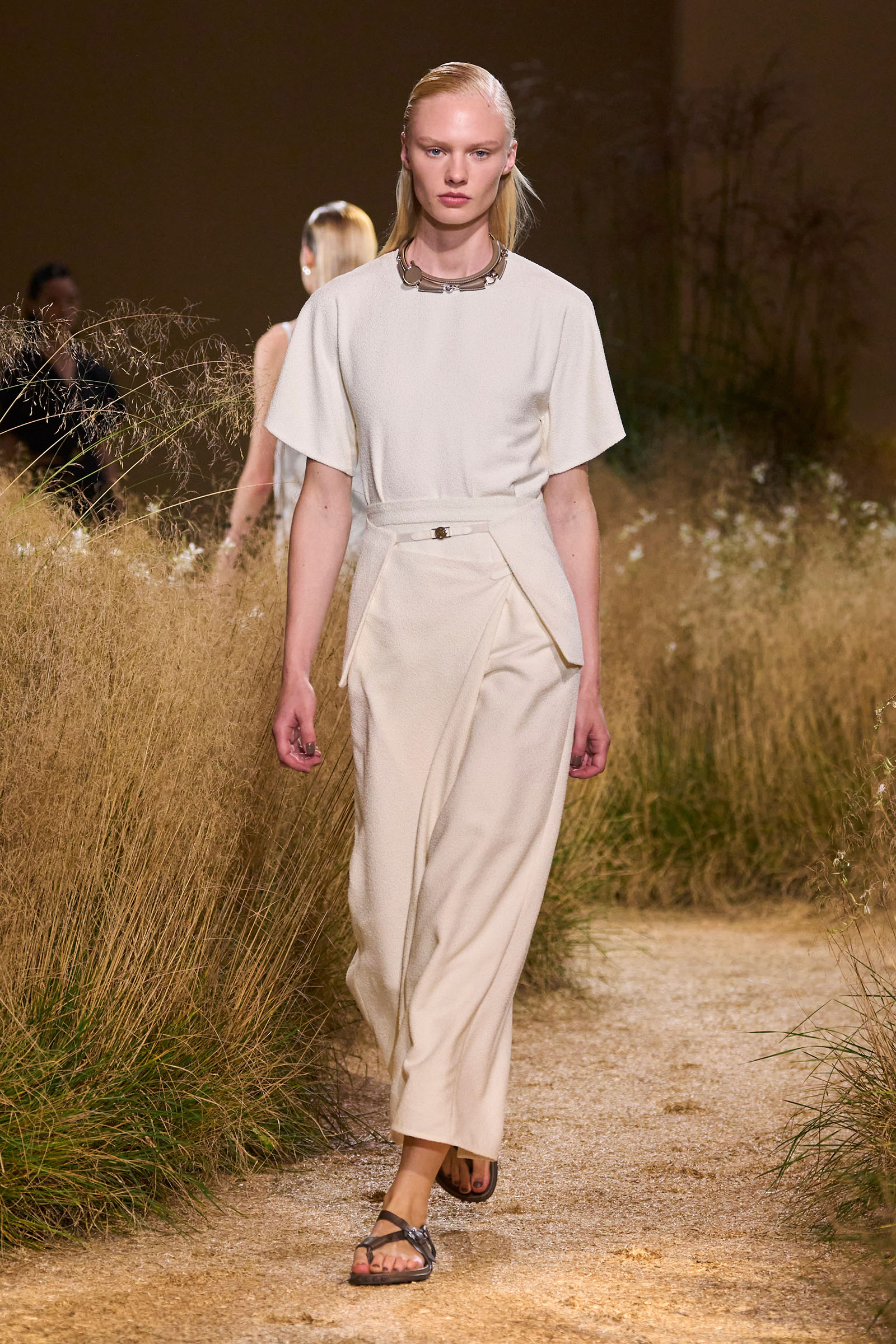 The point of all this—the show-off part secreted among all this quiet super-luxury—is to give the impression of a wardrobe for an easy lifestyle. That goes right down to the Greek-style sandals “in ribbon and woven calfskin” shown in every color, with nail polish to match. Even the soles, it turned out, had Hermès treads “adorned with Medor studs.” No detail is overlooked when it comes to ensuring the footprint of this house is consistently recognizable.