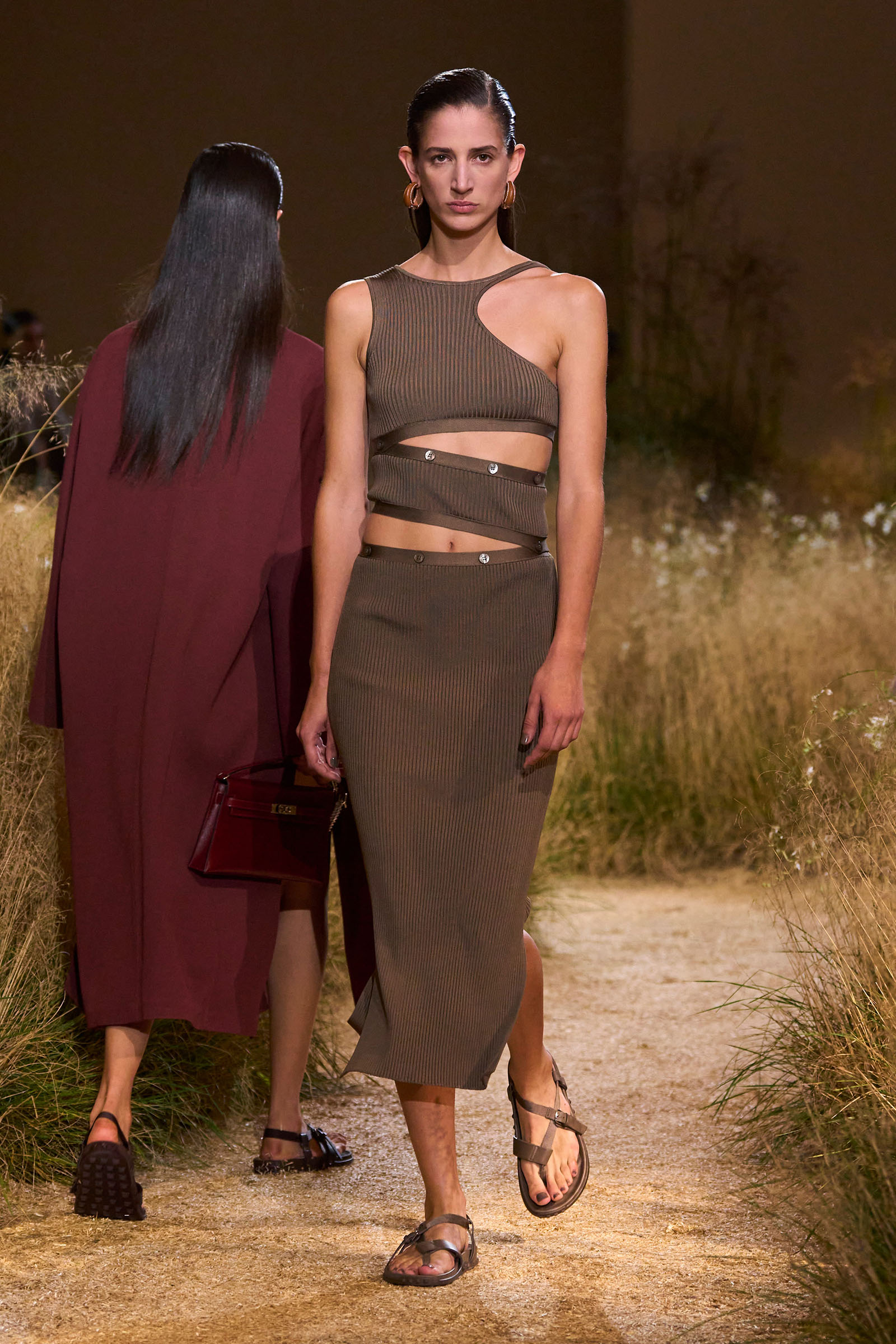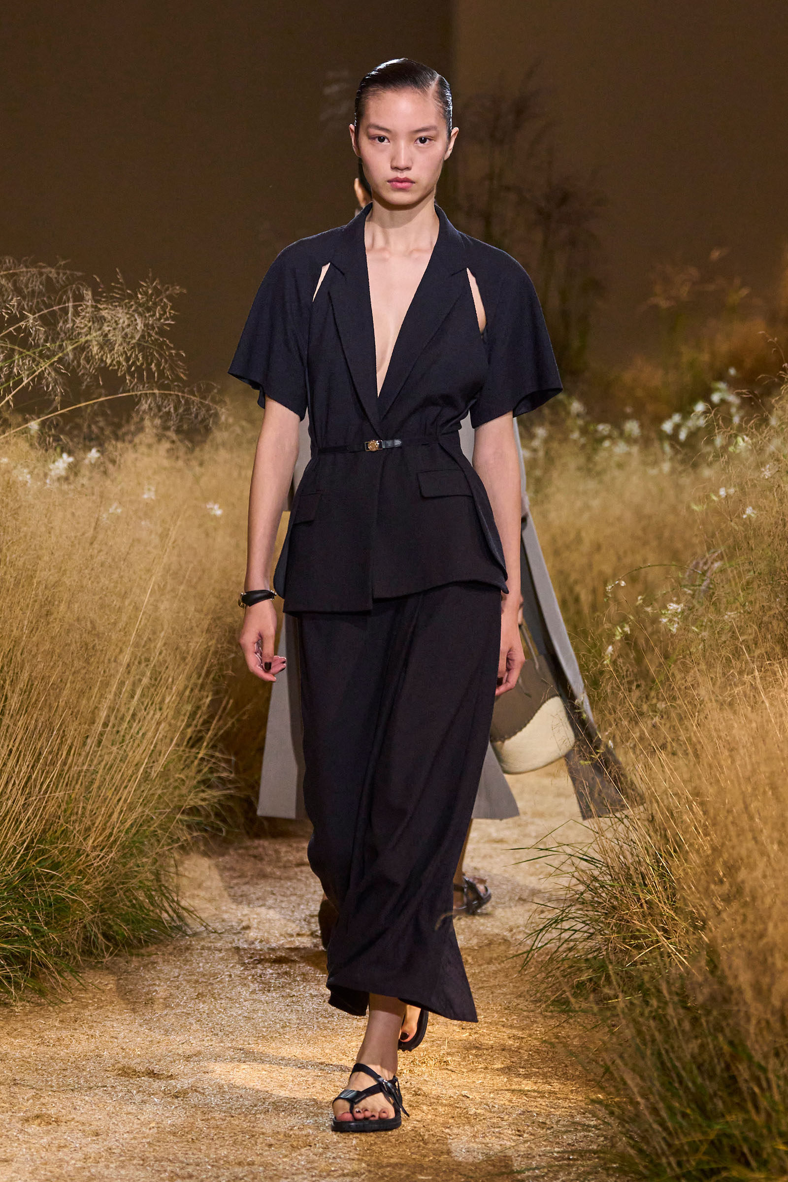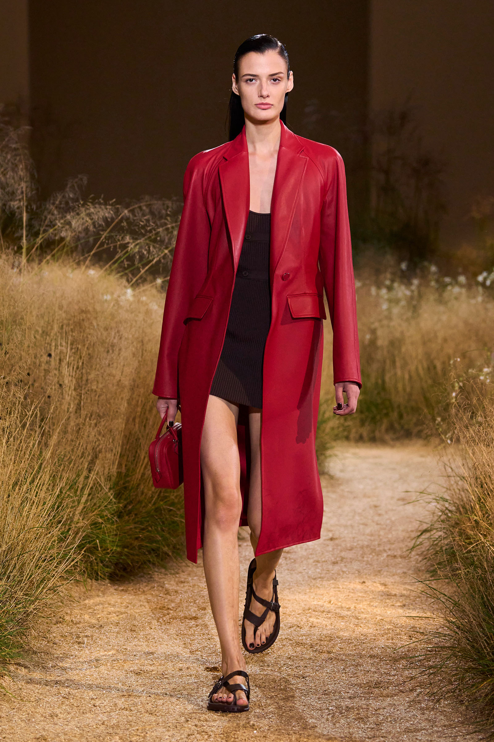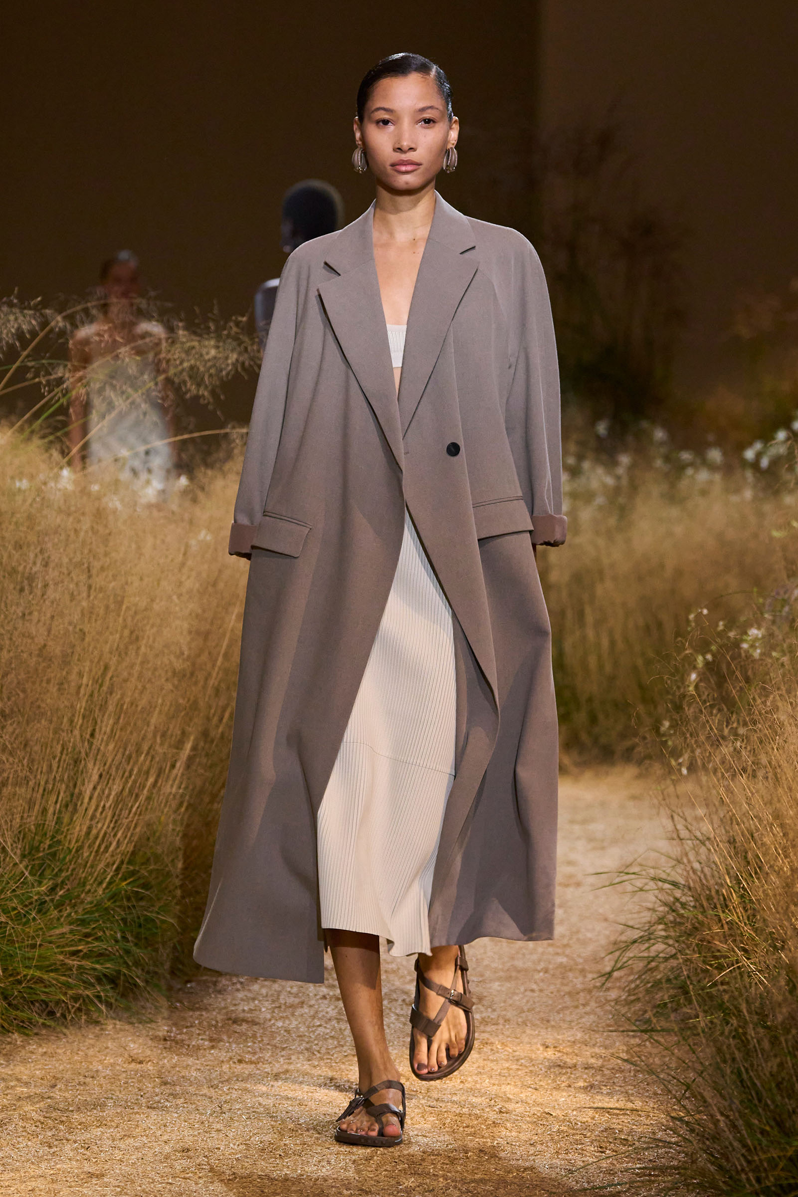 The point of all this—the show-off part secreted among all this quiet super-luxury—is to give the impression of a wardrobe for an easy lifestyle. That goes right down to the Greek-style sandals “in ribbon and woven calfskin” shown in every color, with nail polish to match. Even the soles, it turned out, had Hermès treads “adorned with Medor studs.” No detail is overlooked when it comes to ensuring the footprint of this house is consistently recognizable.