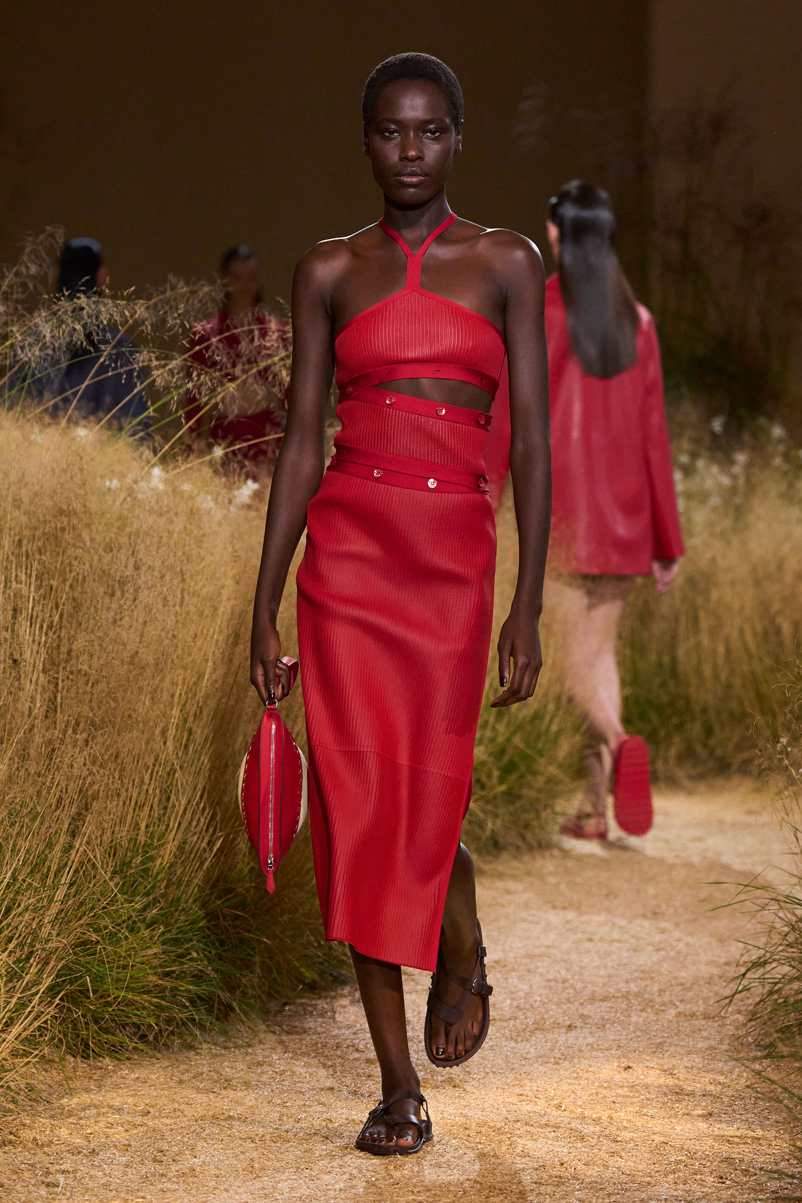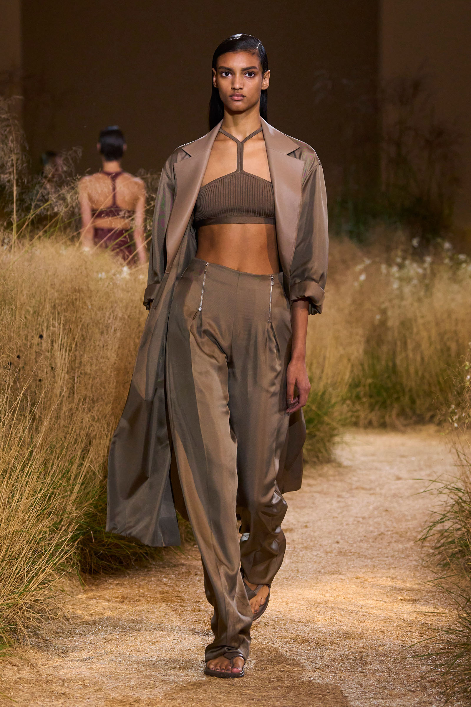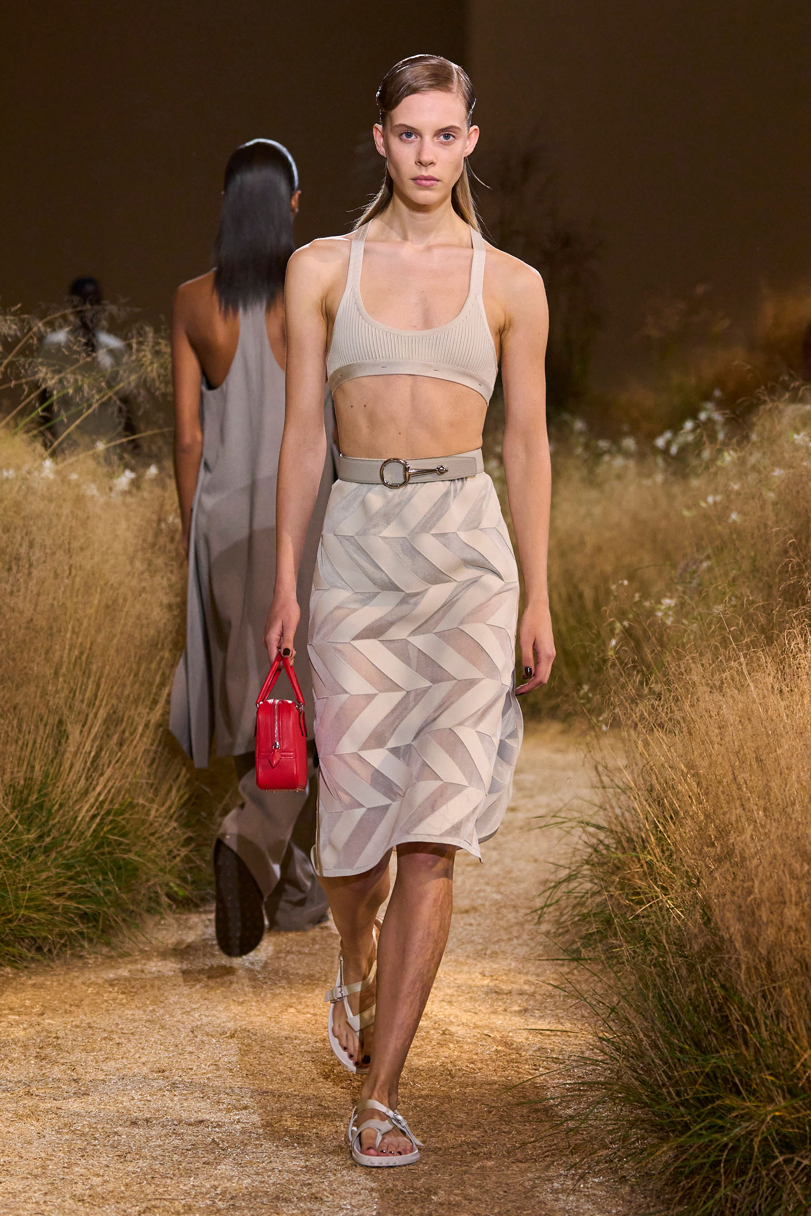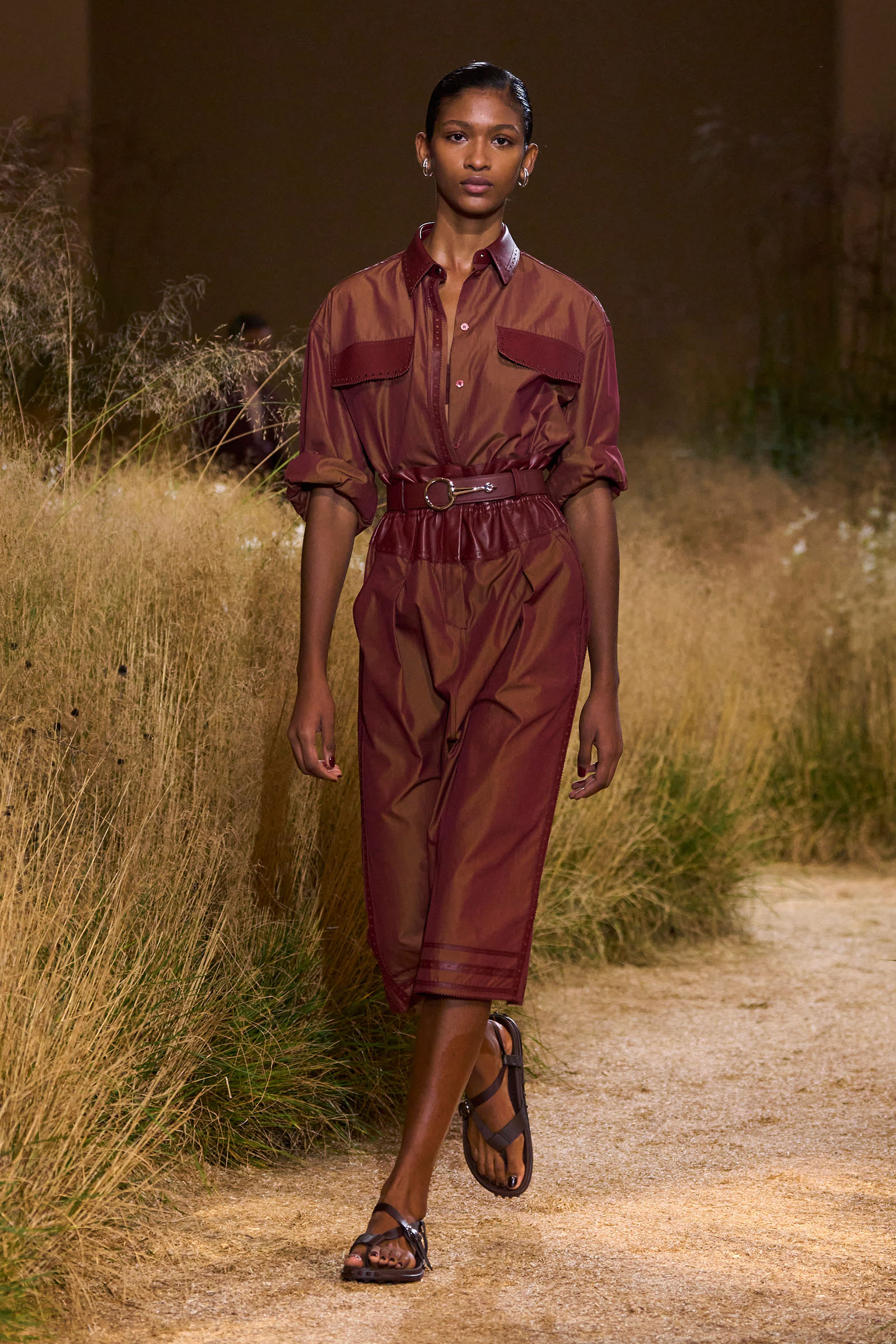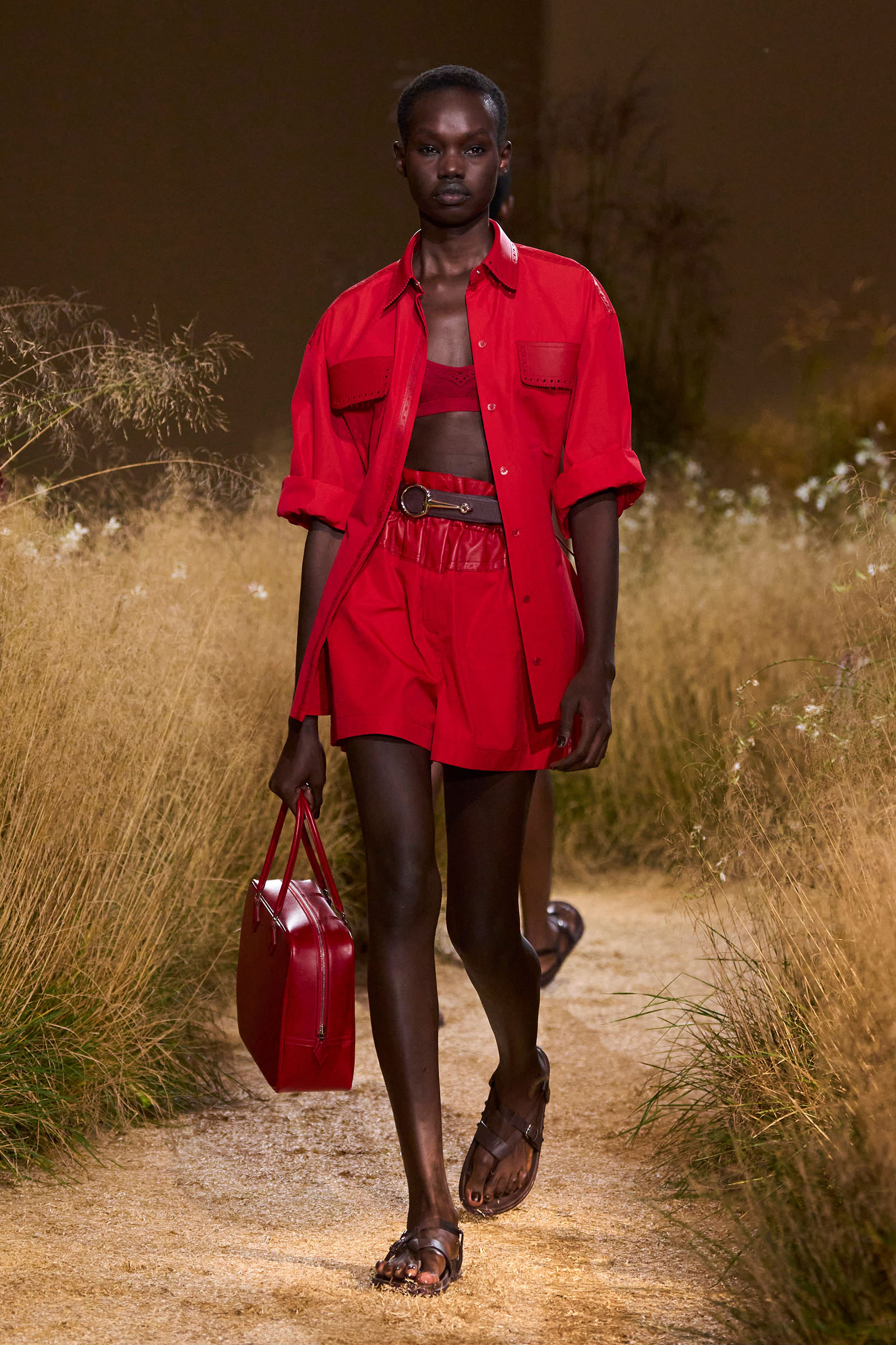 The point of all this—the show-off part secreted among all this quiet super-luxury—is to give the impression of a wardrobe for an easy lifestyle. That goes right down to the Greek-style sandals “in ribbon and woven calfskin” shown in every color, with nail polish to match. Even the soles, it turned out, had Hermès treads “adorned with Medor studs.” No detail is overlooked when it comes to ensuring the footprint of this house is consistently recognizable.
