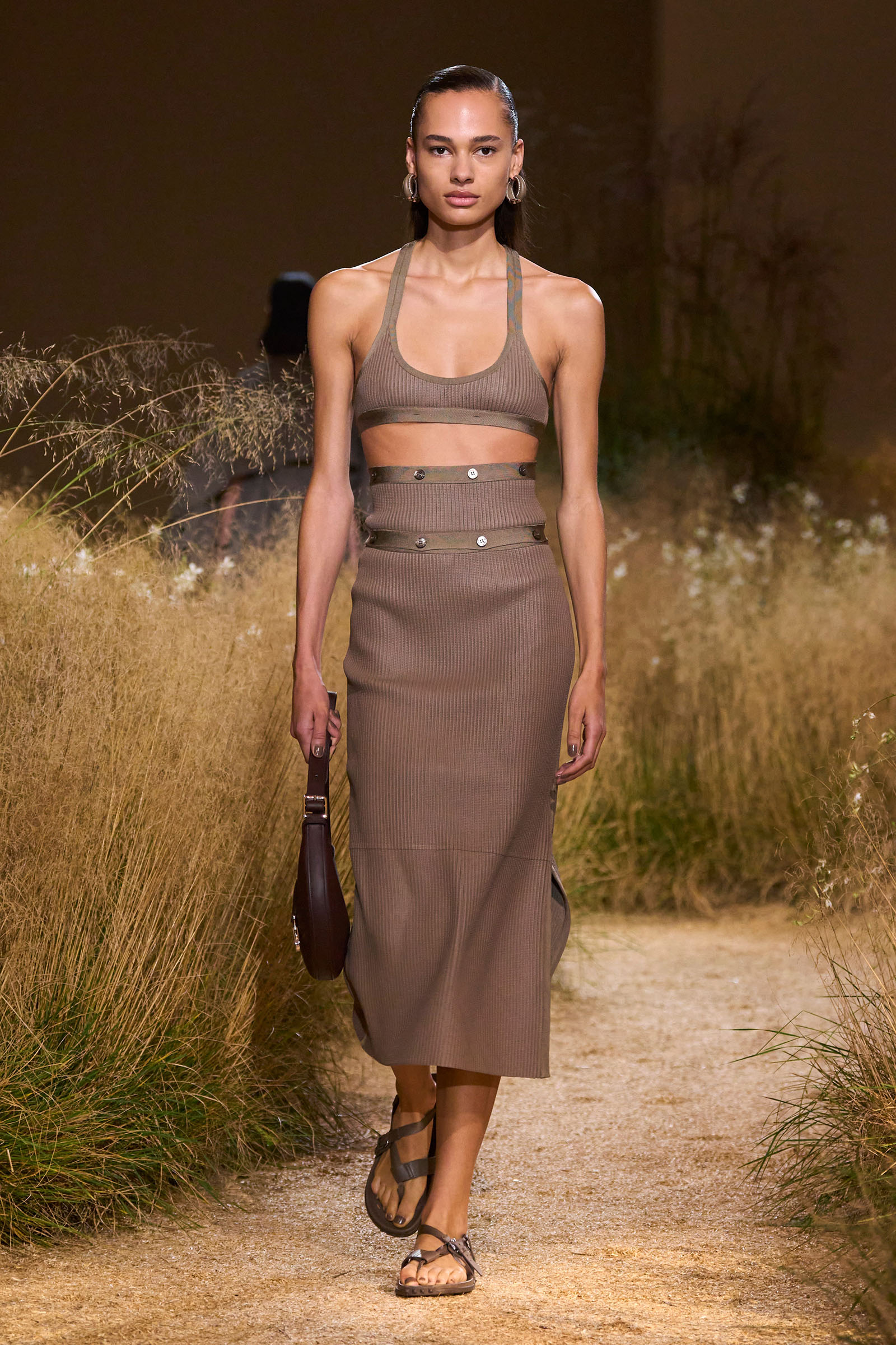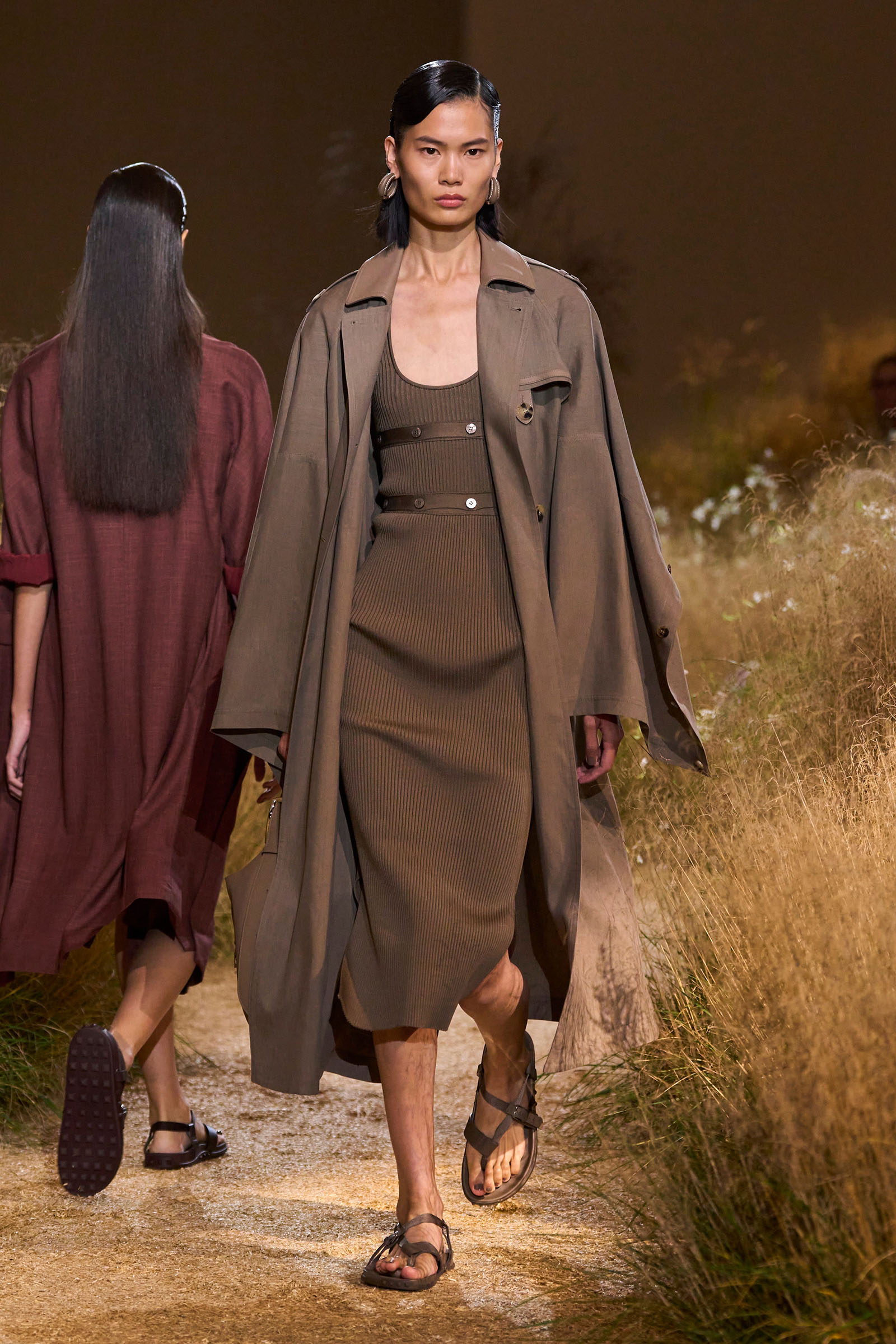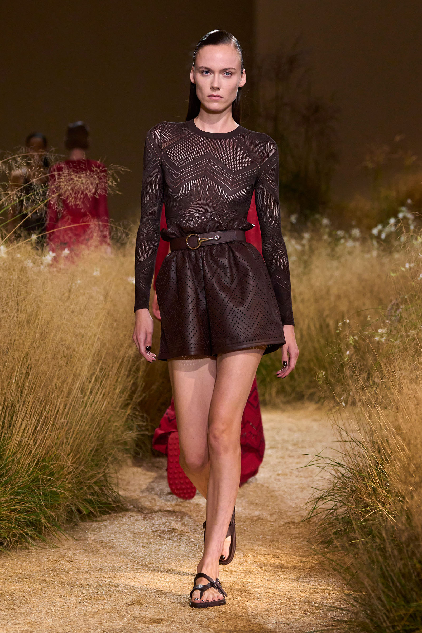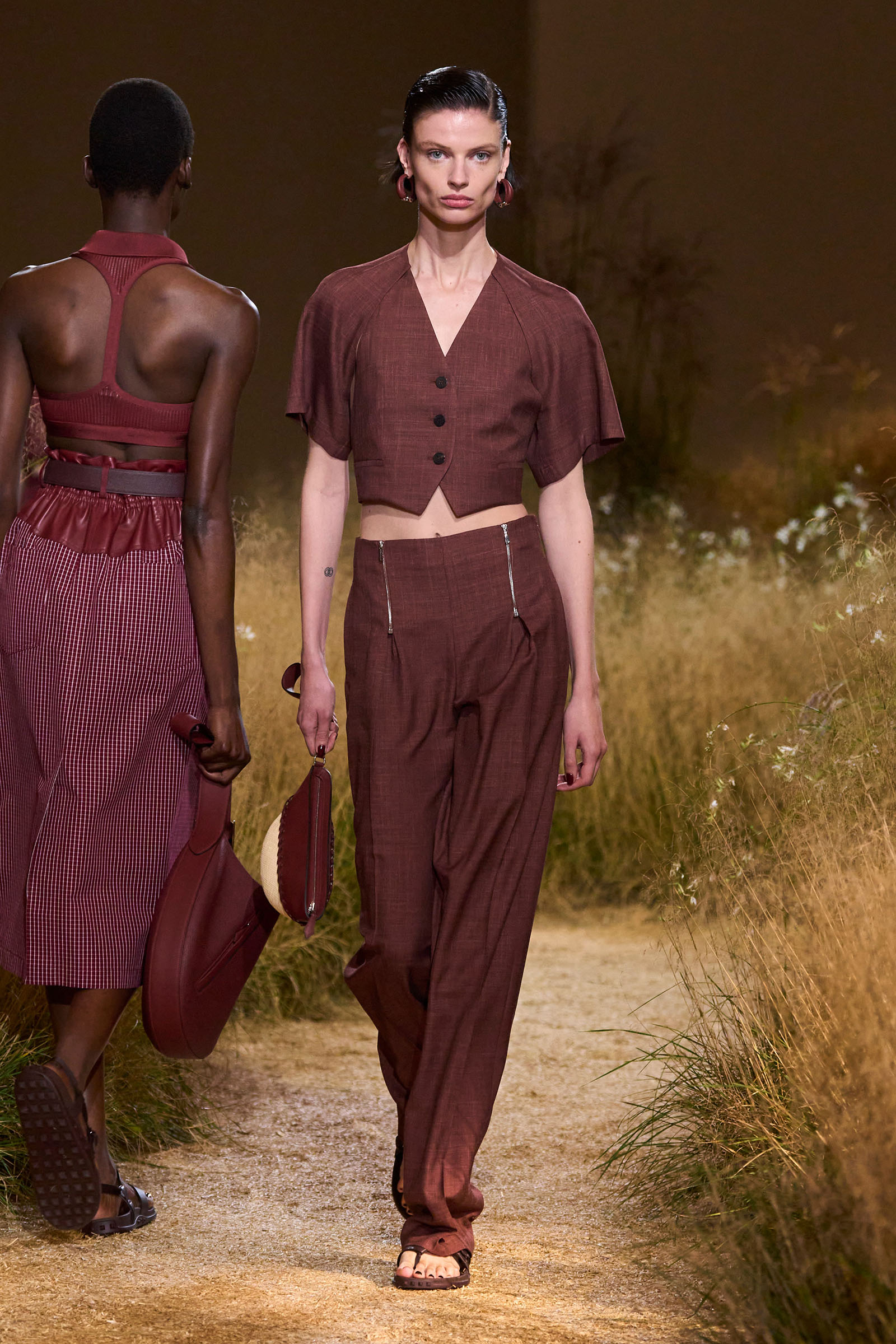 The point of all this—the show-off part secreted among all this quiet super-luxury—is to give the impression of a wardrobe for an easy lifestyle. That goes right down to the Greek-style sandals “in ribbon and woven calfskin” shown in every color, with nail polish to match. Even the soles, it turned out, had Hermès treads “adorned with Medor studs.” No detail is overlooked when it comes to ensuring the footprint of this house is consistently recognizable.