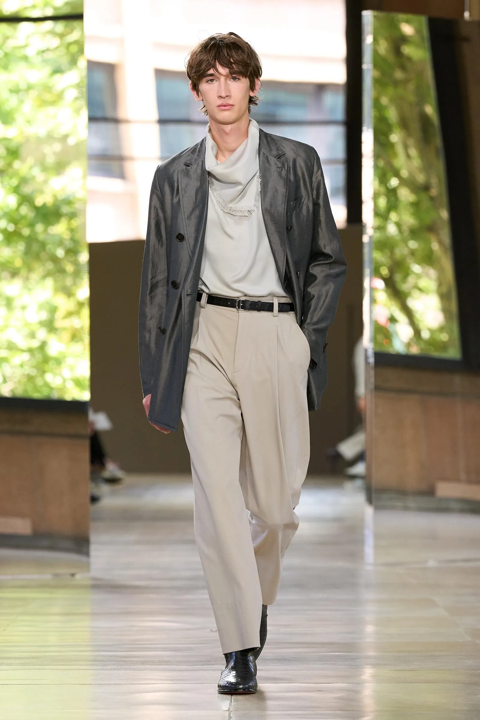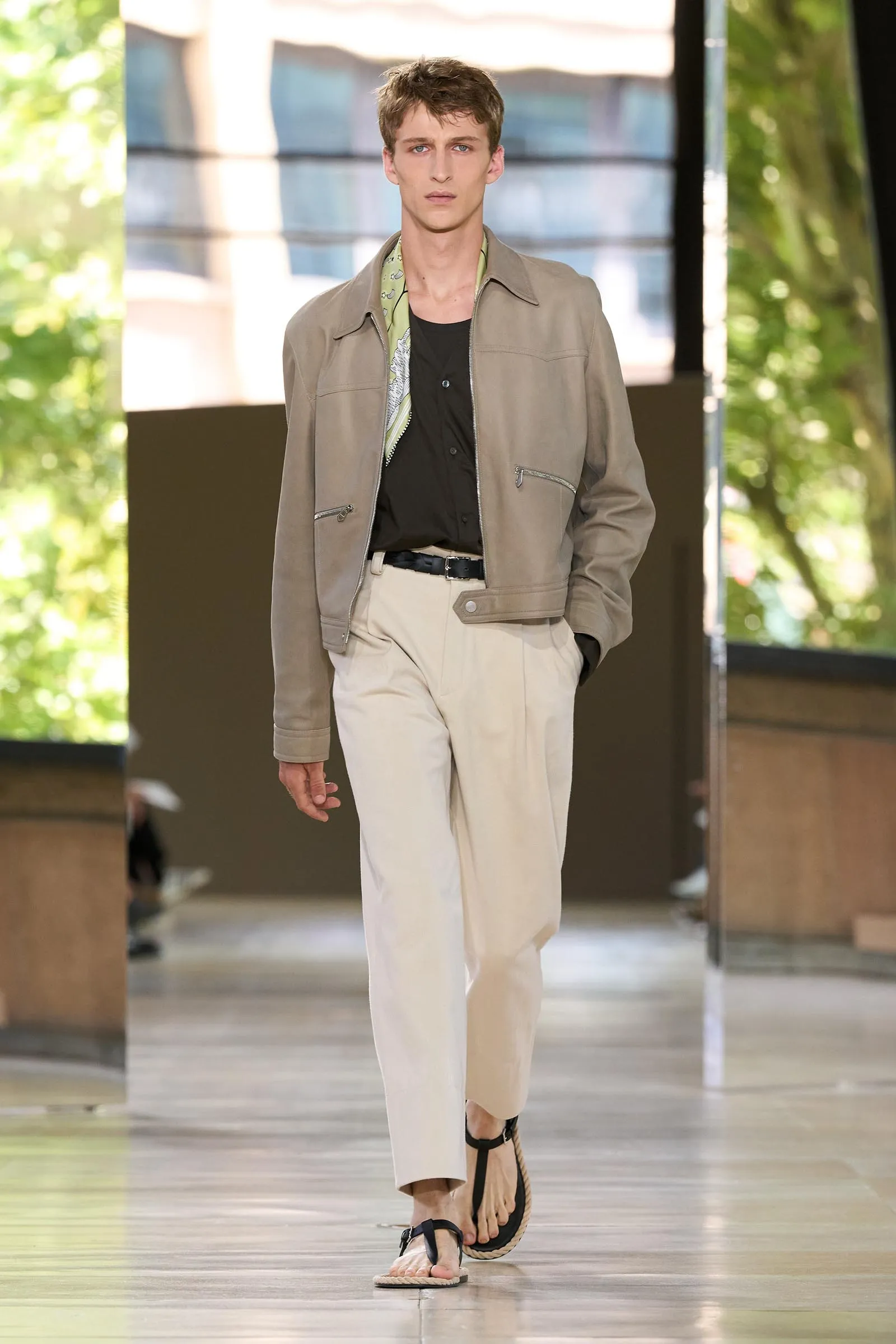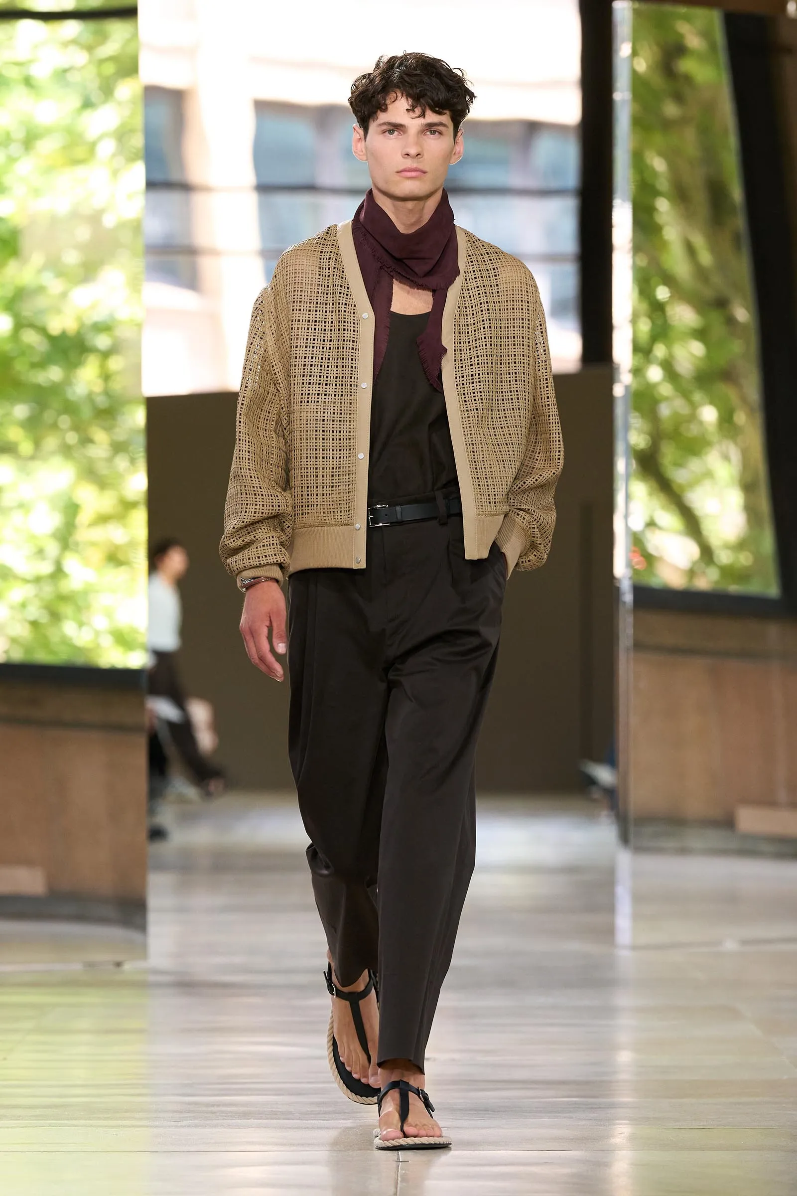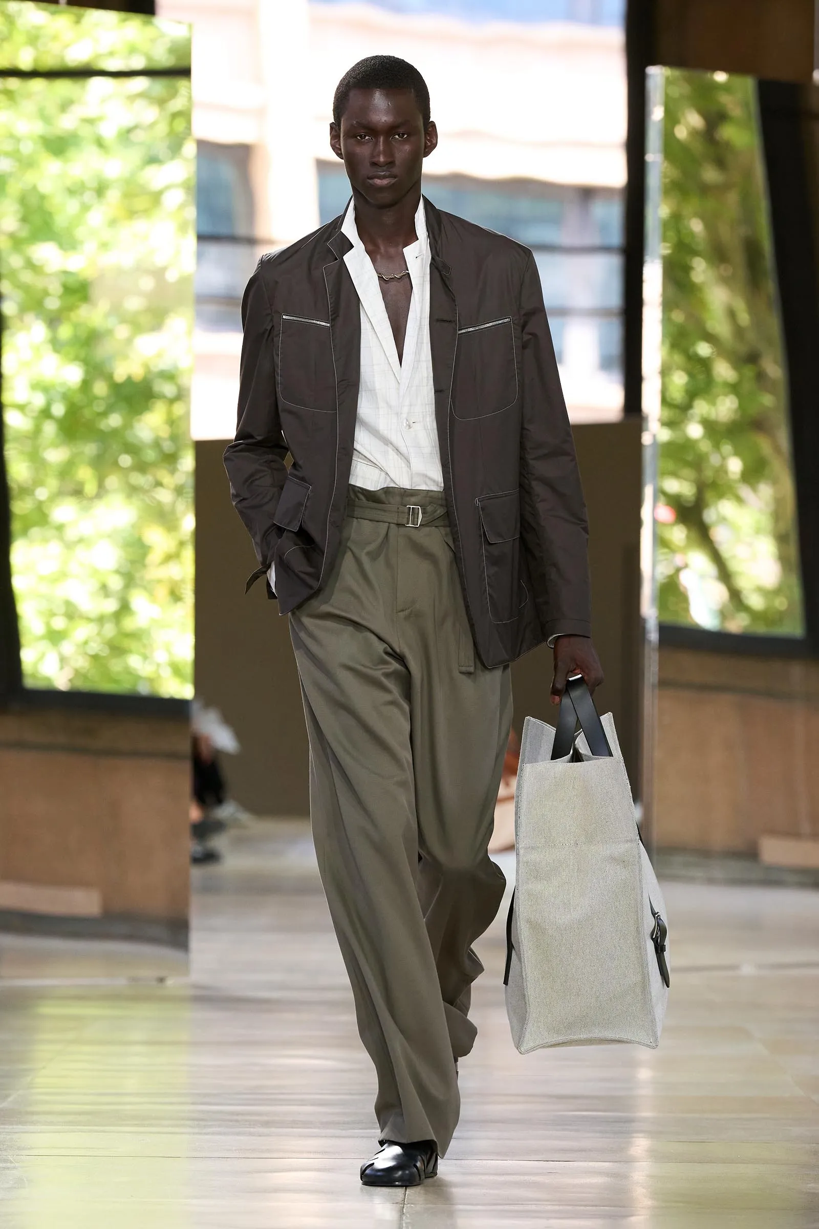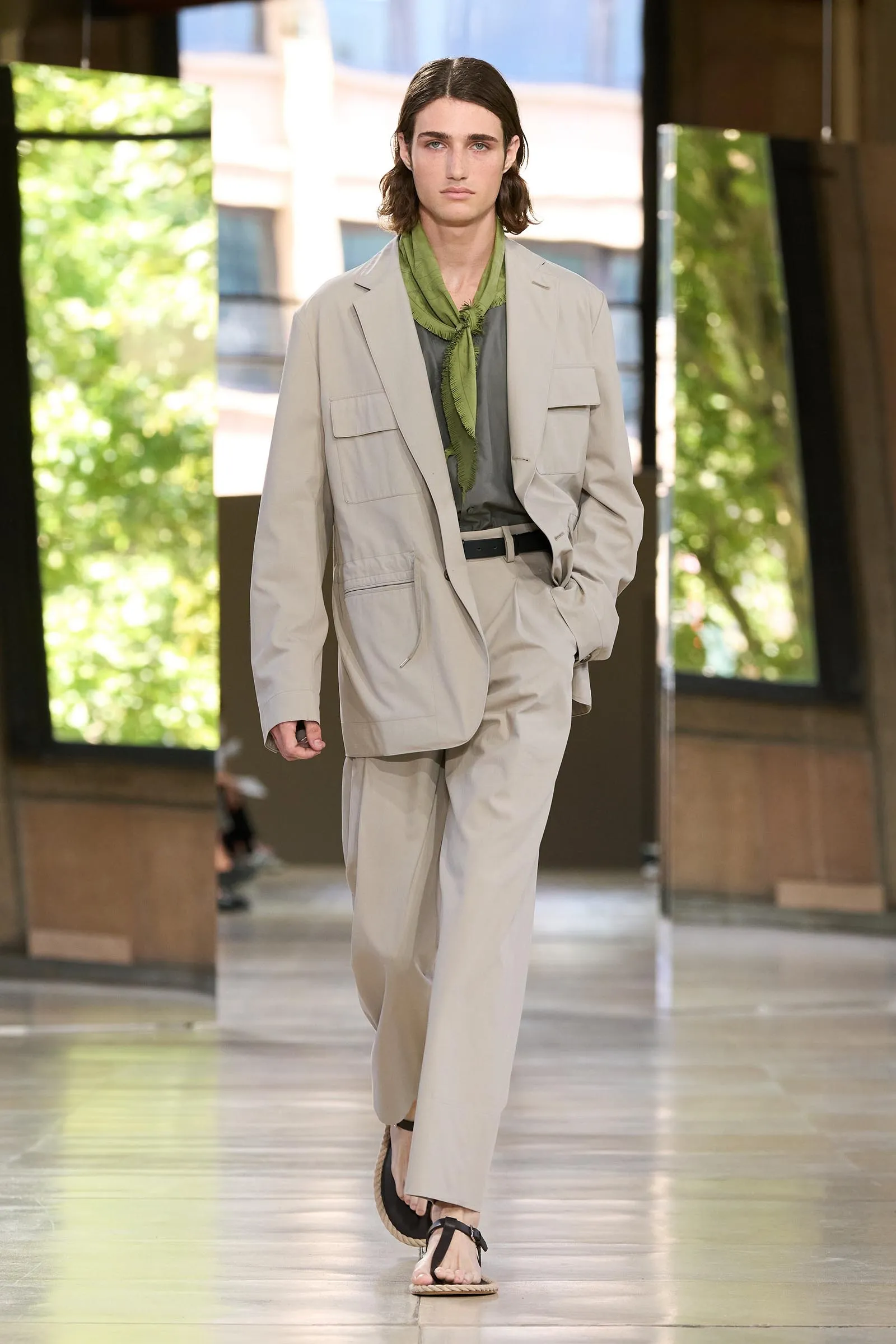 “I was looking for lightness,” Nichanian said, although, interestingly, she’d not designed it as a beachy-sporty summer vacation collection at all. Instead here was Hermès at its most Hermès: making a modern city wardrobe for a discreetly relaxed wealthy man. Mainly crafted in browns, inky-blacks and light neutrals, these were garments which passed as low-key normal but were in fact designed and made to perfection. “It’s the proportion I liked—wider trousers, shorter jackets,” Nichanian declared.