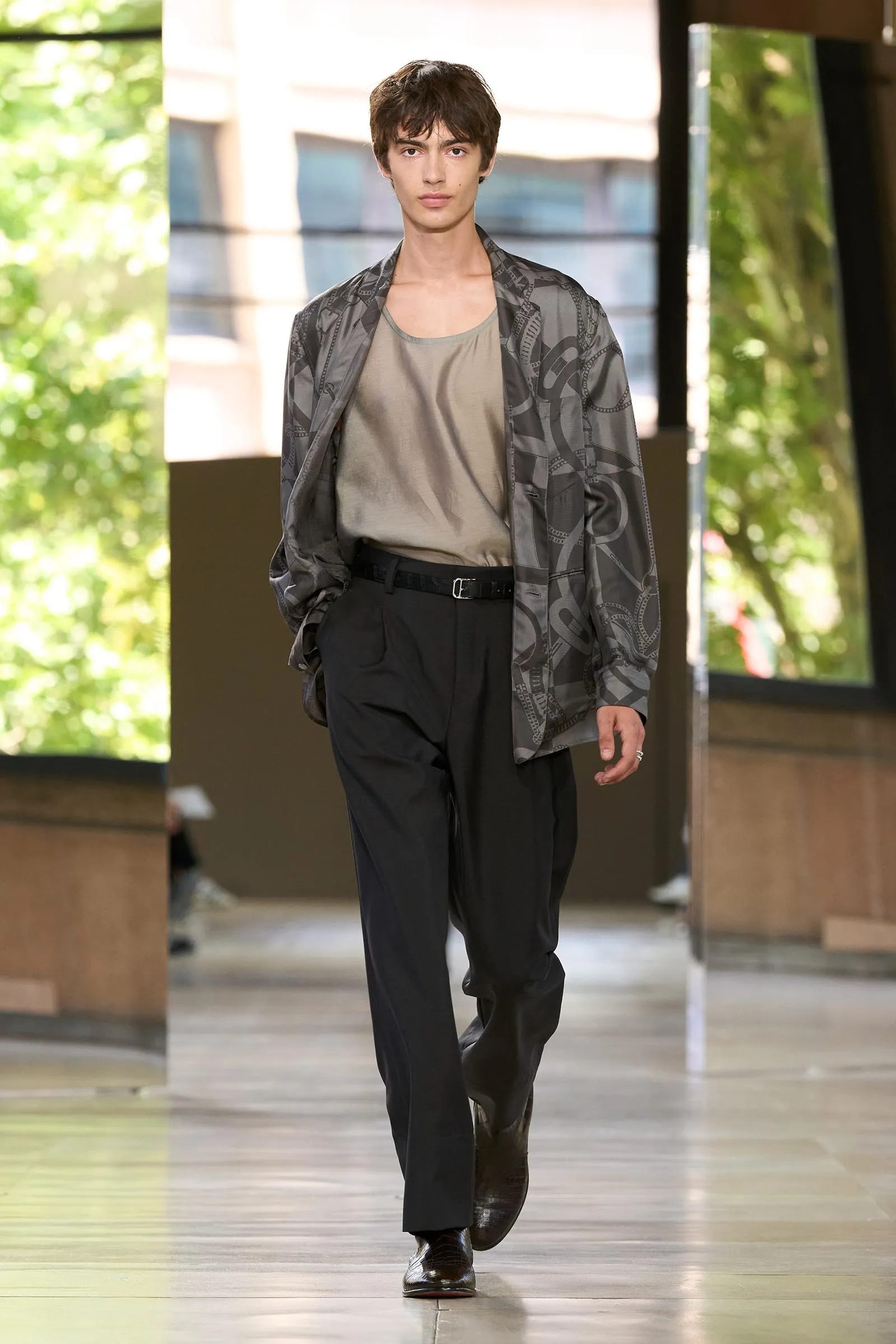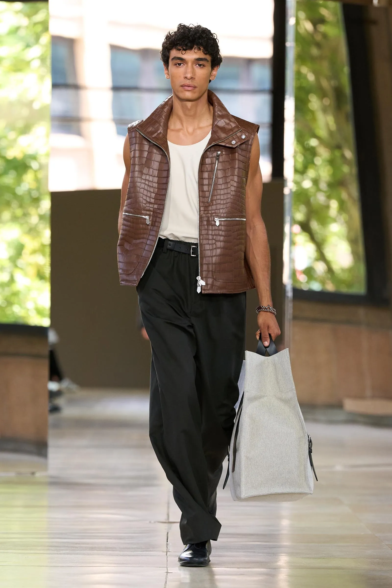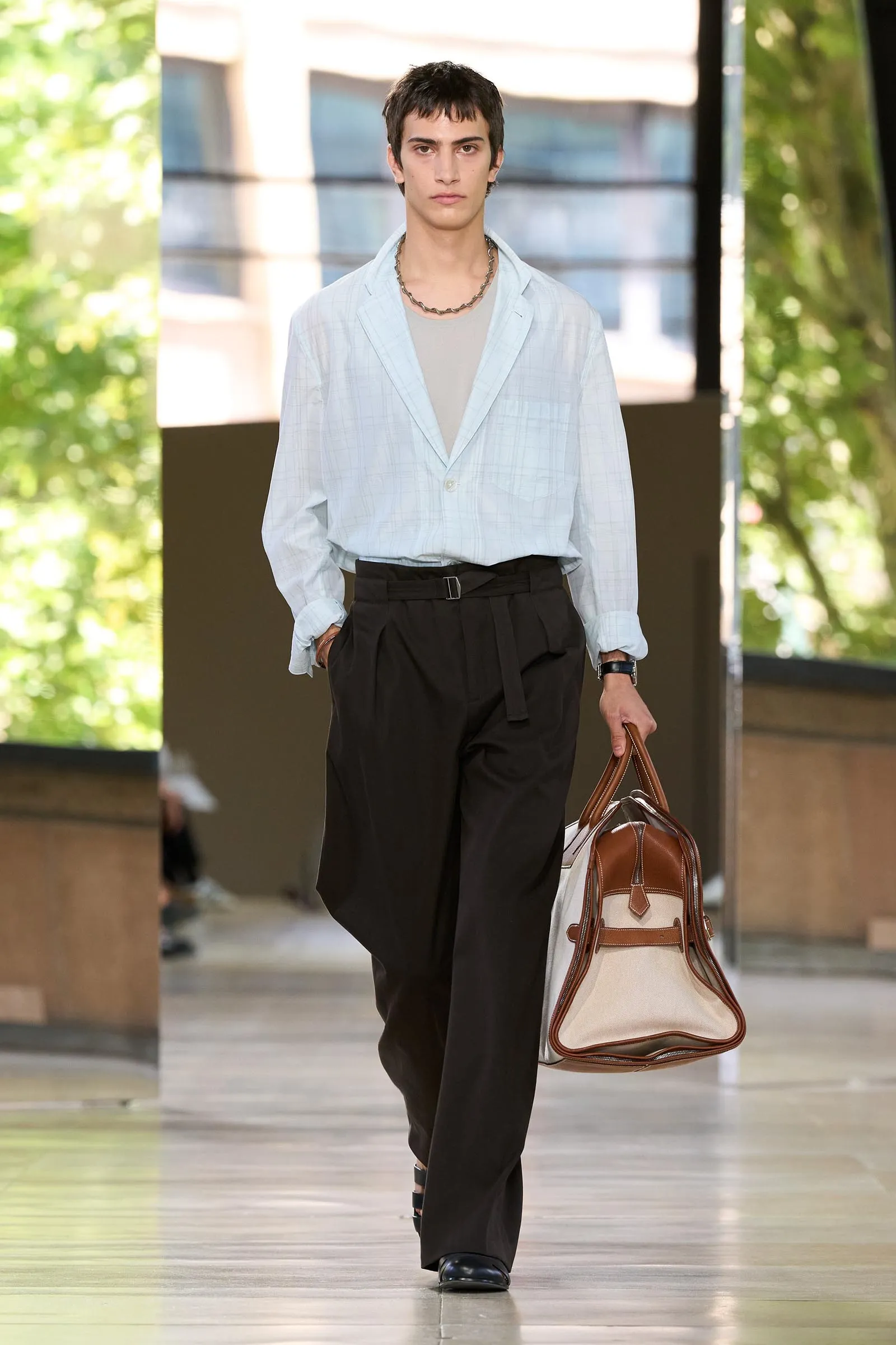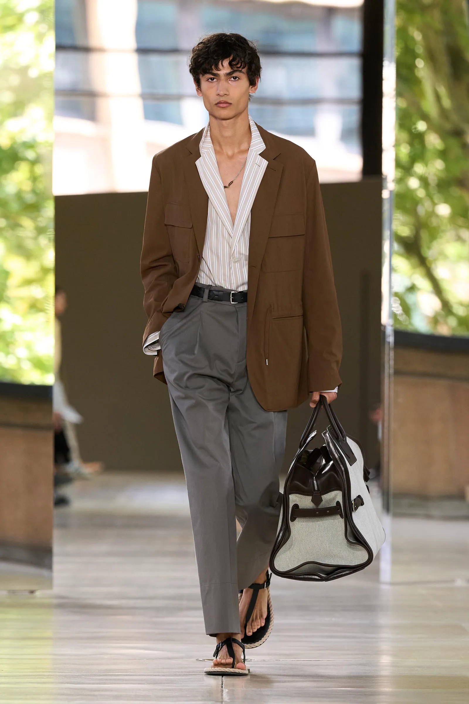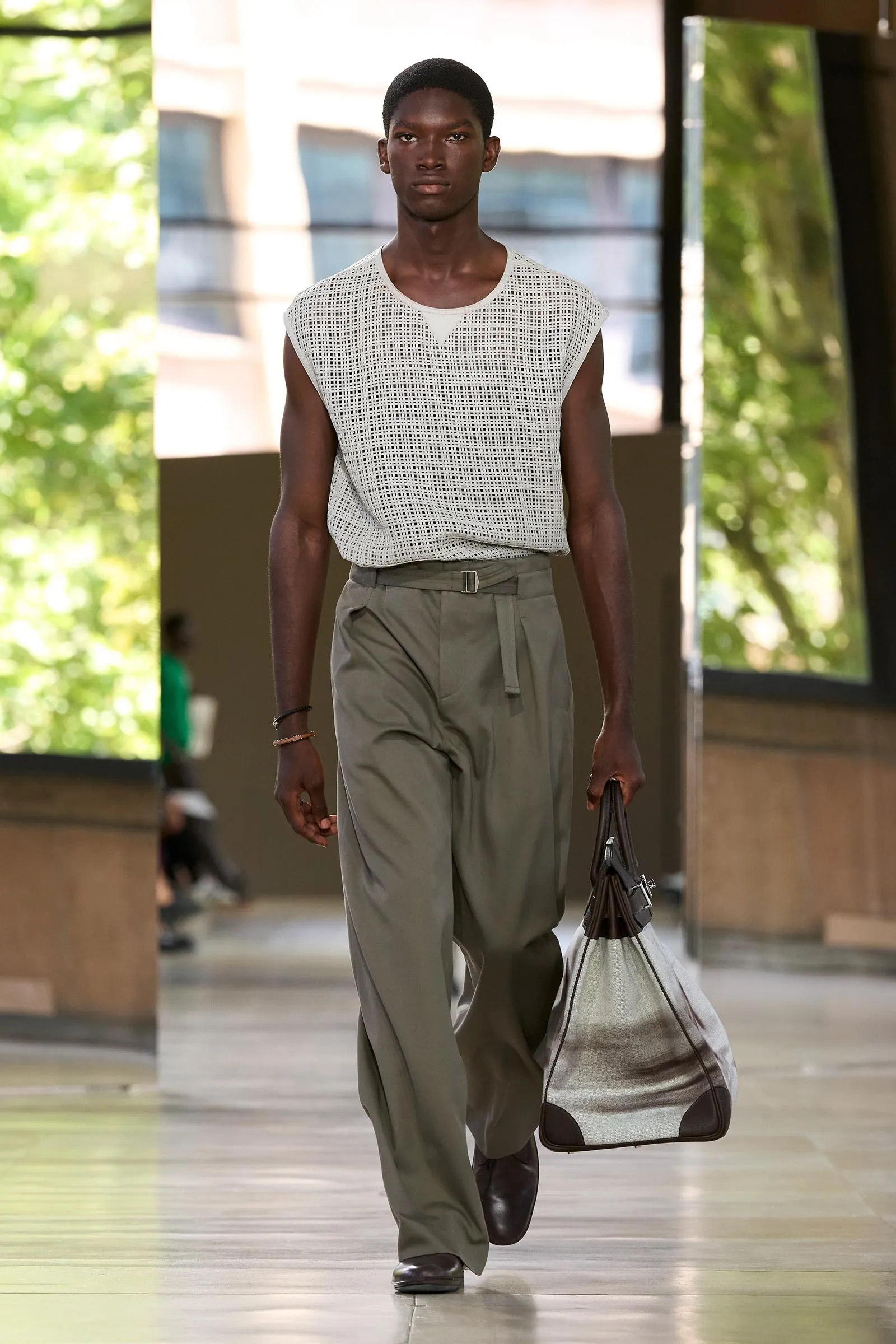 “I was looking for lightness,” Nichanian said, although, interestingly, she’d not designed it as a beachy-sporty summer vacation collection at all. Instead here was Hermès at its most Hermès: making a modern city wardrobe for a discreetly relaxed wealthy man. Mainly crafted in browns, inky-blacks and light neutrals, these were garments which passed as low-key normal but were in fact designed and made to perfection. “It’s the proportion I liked—wider trousers, shorter jackets,” Nichanian declared.