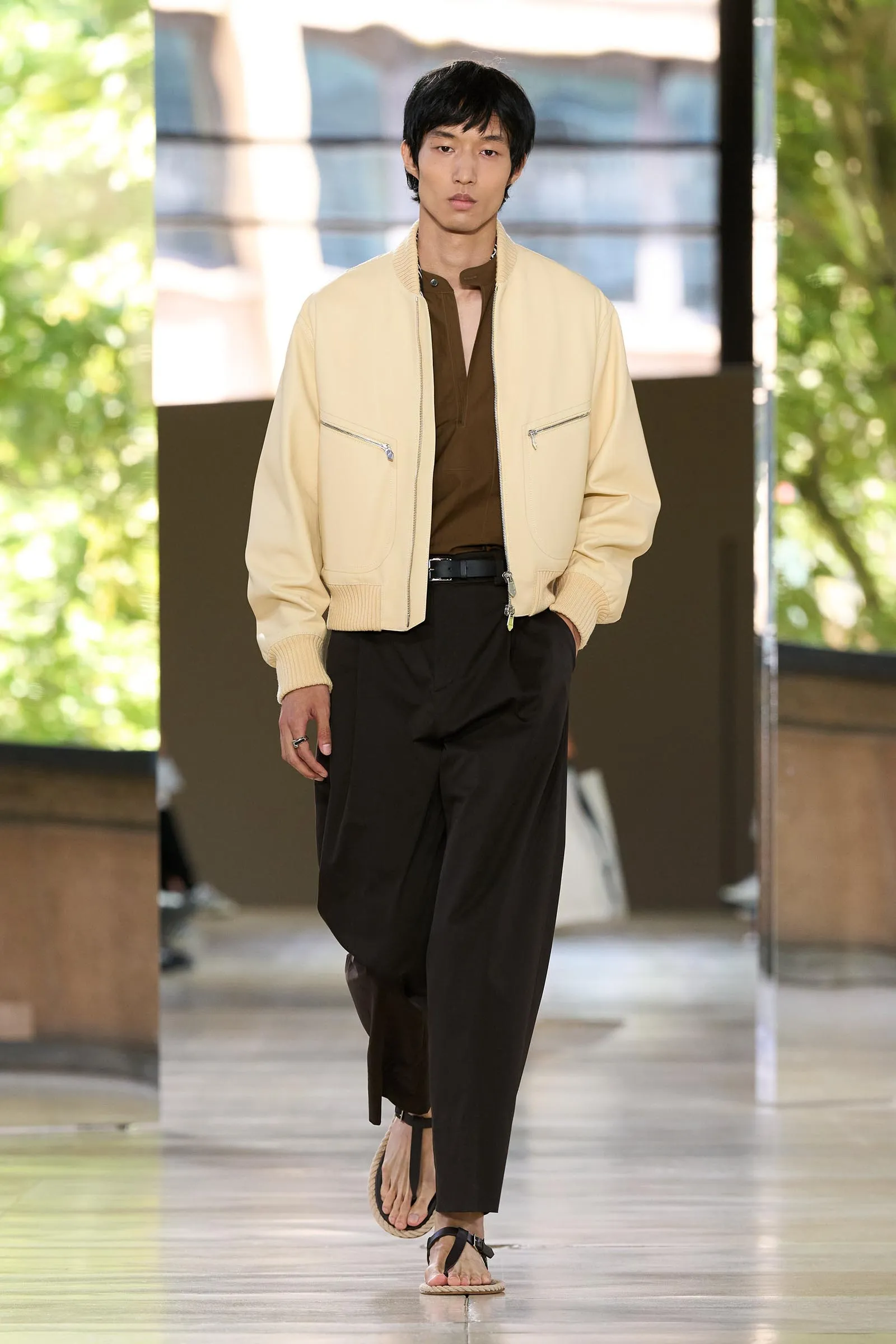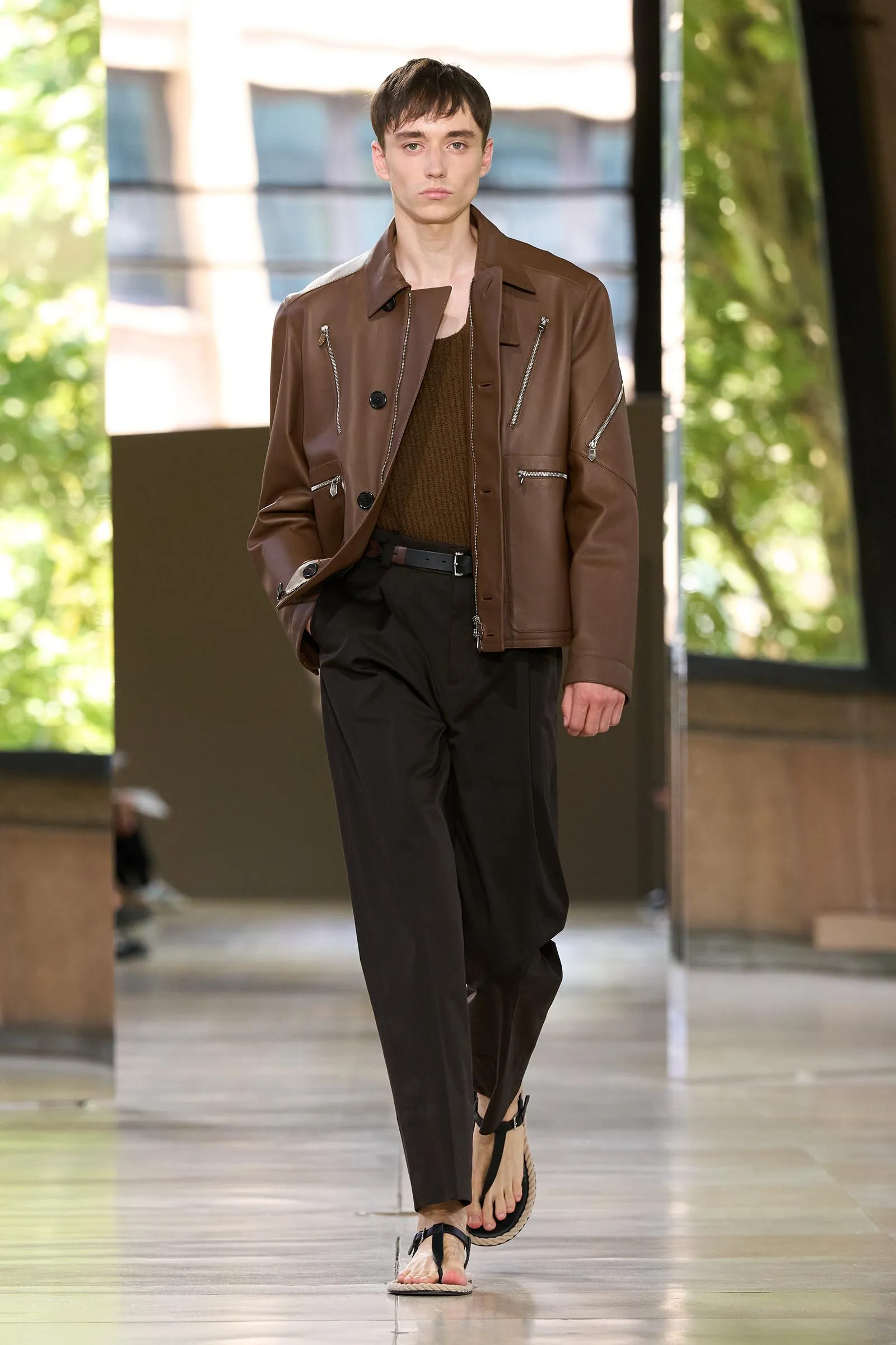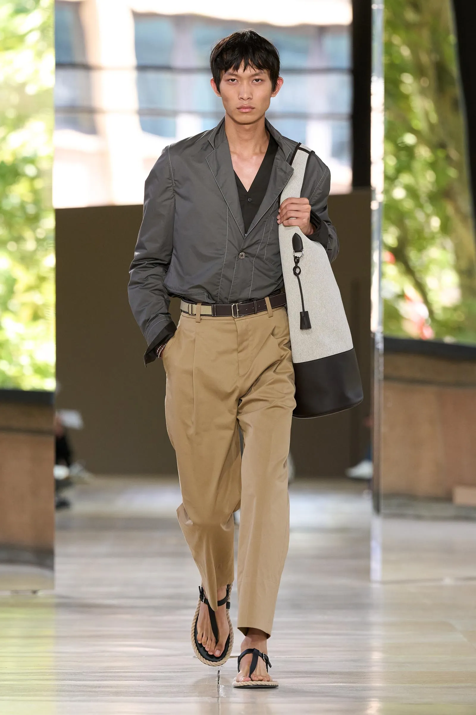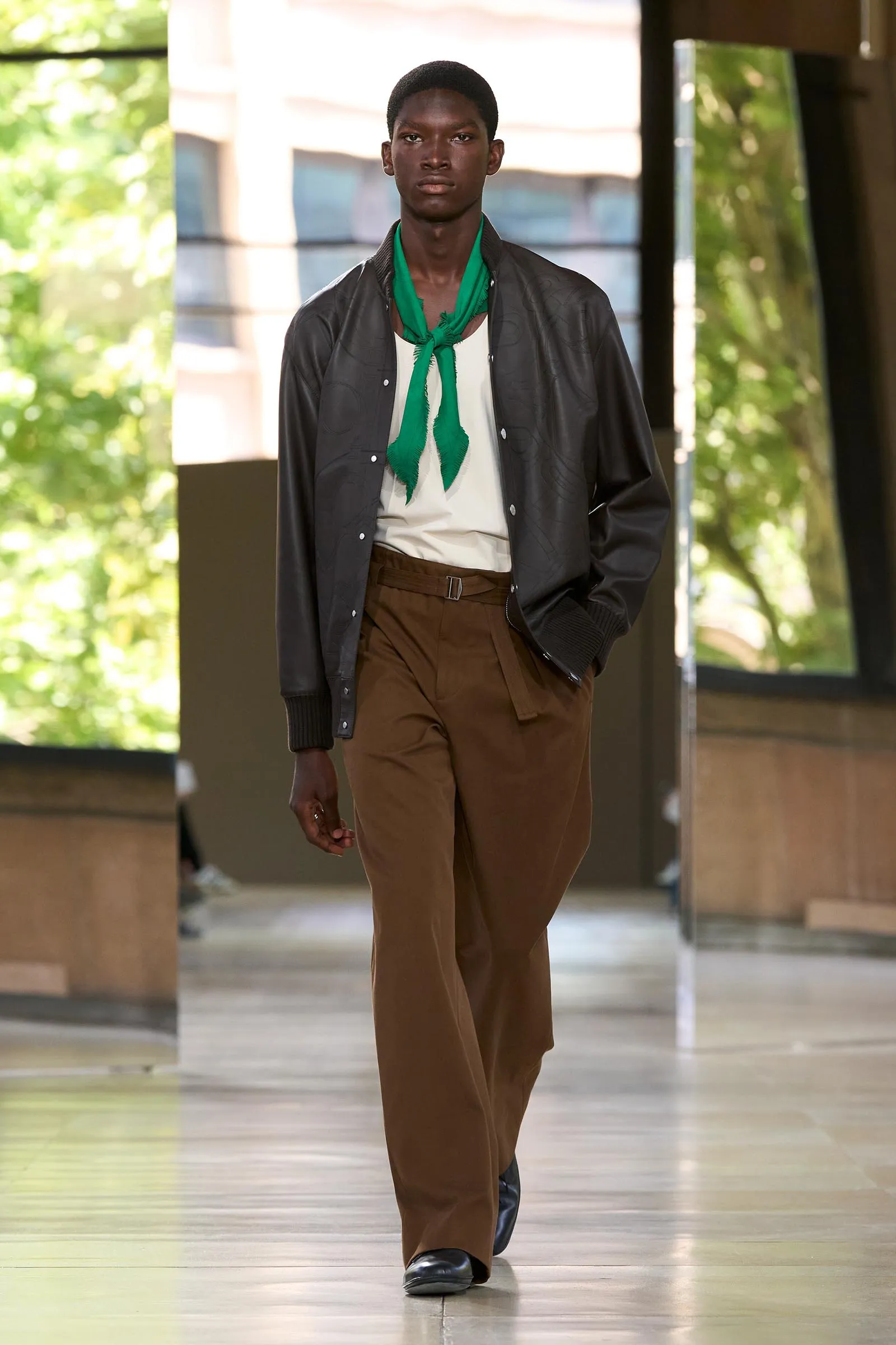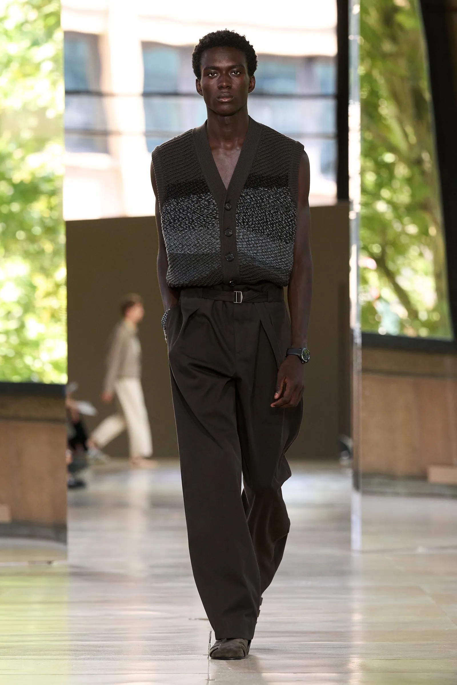 “I was looking for lightness,” Nichanian said, although, interestingly, she’d not designed it as a beachy-sporty summer vacation collection at all. Instead here was Hermès at its most Hermès: making a modern city wardrobe for a discreetly relaxed wealthy man. Mainly crafted in browns, inky-blacks and light neutrals, these were garments which passed as low-key normal but were in fact designed and made to perfection. “It’s the proportion I liked—wider trousers, shorter jackets,” Nichanian declared.