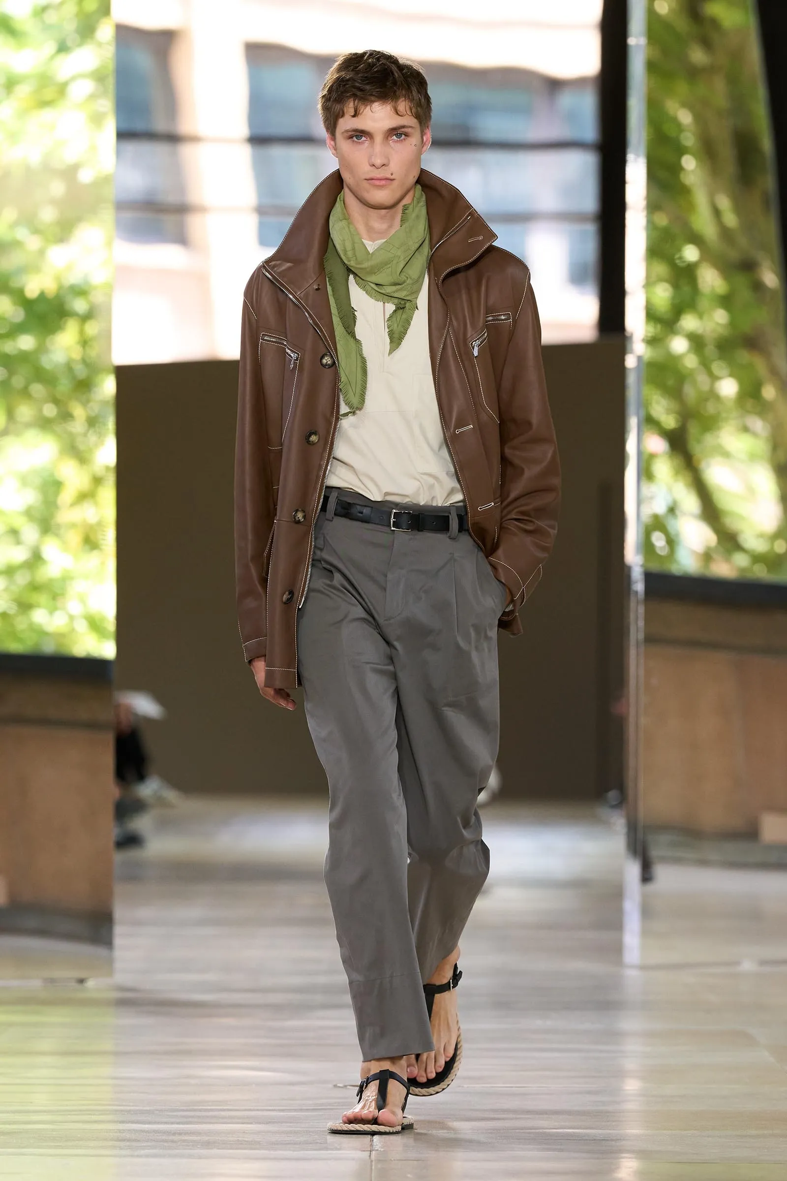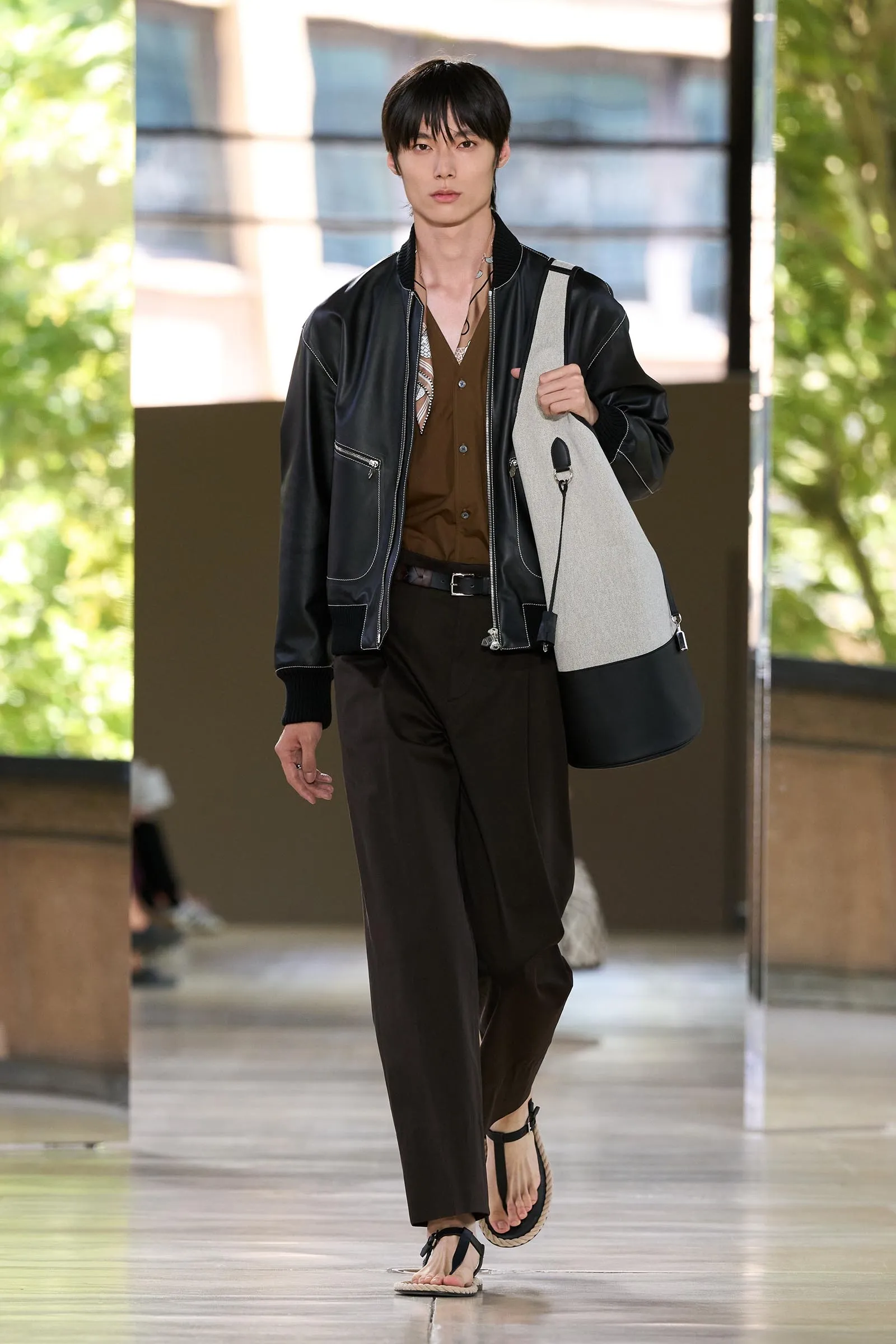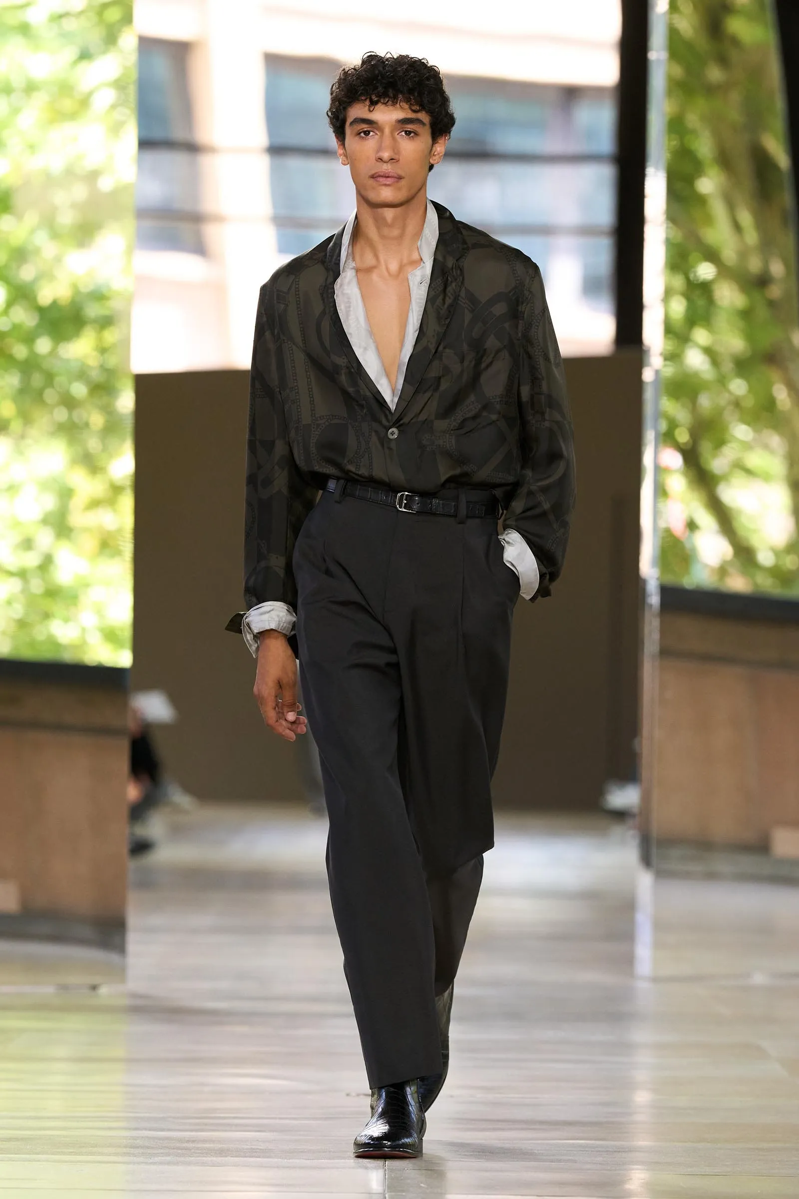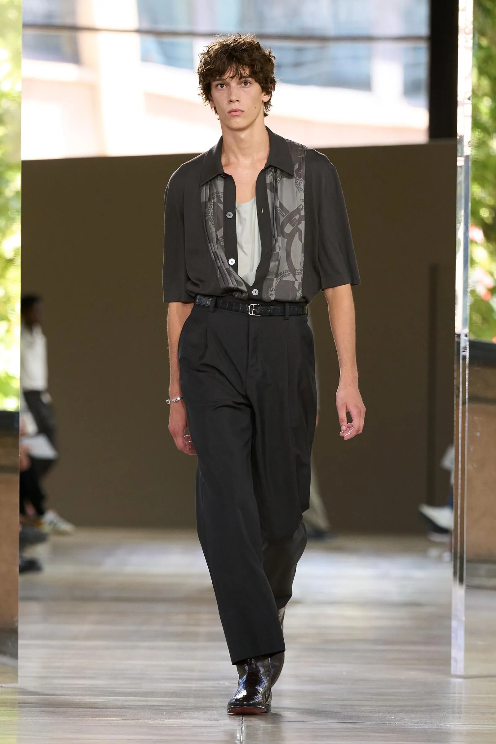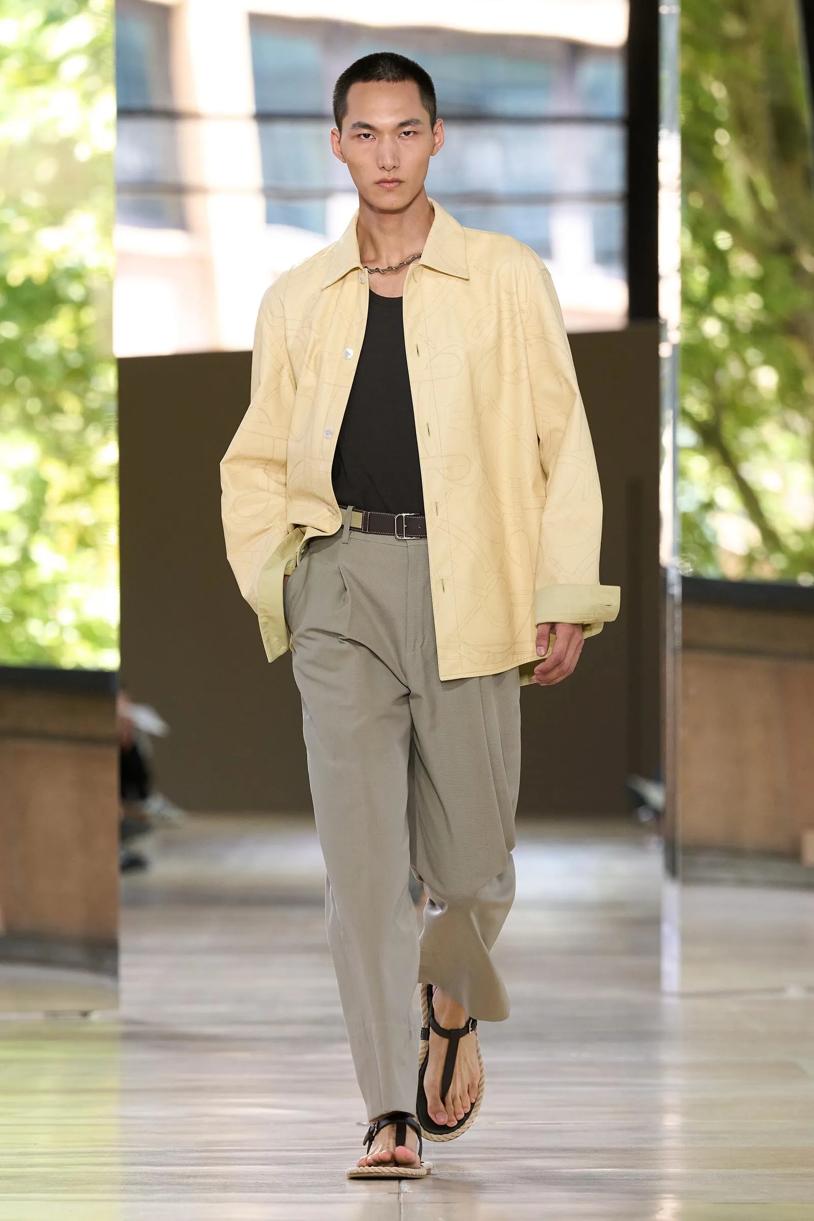 “I was looking for lightness,” Nichanian said, although, interestingly, she’d not designed it as a beachy-sporty summer vacation collection at all. Instead here was Hermès at its most Hermès: making a modern city wardrobe for a discreetly relaxed wealthy man. Mainly crafted in browns, inky-blacks and light neutrals, these were garments which passed as low-key normal but were in fact designed and made to perfection. “It’s the proportion I liked—wider trousers, shorter jackets,” Nichanian declared.