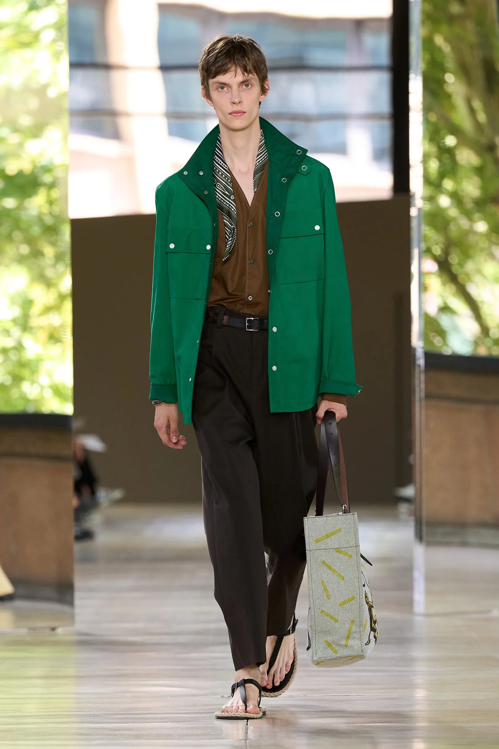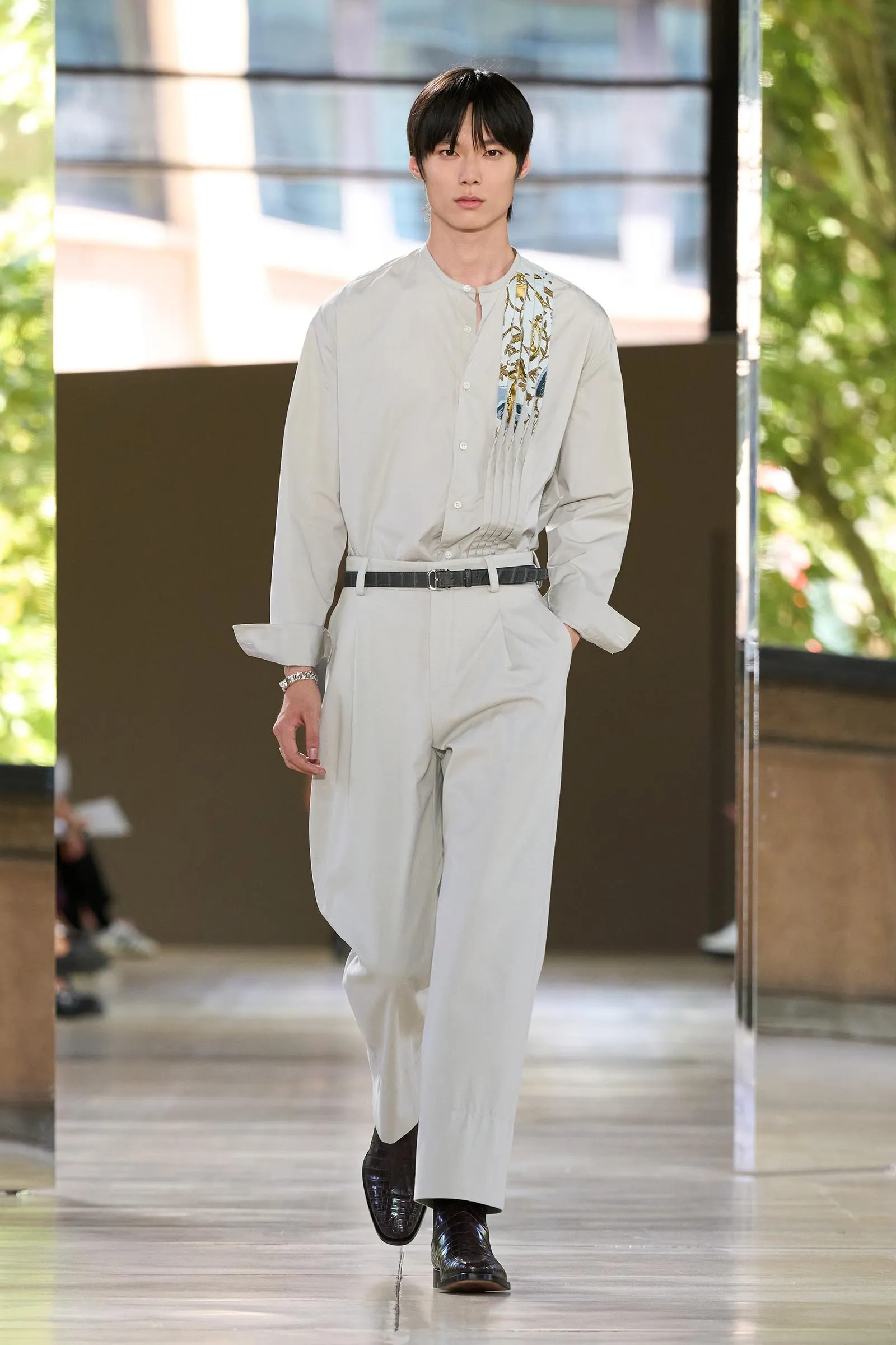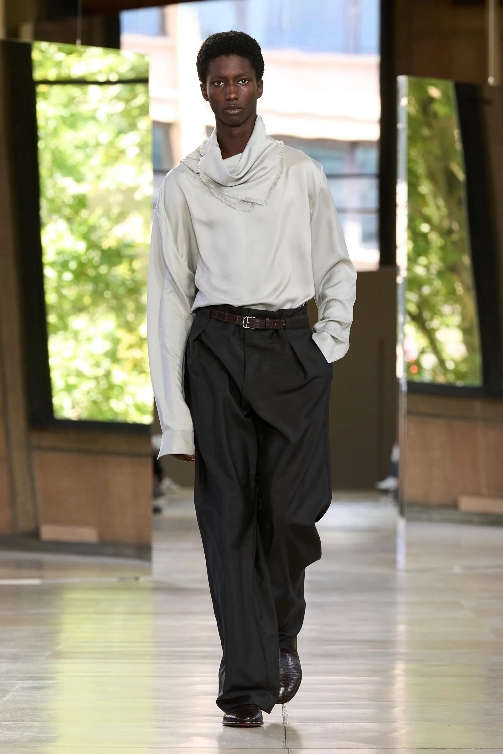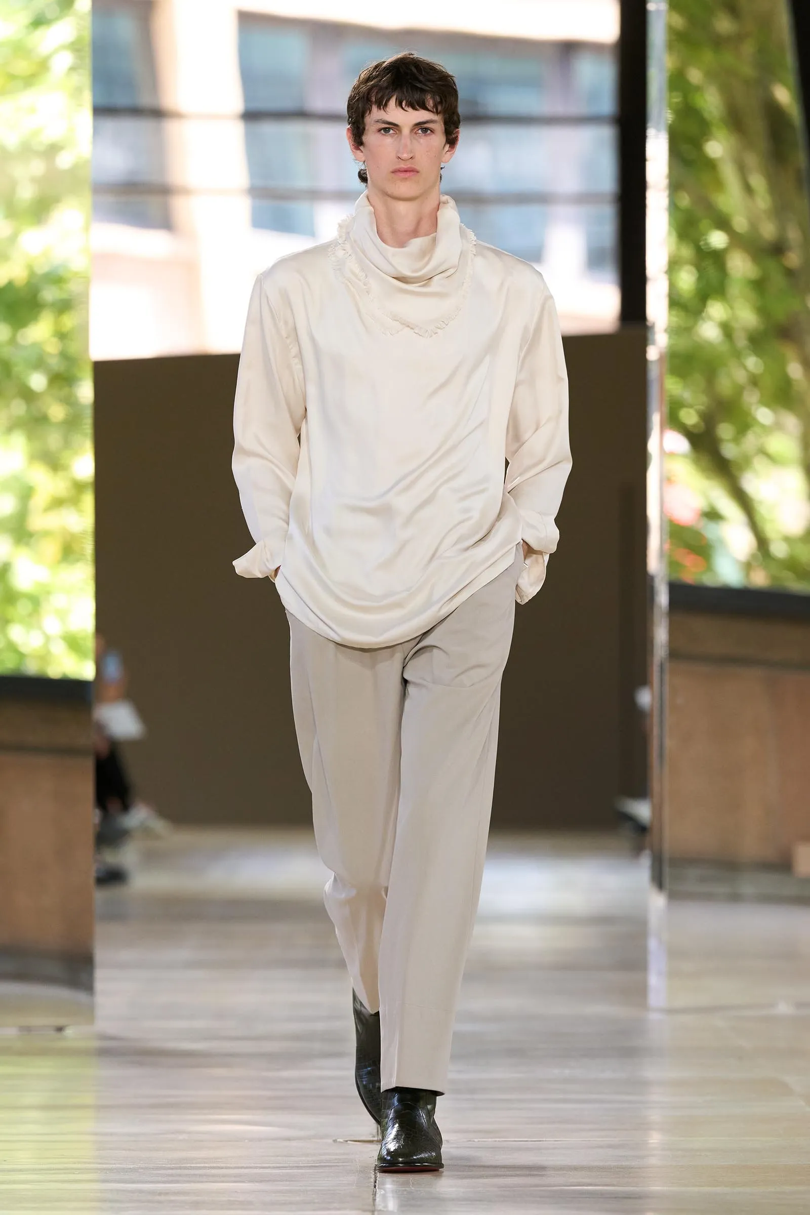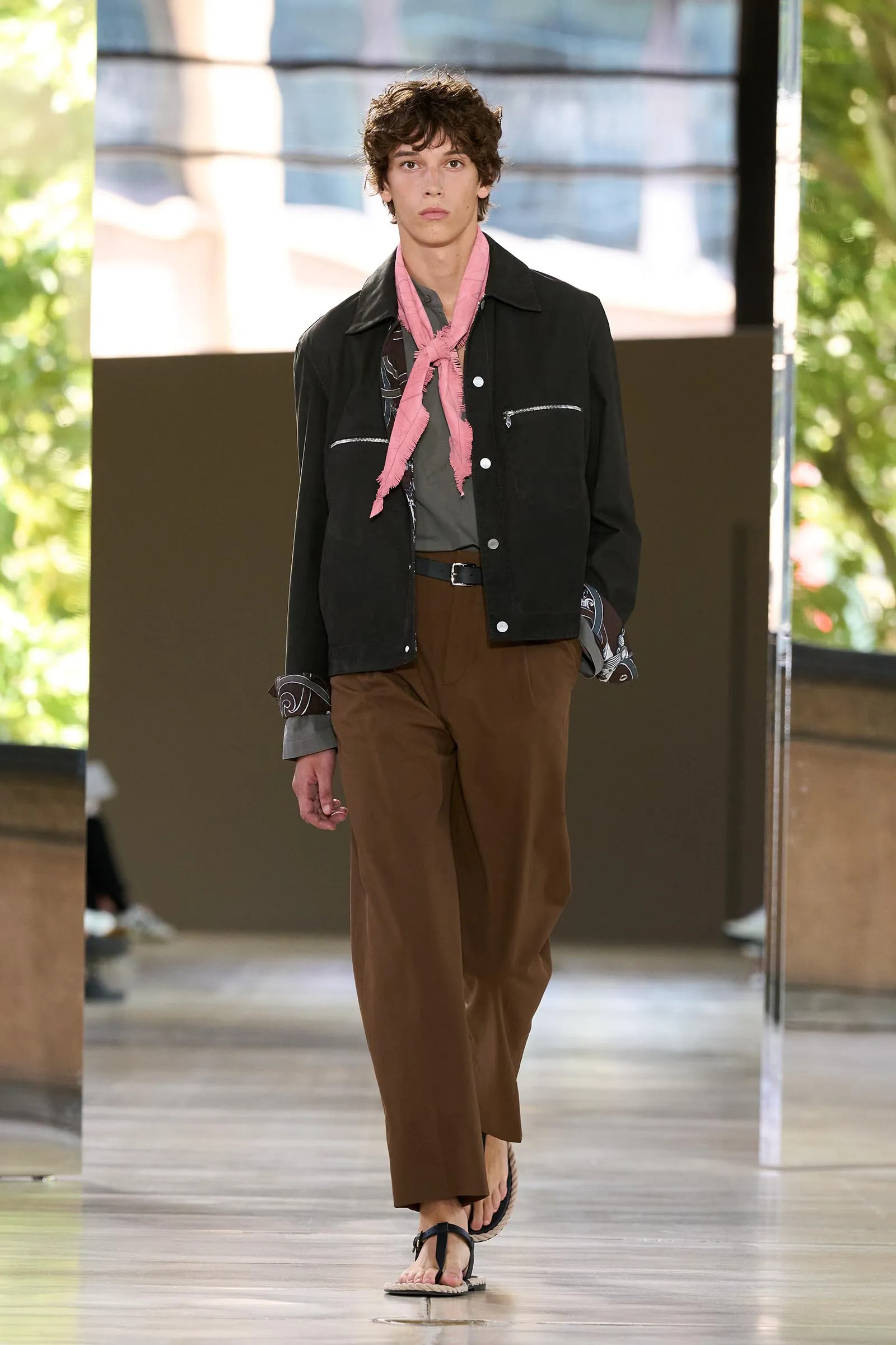 “I was looking for lightness,” Nichanian said, although, interestingly, she’d not designed it as a beachy-sporty summer vacation collection at all. Instead here was Hermès at its most Hermès: making a modern city wardrobe for a discreetly relaxed wealthy man. Mainly crafted in browns, inky-blacks and light neutrals, these were garments which passed as low-key normal but were in fact designed and made to perfection. “It’s the proportion I liked—wider trousers, shorter jackets,” Nichanian declared.