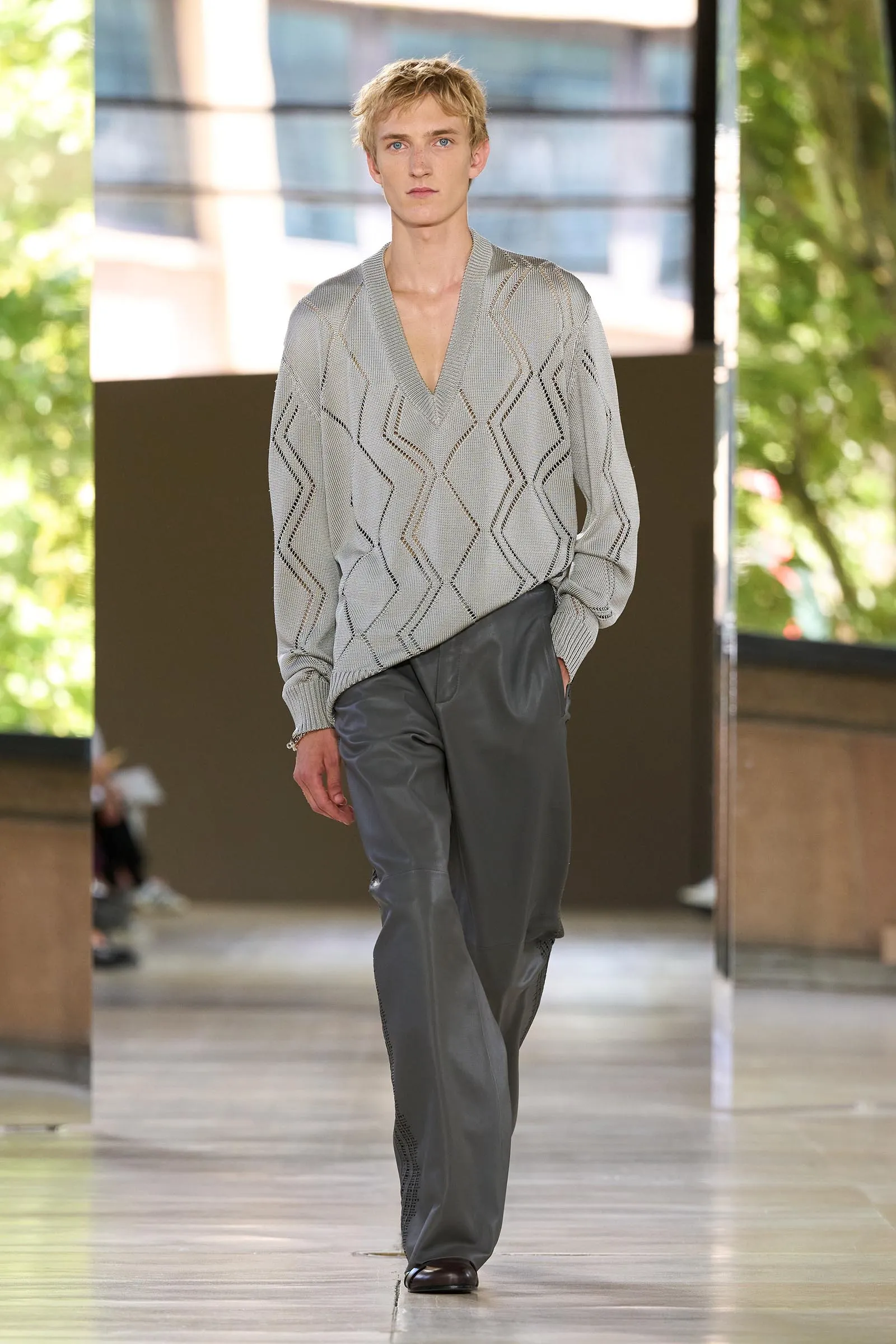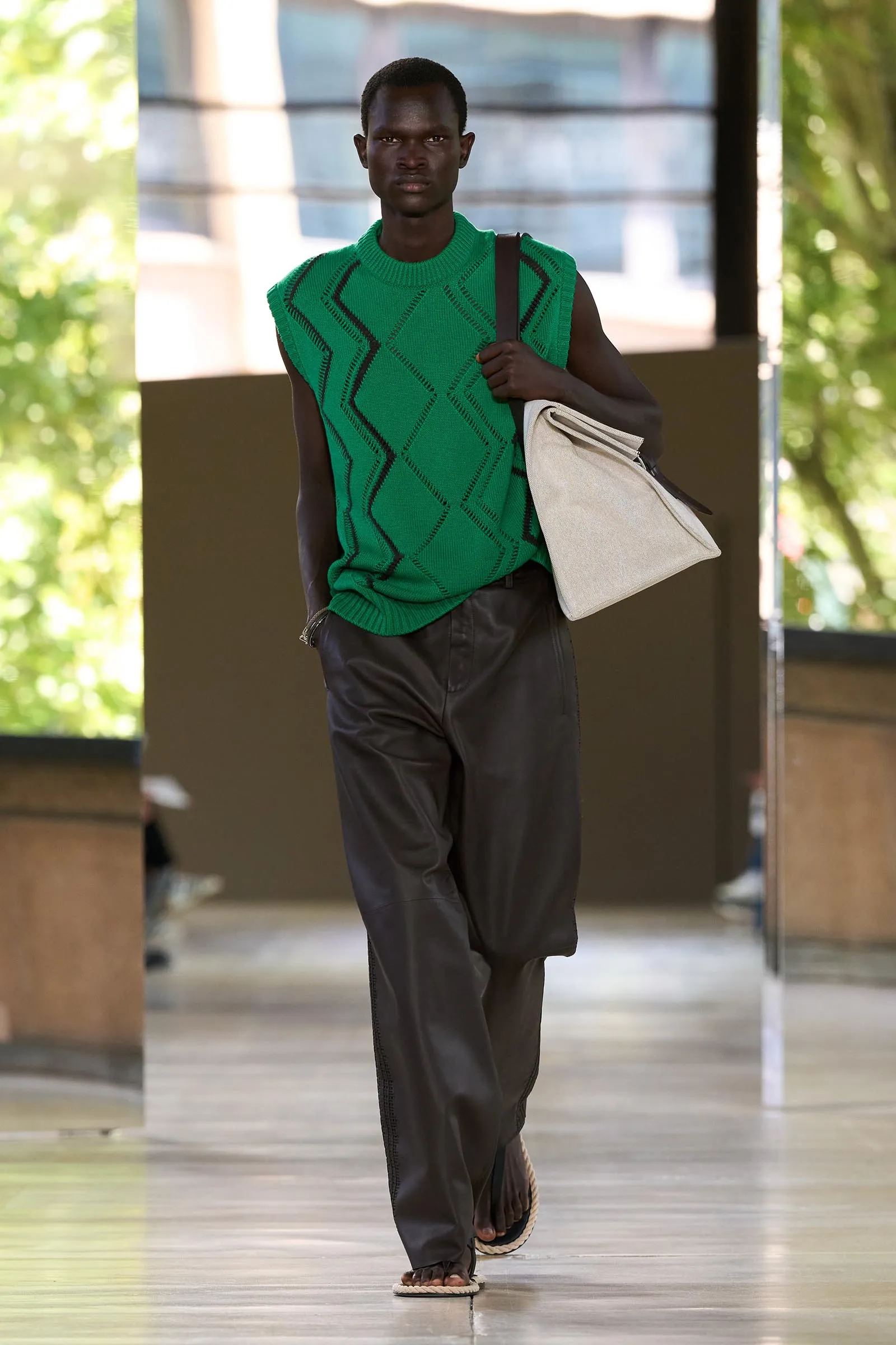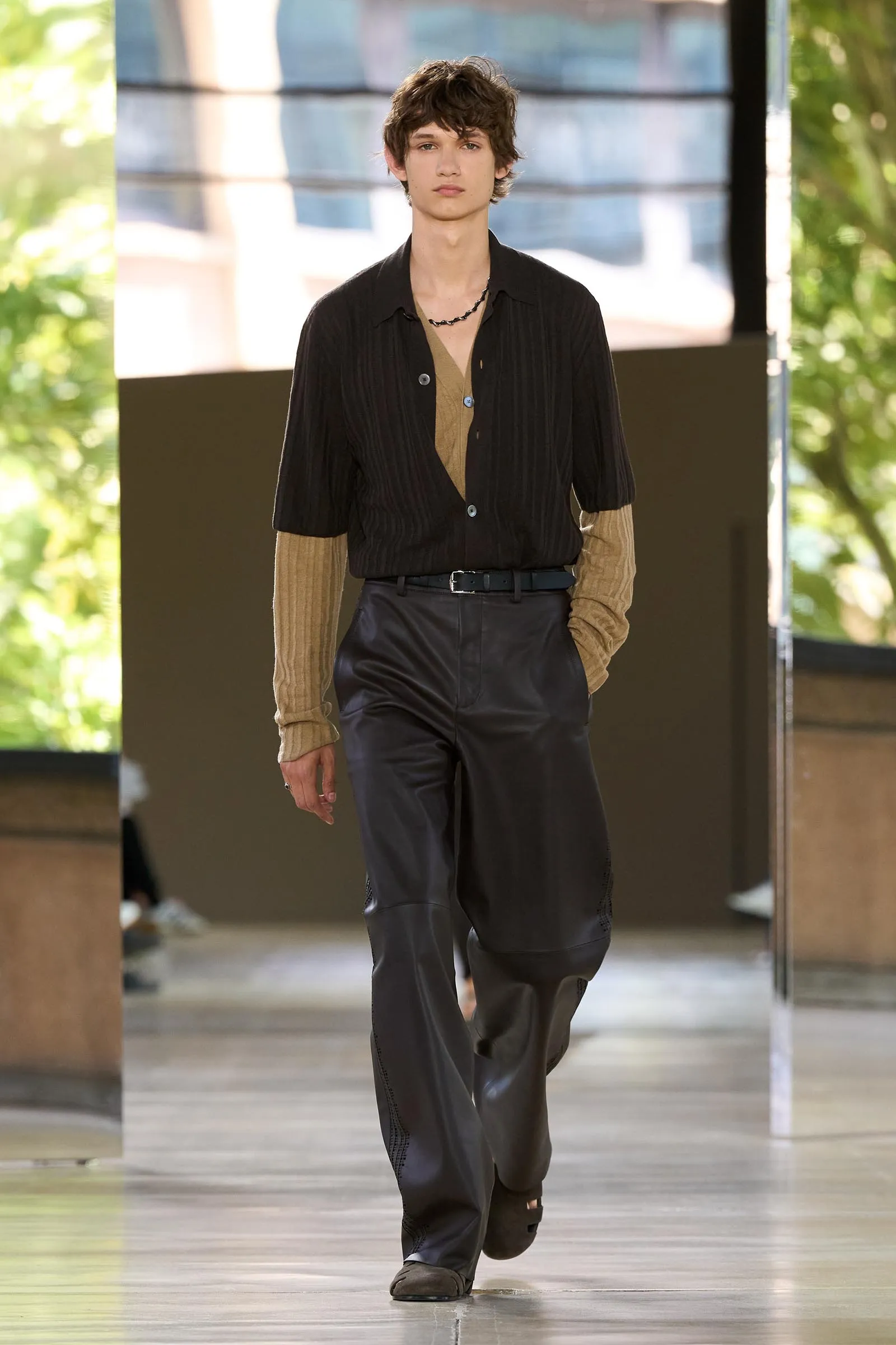 It was just a hint of what lay ahead. By Look 7, a summer bomber—at a distance in a khaki-gray stripe—was woven in strips of leather. There were similarly-ventilated cardigans, sleeveless tees and a shirt. Then, whole trousers seemed to made from the same lattice-work, though at this point you couldn’t tell whether it was loomed in something like lacquered raffia or rattan.