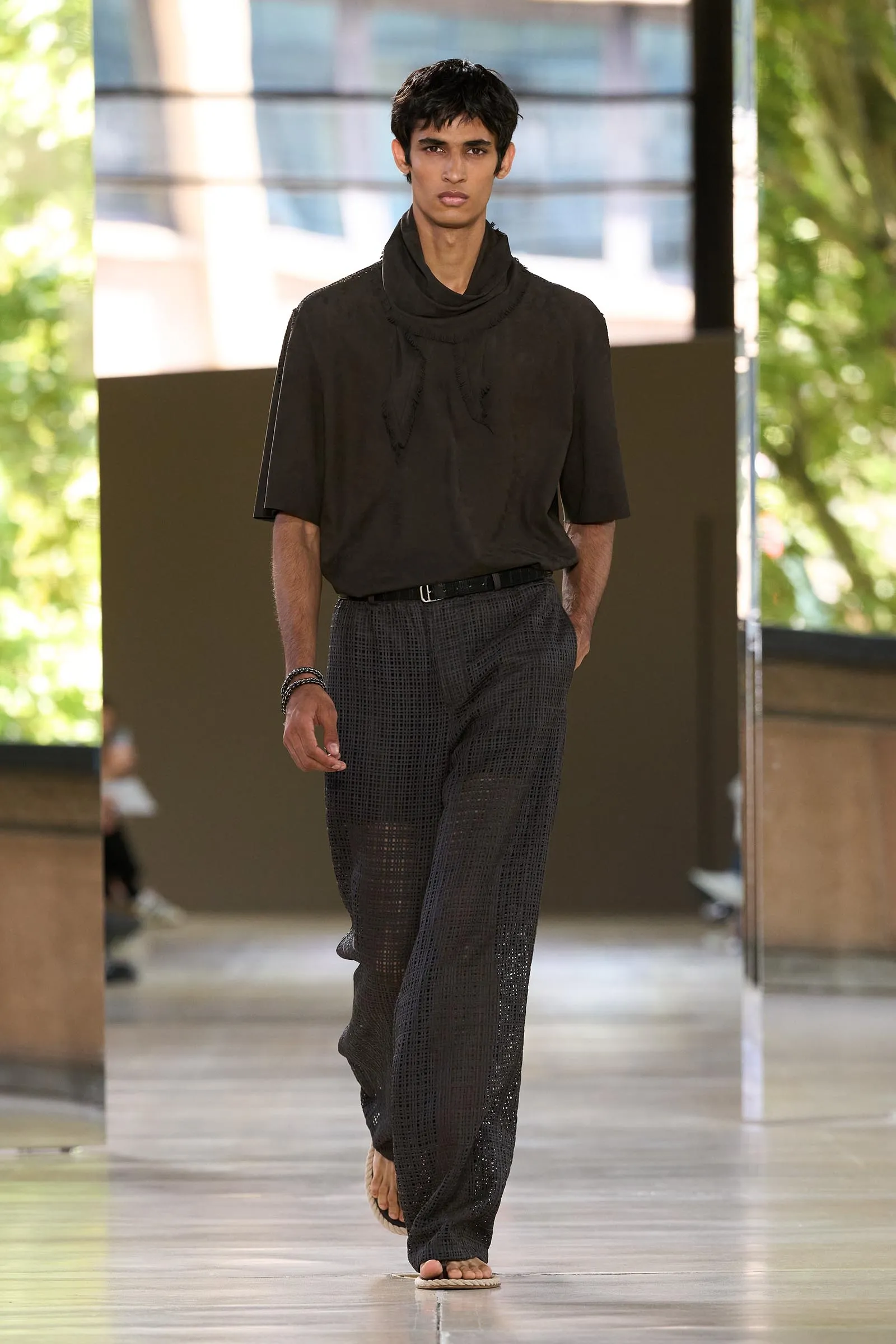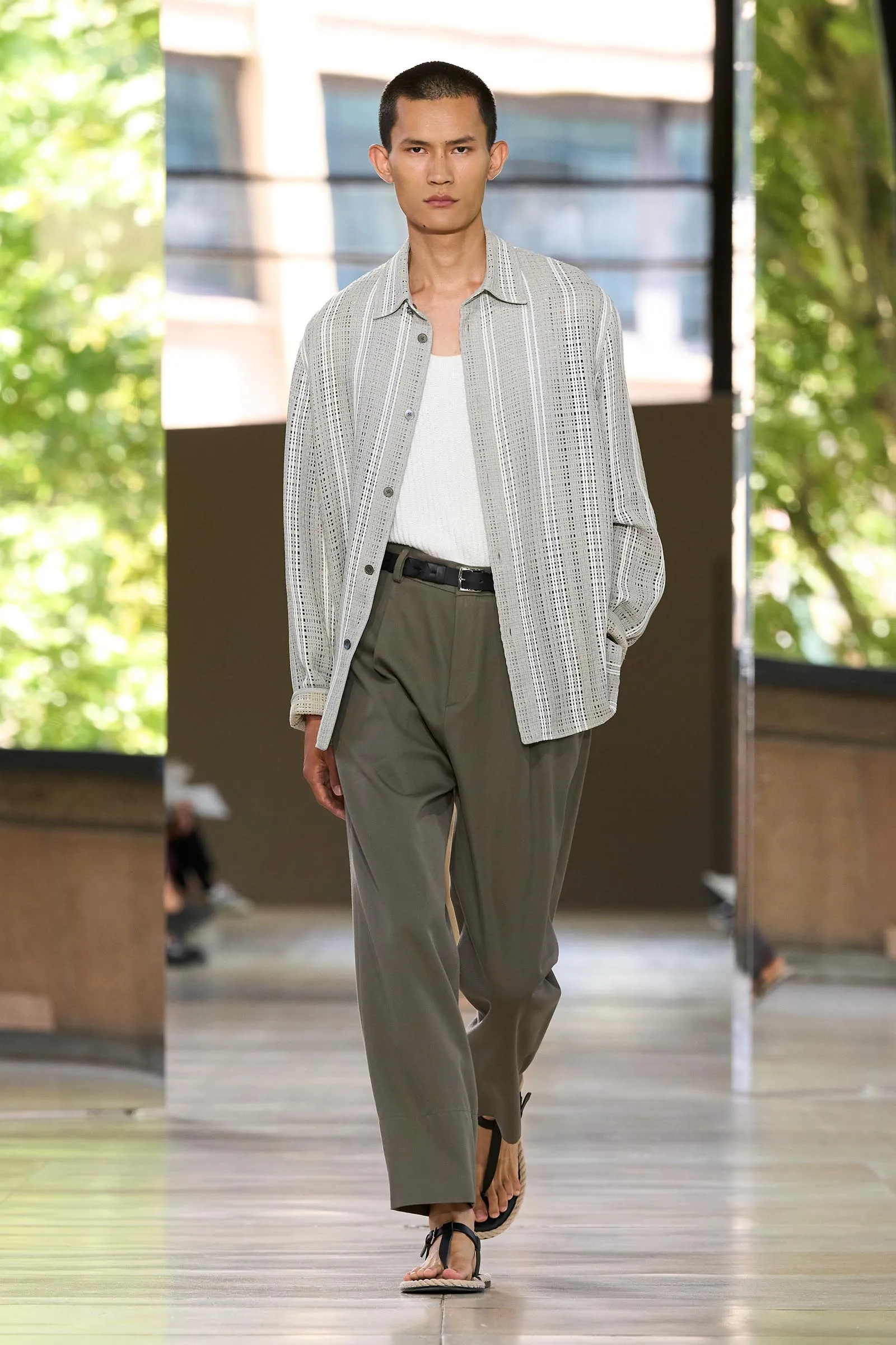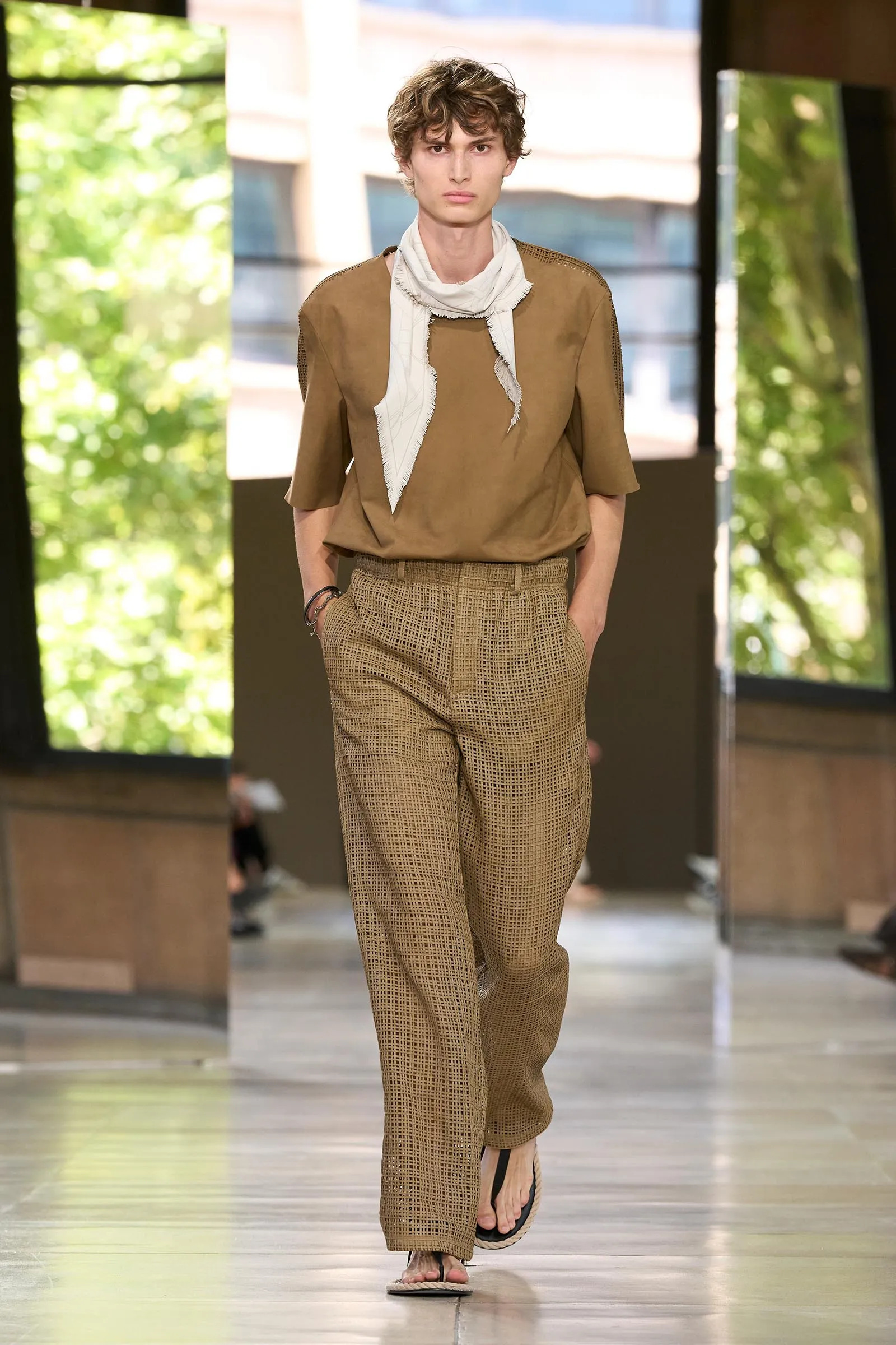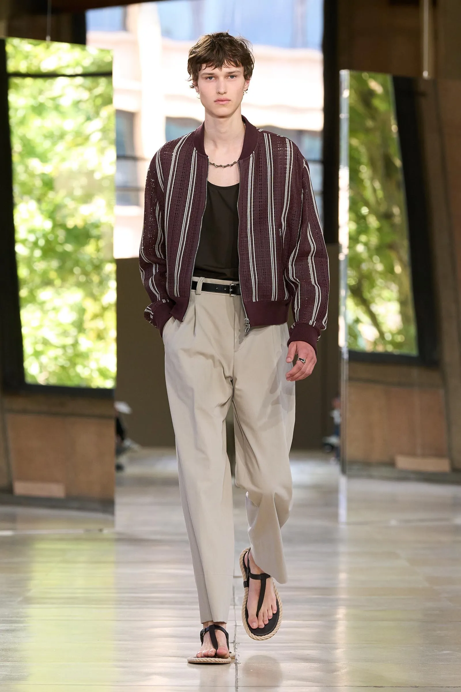 It was just a hint of what lay ahead. By Look 7, a summer bomber—at a distance in a khaki-gray stripe—was woven in strips of leather. There were similarly-ventilated cardigans, sleeveless tees and a shirt. Then, whole trousers seemed to made from the same lattice-work, though at this point you couldn’t tell whether it was loomed in something like lacquered raffia or rattan.