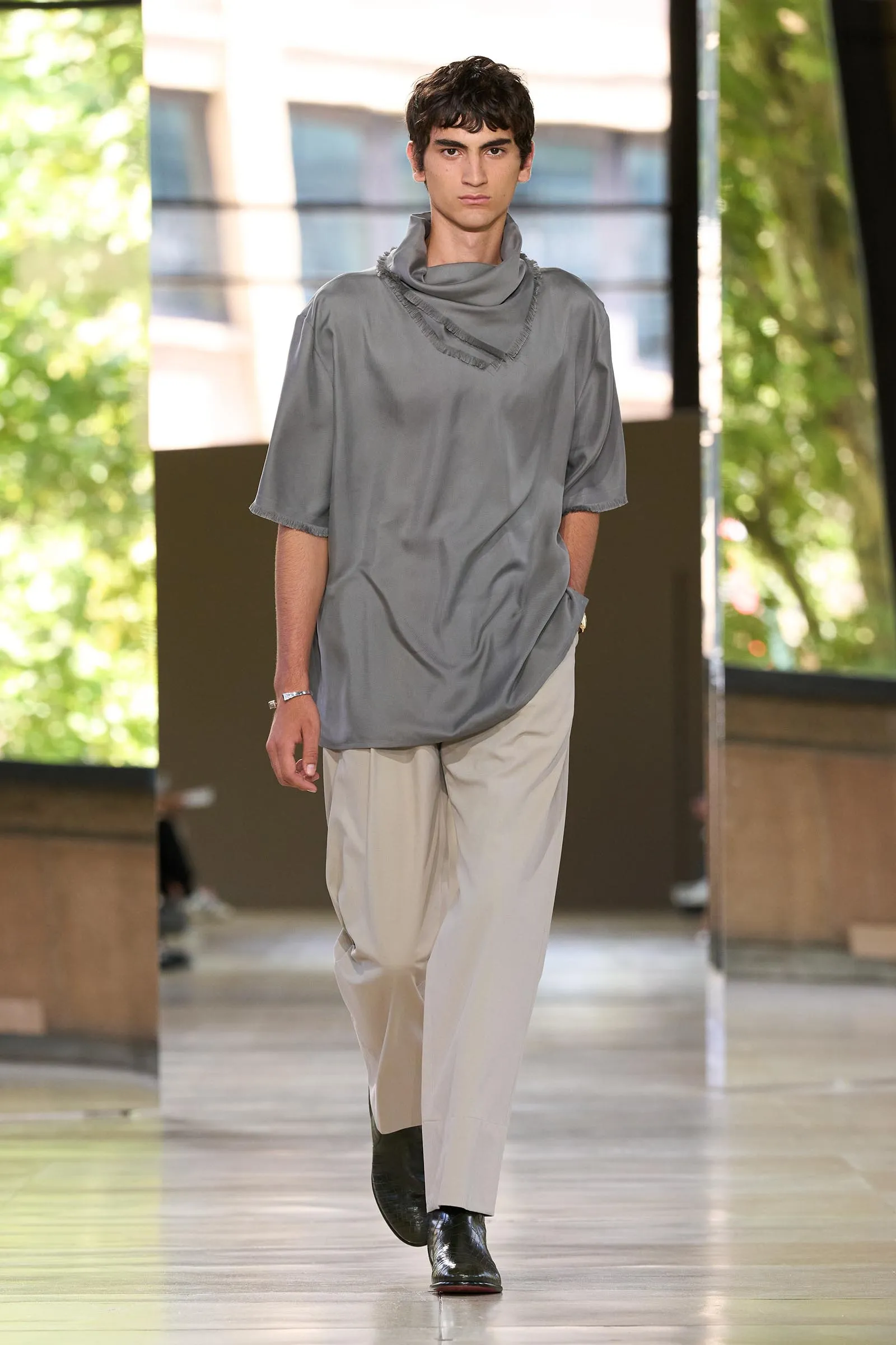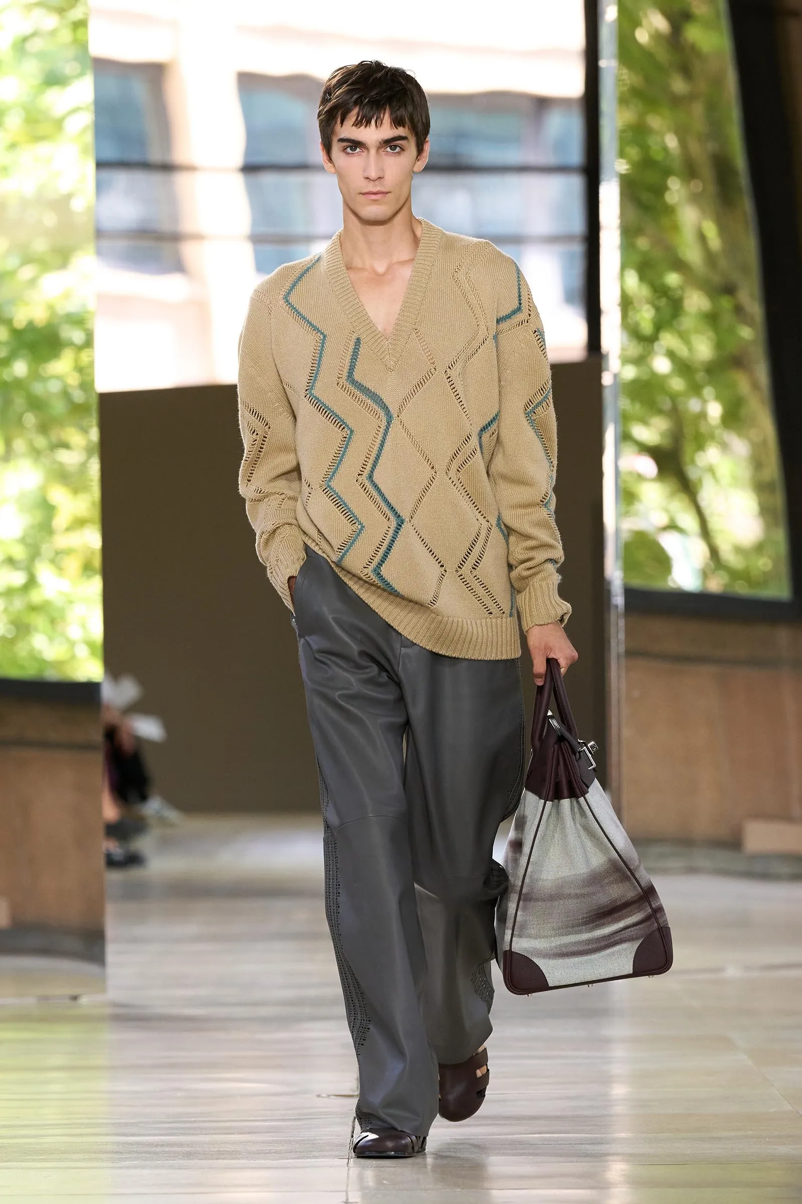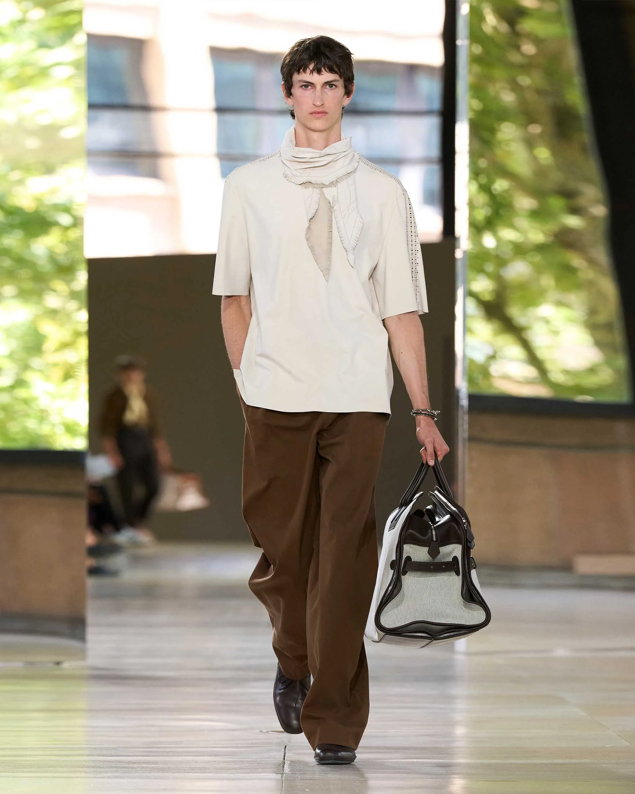 I know, I know. Complaining about the weather, as we’ve all been doing in reviews, is boring—but its relevance really does apply to all the clothes we’re viewing in this spring season. For Hermès, the problem of what to do with its fine leathers in summer was solved by Nichanian by, well, aerating them. The first look had a putty-colored leather T-shirt with a line of an open-weave technique running from outside sleeve to shoulder.