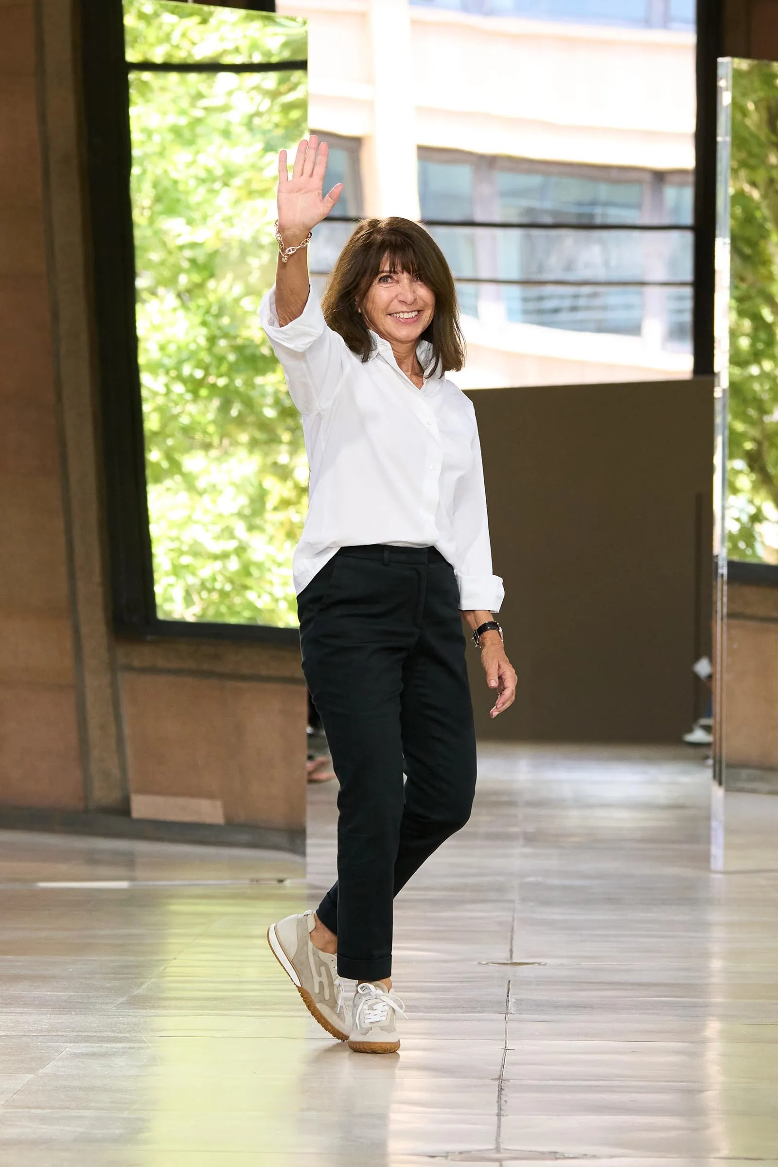 “Just a nice, cool guy in the city!” Véronique Nichanian shrugged cheerfully when asked the standard question about what she was thinking about with her spring Hermès show. Several hundred extremely hot guys were just streaming out of the show at the Place D’Iena having applauded her collection to the rafters. An intense June heatwave has pushed the temperature above 35 Celsius in Paris, and to lord knows what inside the non-air-conditioned spaces so many brands have chosen to show in. Hermès, at least, had kindly greeted us at the door with cold flannels with which to mop our brows.