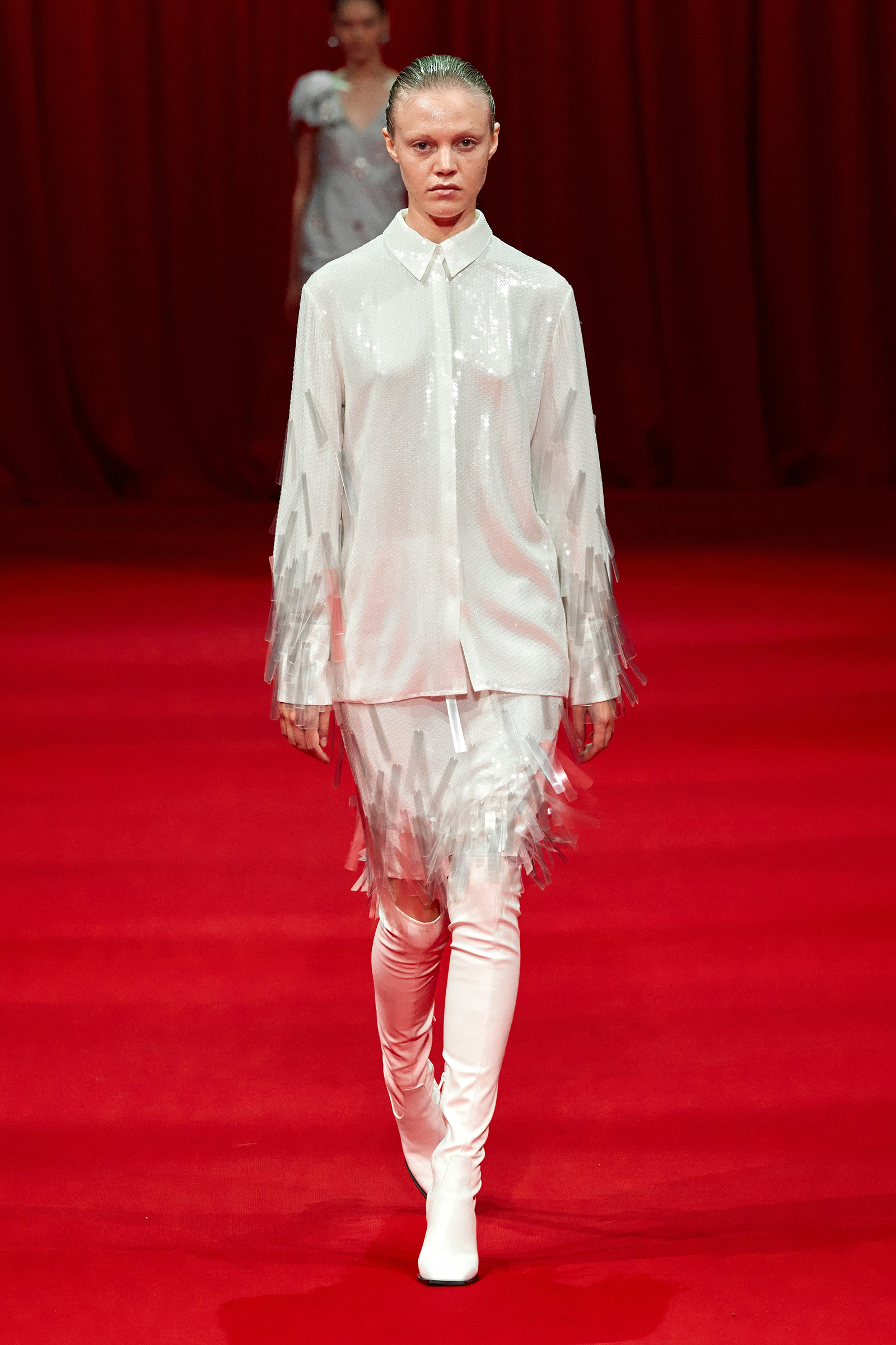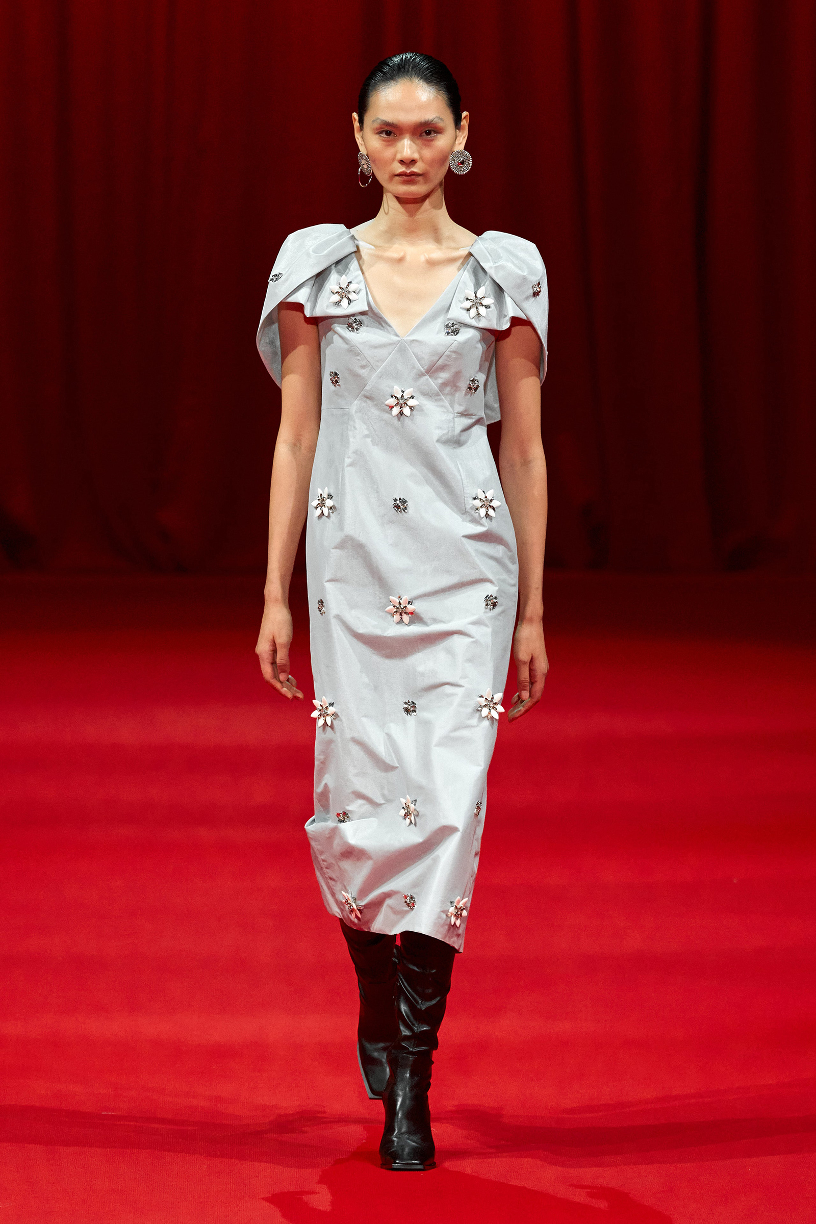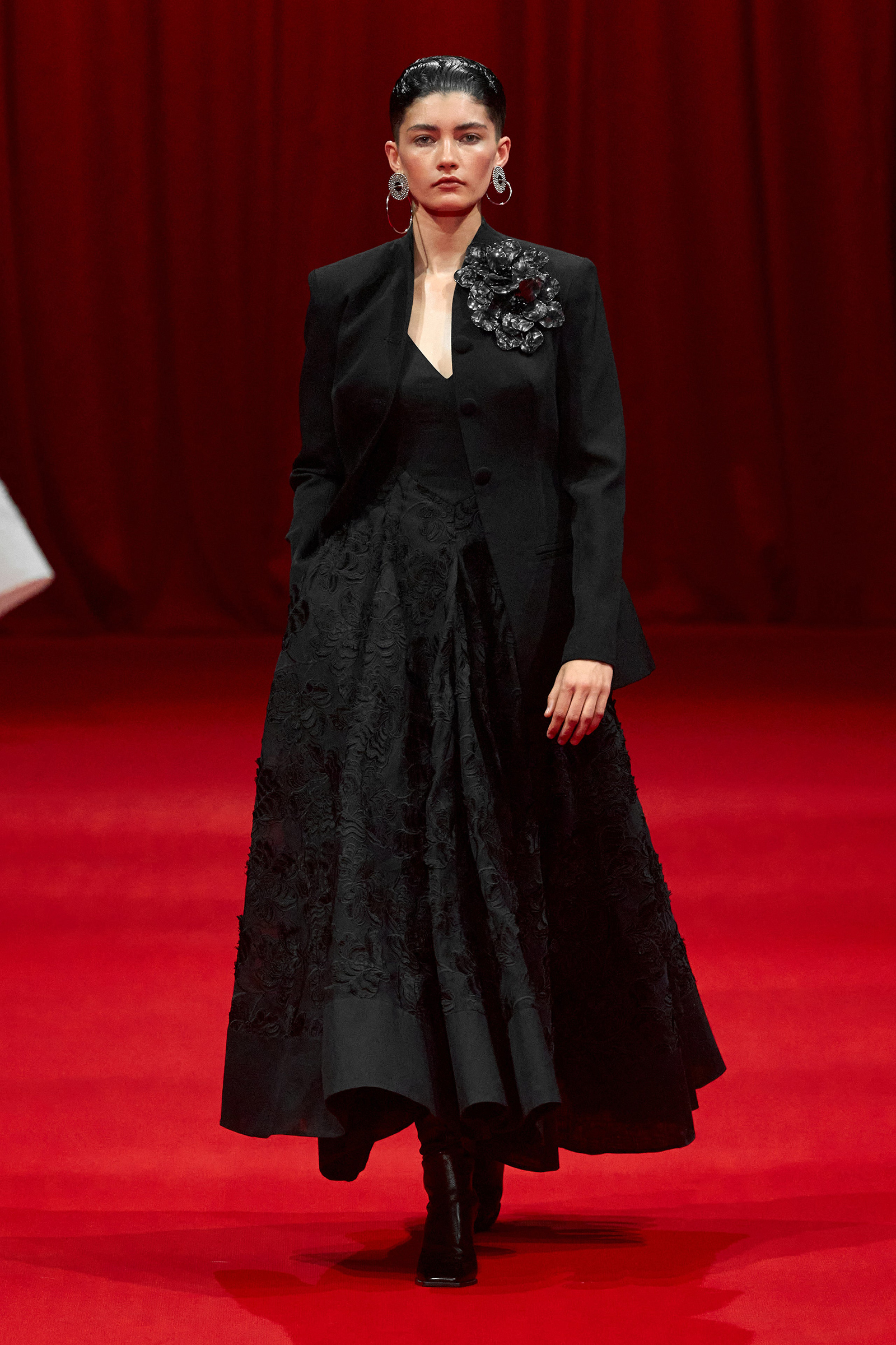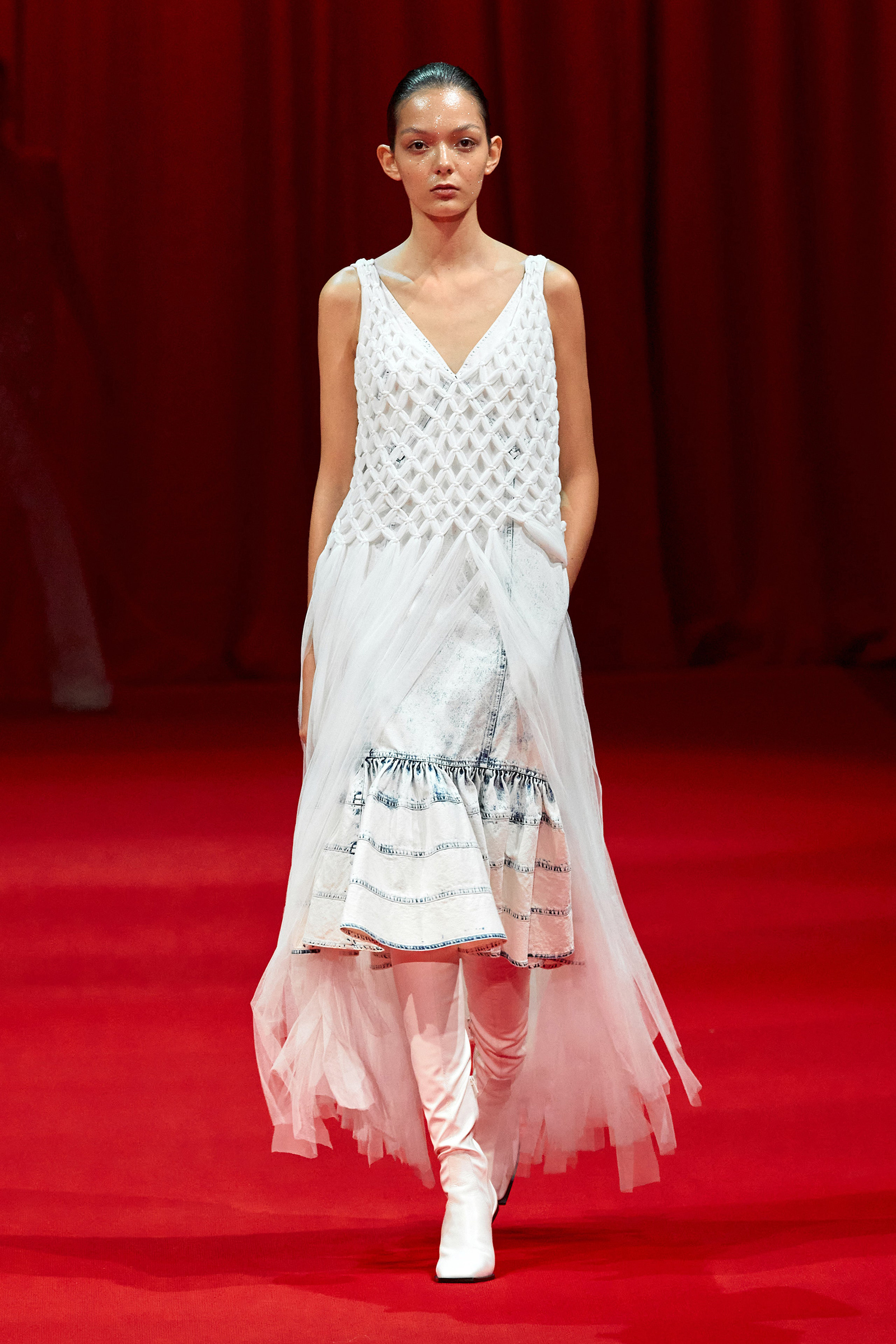 Building on the denim pieces he showed for fall, there was an emphasis, too, on daywear, a category that Zhang has been steadily expanding. White cotton shirts and pleated skirts trimmed with his signature sparkle opened the show, while louche suiting boasted added oomph thanks to trailing fringe at the jacket cuffs. (Zhang likes a trim, and many in the front row were wearing his tweed jackets frosted with pearls.) One of the best looks paired a heavily embroidered princess skirt with a tailored black jacket, perhaps a little nod to NYFW’s styling tic last week of matching studious tailored blazers with frivolous miniskirts.