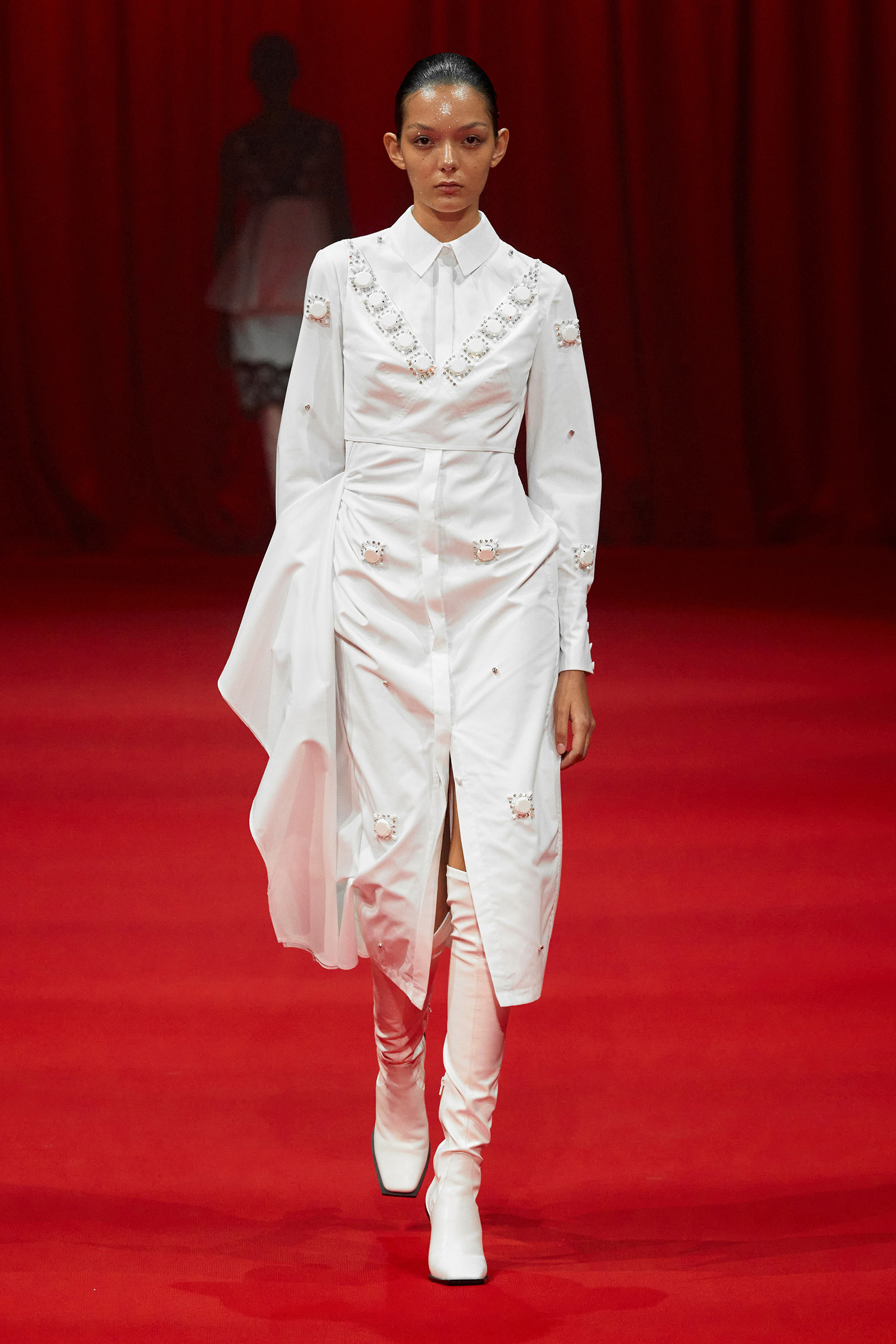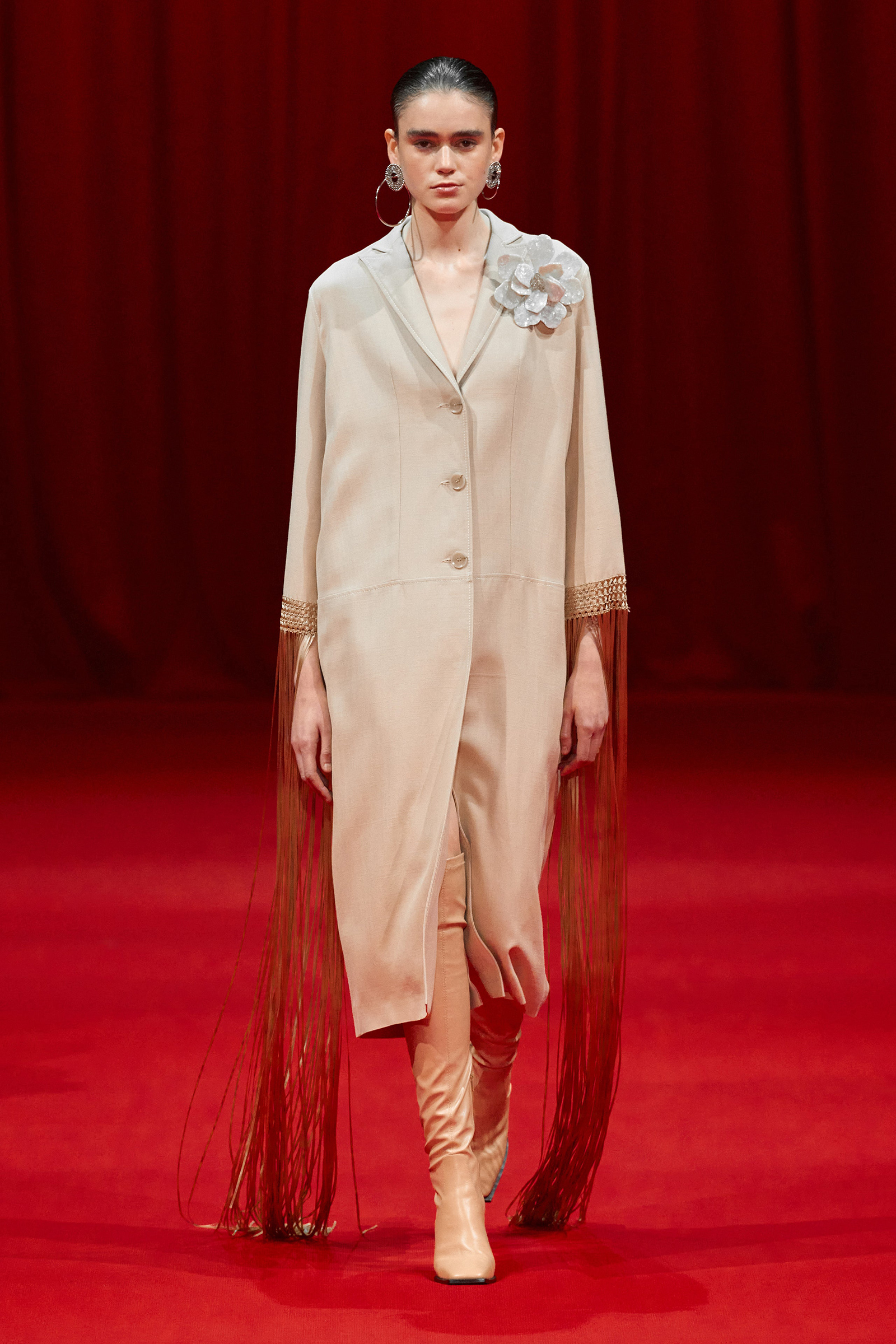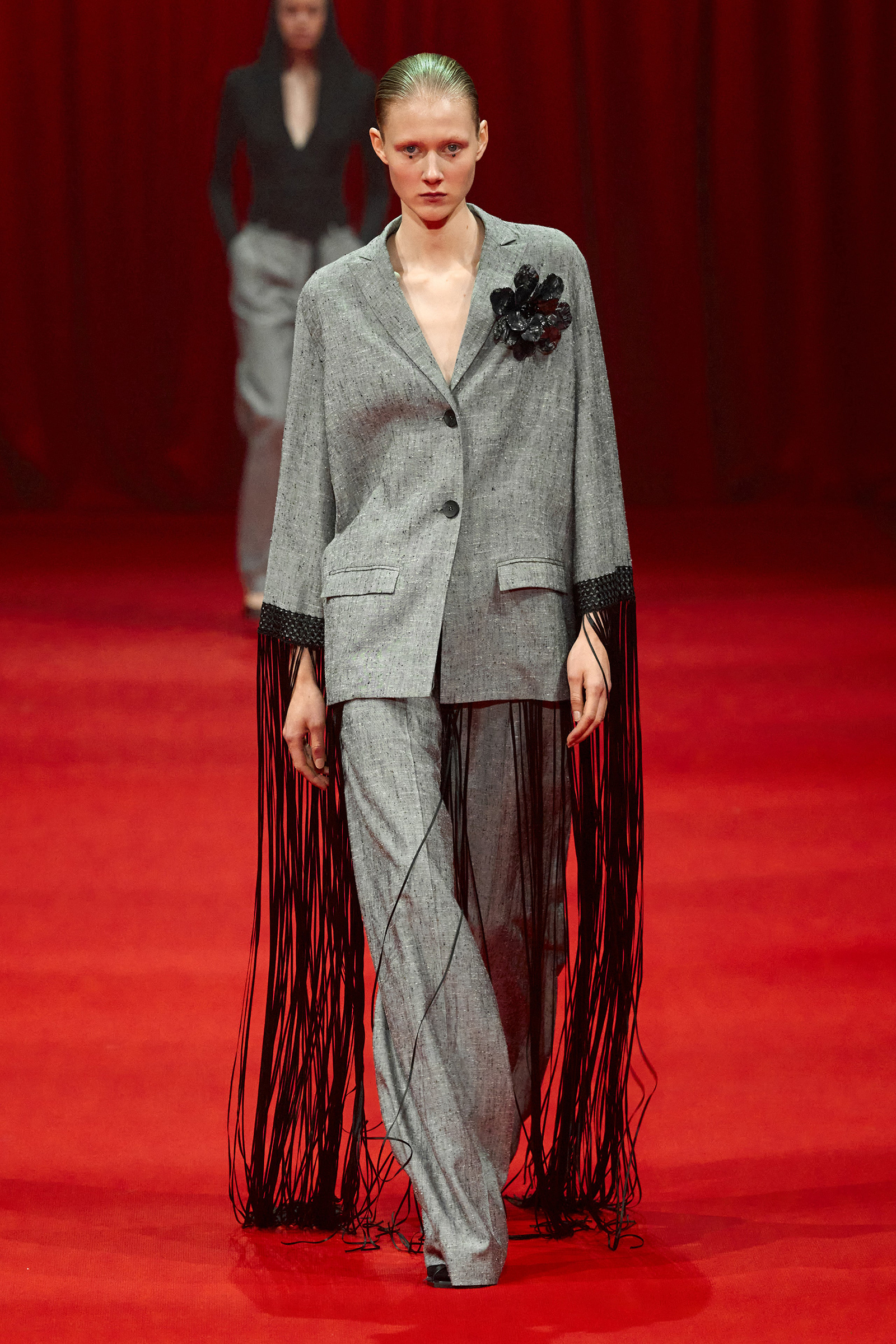 Building on the denim pieces he showed for fall, there was an emphasis, too, on daywear, a category that Zhang has been steadily expanding. White cotton shirts and pleated skirts trimmed with his signature sparkle opened the show, while louche suiting boasted added oomph thanks to trailing fringe at the jacket cuffs. (Zhang likes a trim, and many in the front row were wearing his tweed jackets frosted with pearls.) One of the best looks paired a heavily embroidered princess skirt with a tailored black jacket, perhaps a little nod to NYFW’s styling tic last week of matching studious tailored blazers with frivolous miniskirts.