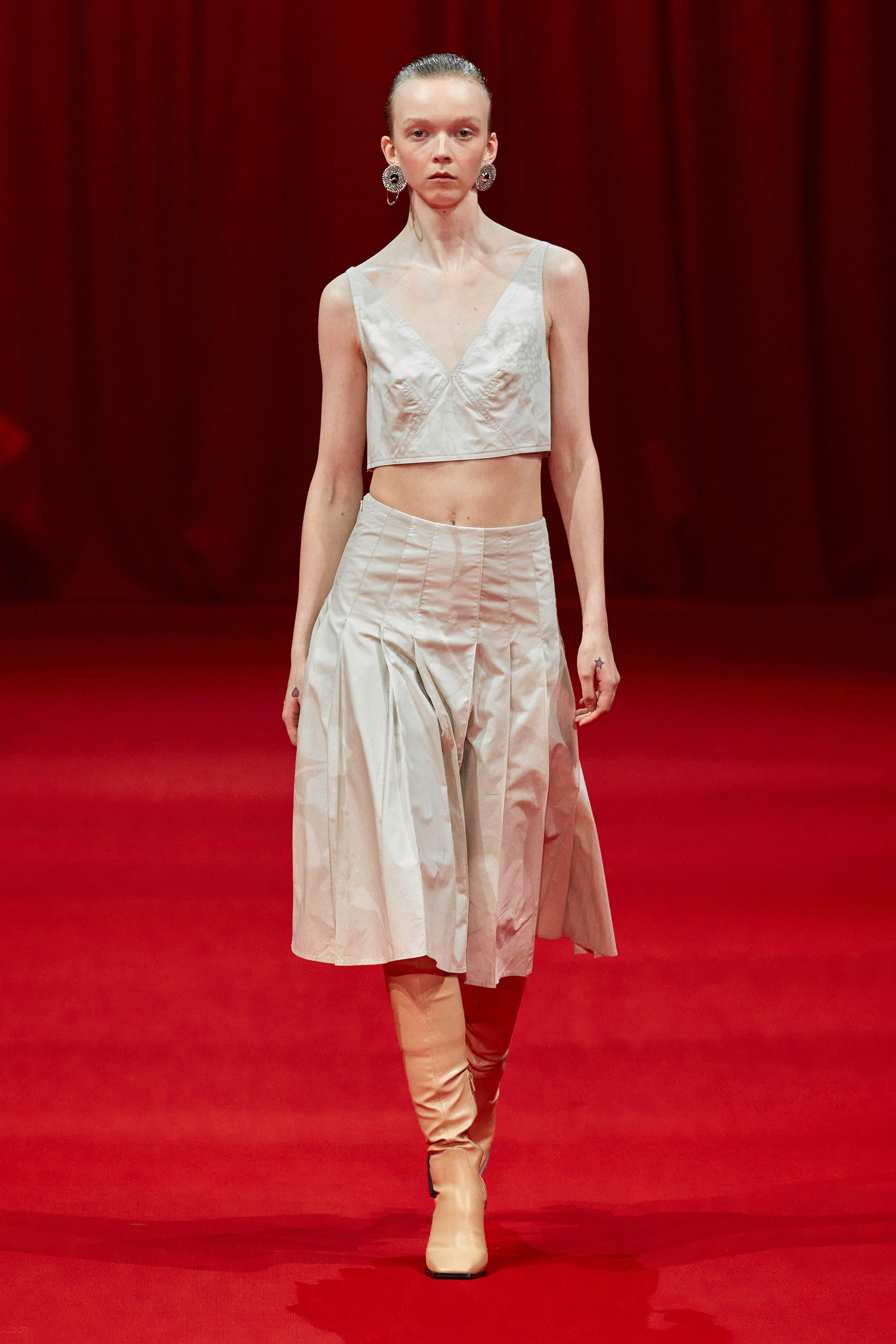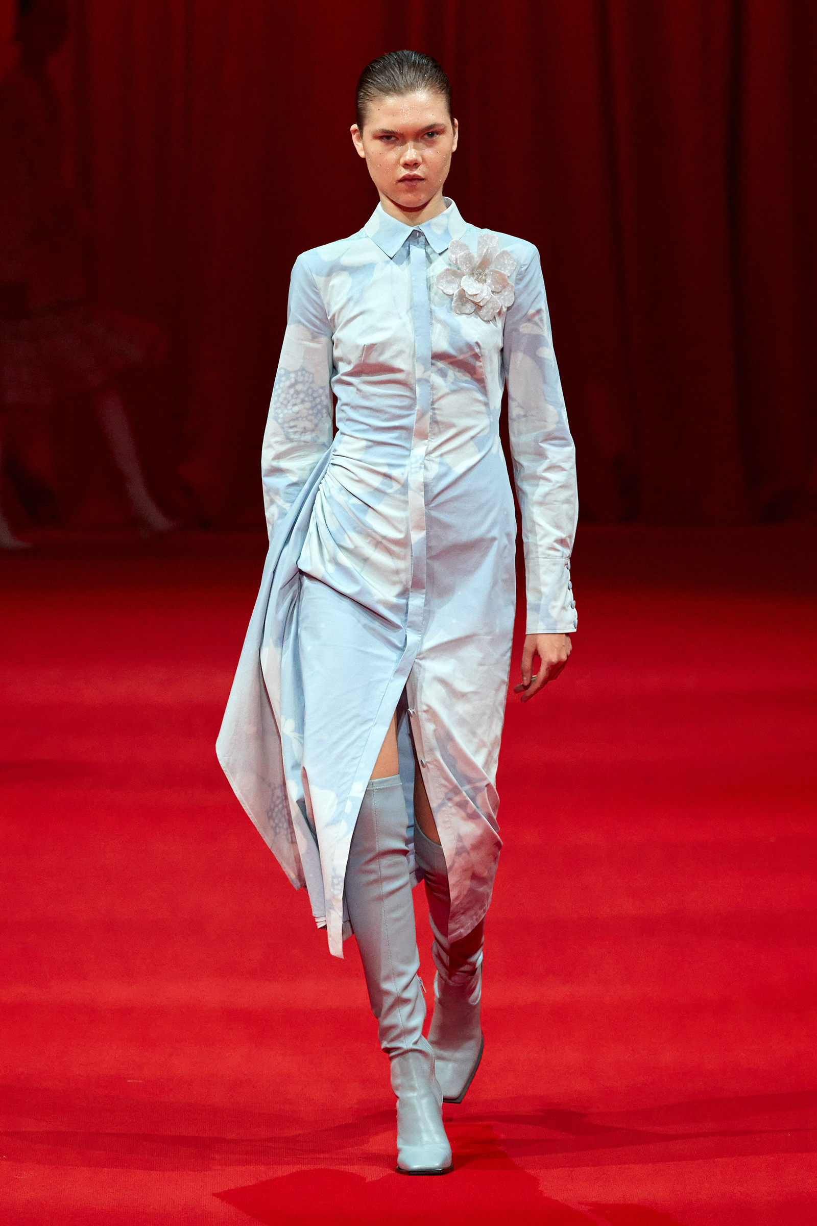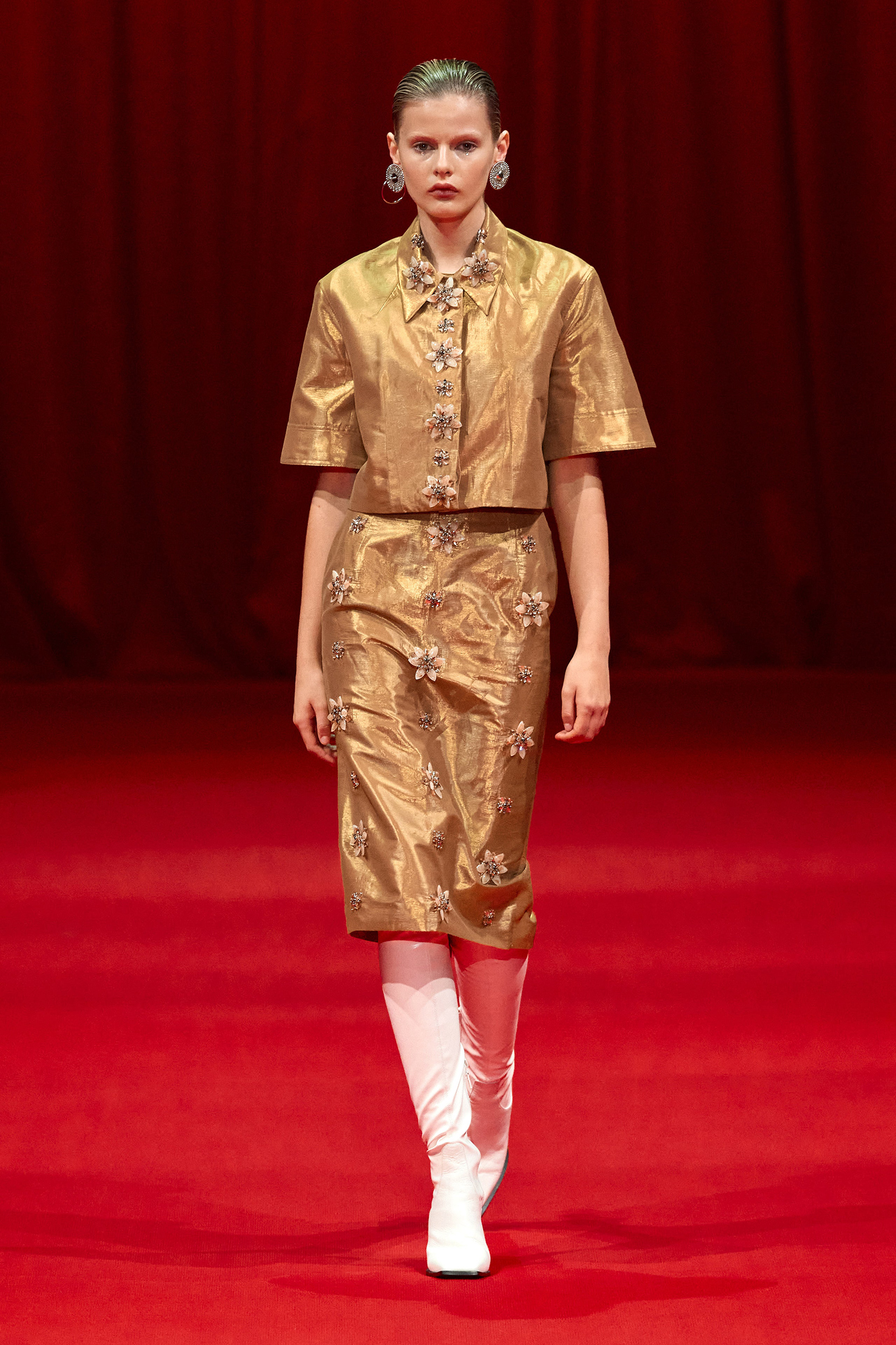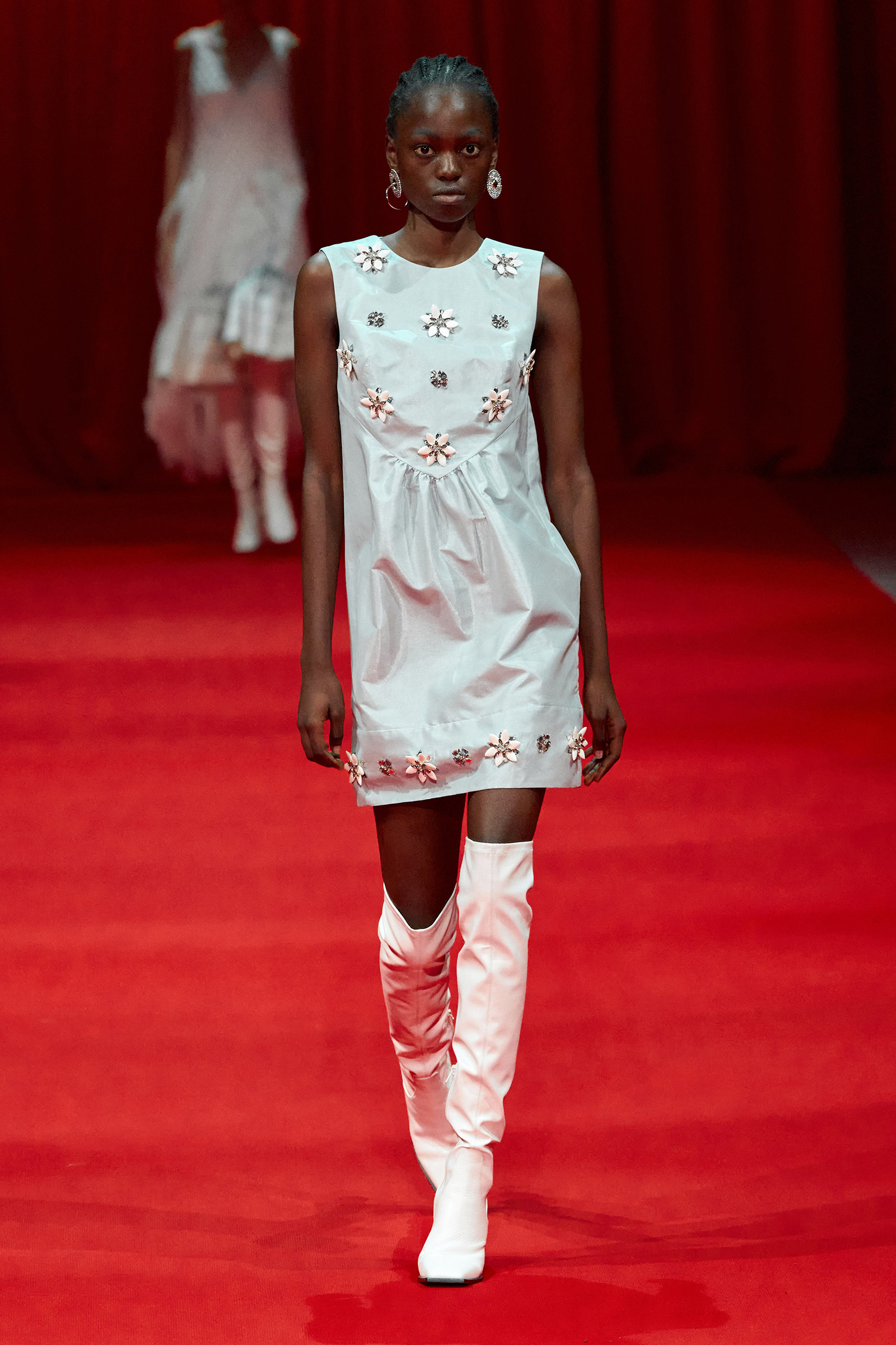 Building on the denim pieces he showed for fall, there was an emphasis, too, on daywear, a category that Zhang has been steadily expanding. White cotton shirts and pleated skirts trimmed with his signature sparkle opened the show, while louche suiting boasted added oomph thanks to trailing fringe at the jacket cuffs. (Zhang likes a trim, and many in the front row were wearing his tweed jackets frosted with pearls.) One of the best looks paired a heavily embroidered princess skirt with a tailored black jacket, perhaps a little nod to NYFW’s styling tic last week of matching studious tailored blazers with frivolous miniskirts.