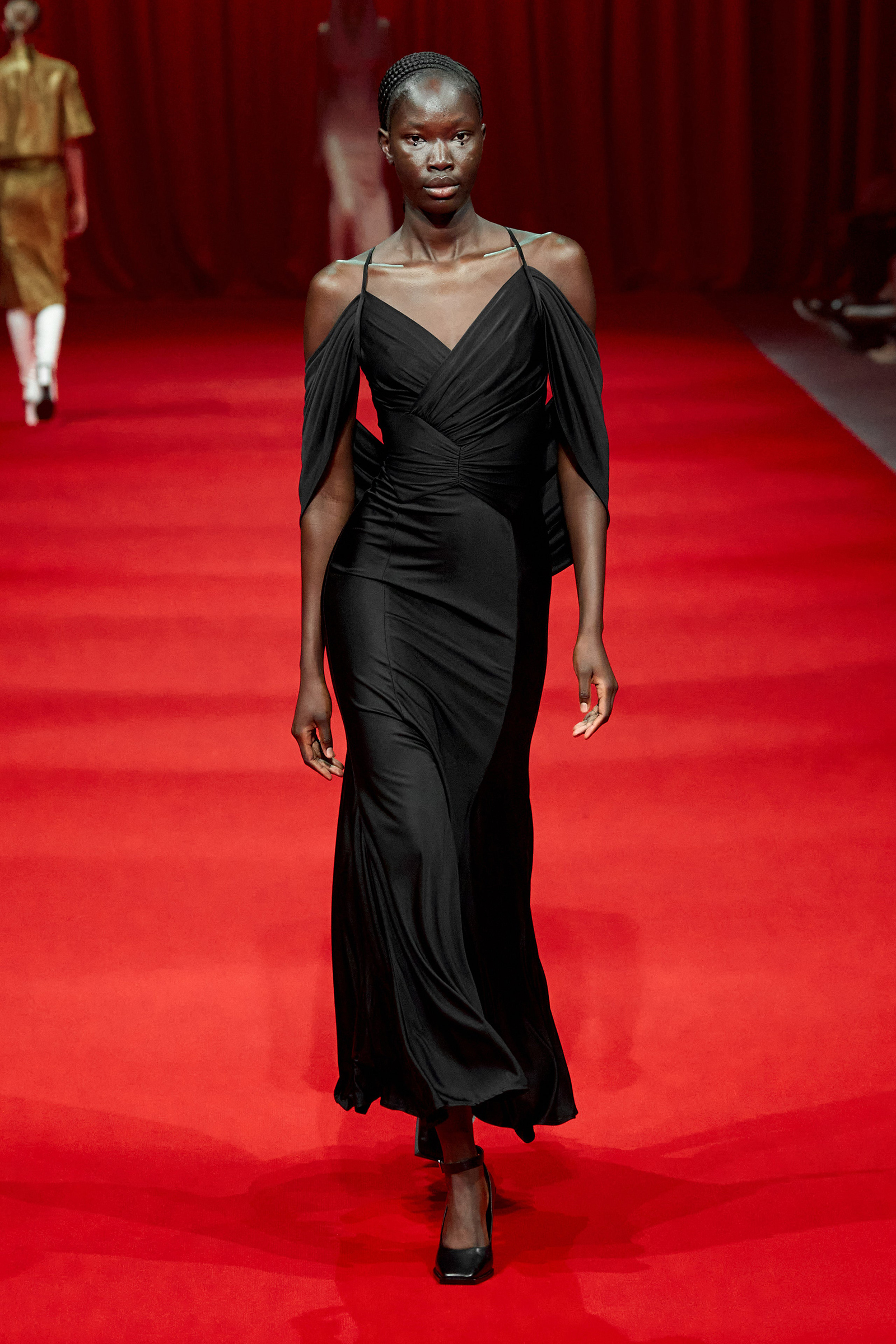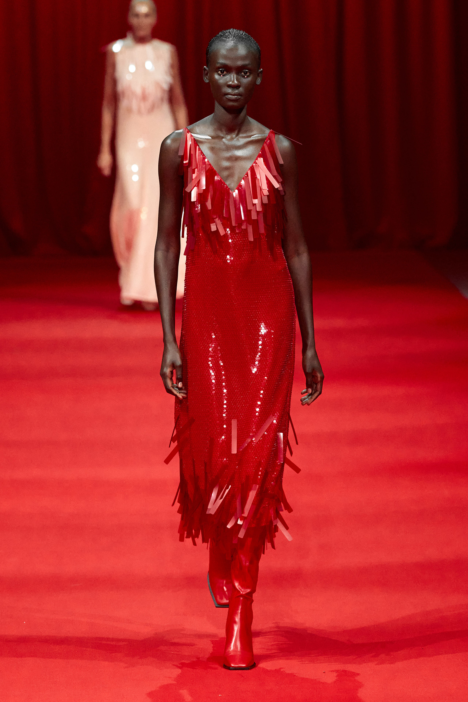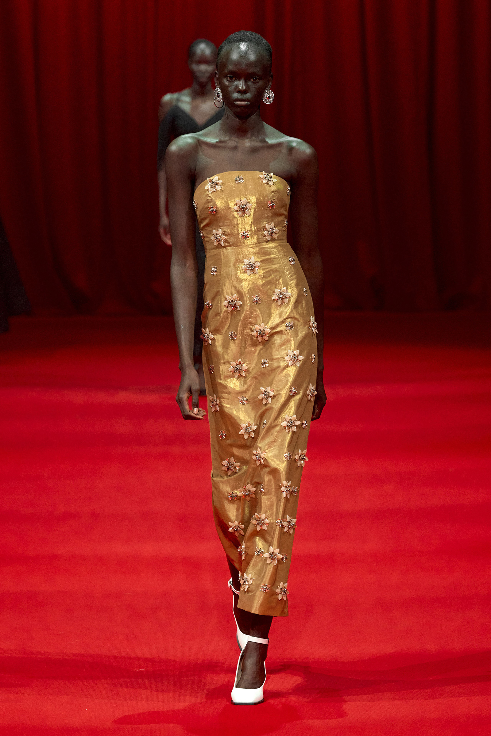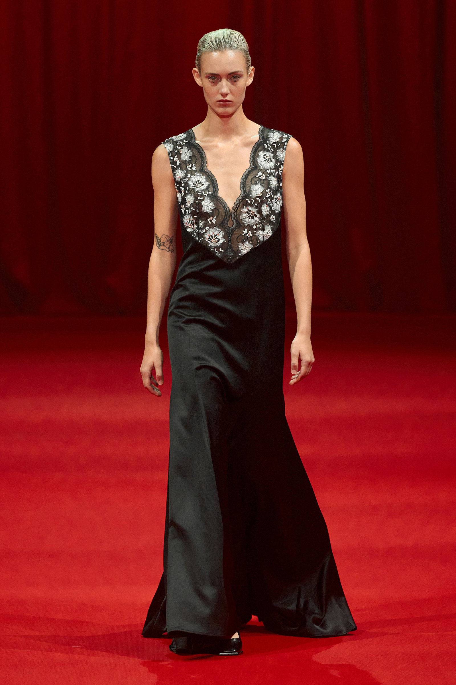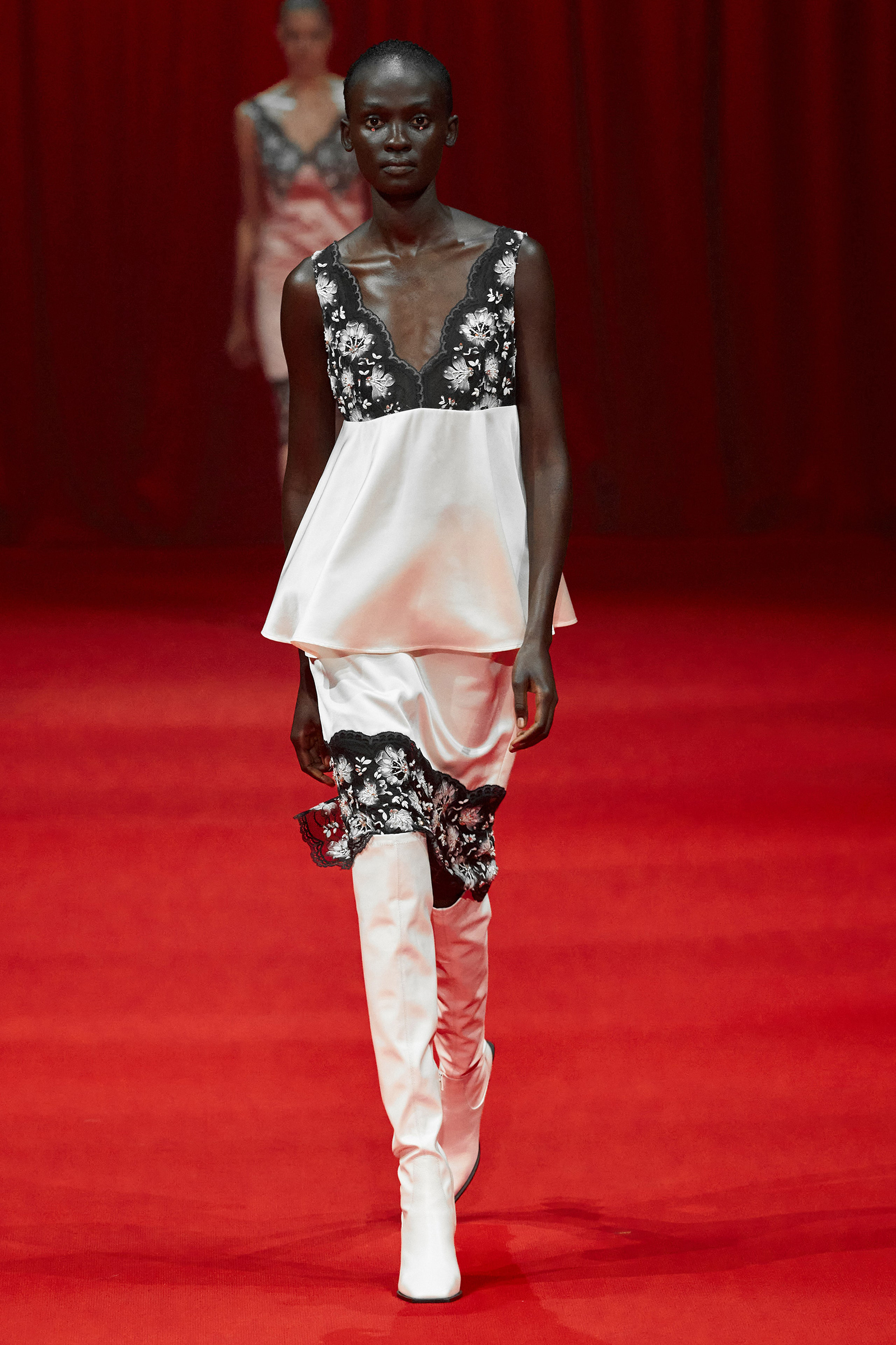 Today’s show was a chance for Zhang to experiment with lightness and fluidity while turning out the carefully crafted, delicate eveningwear and sugary daywear he’s known for. Energized by a screening of Luca Guadagnino’s Suspiria, as well as by the striking movement of German choreographer and dancer Pina Bausch, he had raw emotion on the brain. “This season is about the woman who can so freely express herself,” he said. This manifested in supersoft silk jersey dresses in shades of ballet pink and black, in paillette dresses made to swing as they walked, in silk slip dresses trimmed with lace that had been hand-painted in Italy and hand-embroidered with beads and jewels in India (lace is shaping up to be a “thing” for spring).