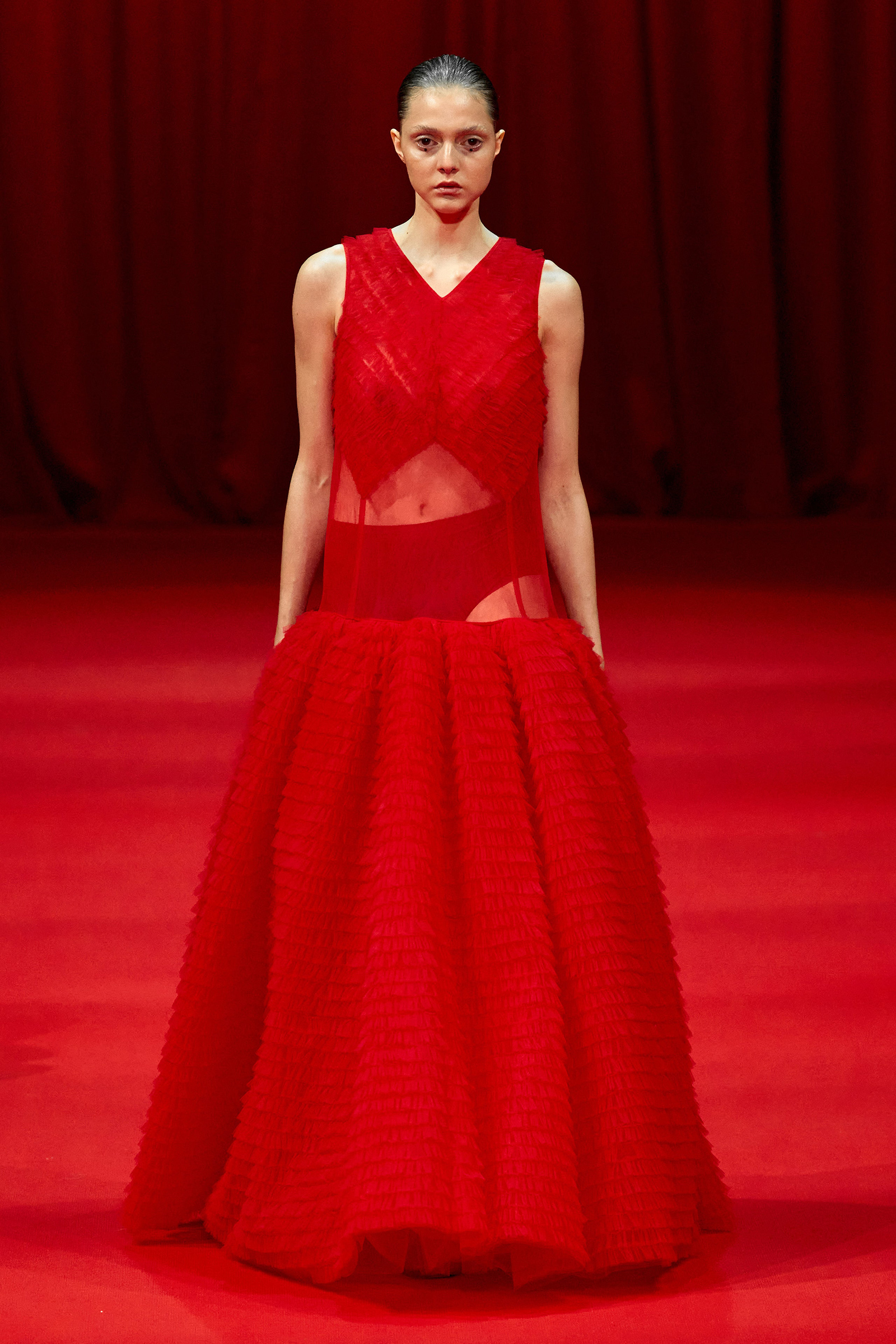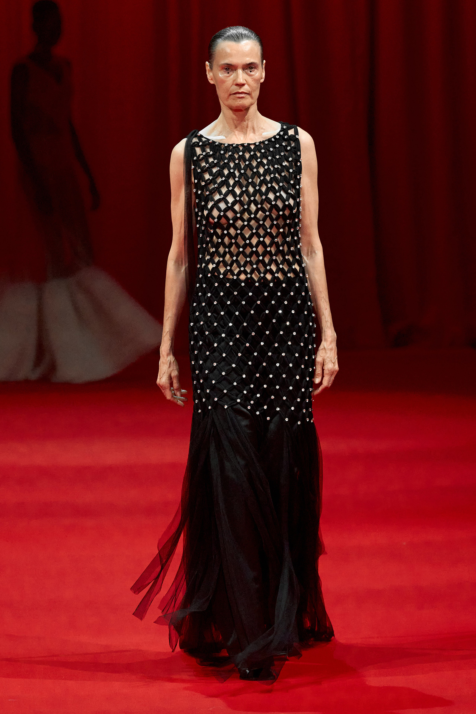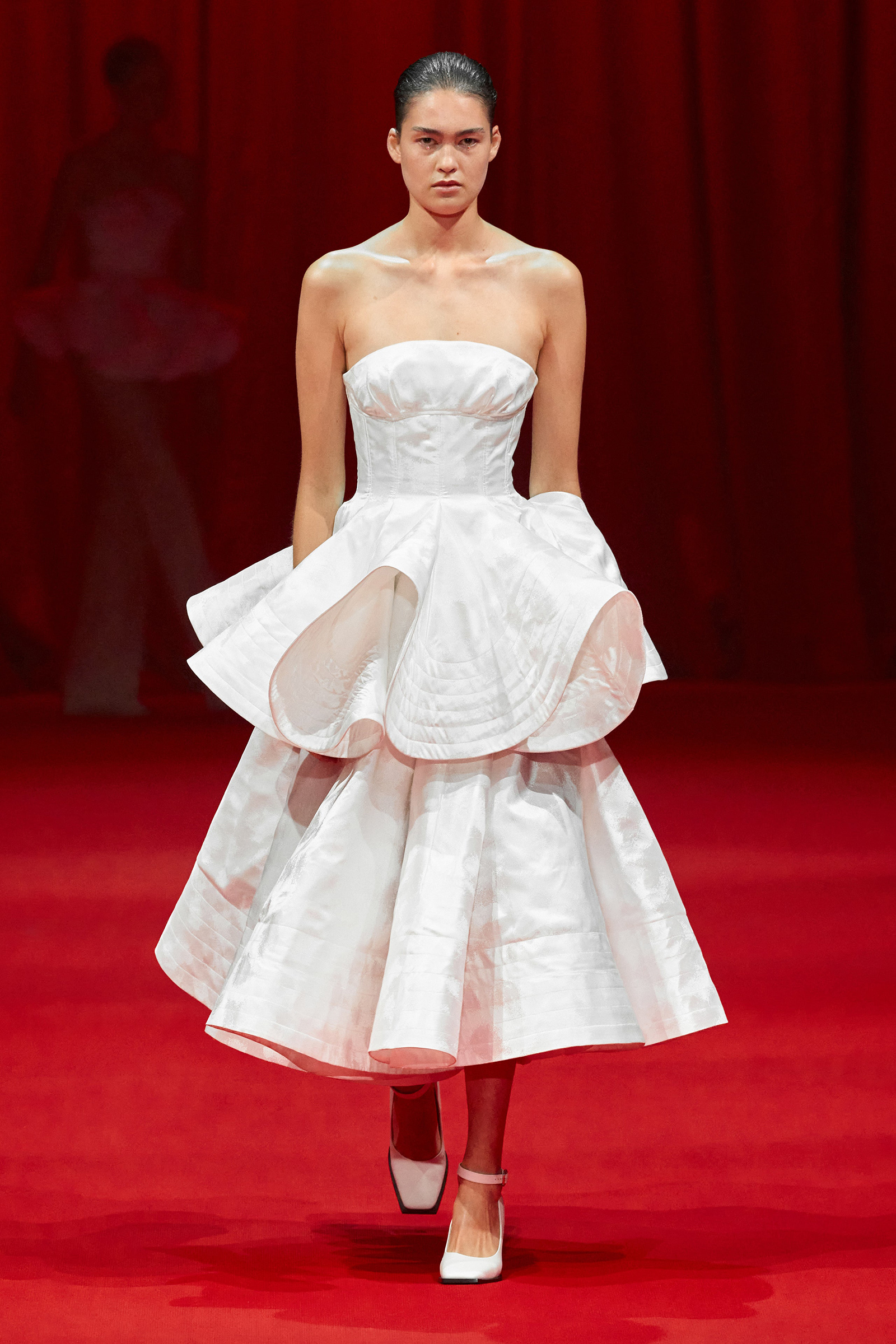 Still, it was the evening dresses that delighted, particularly the two crocheted tulle tunics embellished with rhinestones and layered over long skirts that could have closed the show. Backstage, Zhang showed how the most sylphlike of pieces had been secured on a base of grosgrain ribbons or immaculately lined, with zippers covered with topstitching to ensure they sat perfectly flat. With other designers cutting corners, presumably in a bid to maintain margins, Zhang’s dedication to echoing the couture studio’s petites mains mantra that the inside of a garment should look as beautiful as the outside is admirable—and will ensure his clients keep coming back for more loveliness.