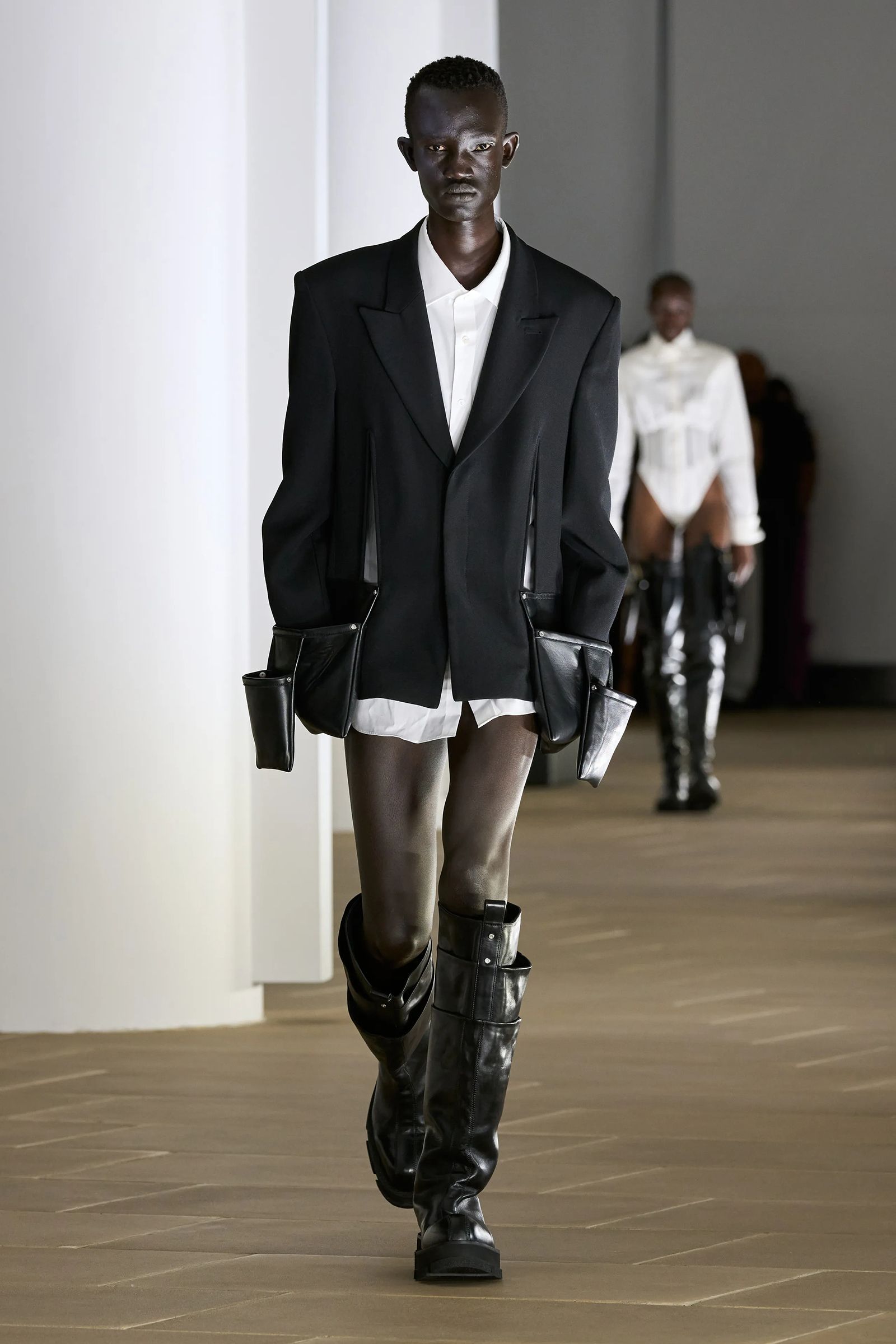 The white button-down-and-bodysuit hybrid had wrenches on top of the boning that shaped its corseted torso. That same model wore thigh-high boots with integrated tool belts. The look prior was a tailored jacket with its seams slashed to hold another belt in lieu of pockets, and the show’s opener consisted of a tailored jacket worn over a white shirt with metal bars placed over two of its seams. You surely know the drill by now: Officewear, tools…we could call it workwear had the name not already been claimed.