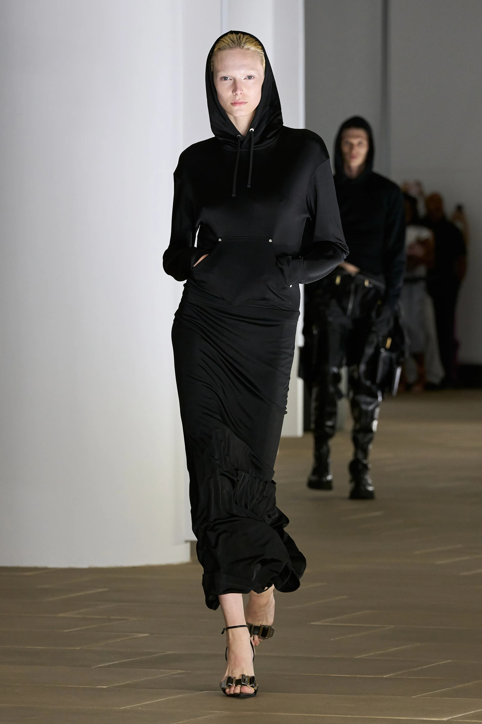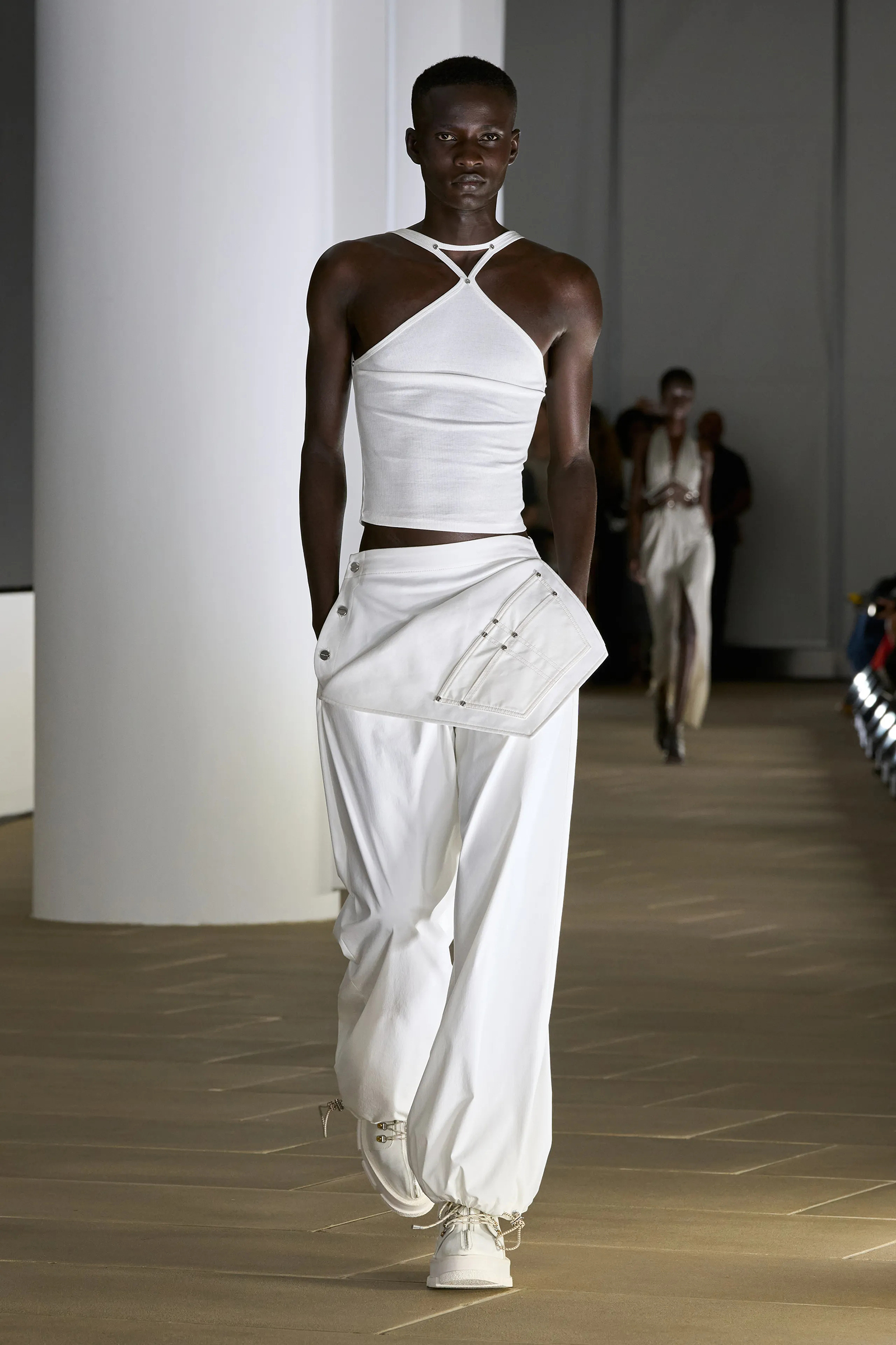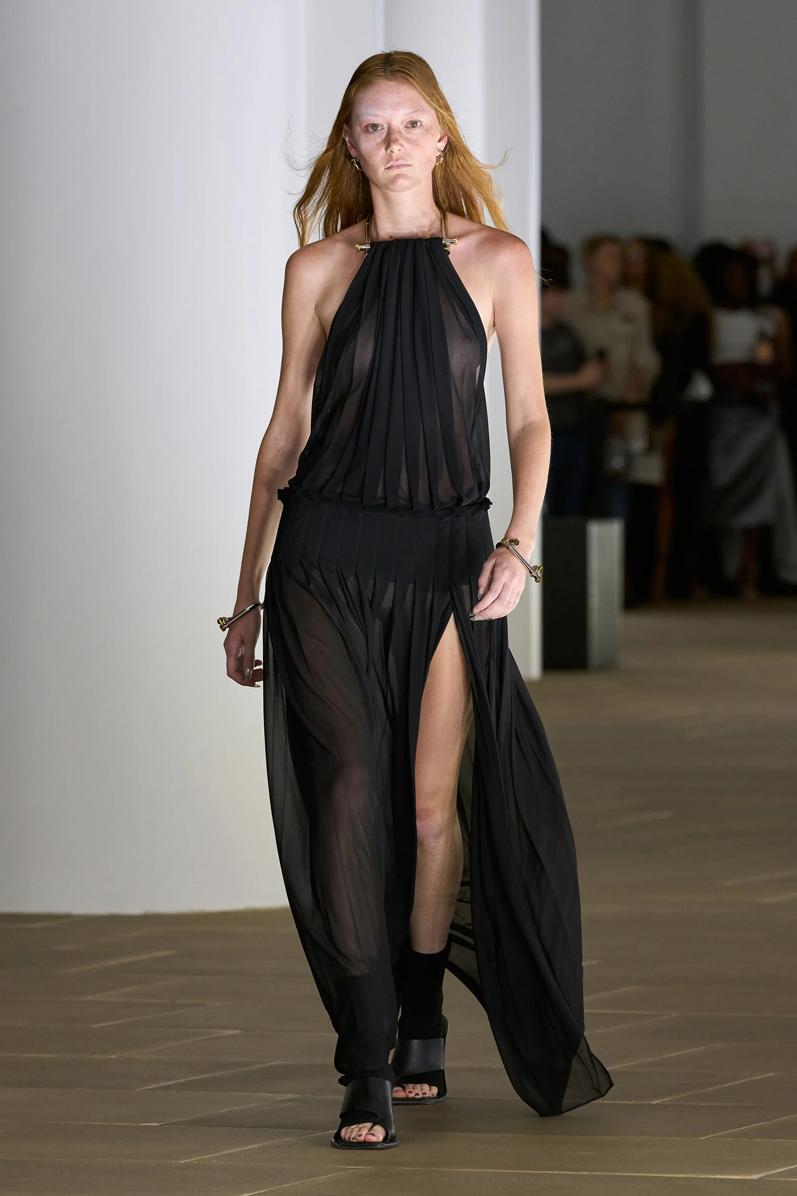 Lee said he started playing with power cords as a way to drape for his fall campaign, which carried over into this collection in the shape of shirring details by way of bungee cords. Particularly fun was a pair of trousers that had its back label replaced with an outlet; the model walked down the runway plugged in, carrying his coiled orange cord as a shoulder bag. The designer also used screwheads in lieu of studs across, turned suede work boots into tiny corsets, applied lacing detail to bottoms, and draped beautifully airy dresses, some with pin-tuck details around jewelry in the shape of screws. A piece he particularly nailed was the closing look, a crepe frock draped and ruched around an anatomically shaped structure at the abdomen. What the dress looks and feels like while sitting down is the real question, but it’s not the kind of dress you wear to sit down in anyway.