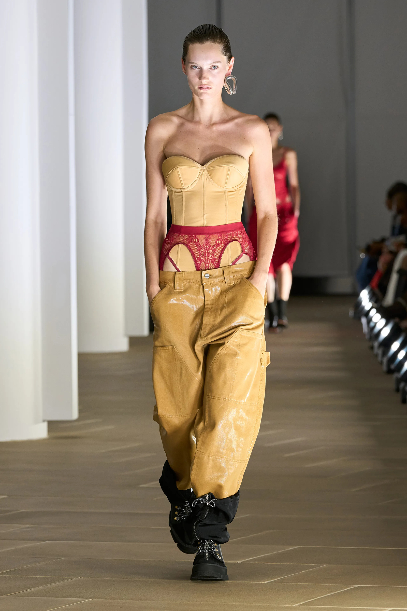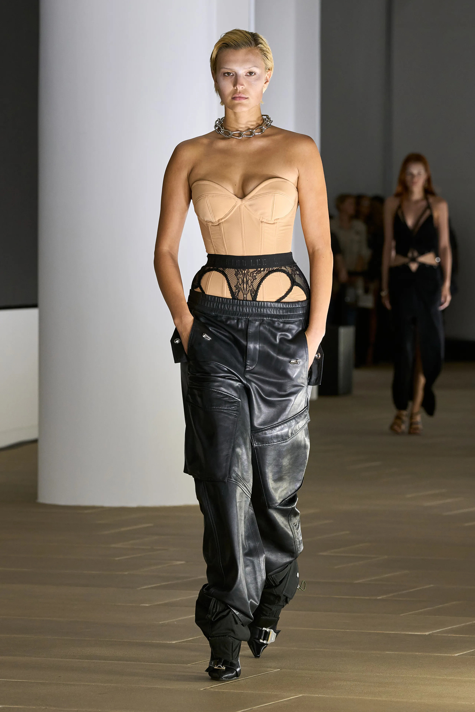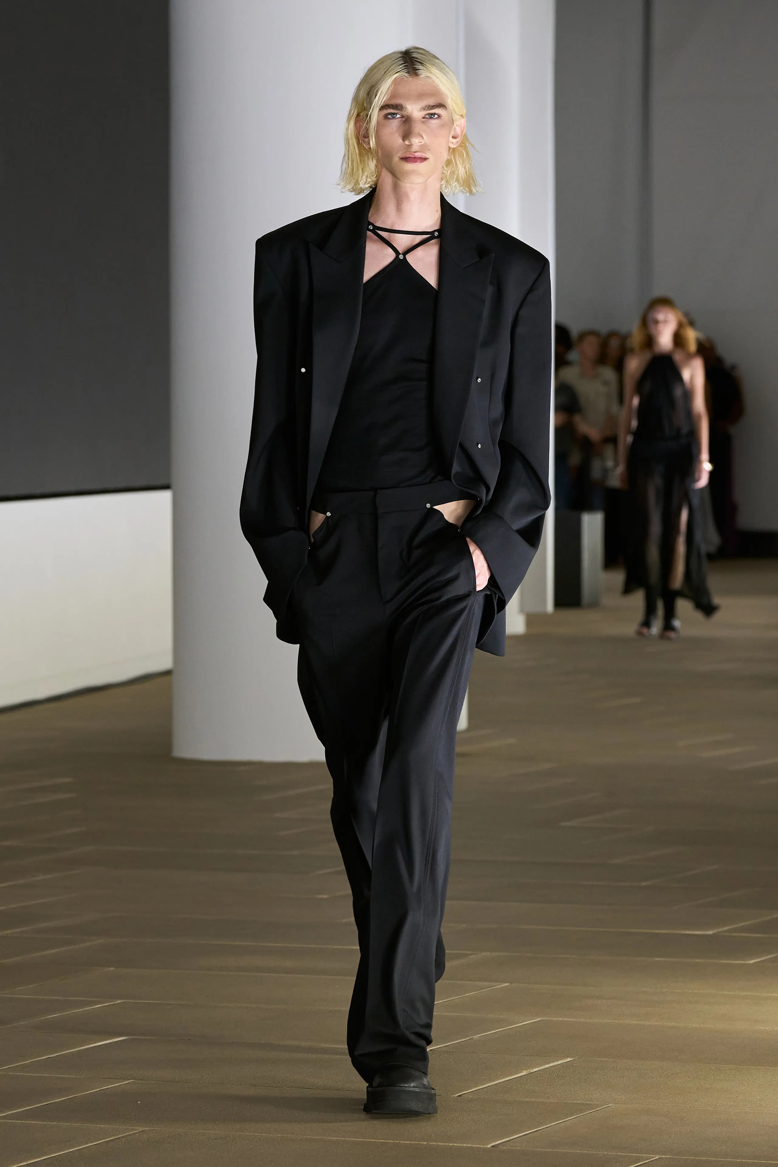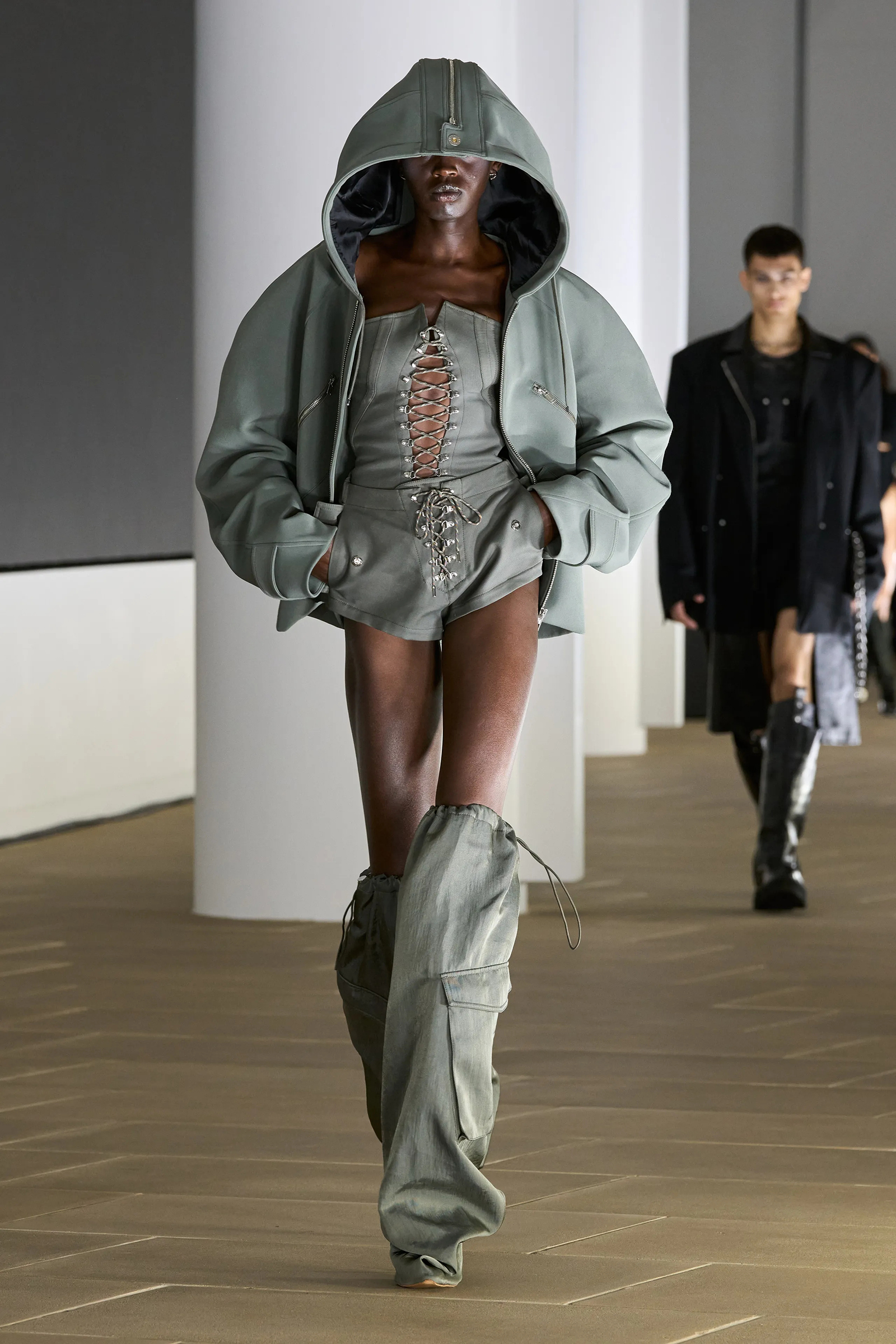 Another development: Lee stepped away from his usual monochromatic palette and strict category groupings to “mix things in a bit more.” The goal, he said, was to offer an “exaggerated brand wardrobe.” That is the operative word here, wardrobe—the truth is that it’s become reductive to label Lee’s clothes as nothing other than rave-ready. That they are, and they will continue to be, but he also gave his customers options past a night out. Dion Lee has a few more tools in his toolbox.