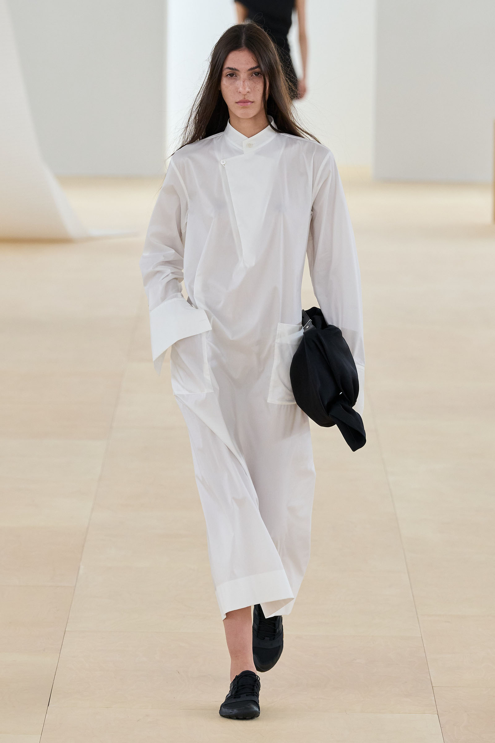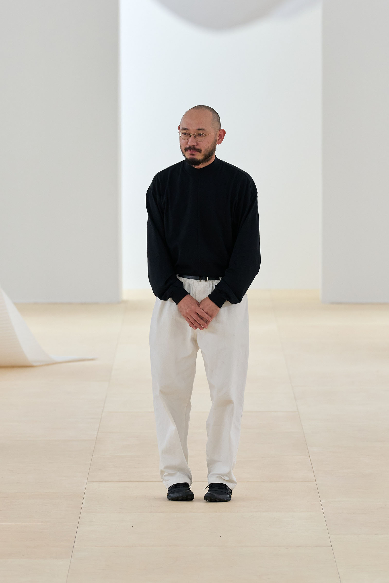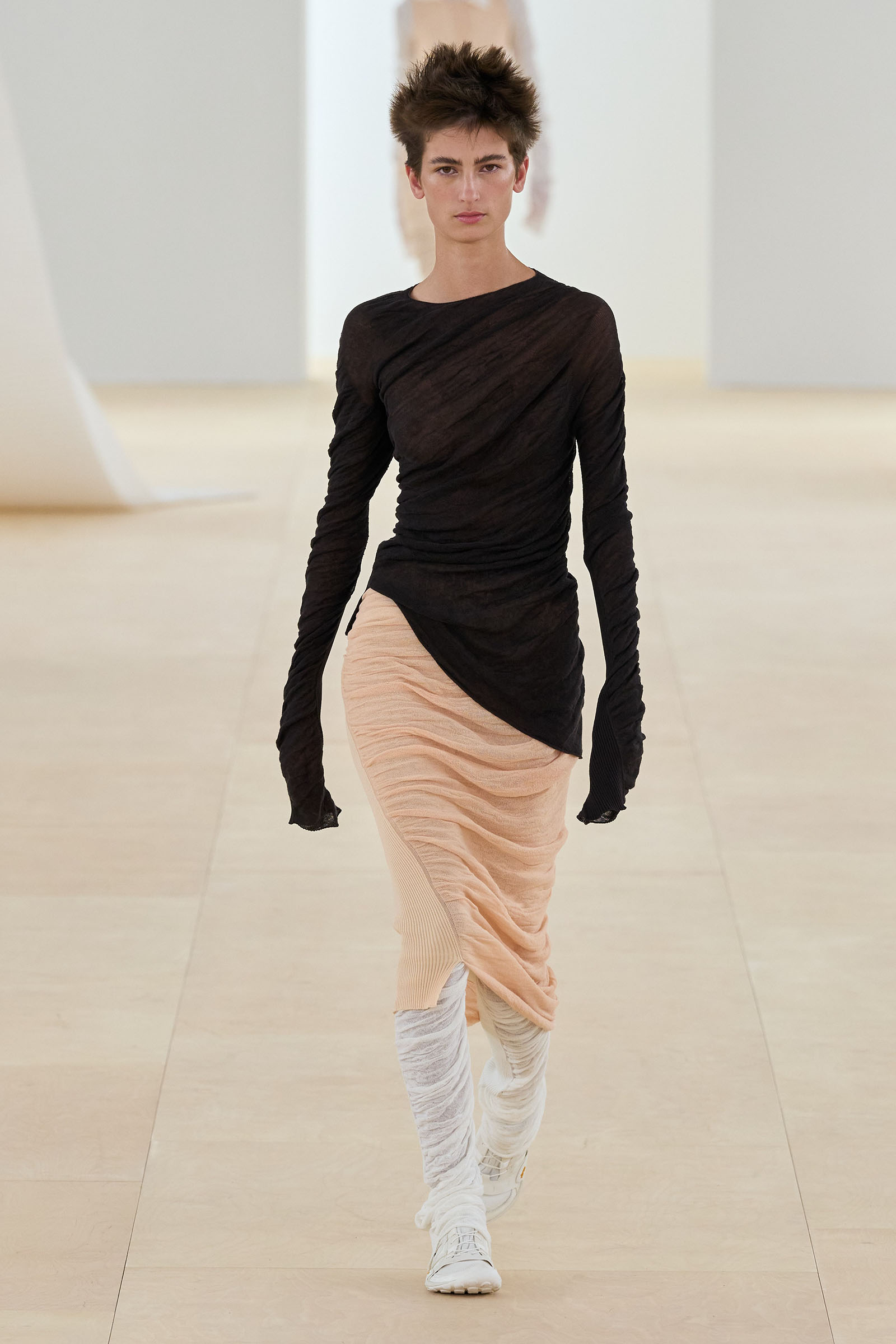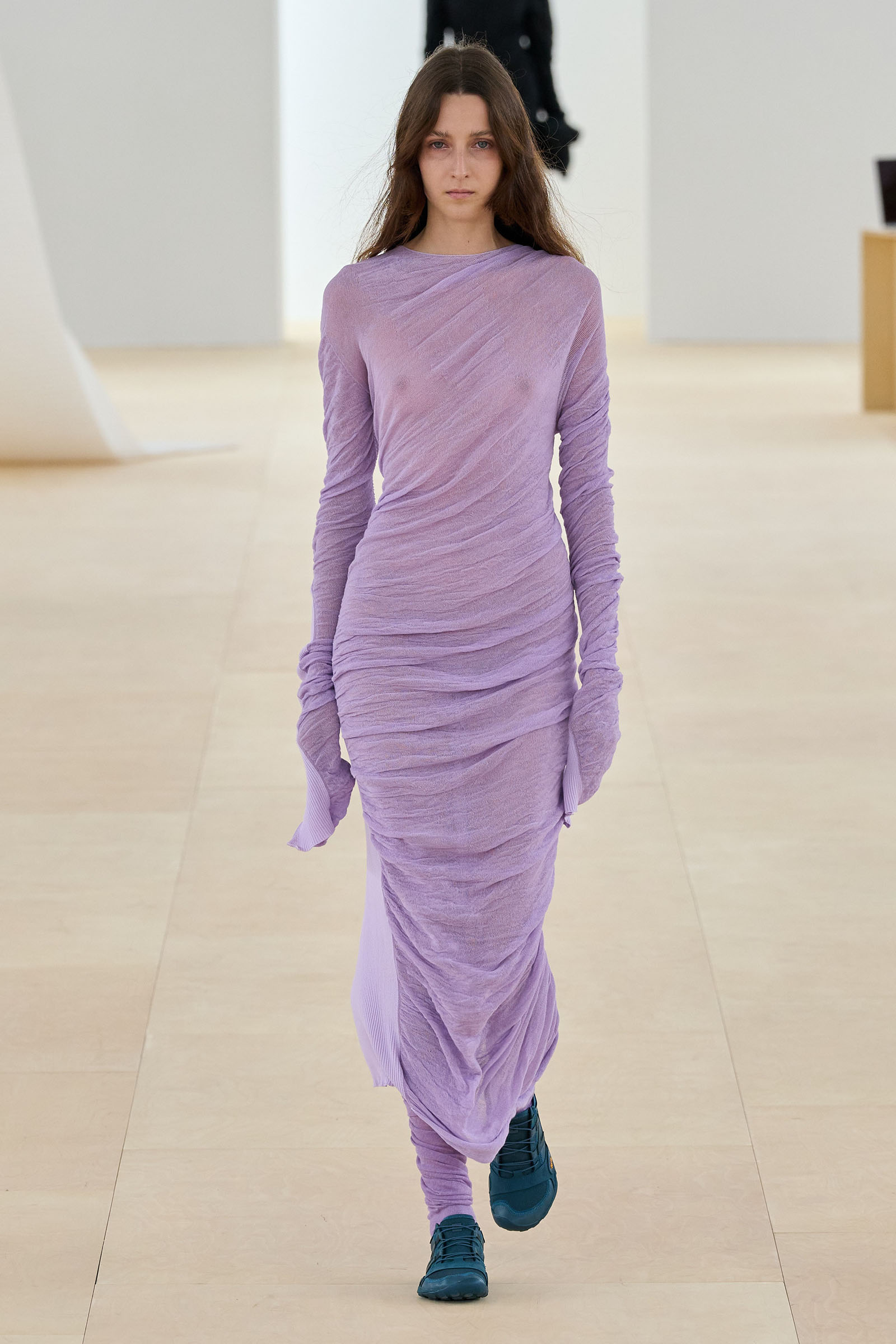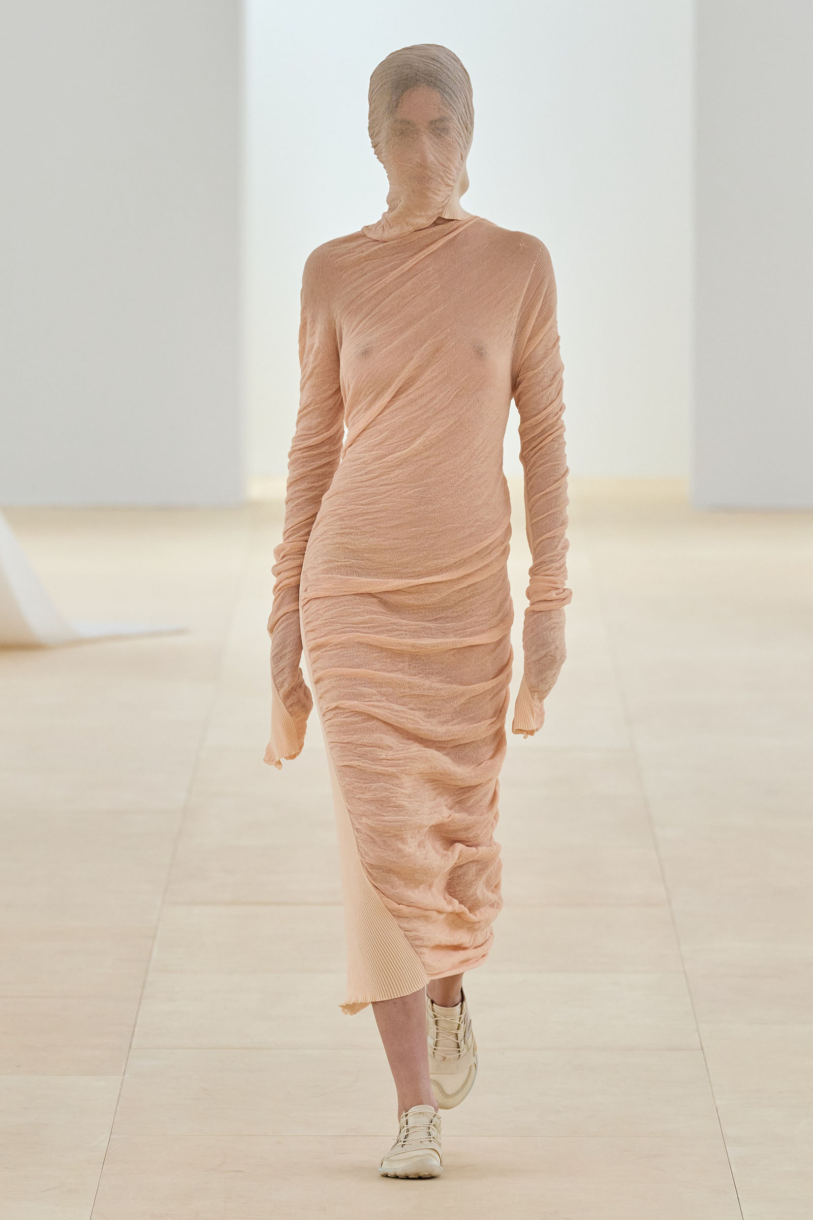 A series of prints showing grainy shafts of light were developed from exposed film, another 1990s throwback. Then we saw painstakingly fashioned dresses cut from single tubes of washi paper and polyester mix that were manipulated to fold back and forth around subtle cut-out sections: these were both highly technical and deeply romantic. The models sometimes wore Vibram-soled barefoot running shoes by New Balance in Kondo directed colorways.