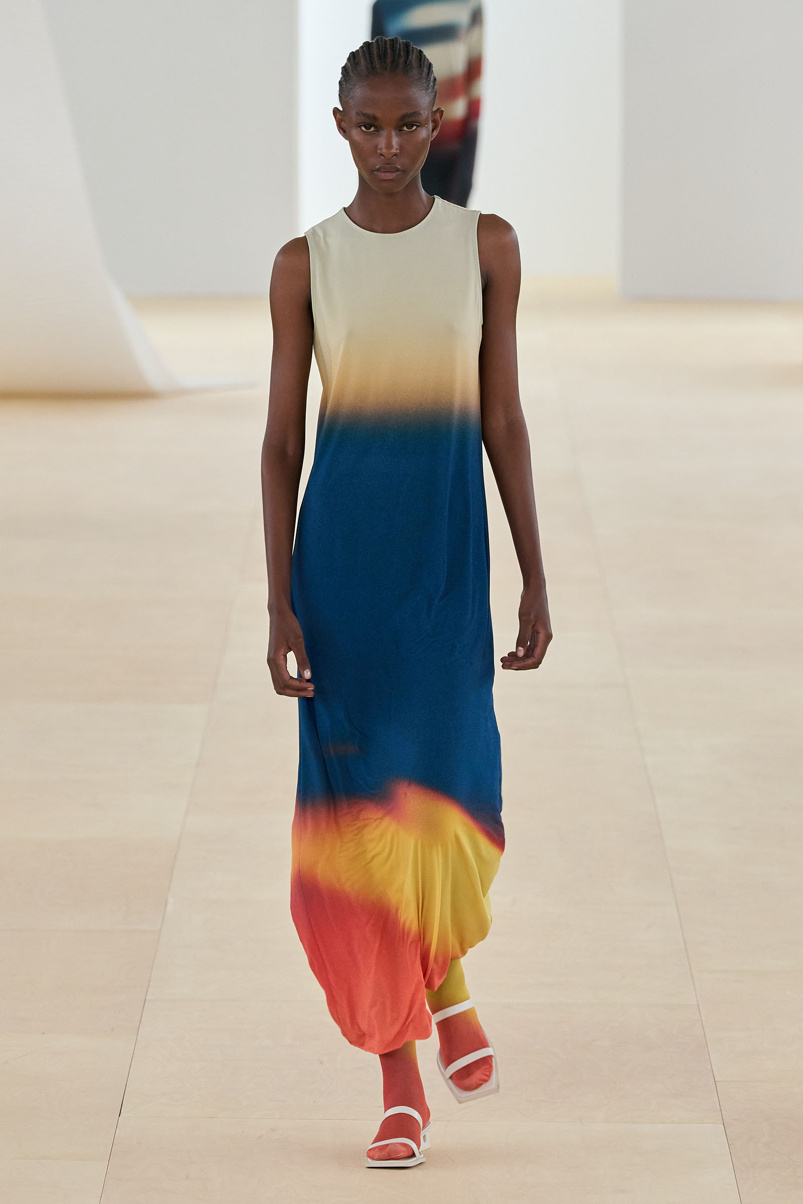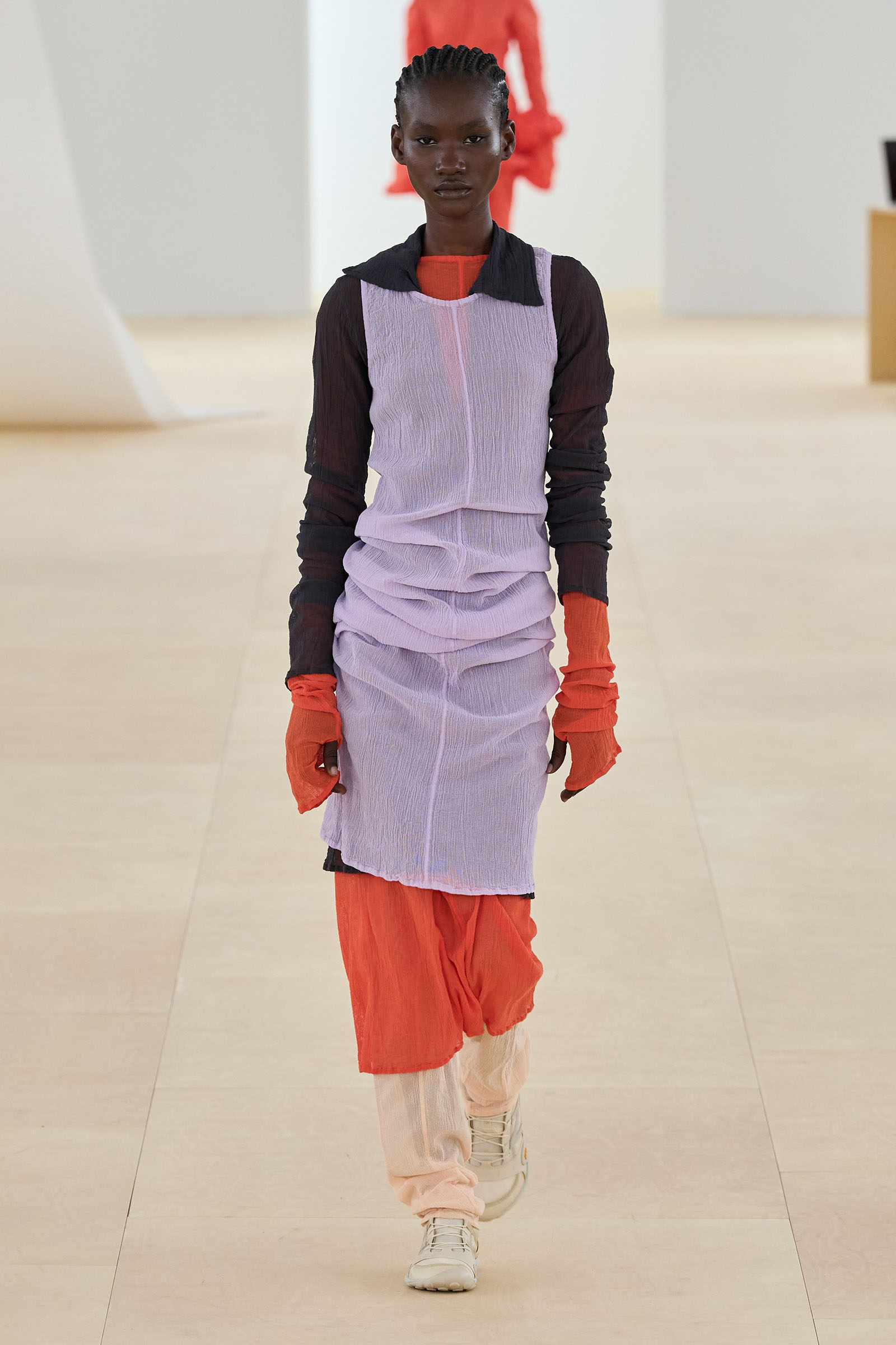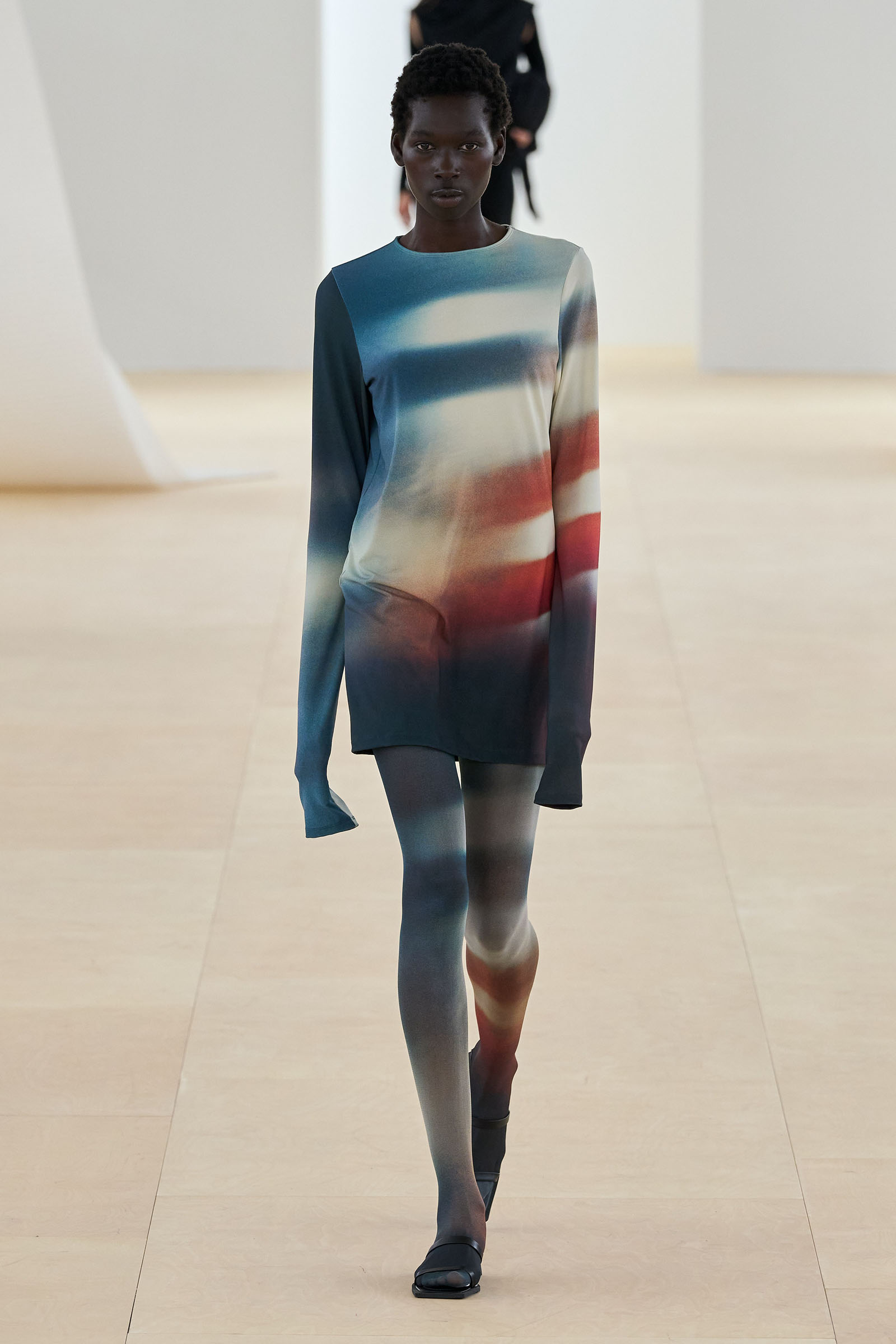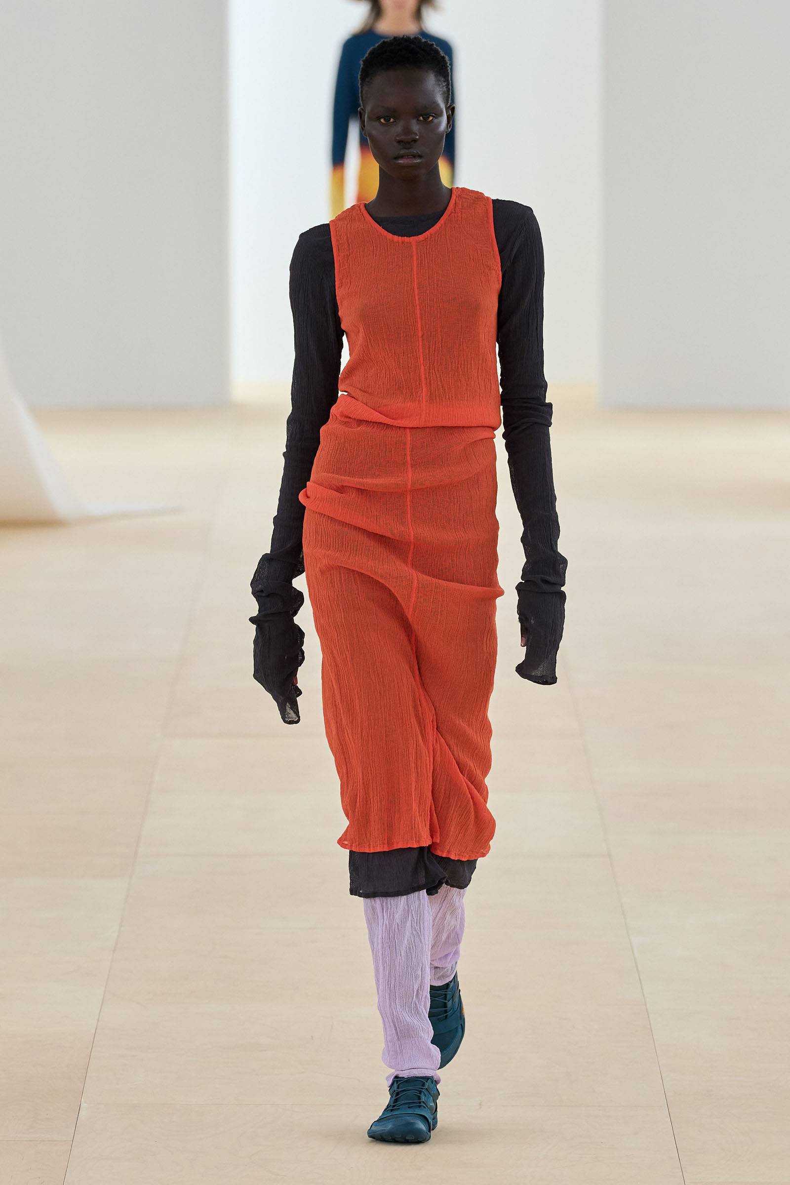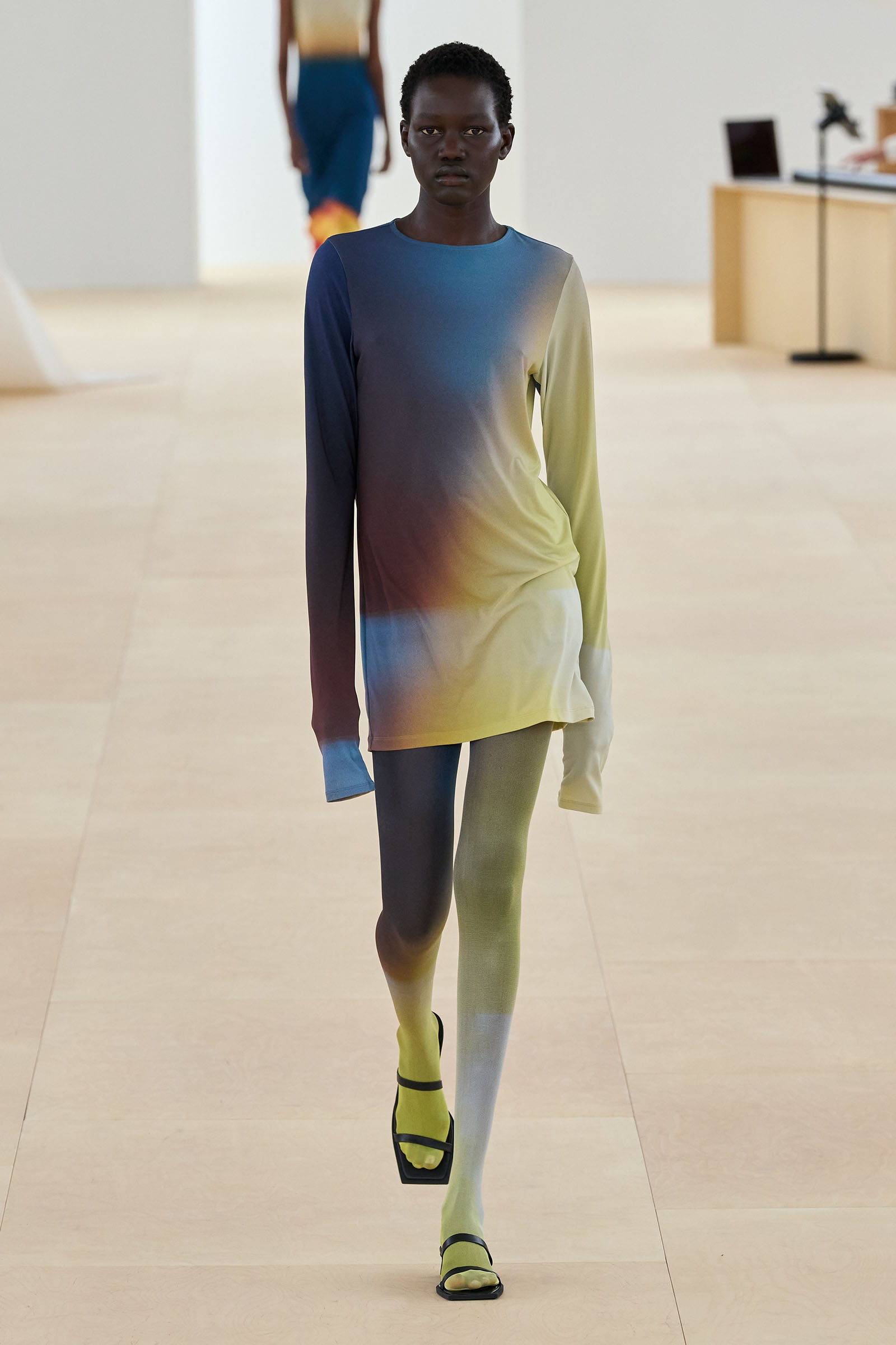 A series of prints showing grainy shafts of light were developed from exposed film, another 1990s throwback. Then we saw painstakingly fashioned dresses cut from single tubes of washi paper and polyester mix that were manipulated to fold back and forth around subtle cut-out sections: these were both highly technical and deeply romantic. The models sometimes wore Vibram-soled barefoot running shoes by New Balance in Kondo directed colorways.
