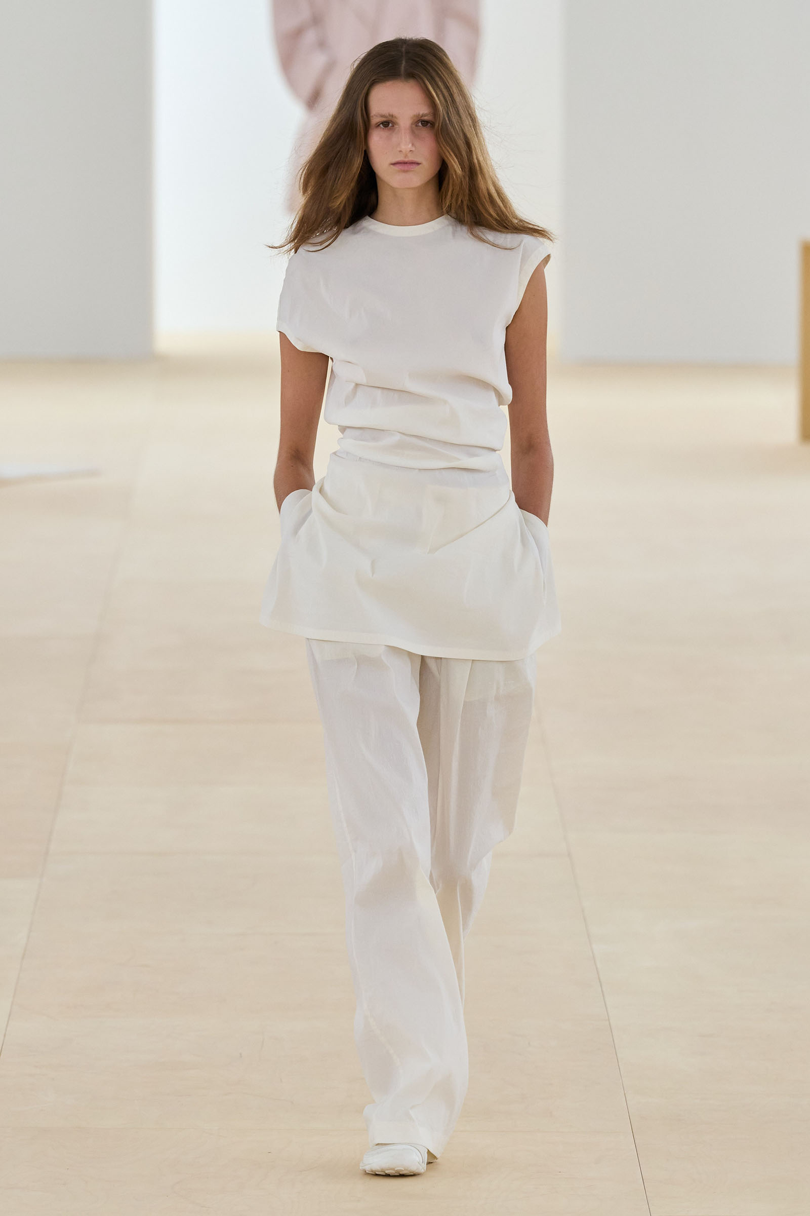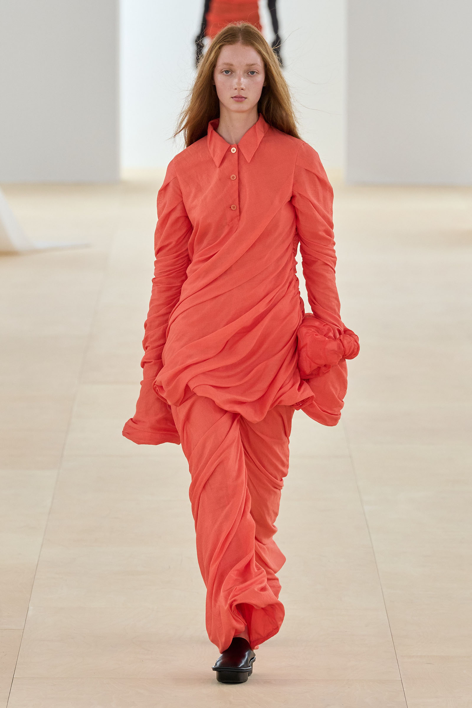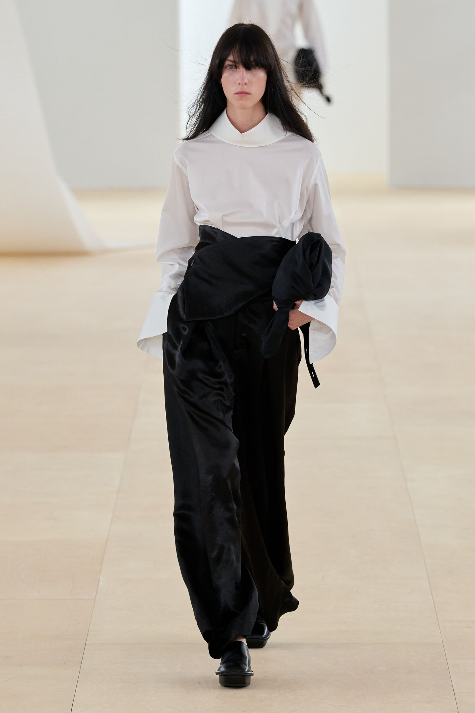 This tribute, which felt as fresh and exciting to the eye as it must have 25 years ago, opened a beautiful collection. Kondo’s dynamic experiments with high twist yarns played against the bodies beneath them in a manner comparable to the fluttering of a flag in the breeze, an image that the designer cited as a starting point. At points of movement, hips and shoulders, the fabric found its own volume and settled into a natural, unenforced drape created by the human weather within it.