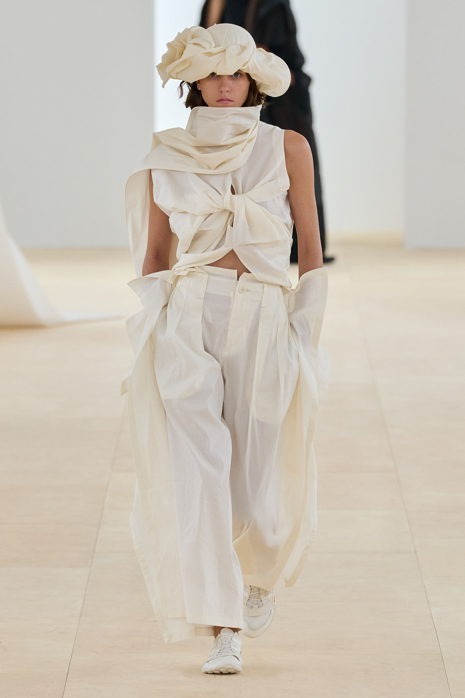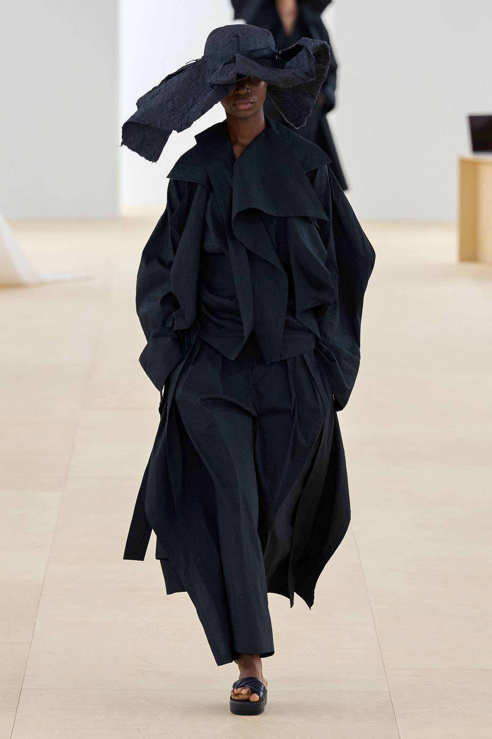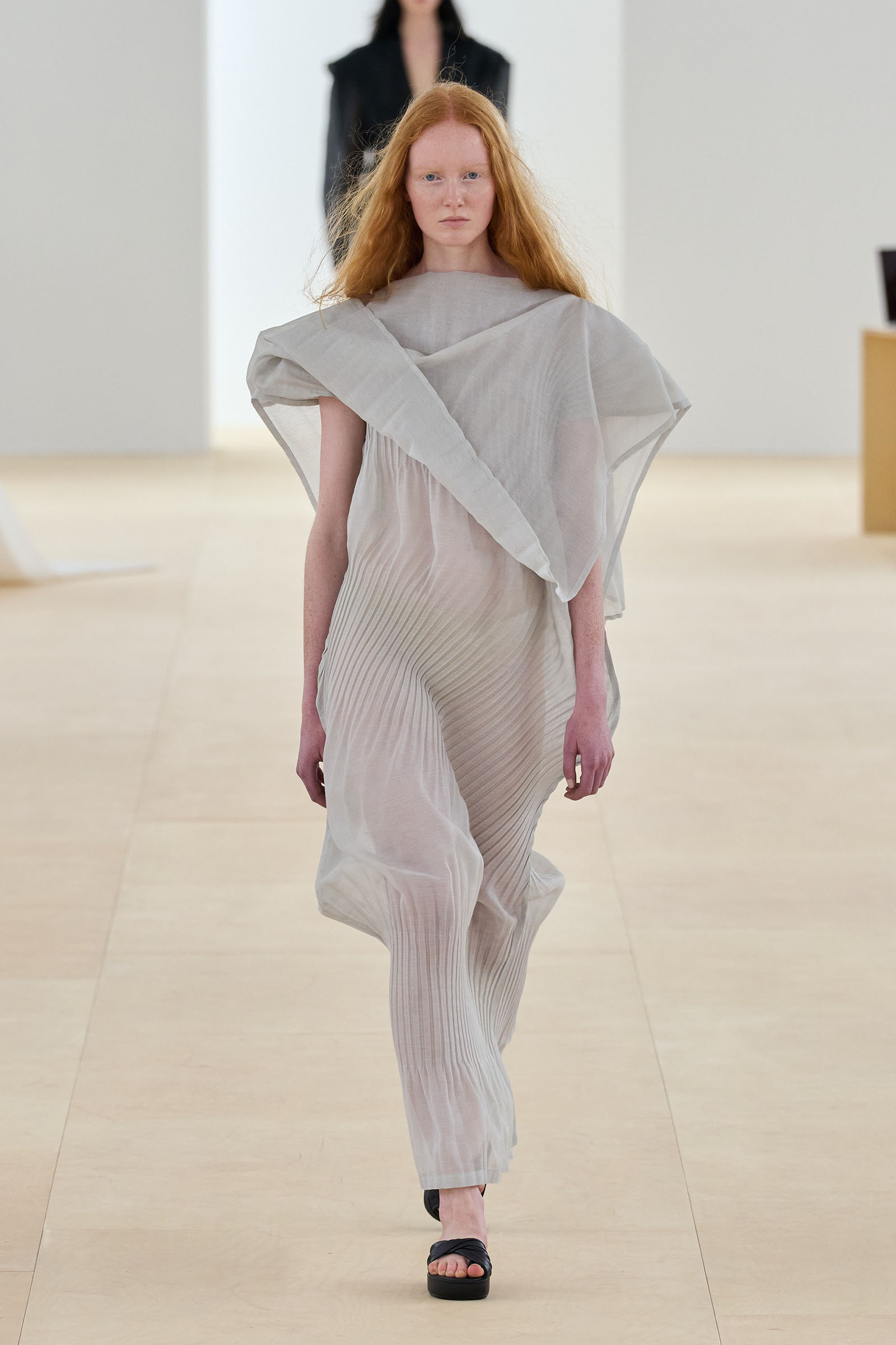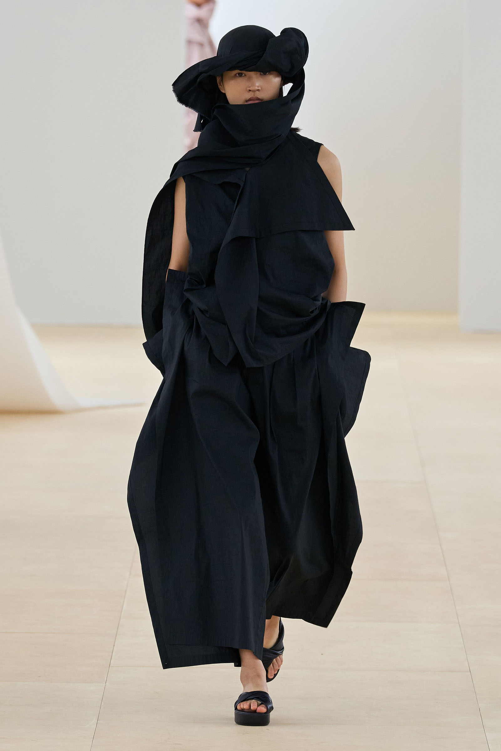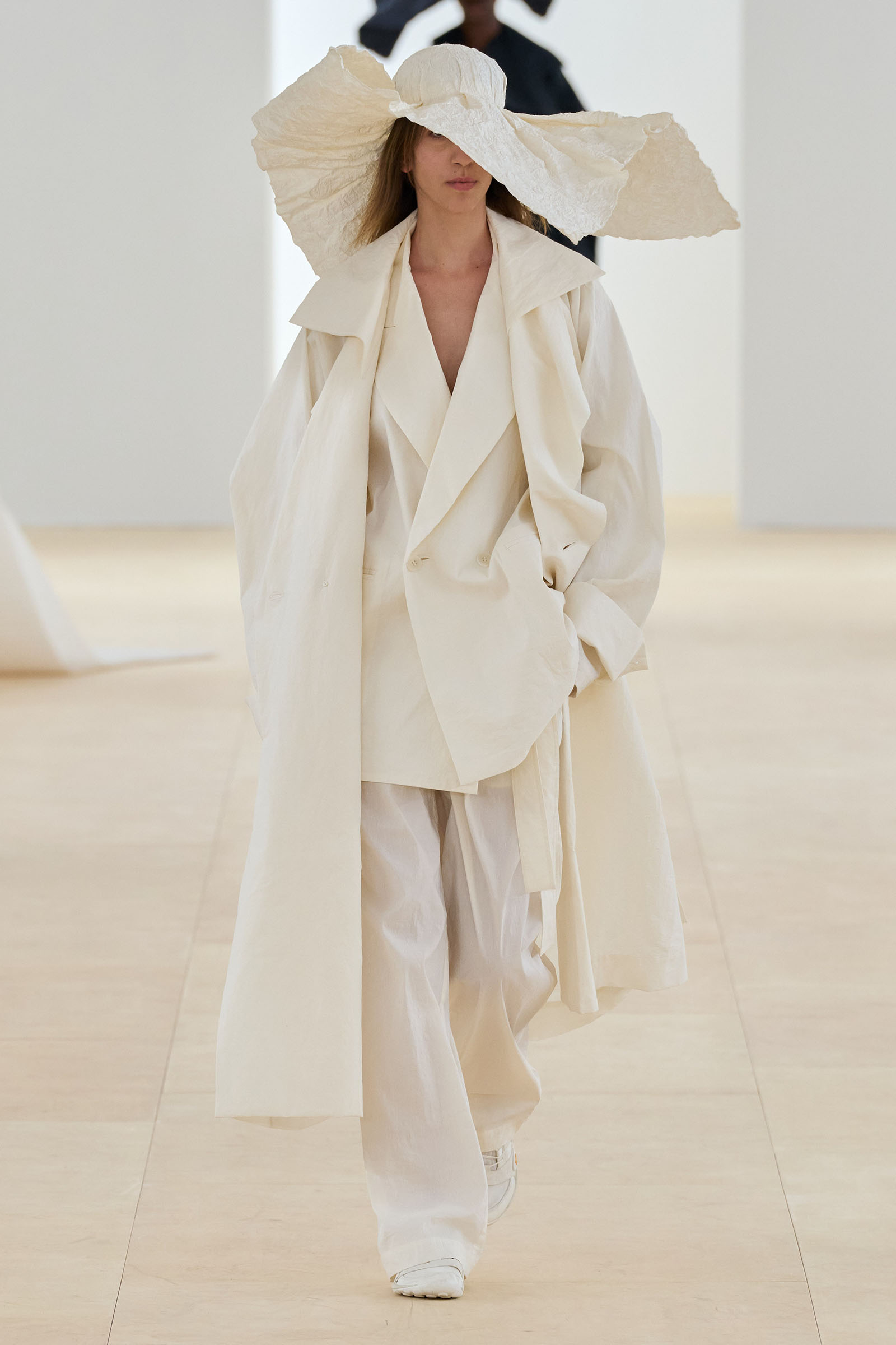 Props (and thanks) to Vogue colleague José Criales-Unzueta, who after this show noted and posted to his Instagram a runway redux of Issey Miyake’s Spring 1998 show written by Laird Borrelli-Persson. As you can see by comparing the galleries, Miyake’s “tube veils” from that year were riffed on—and extended into real veils—by Satoshi Kondo at this morning’s show in Paris. That was one of Miyake’s final shows as creative director: following his death last summer, the Miyake family continues to hold the candle for their founder.