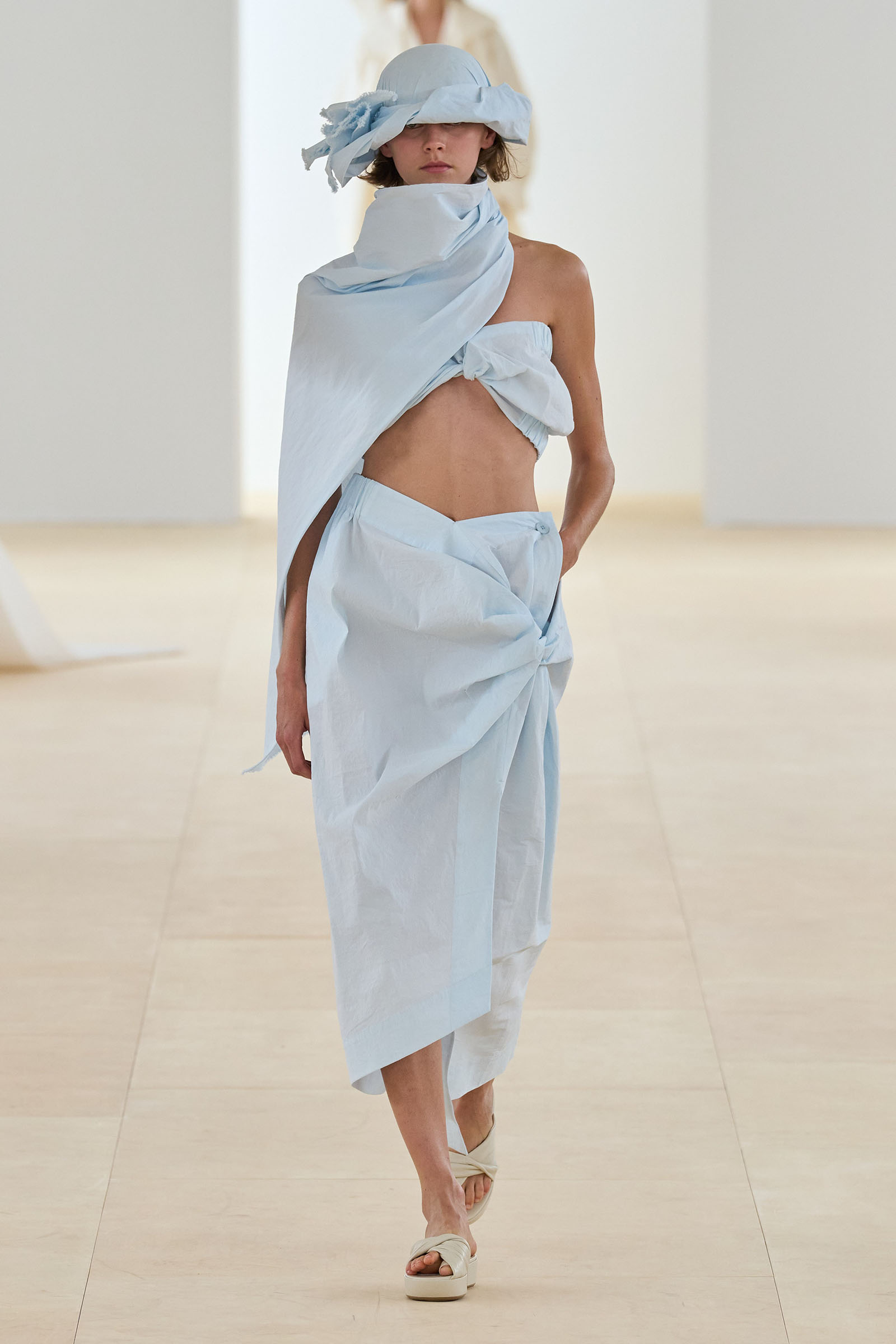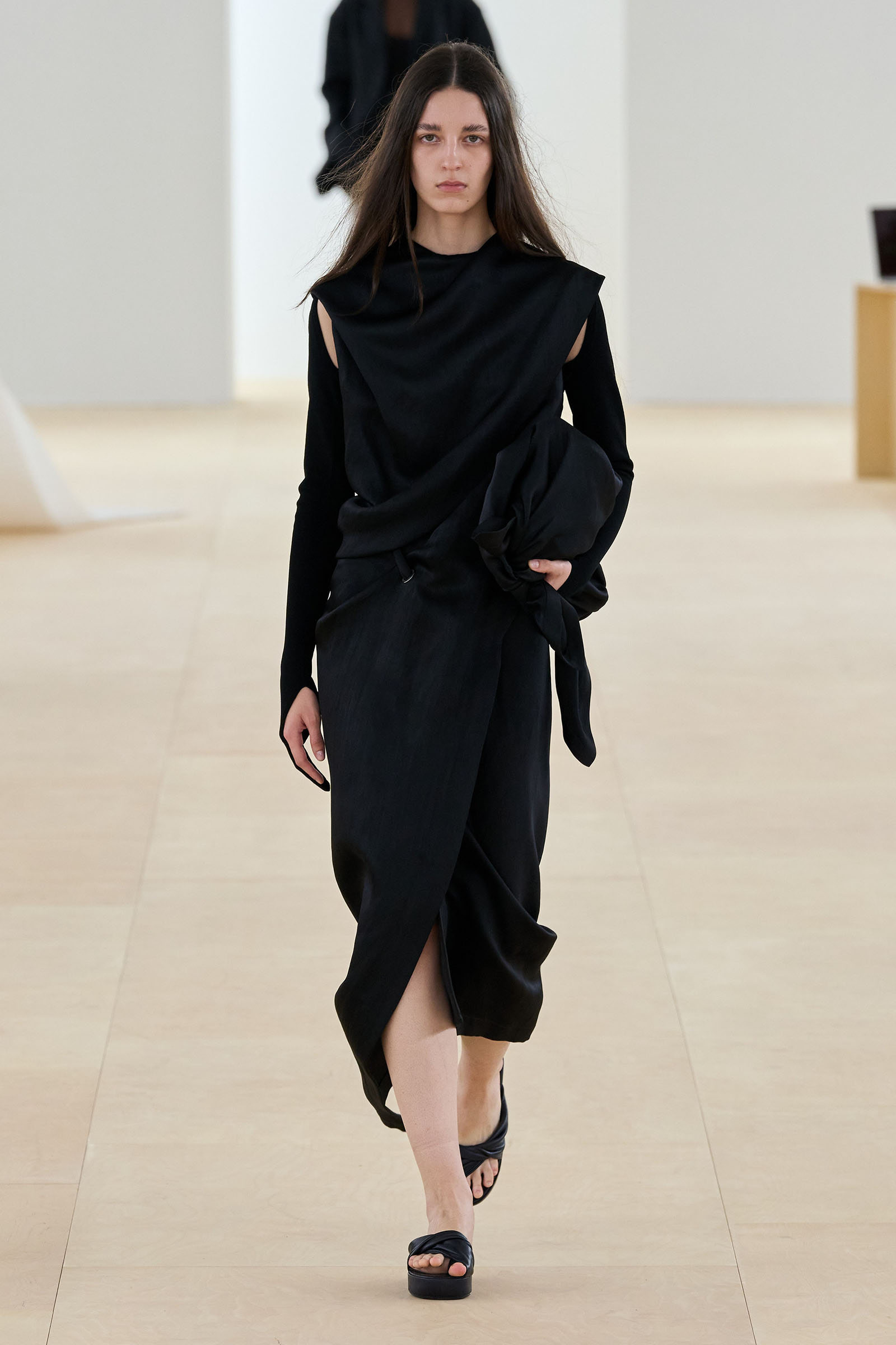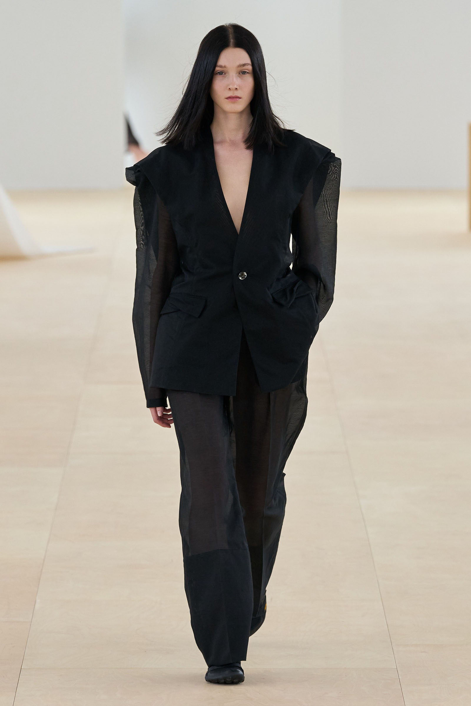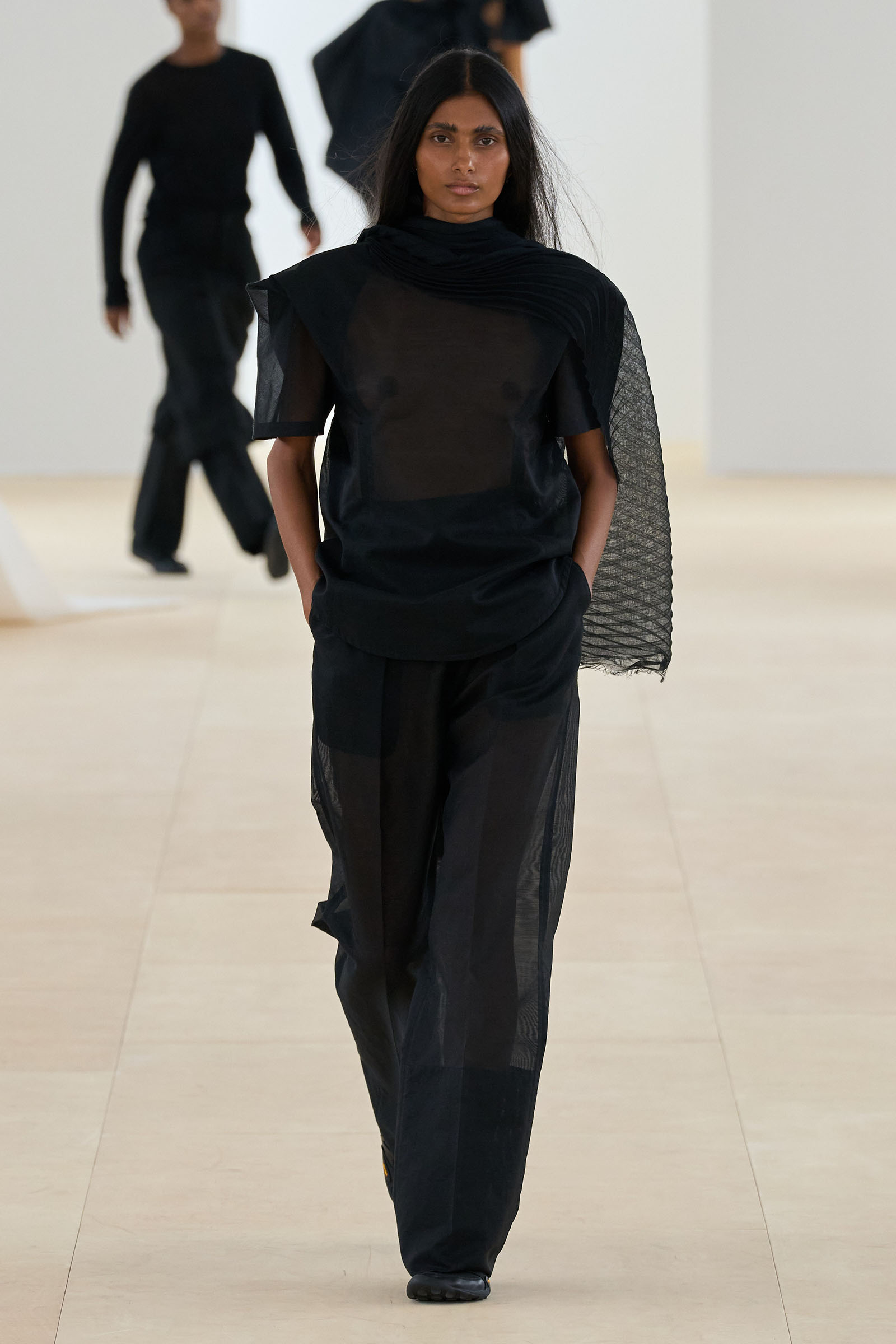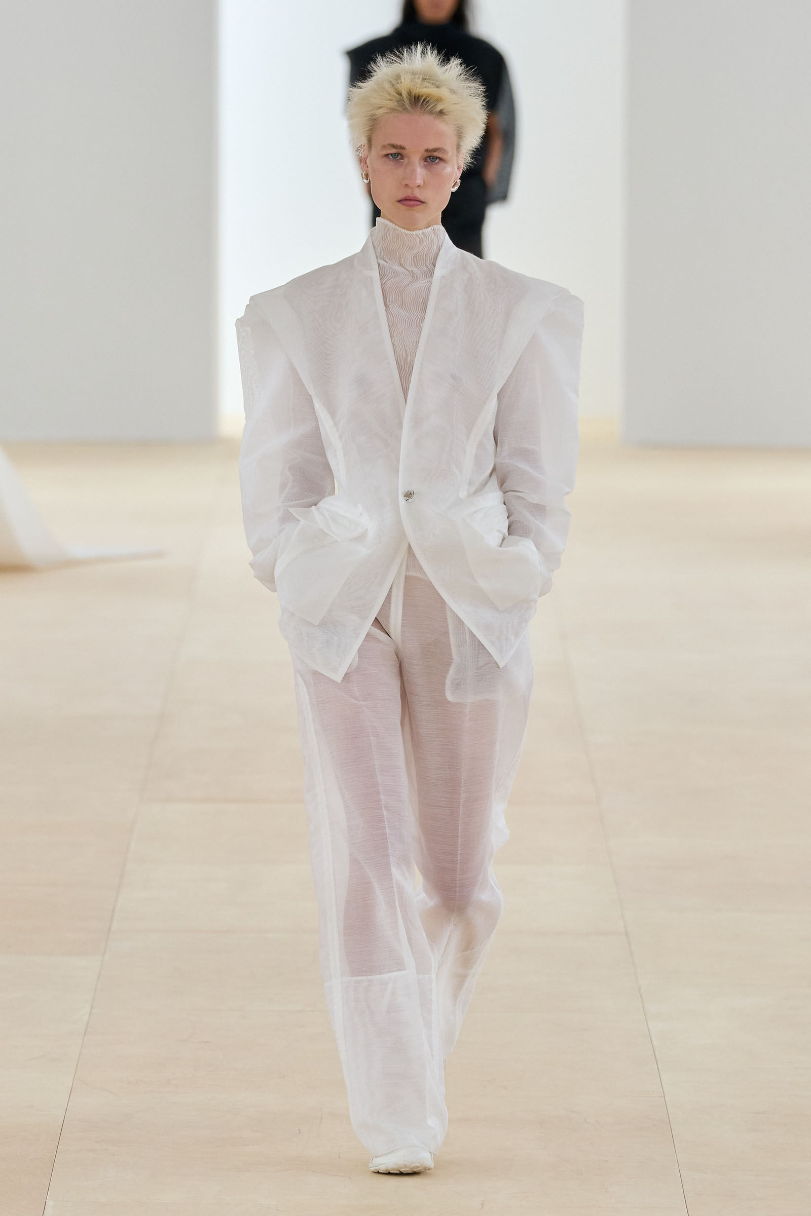 Props (and thanks) to Vogue colleague José Criales-Unzueta, who after this show noted and posted to his Instagram a runway redux of Issey Miyake’s Spring 1998 show written by Laird Borrelli-Persson. As you can see by comparing the galleries, Miyake’s “tube veils” from that year were riffed on—and extended into real veils—by Satoshi Kondo at this morning’s show in Paris. That was one of Miyake’s final shows as creative director: following his death last summer, the Miyake family continues to hold the candle for their founder.